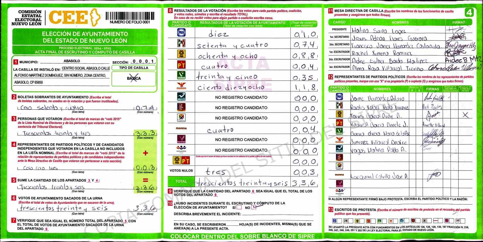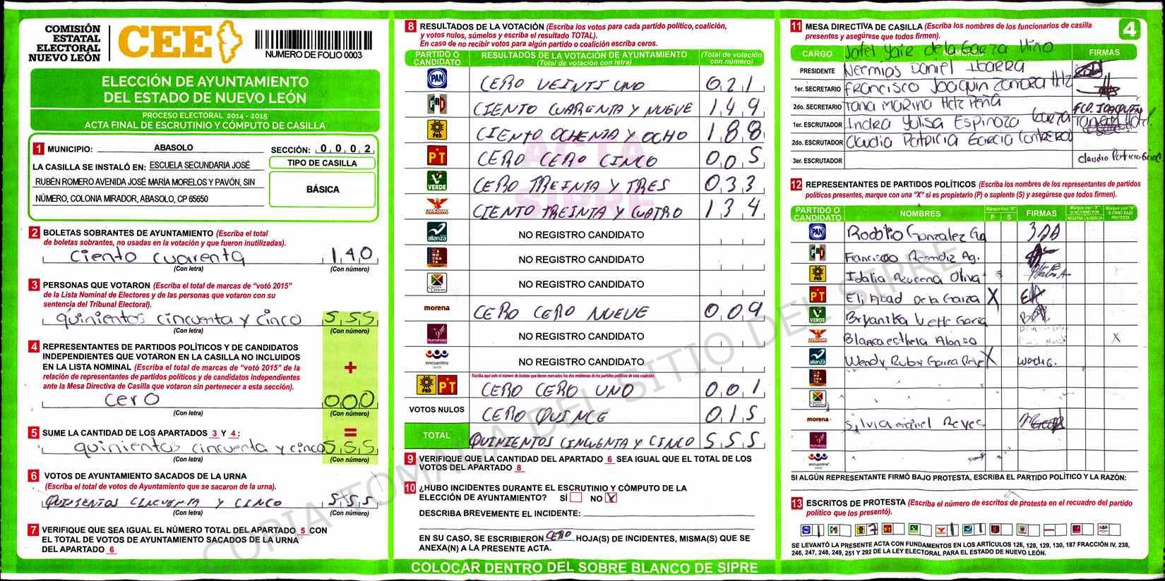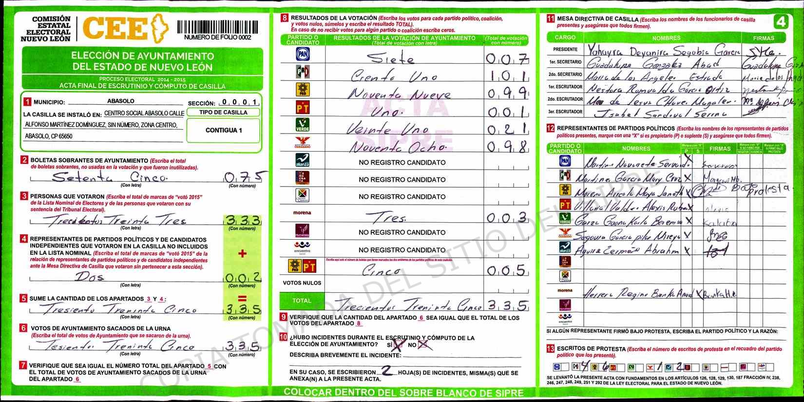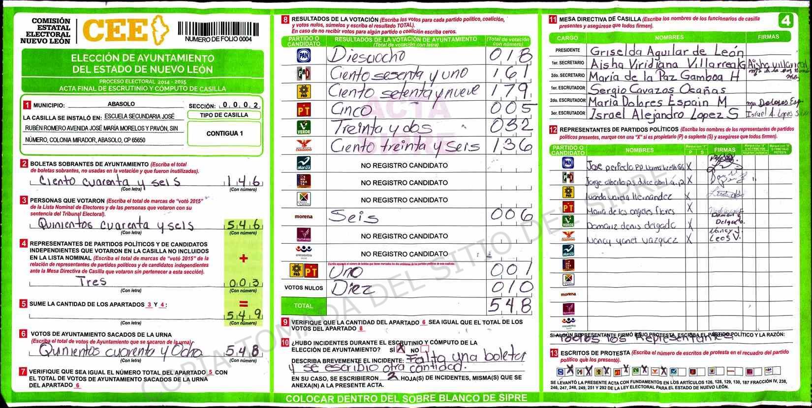 | Claves de Incidencia: | (1) Ilegible, (2) Mutilada, (3) Presenta Correcciones, (4) Presenta Borrones, (5) En Blanco, (6) Cifras Remarcadas, (7) Cifras de Mas, (8) Copiado Movido, (9) Con Signos Inválidos, (10) Excede Lista Nominal, (11) Otra |