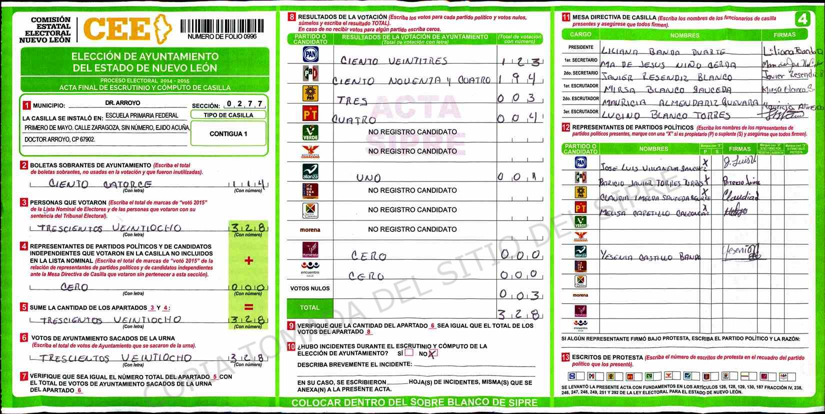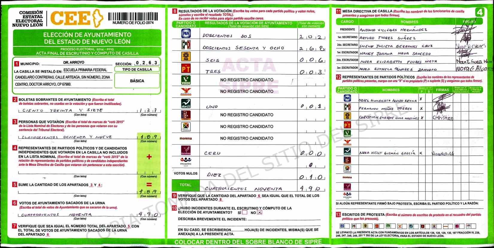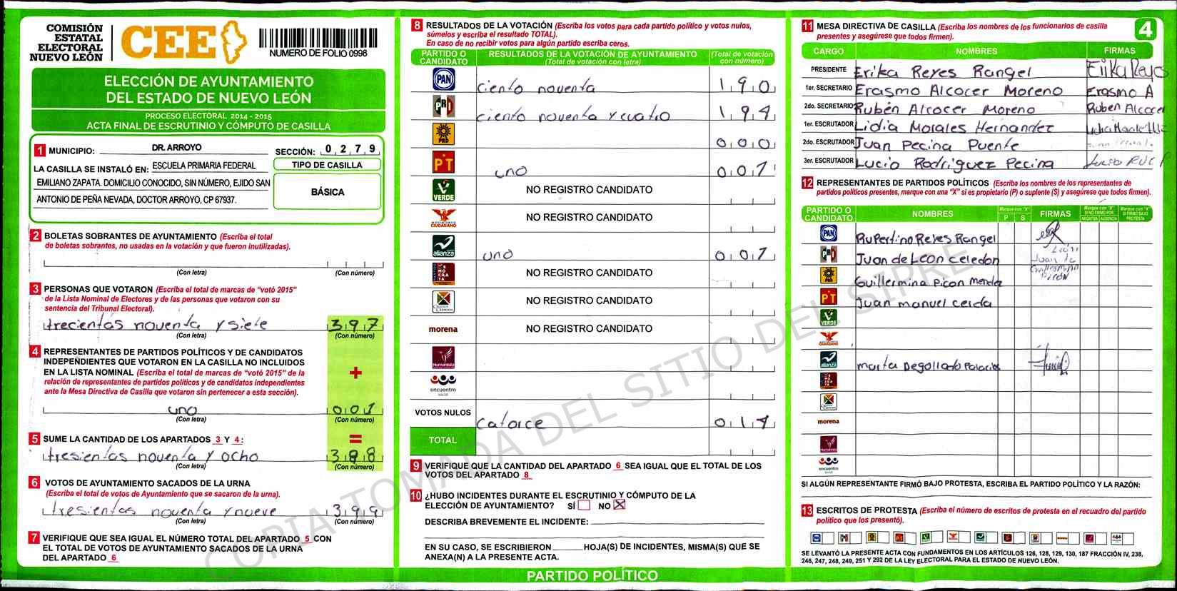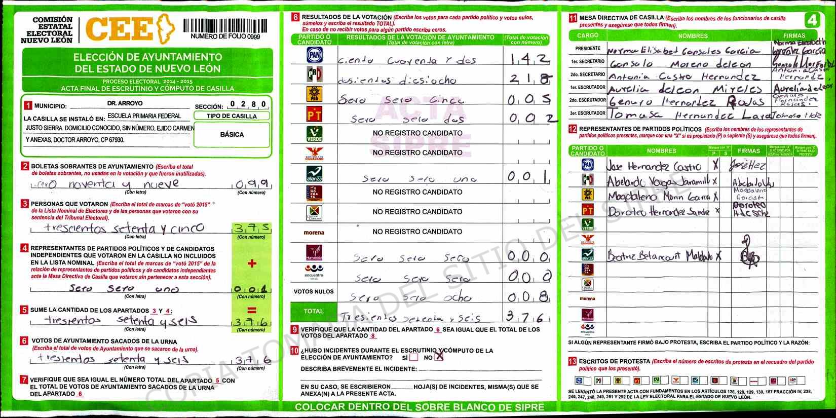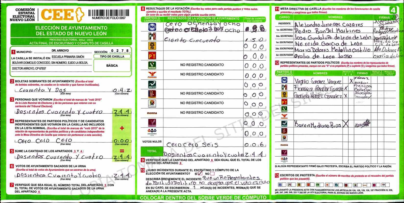 | Claves de Incidencia: | (1) Ilegible, (2) Mutilada, (3) Presenta Correcciones, (4) Presenta Borrones, (5) En Blanco, (6) Cifras Remarcadas, (7) Cifras de Mas, (8) Copiado Movido, (9) Con Signos Inválidos, (10) Excede Lista Nominal, (11) Otra |