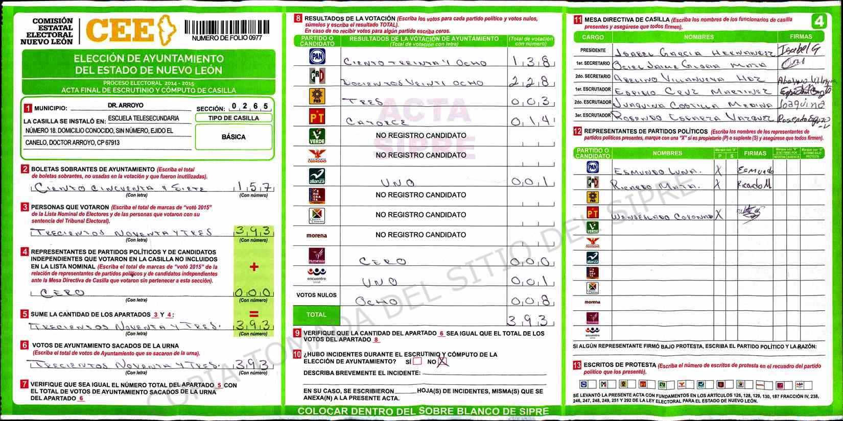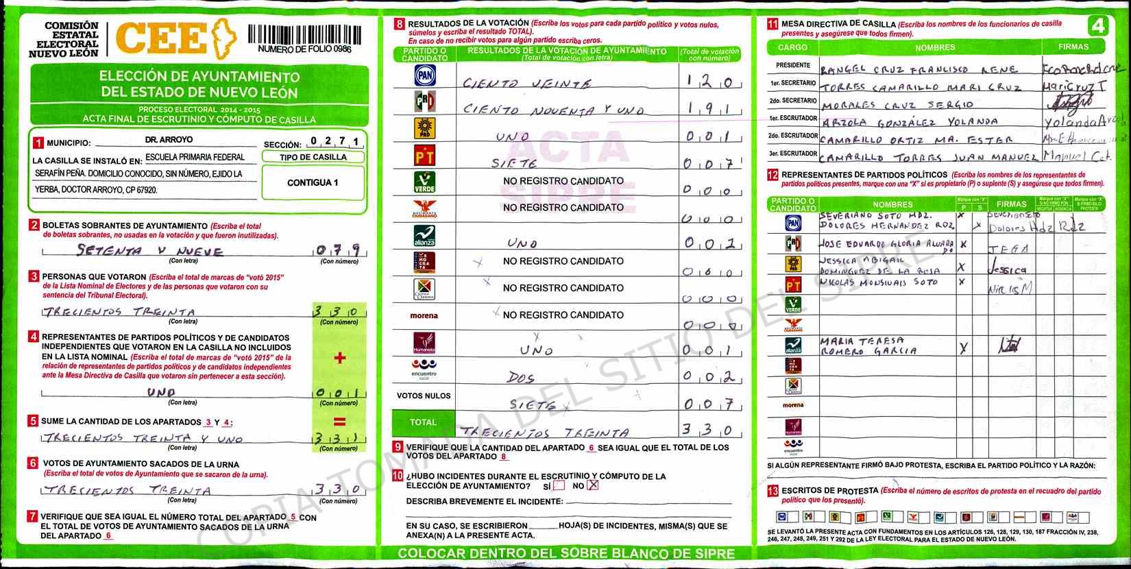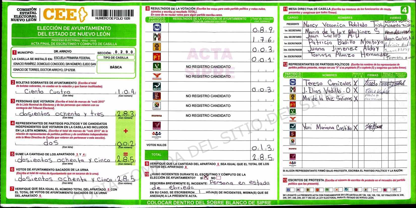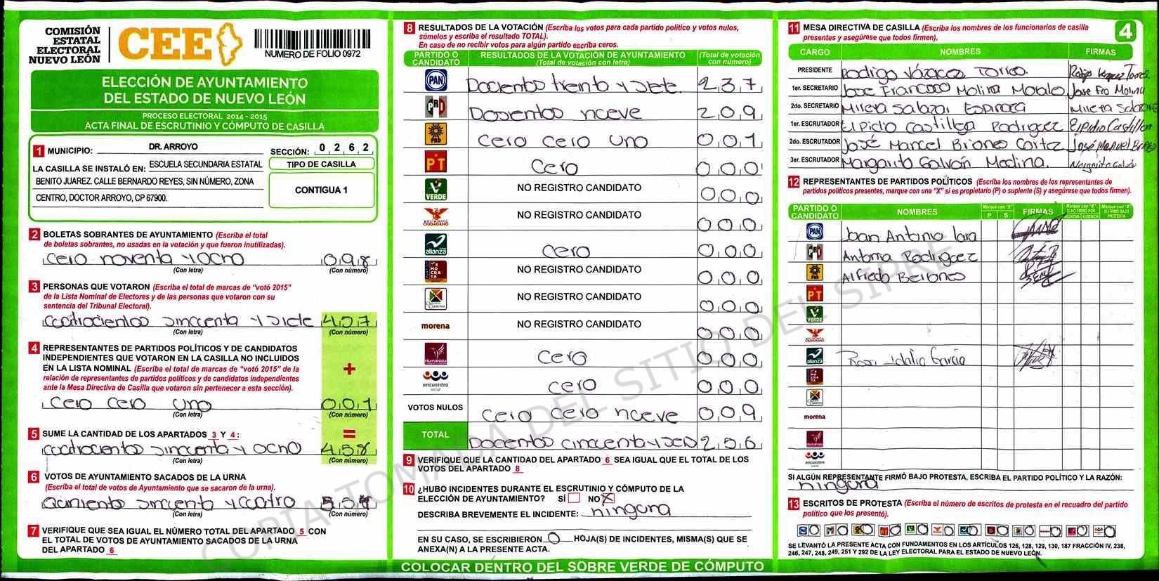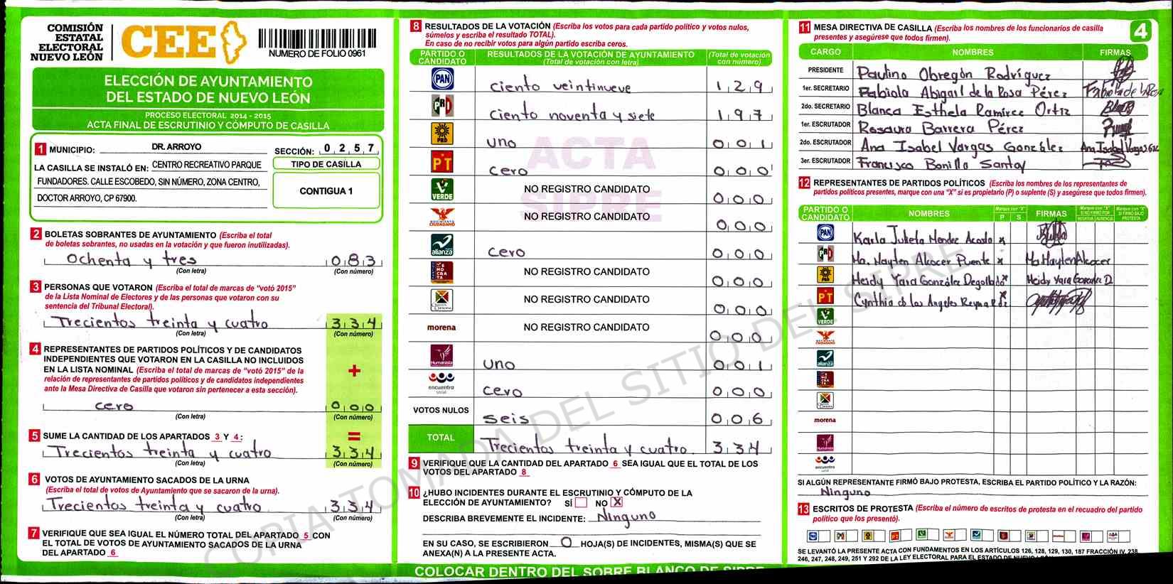 | Claves de Incidencia: | (1) Ilegible, (2) Mutilada, (3) Presenta Correcciones, (4) Presenta Borrones, (5) En Blanco, (6) Cifras Remarcadas, (7) Cifras de Mas, (8) Copiado Movido, (9) Con Signos Inválidos, (10) Excede Lista Nominal, (11) Otra |