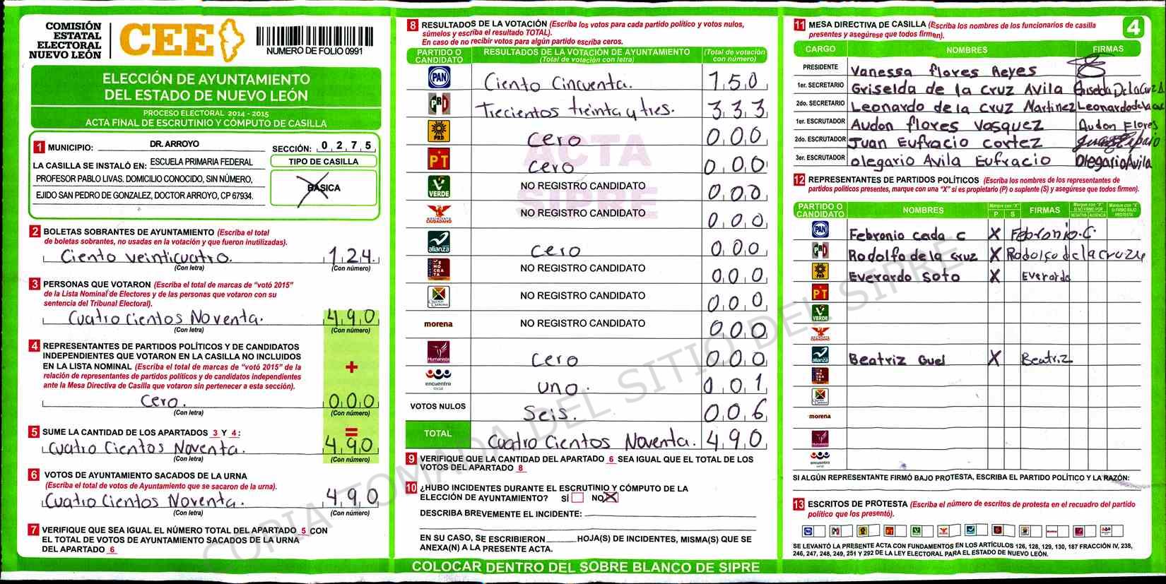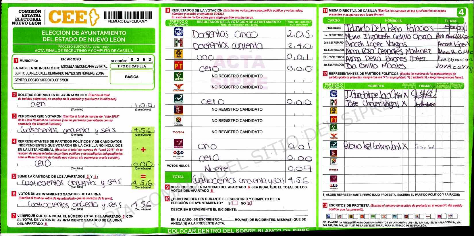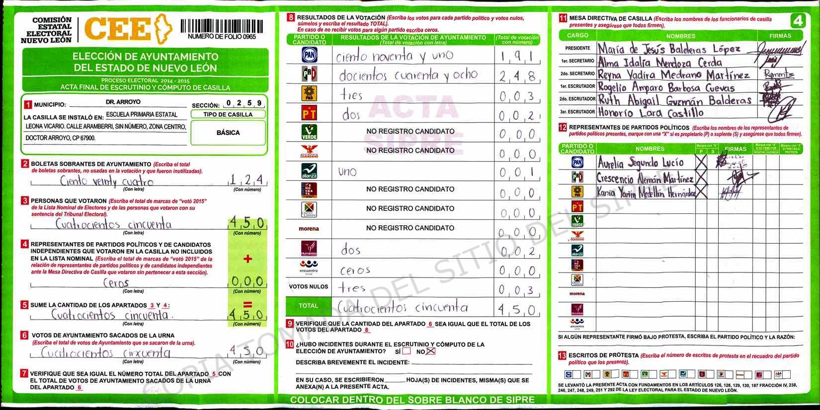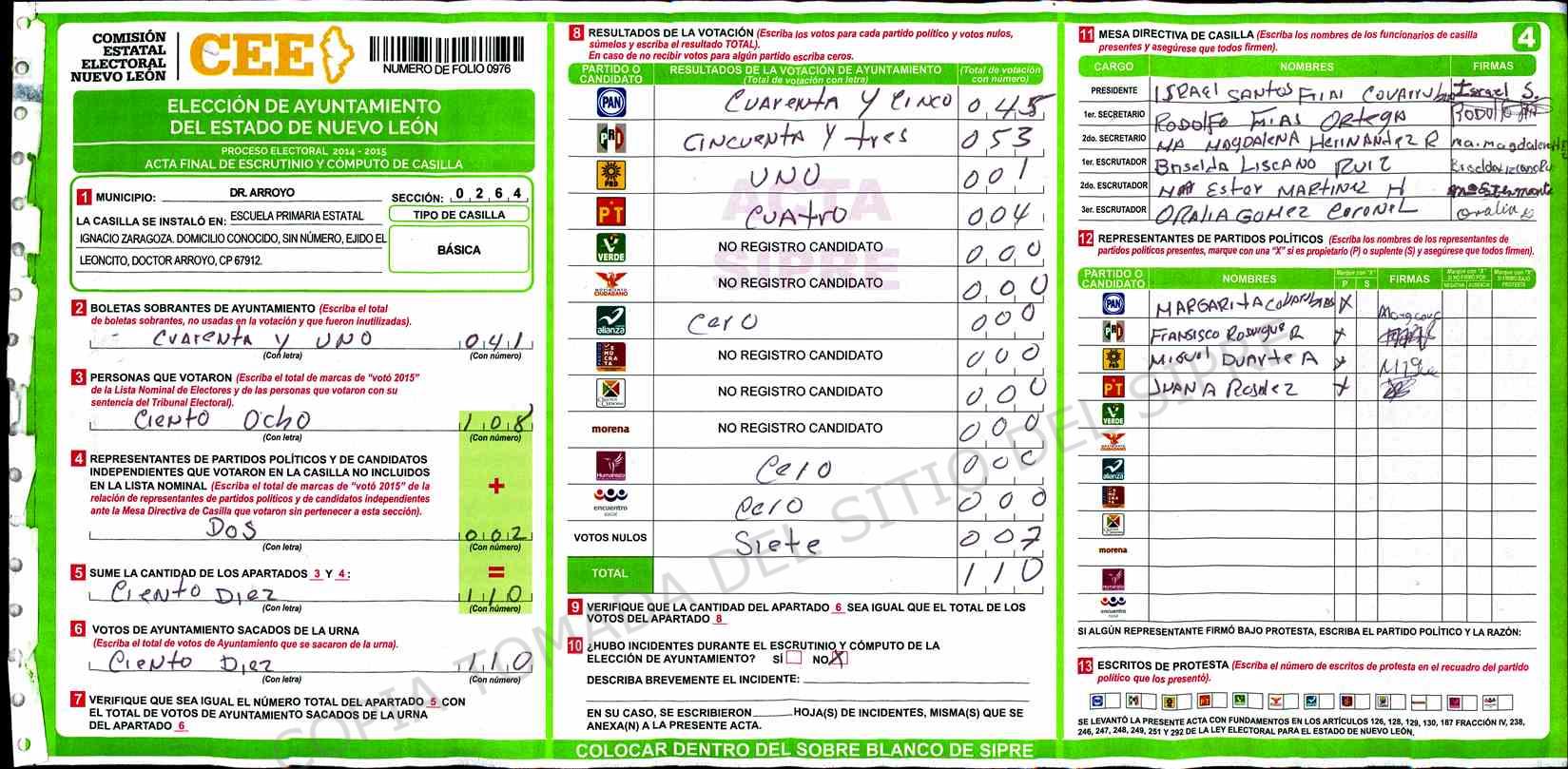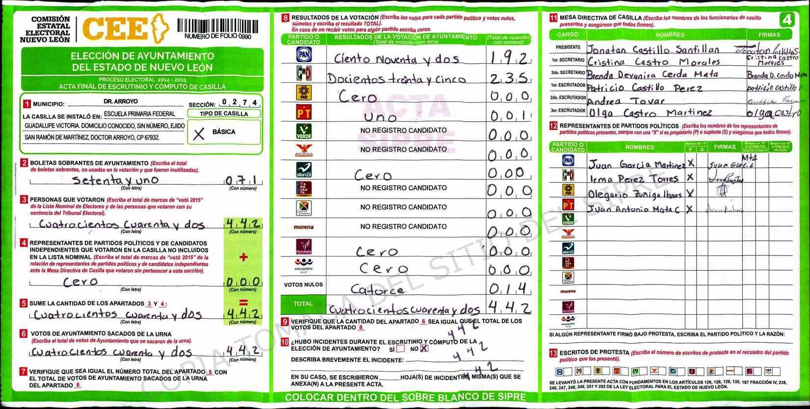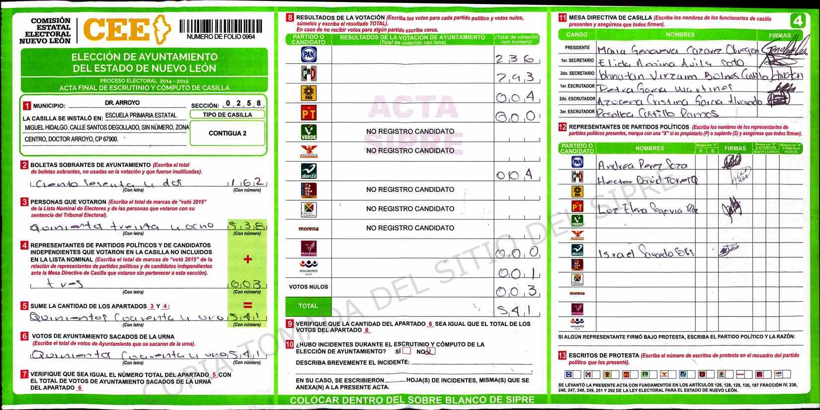 | Claves de Incidencia: | (1) Ilegible, (2) Mutilada, (3) Presenta Correcciones, (4) Presenta Borrones, (5) En Blanco, (6) Cifras Remarcadas, (7) Cifras de Mas, (8) Copiado Movido, (9) Con Signos Inválidos, (10) Excede Lista Nominal, (11) Otra |