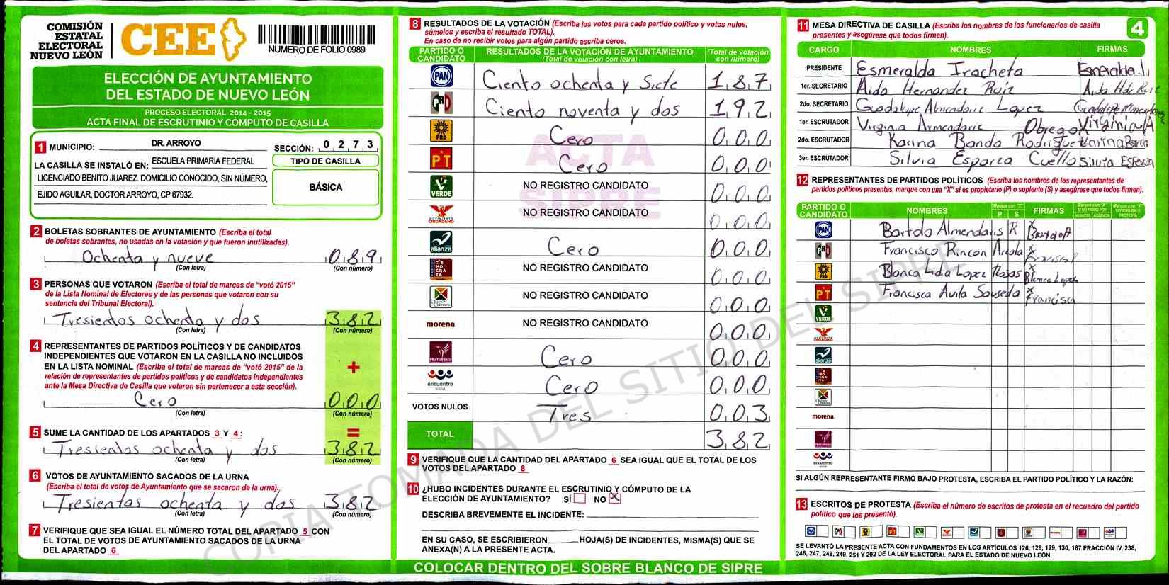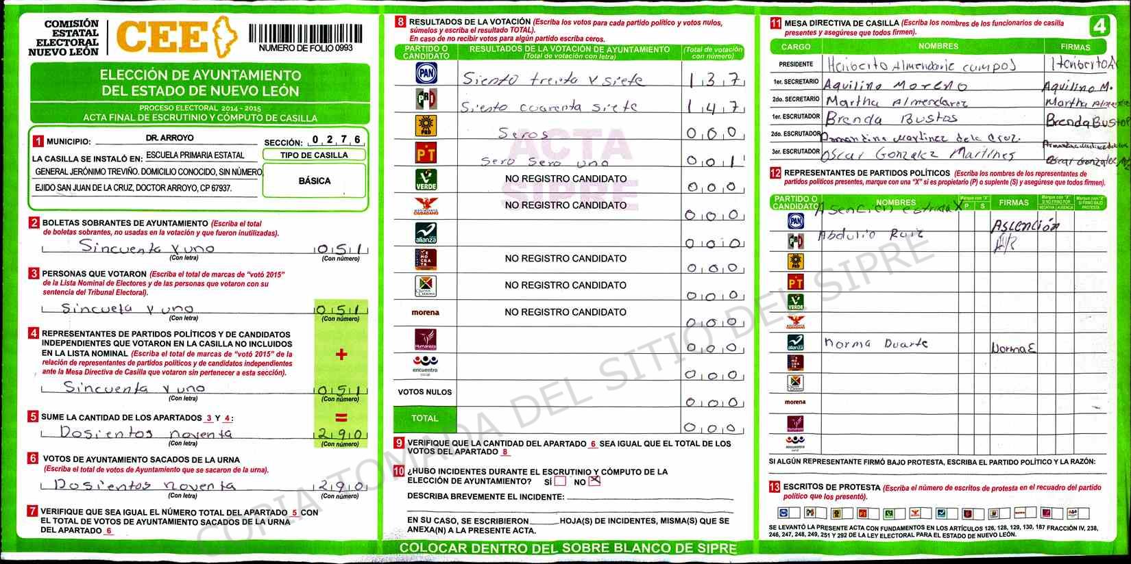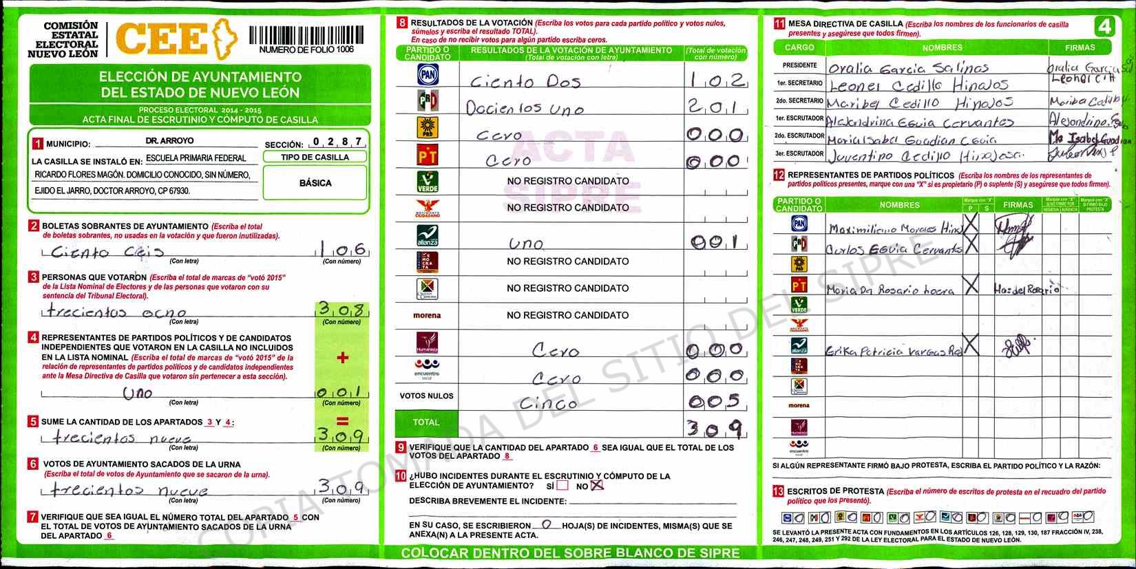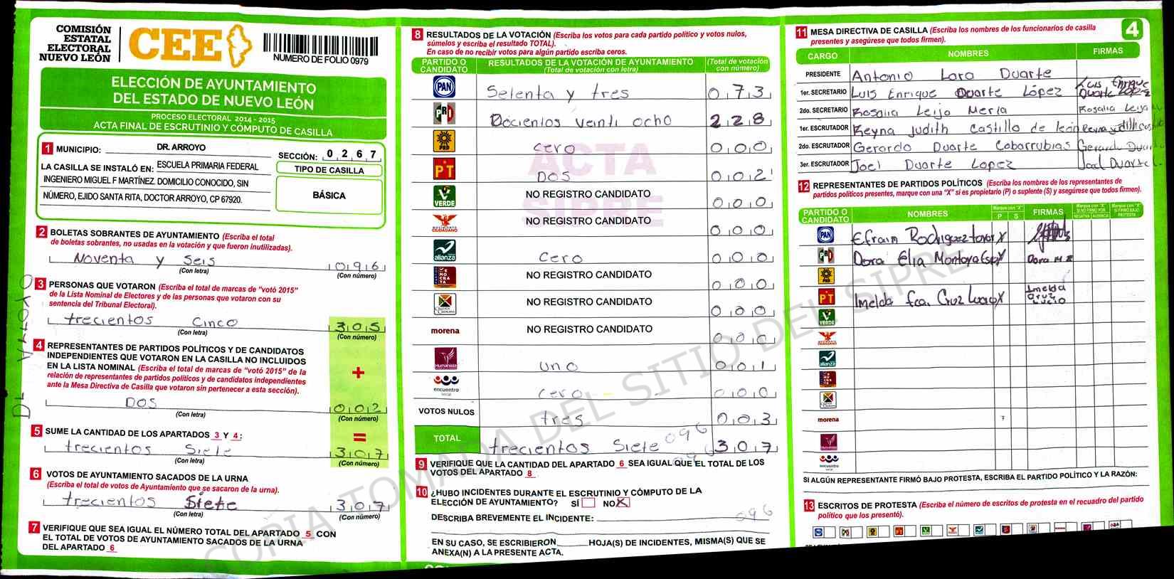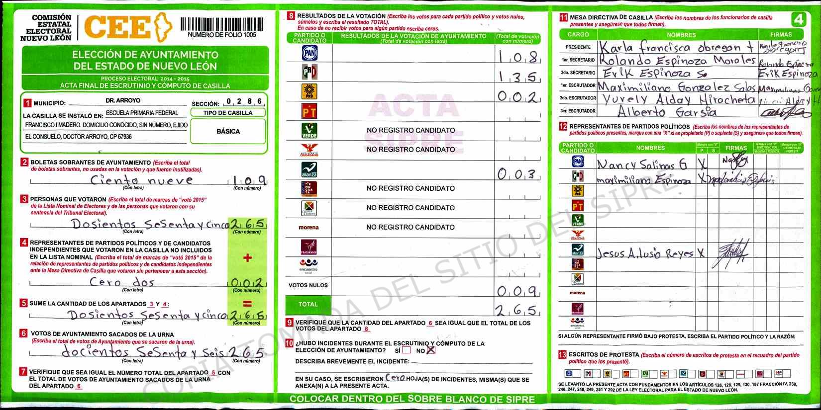 | Claves de Incidencia: | (1) Ilegible, (2) Mutilada, (3) Presenta Correcciones, (4) Presenta Borrones, (5) En Blanco, (6) Cifras Remarcadas, (7) Cifras de Mas, (8) Copiado Movido, (9) Con Signos Inválidos, (10) Excede Lista Nominal, (11) Otra |