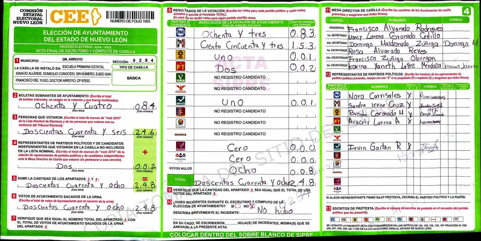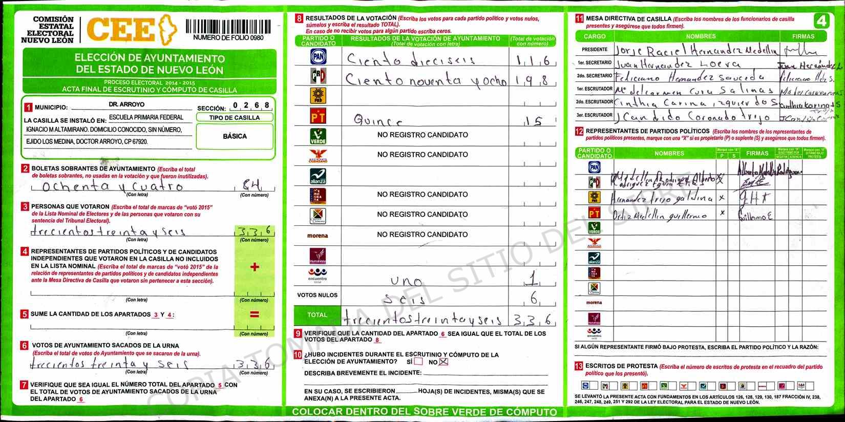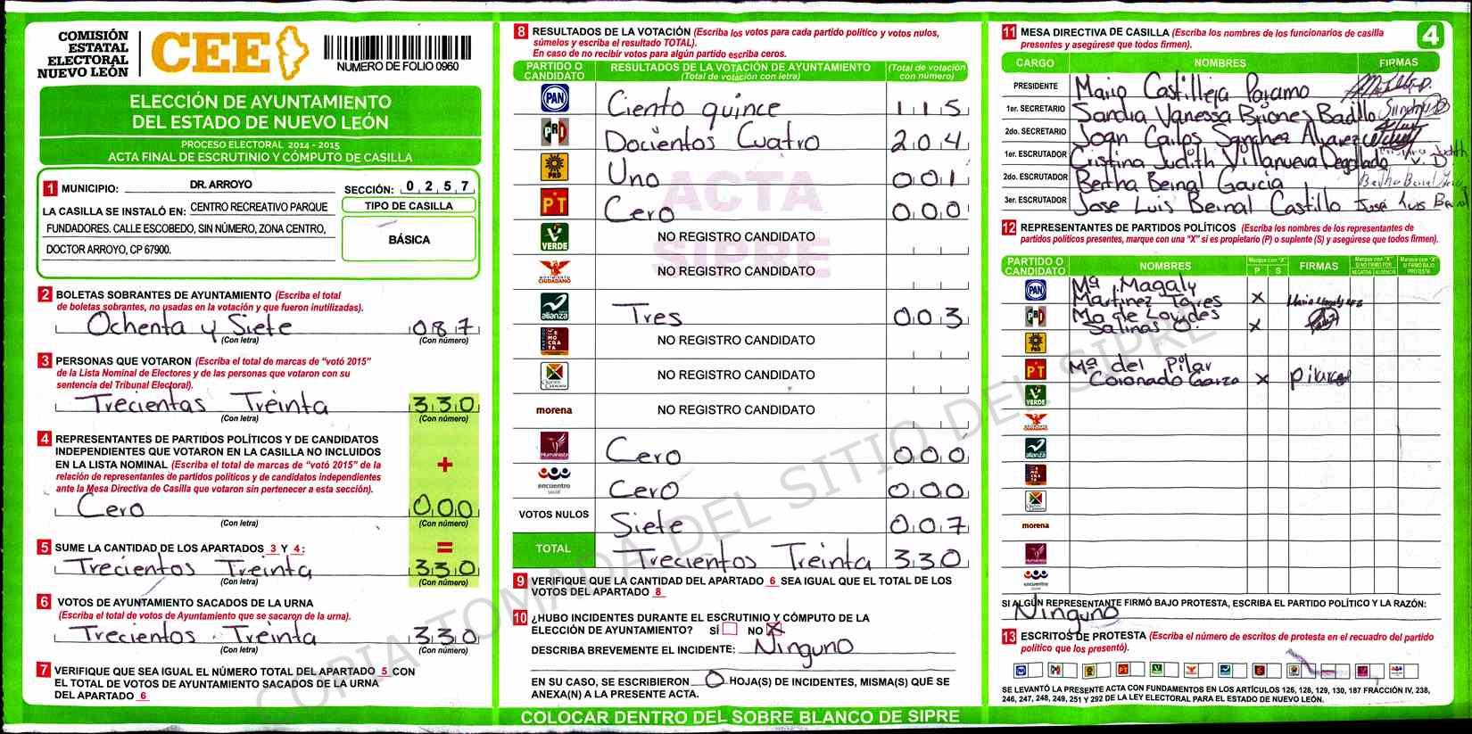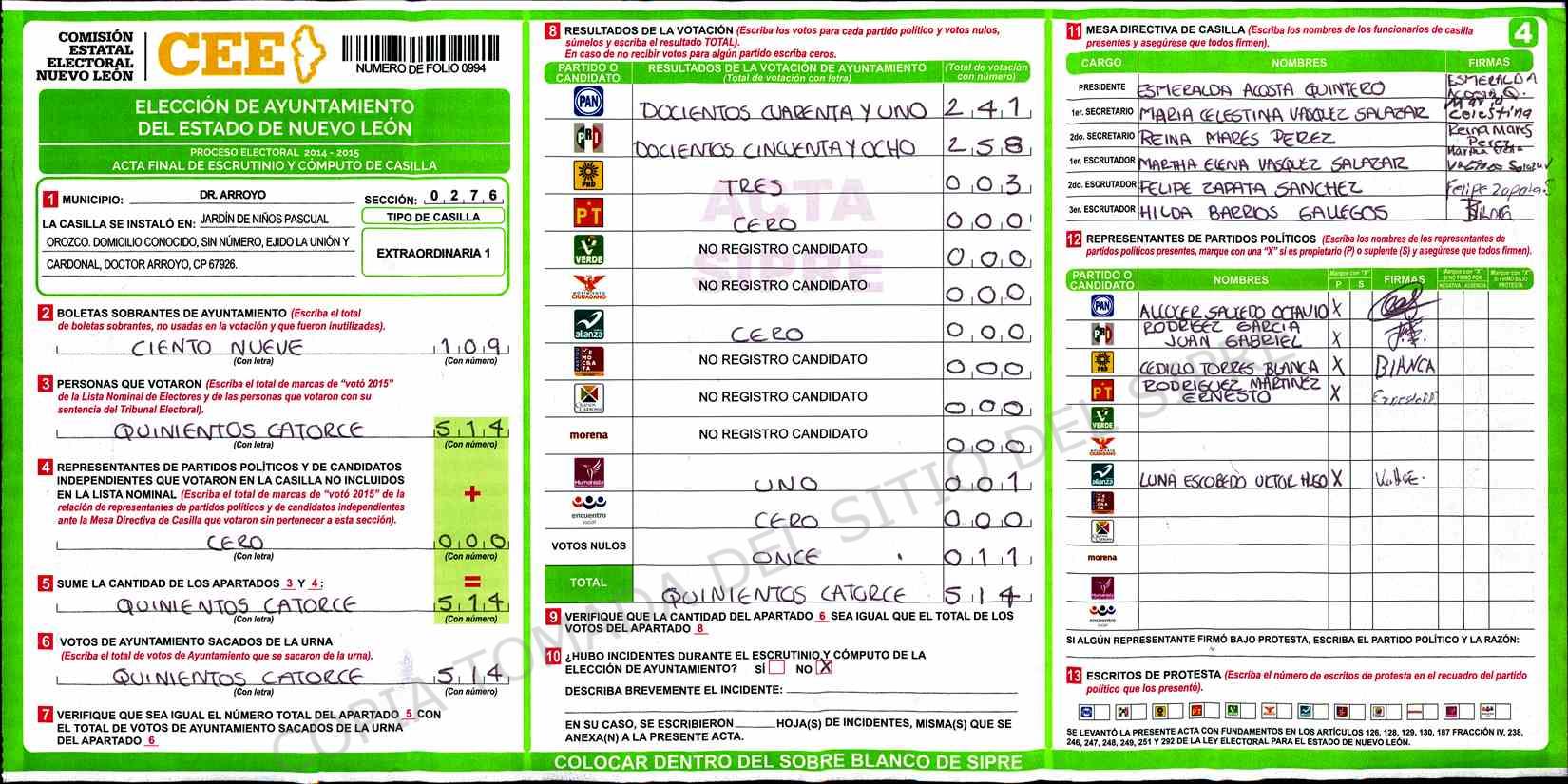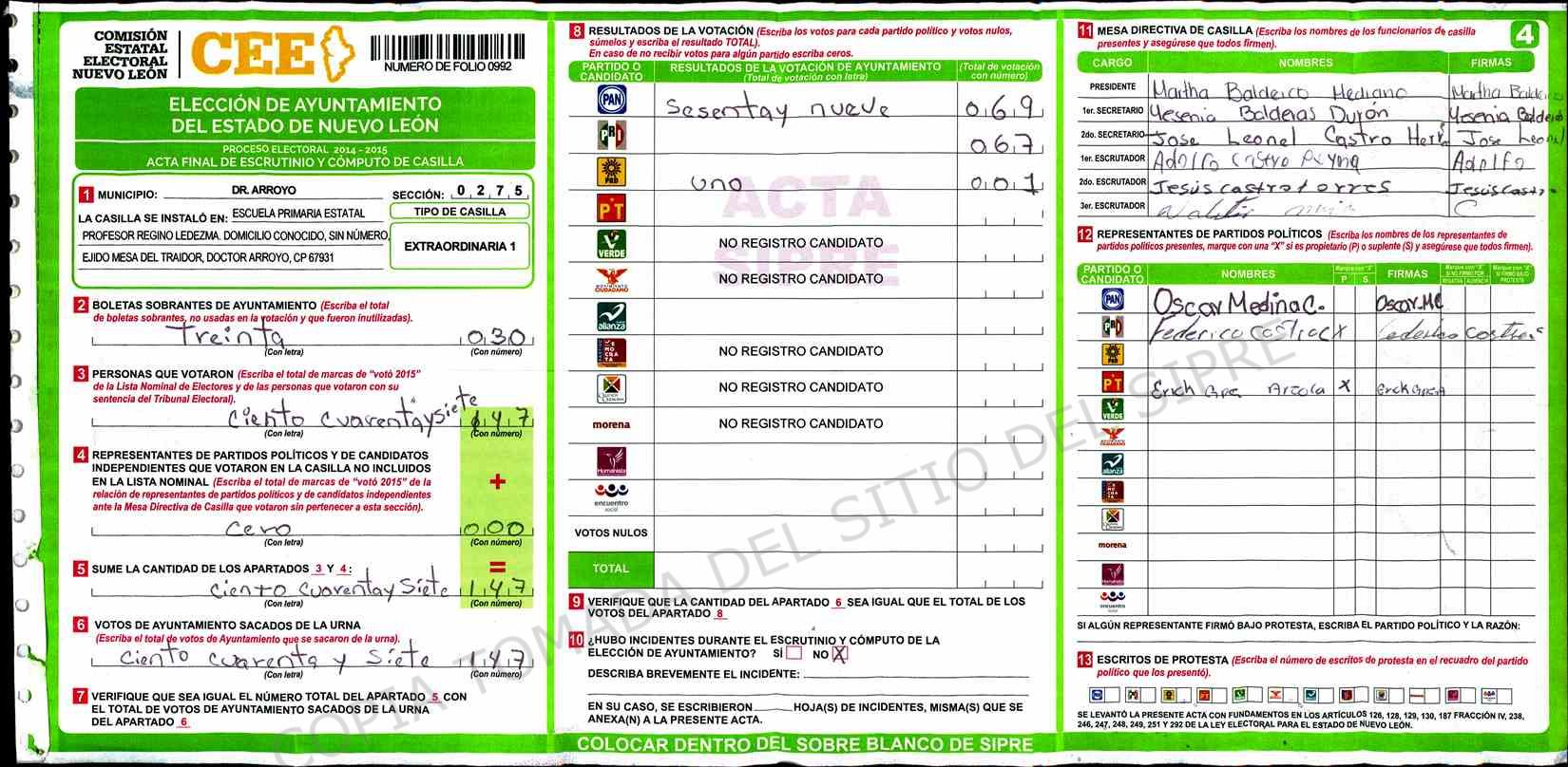 | Claves de Incidencia: | (1) Ilegible, (2) Mutilada, (3) Presenta Correcciones, (4) Presenta Borrones, (5) En Blanco, (6) Cifras Remarcadas, (7) Cifras de Mas, (8) Copiado Movido, (9) Con Signos Inválidos, (10) Excede Lista Nominal, (11) Otra |