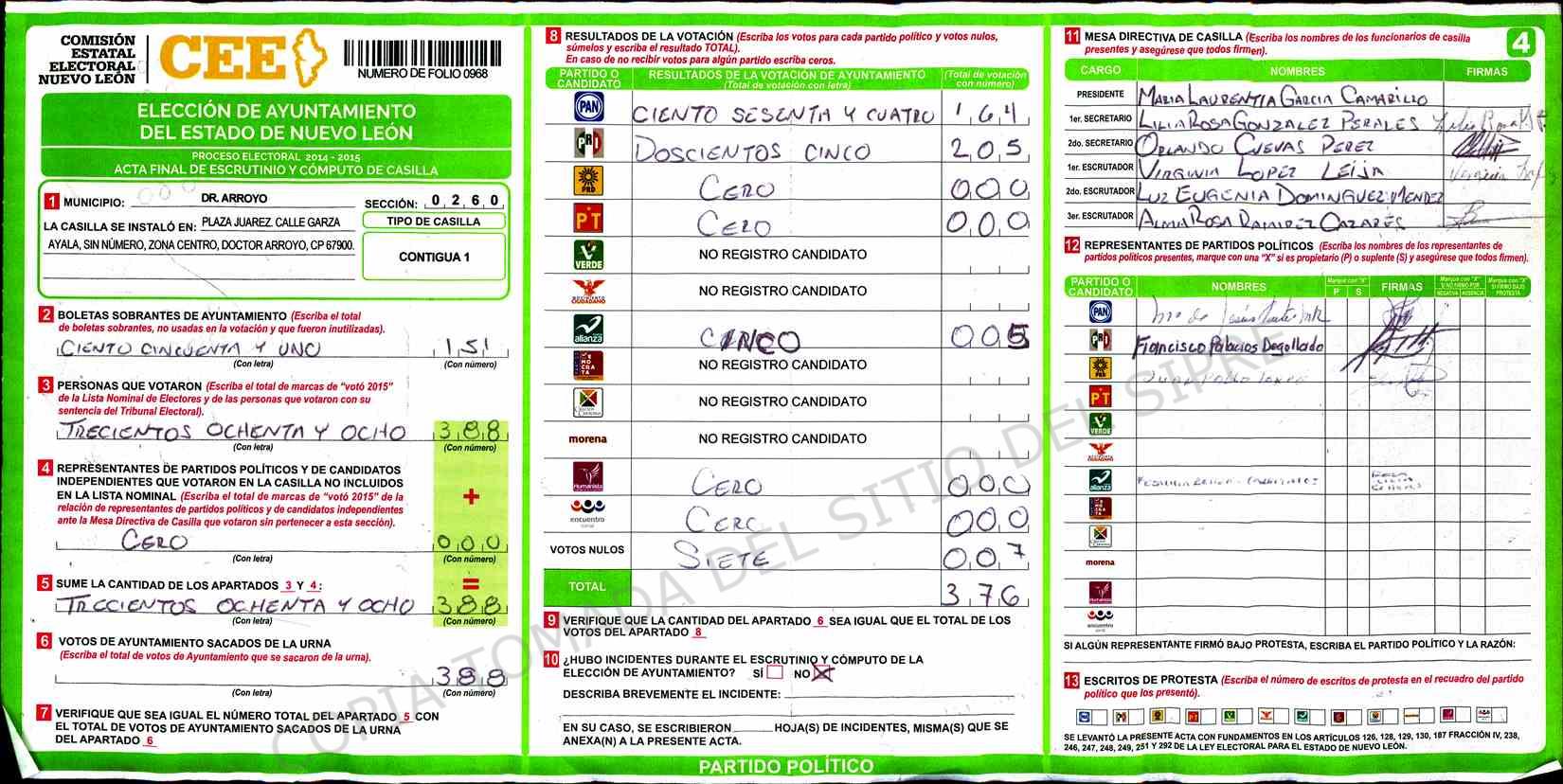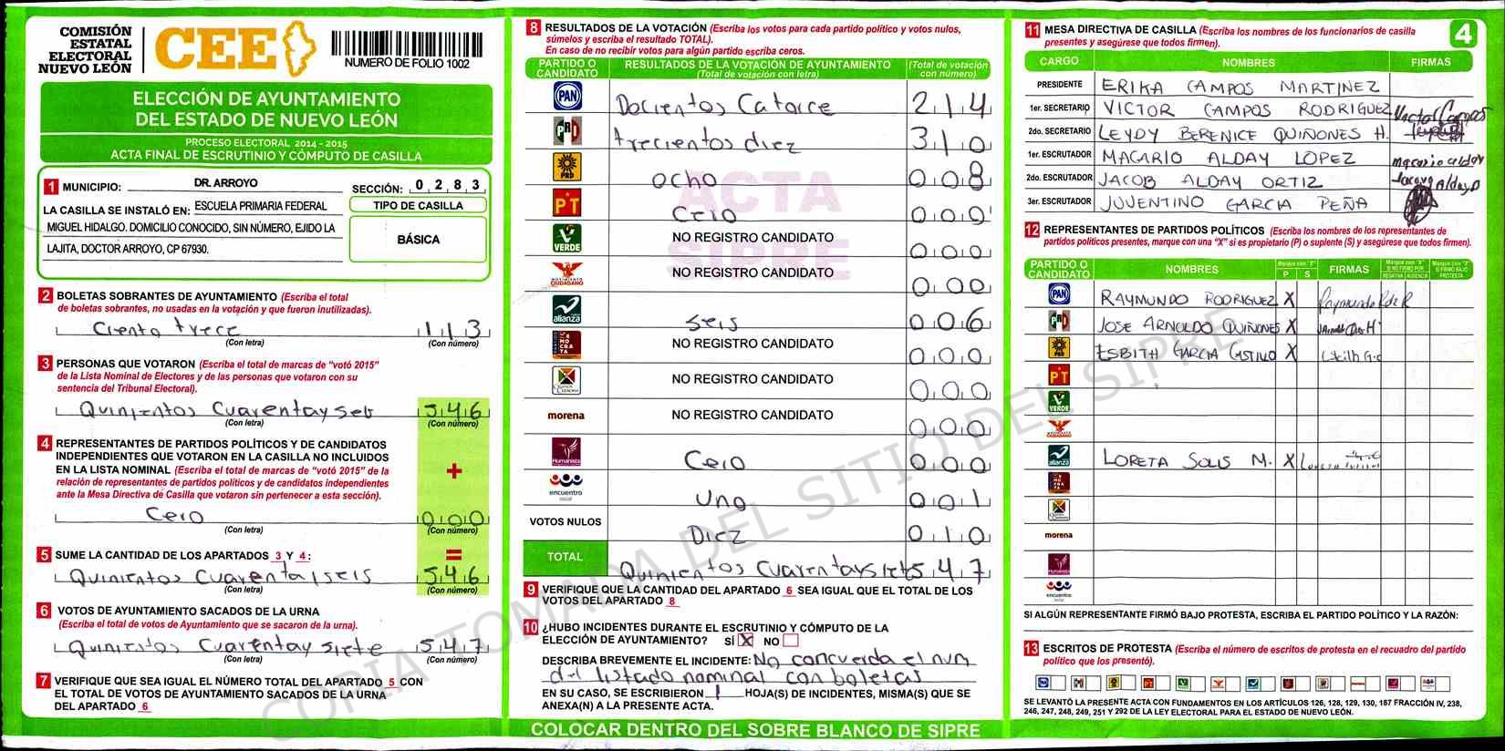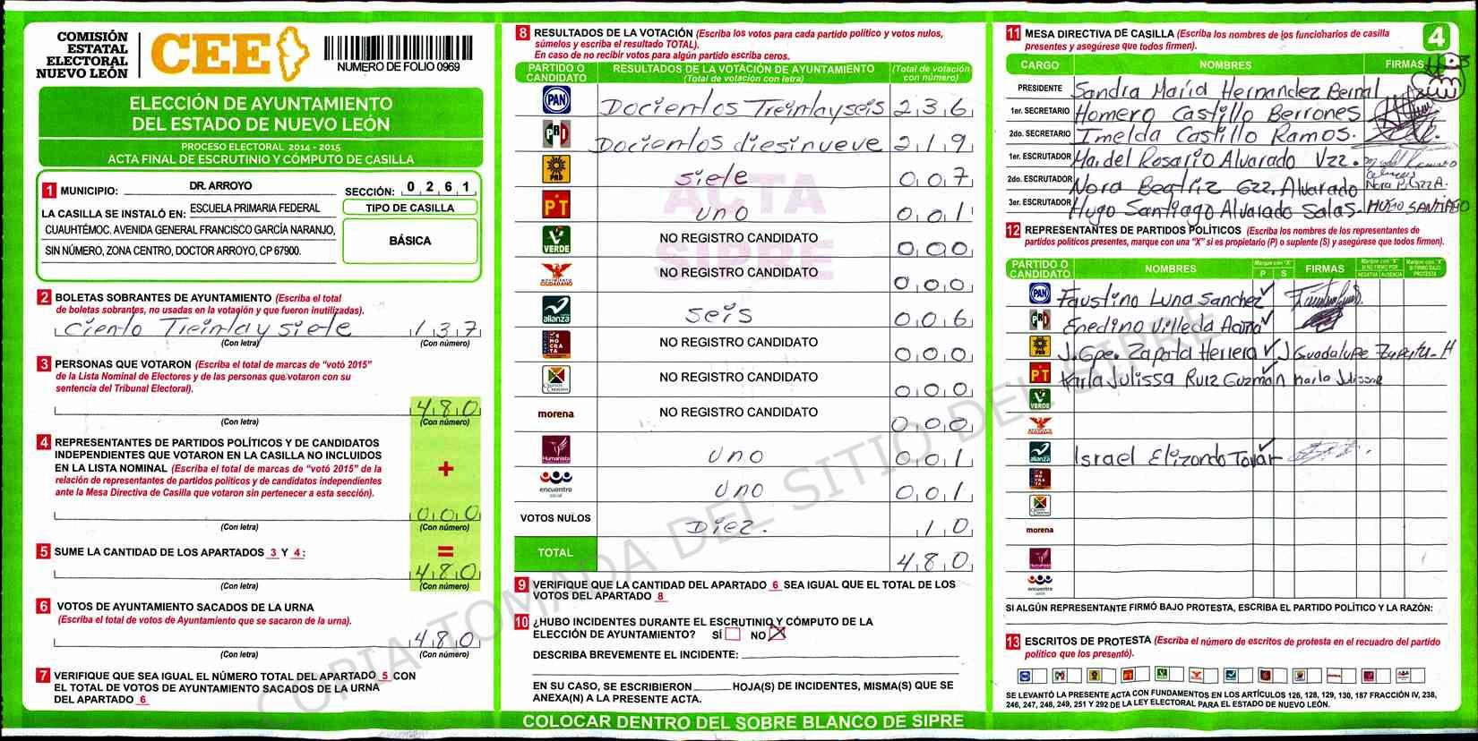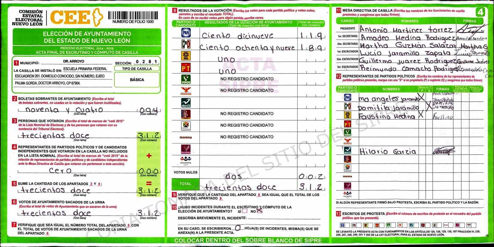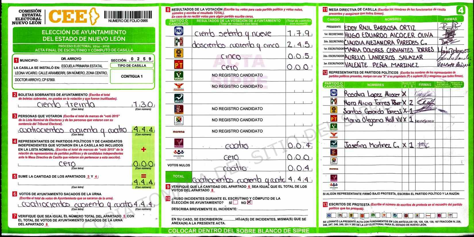| Claves de Incidencia: | (1) Ilegible, (2) Mutilada, (3) Presenta Correcciones, (4) Presenta Borrones, (5) En Blanco, (6) Cifras Remarcadas, (7) Cifras de Mas, (8) Copiado Movido, (9) Con Signos Inválidos, (10) Excede Lista Nominal, (11) Otra |