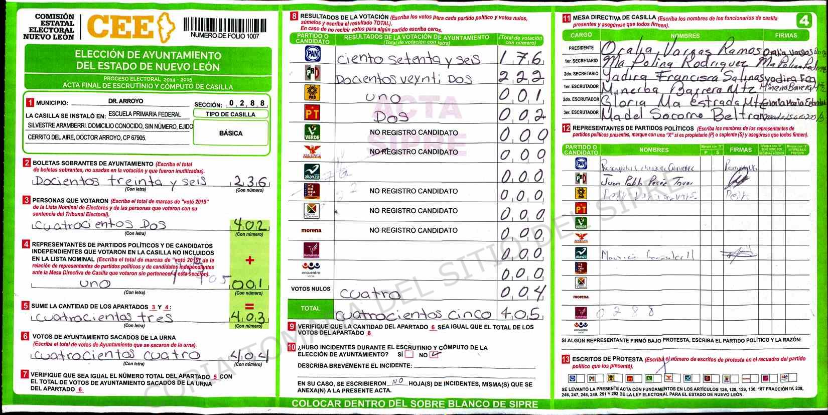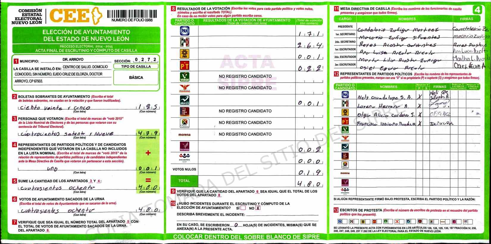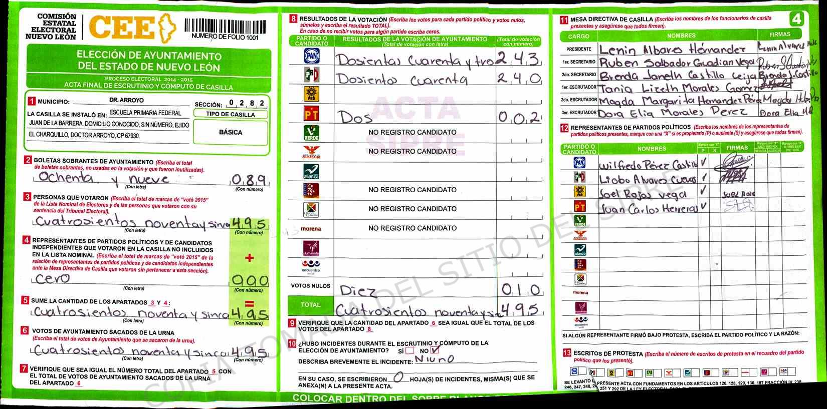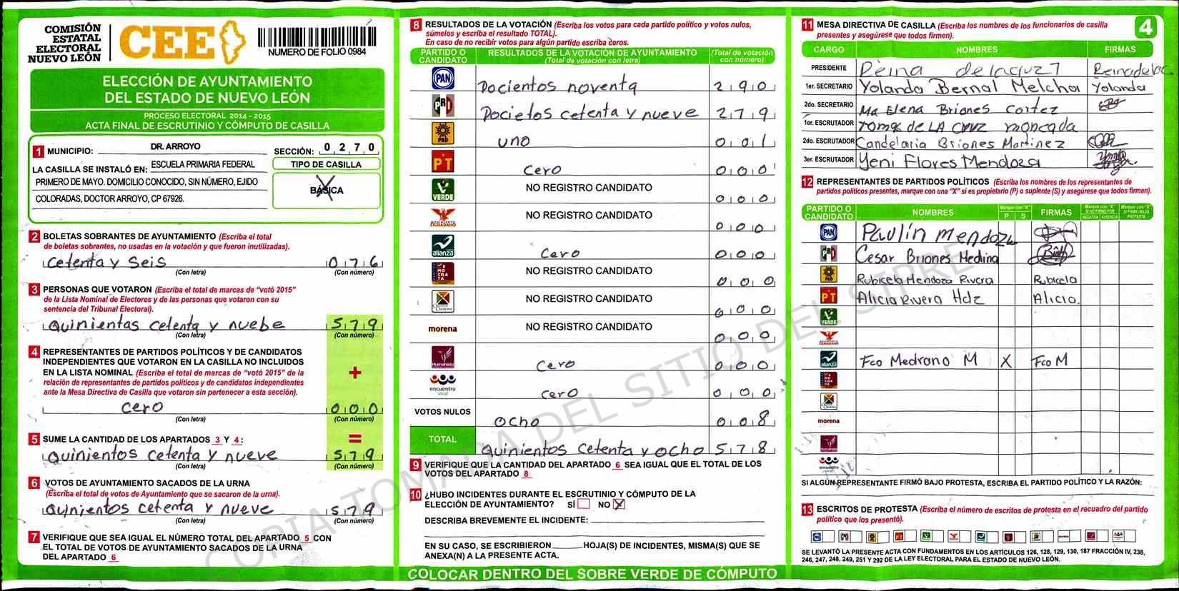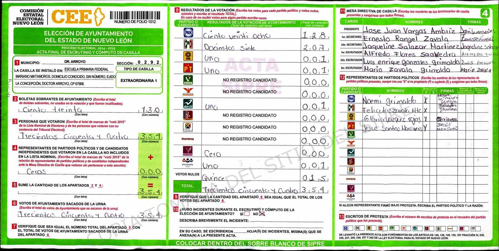 | Claves de Incidencia: | (1) Ilegible, (2) Mutilada, (3) Presenta Correcciones, (4) Presenta Borrones, (5) En Blanco, (6) Cifras Remarcadas, (7) Cifras de Mas, (8) Copiado Movido, (9) Con Signos Inválidos, (10) Excede Lista Nominal, (11) Otra |