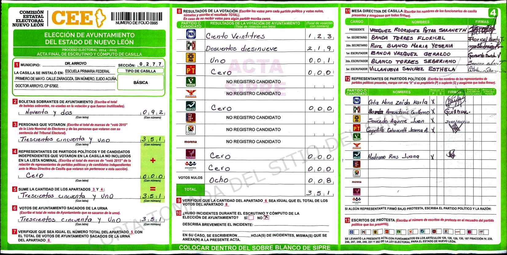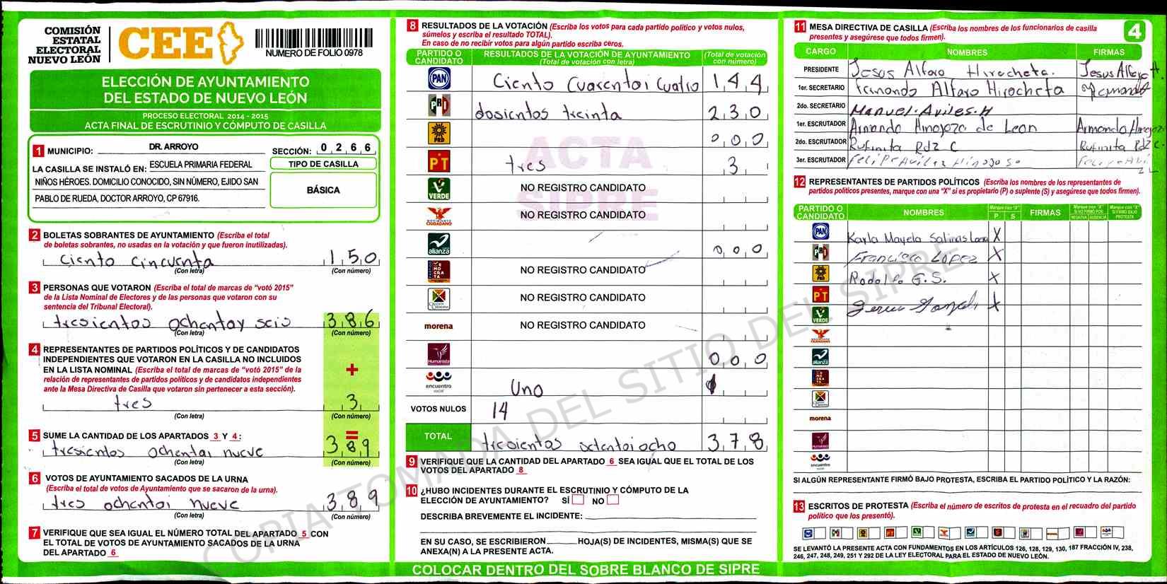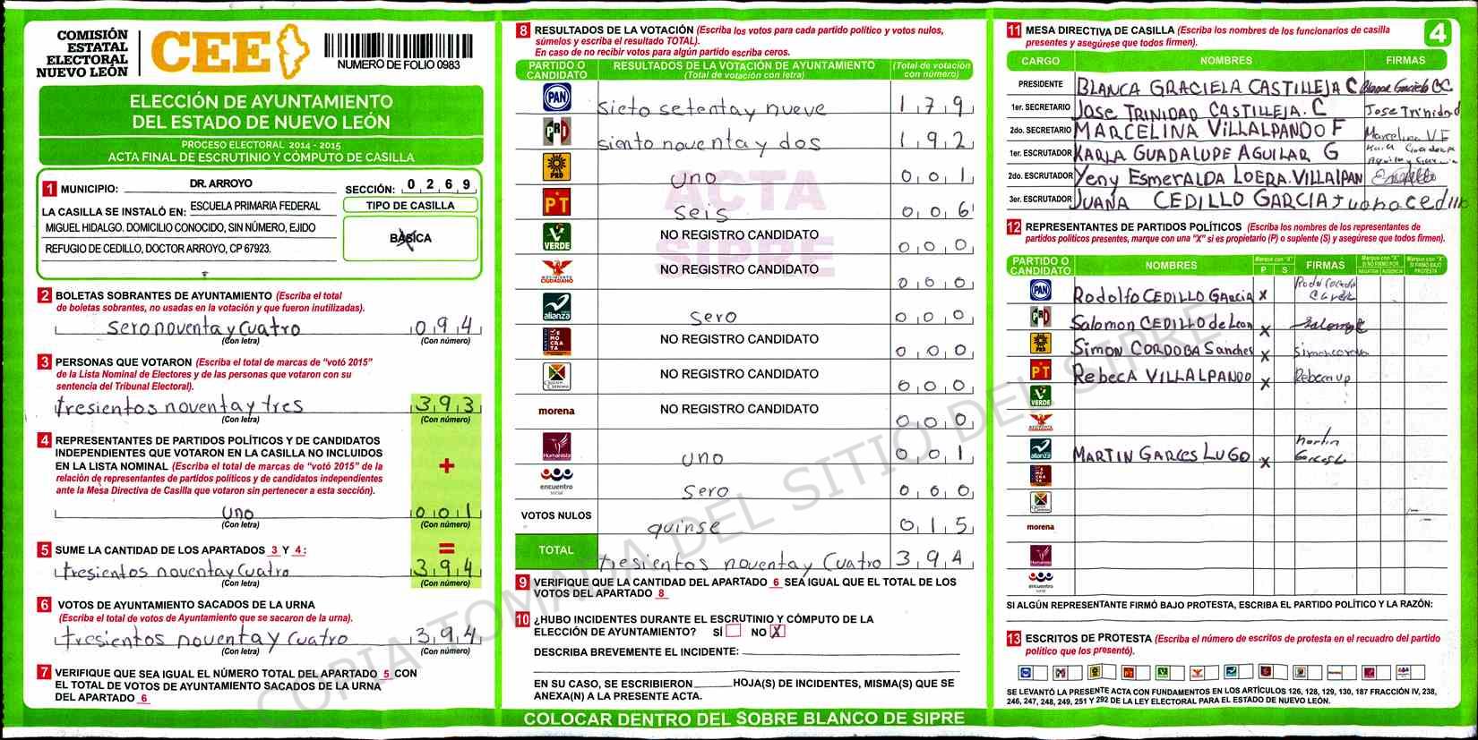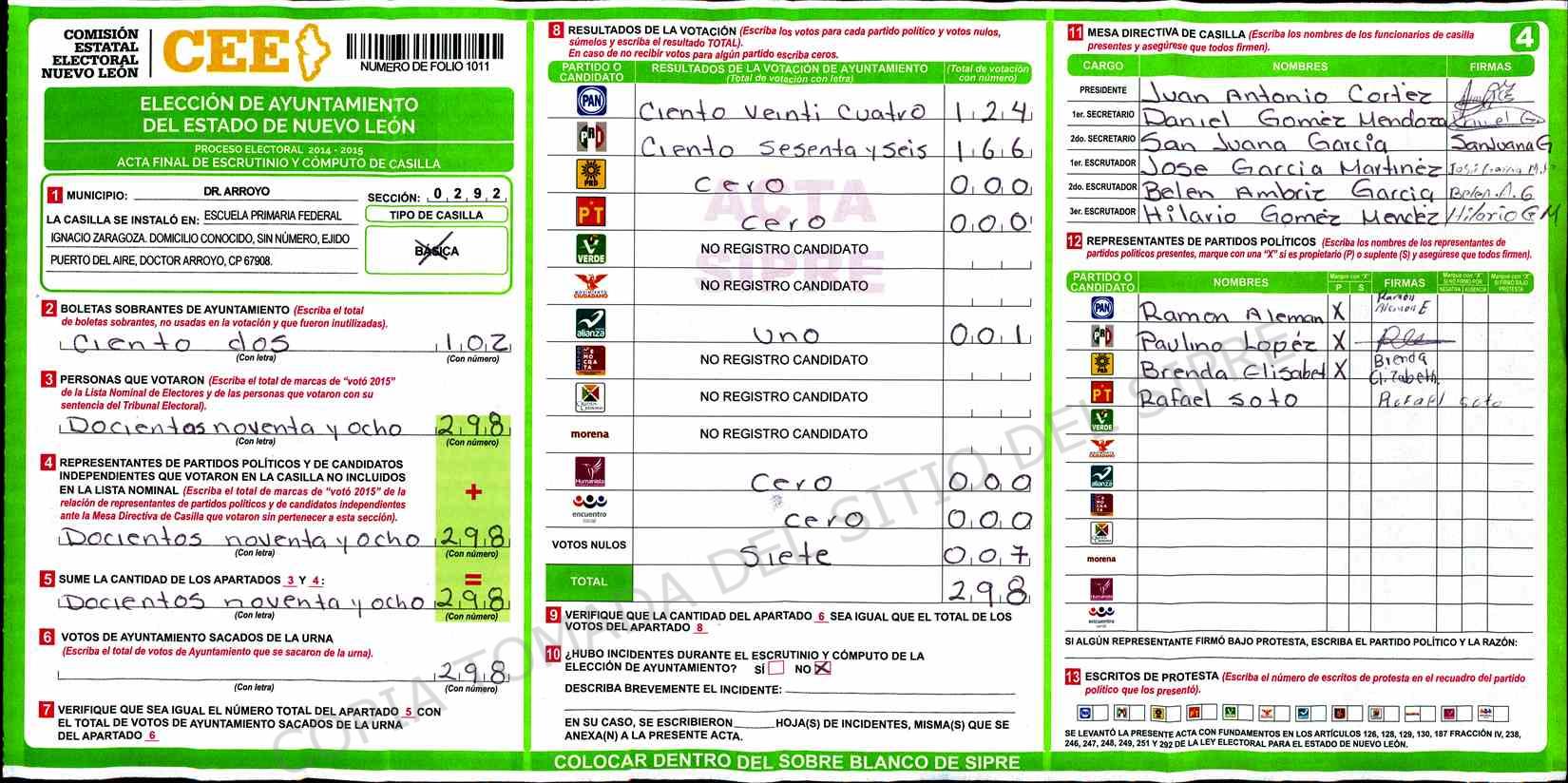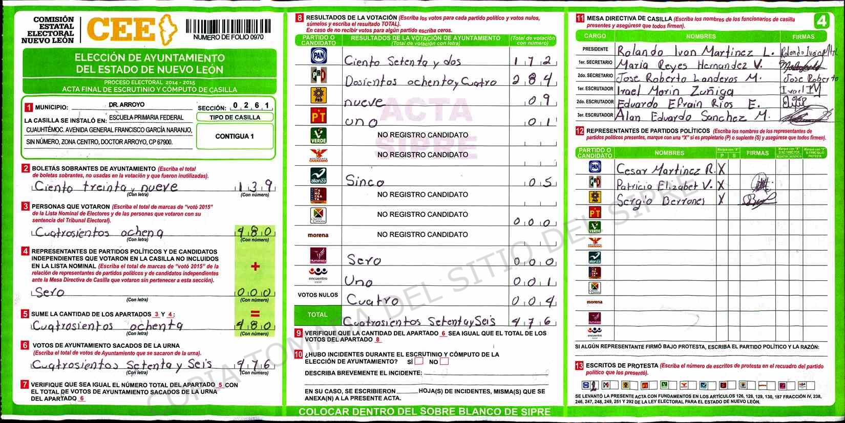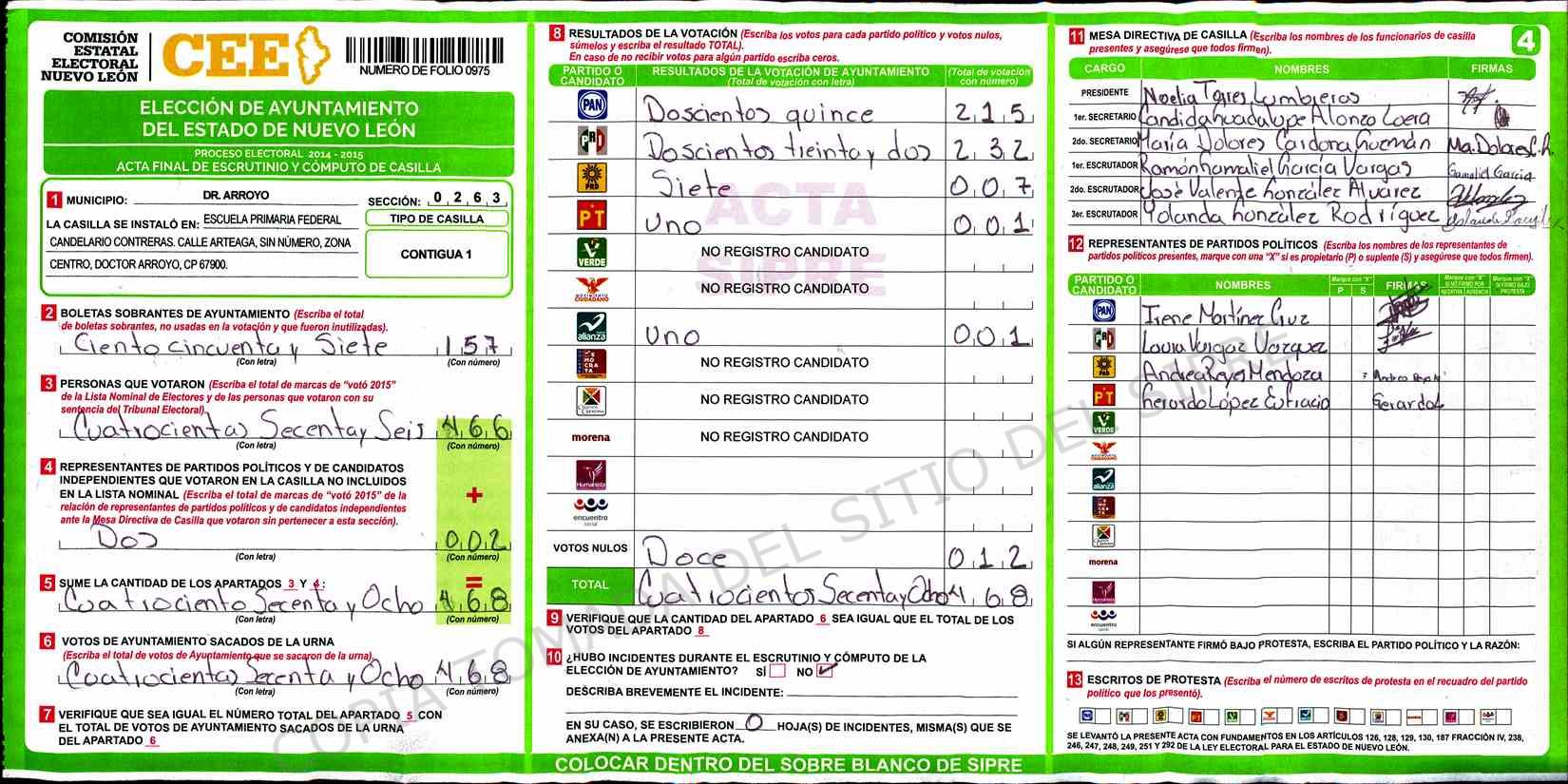 | Claves de Incidencia: | (1) Ilegible, (2) Mutilada, (3) Presenta Correcciones, (4) Presenta Borrones, (5) En Blanco, (6) Cifras Remarcadas, (7) Cifras de Mas, (8) Copiado Movido, (9) Con Signos Inválidos, (10) Excede Lista Nominal, (11) Otra |