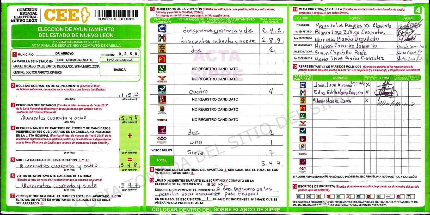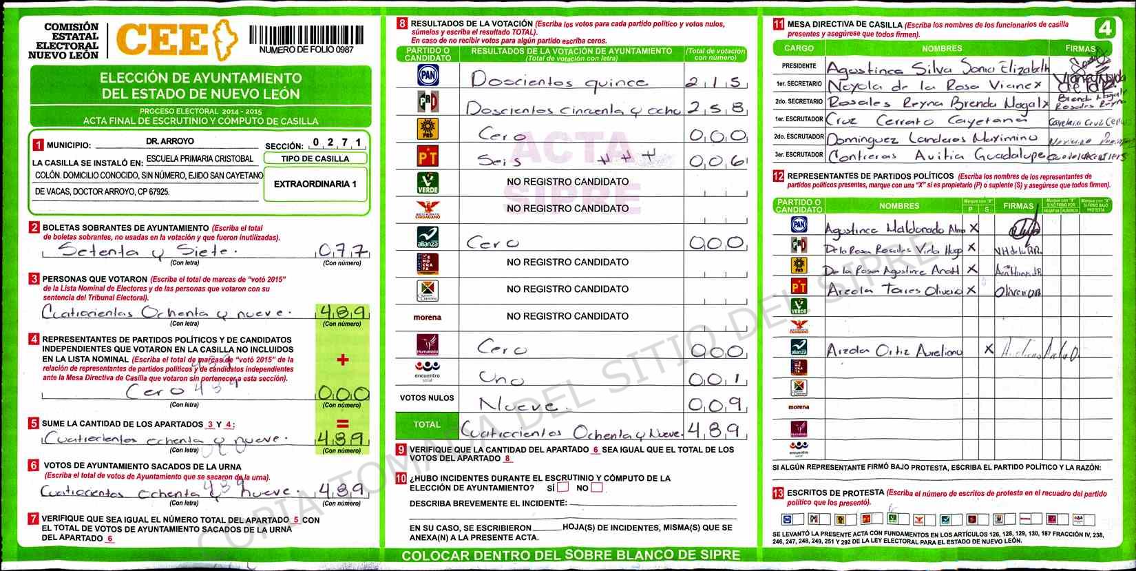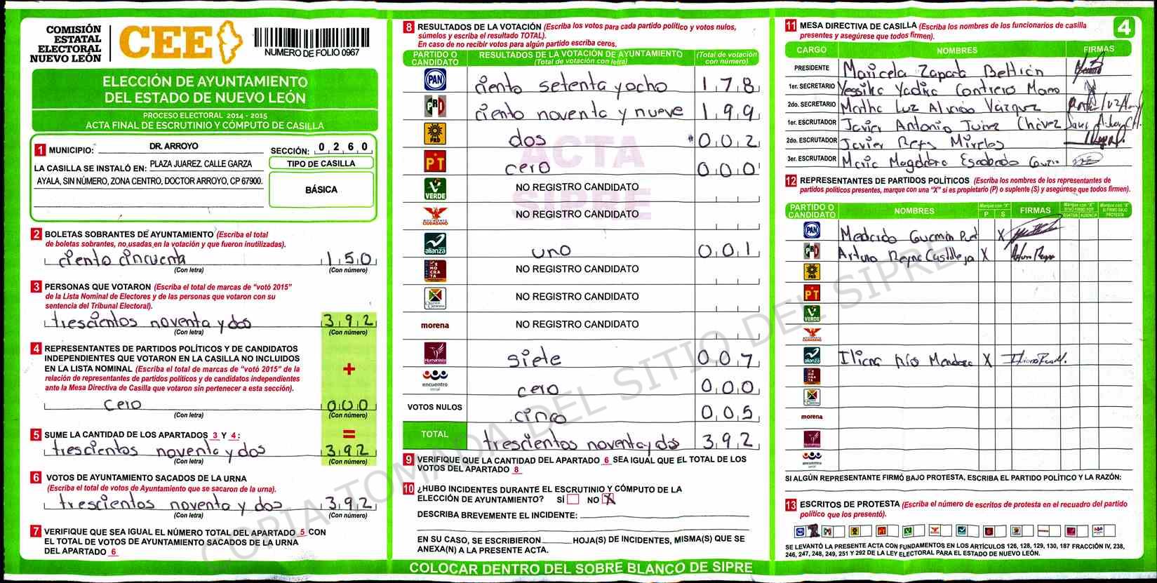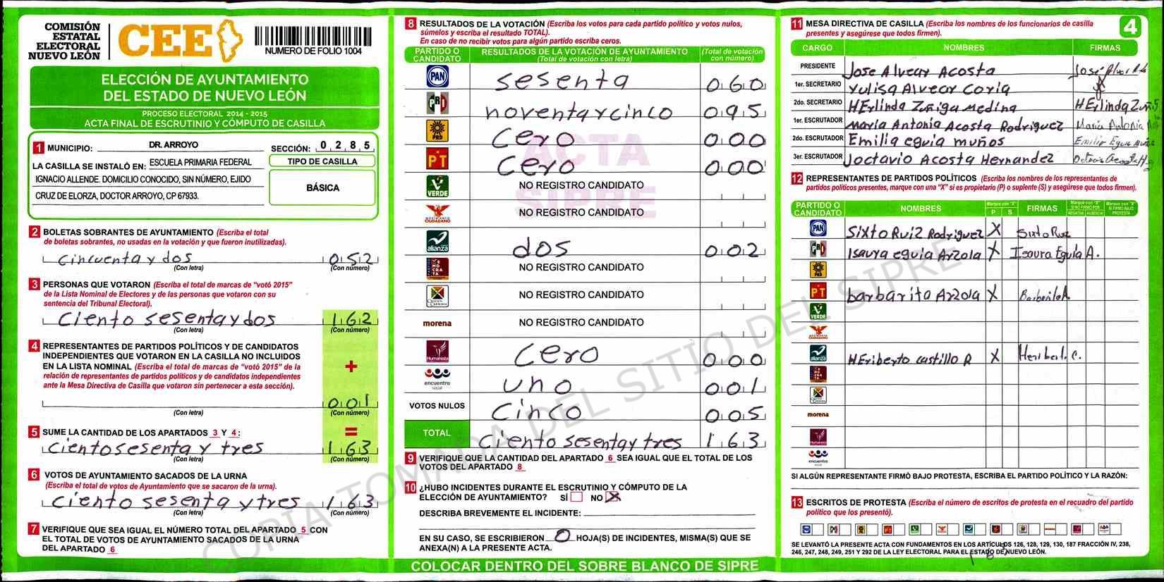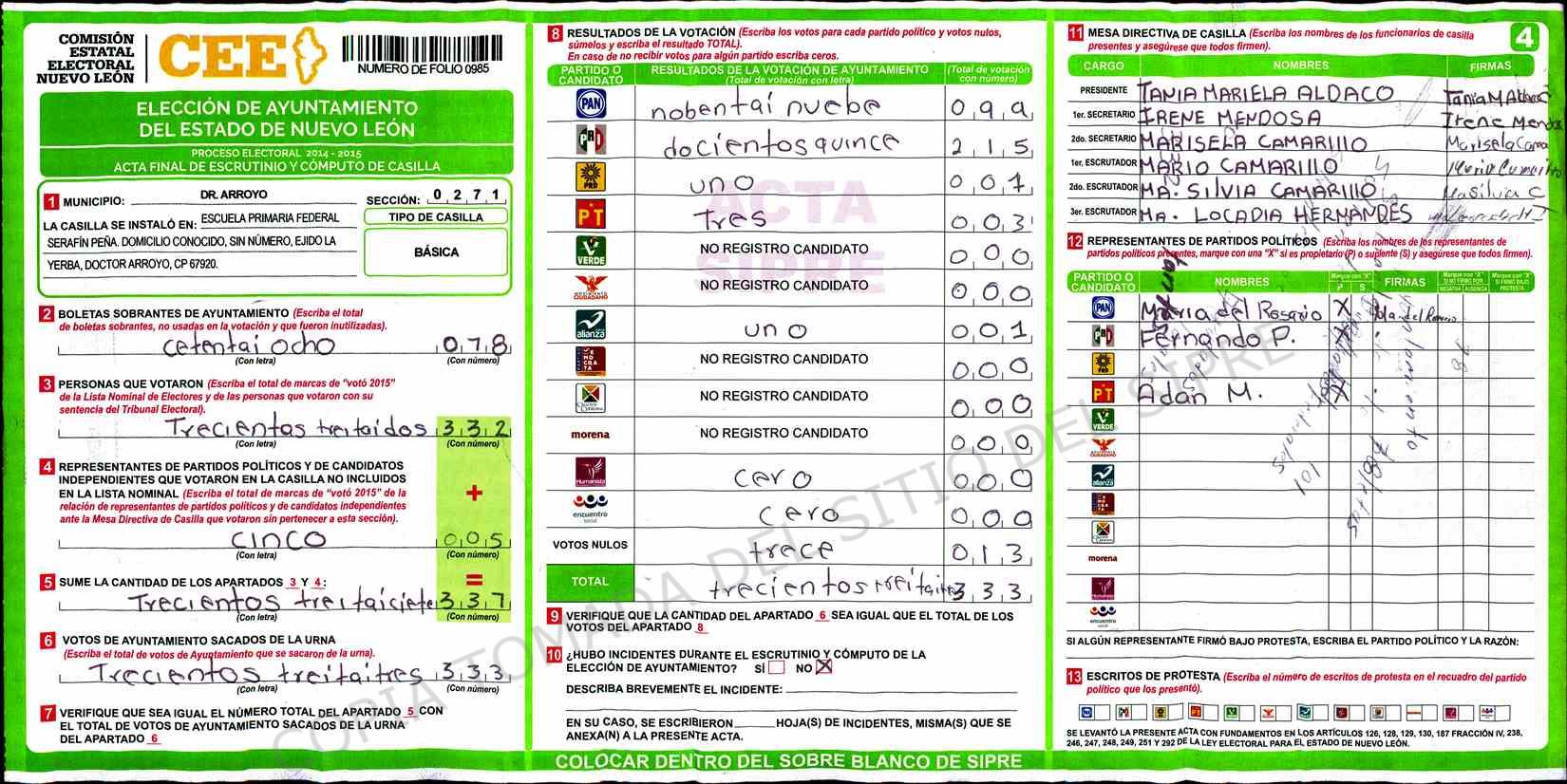 | Claves de Incidencia: | (1) Ilegible, (2) Mutilada, (3) Presenta Correcciones, (4) Presenta Borrones, (5) En Blanco, (6) Cifras Remarcadas, (7) Cifras de Mas, (8) Copiado Movido, (9) Con Signos Inválidos, (10) Excede Lista Nominal, (11) Otra |