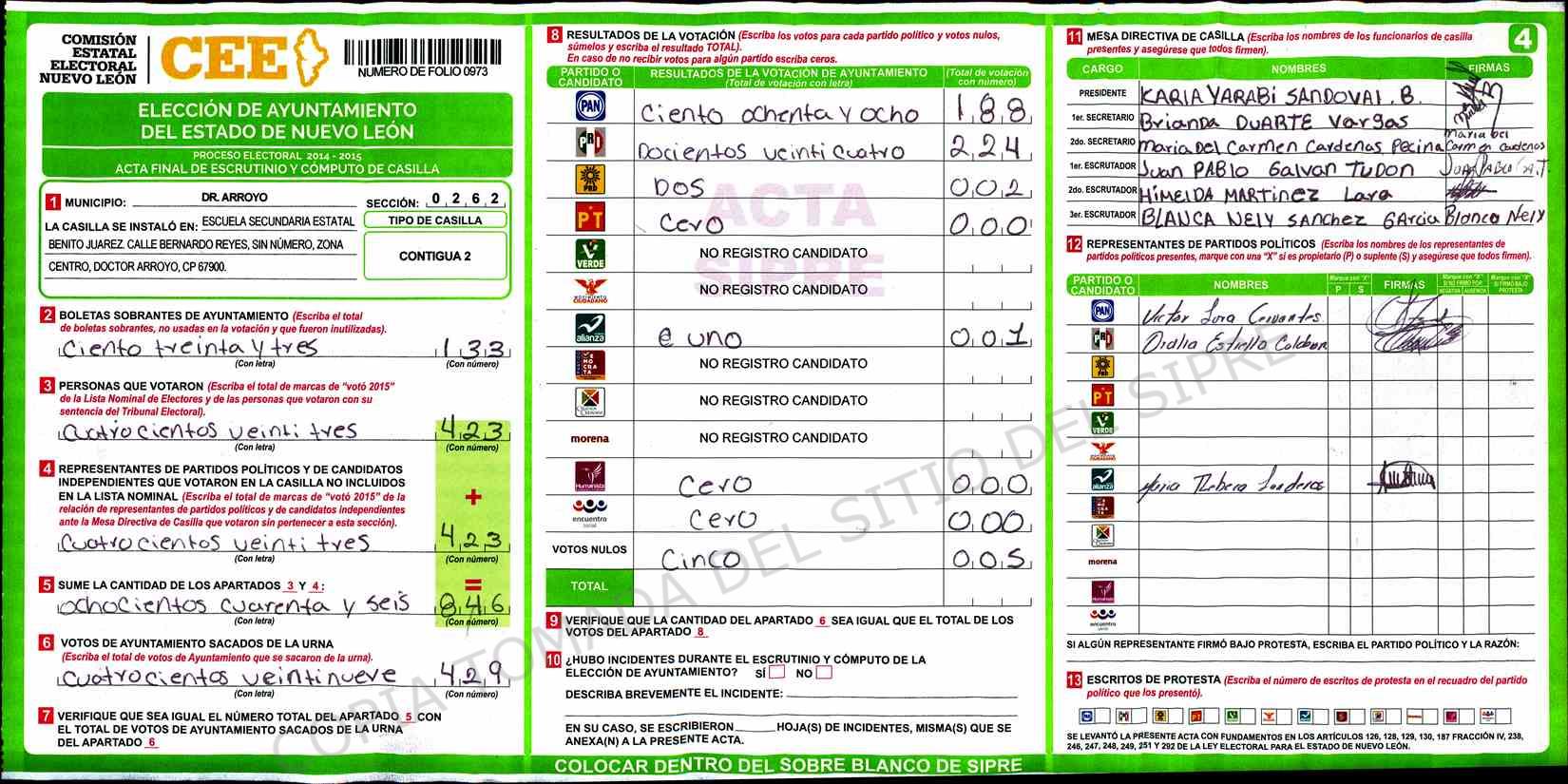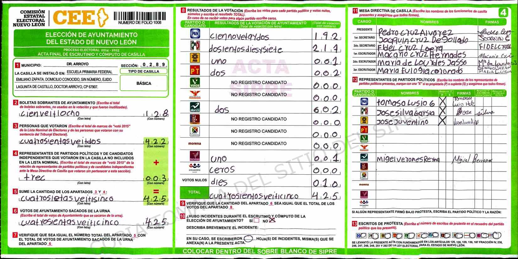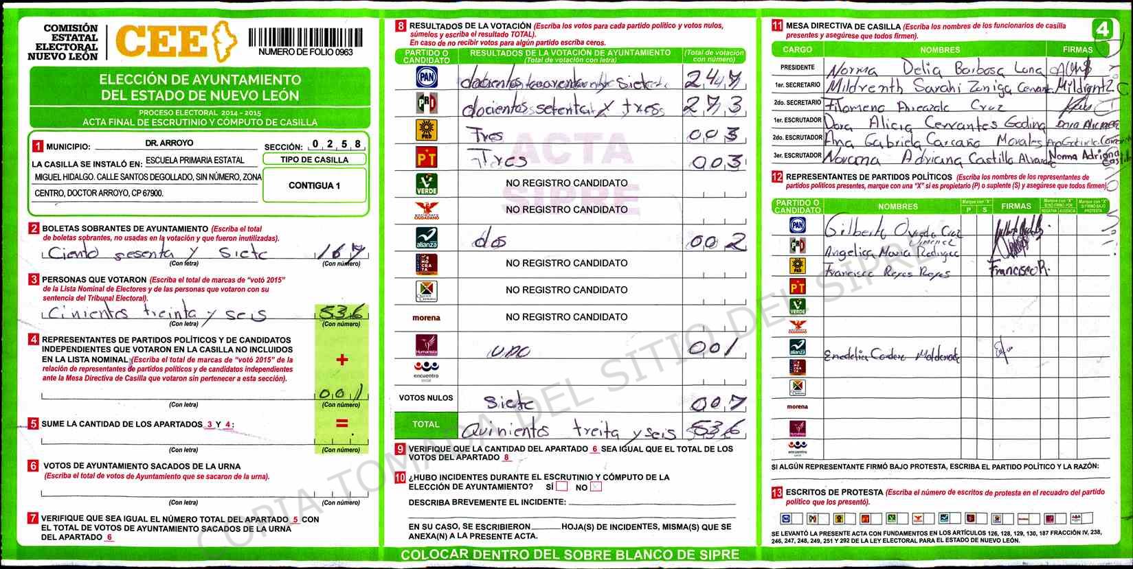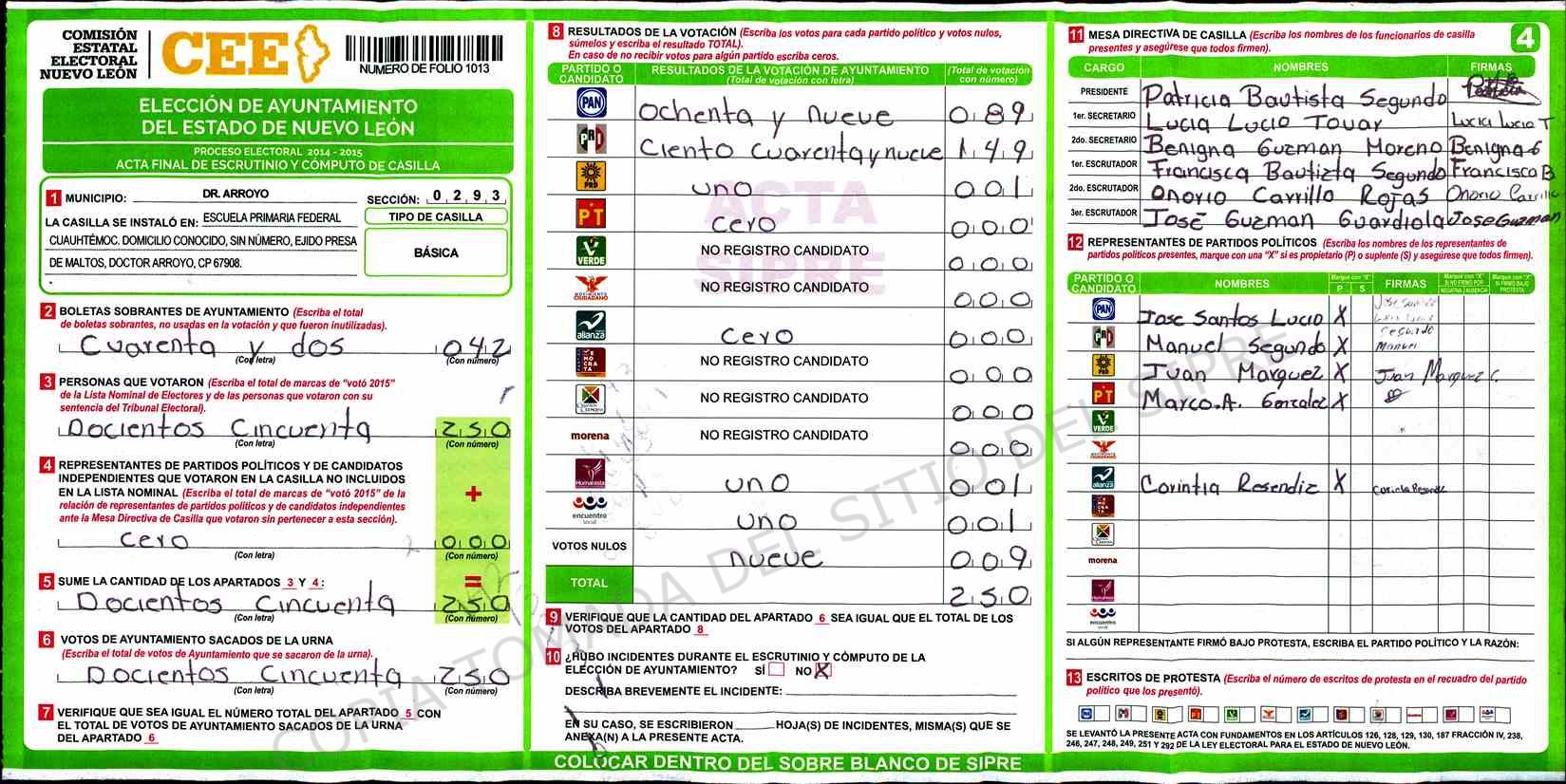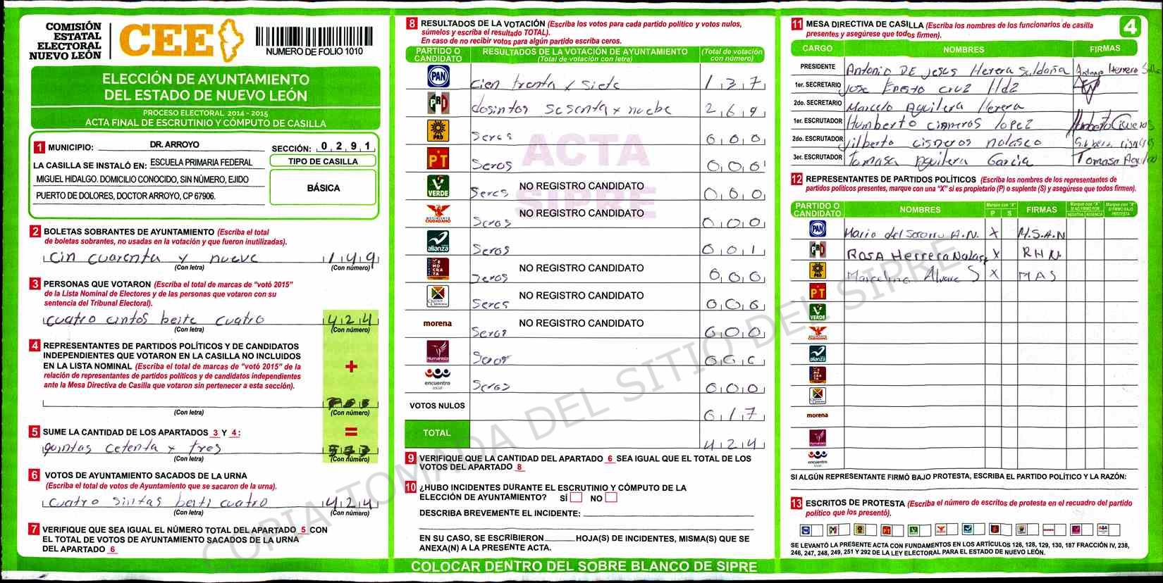 | Claves de Incidencia: | (1) Ilegible, (2) Mutilada, (3) Presenta Correcciones, (4) Presenta Borrones, (5) En Blanco, (6) Cifras Remarcadas, (7) Cifras de Mas, (8) Copiado Movido, (9) Con Signos Inválidos, (10) Excede Lista Nominal, (11) Otra |