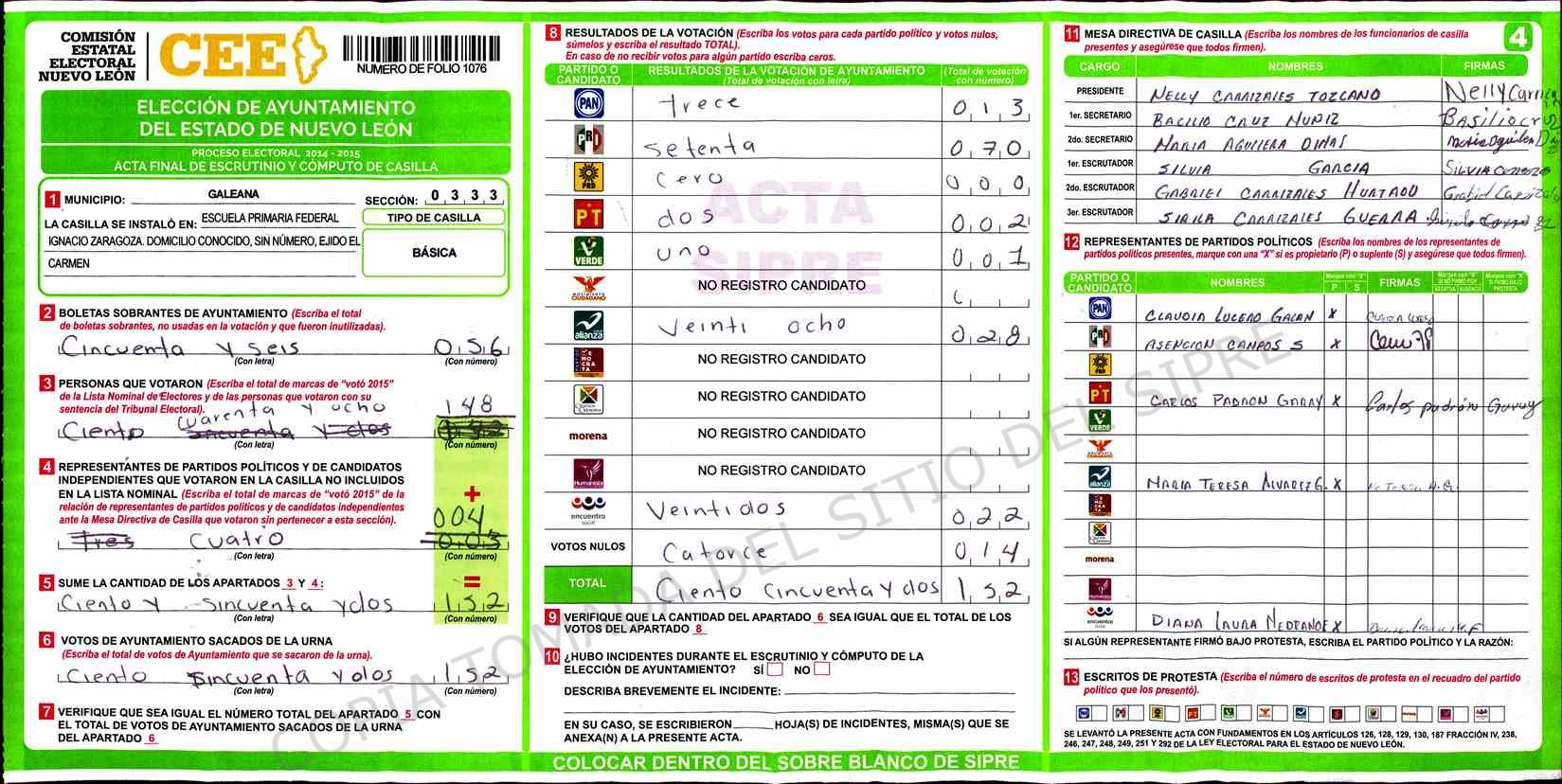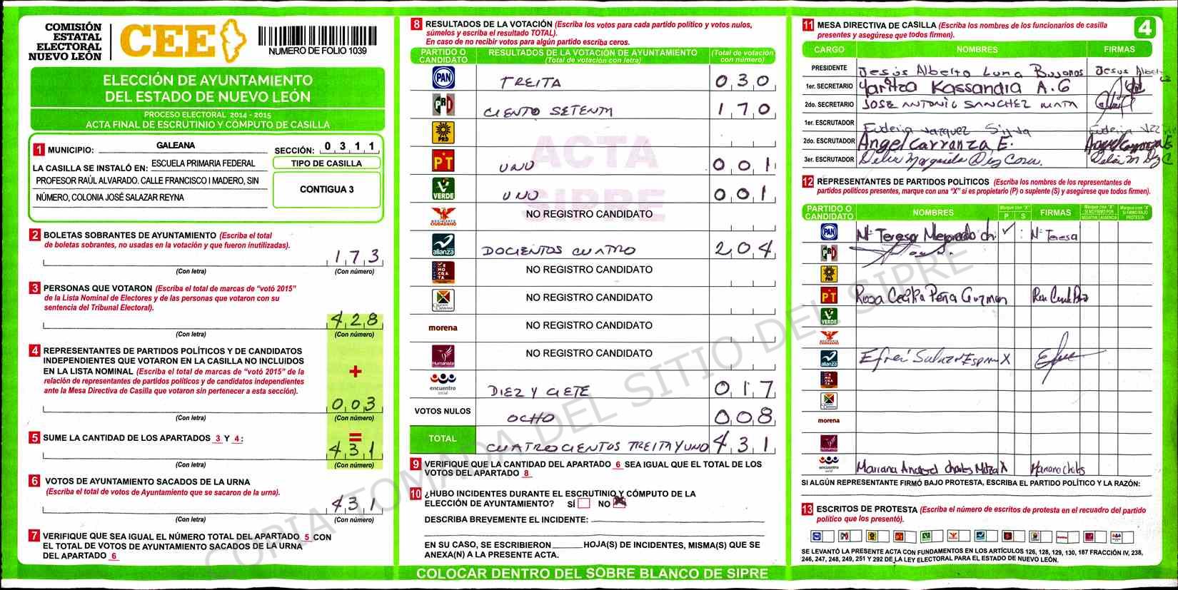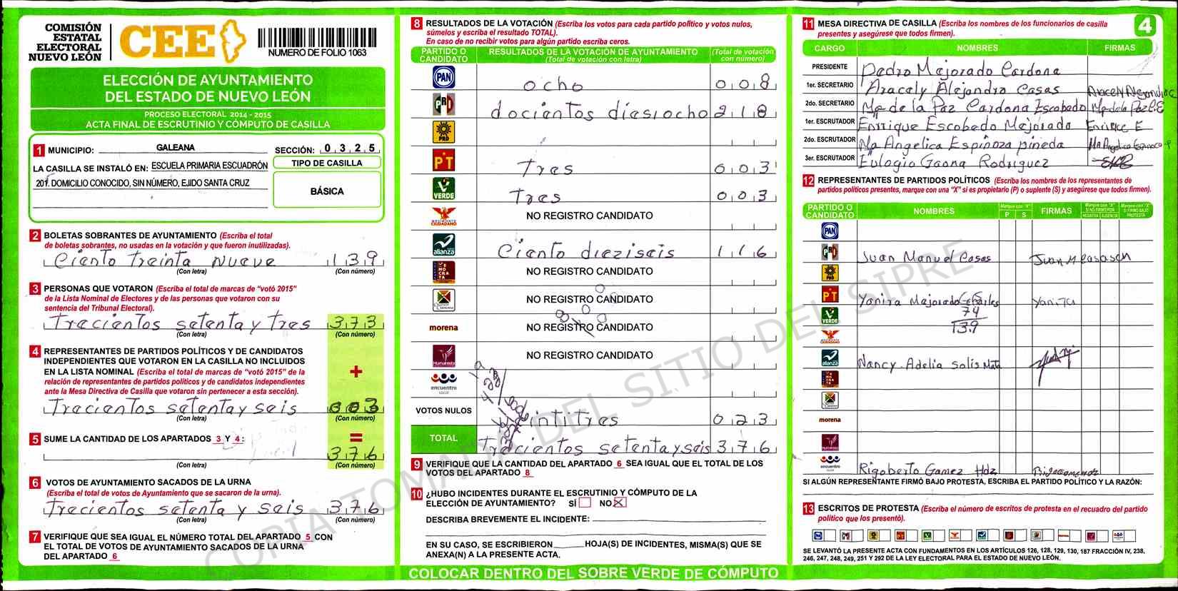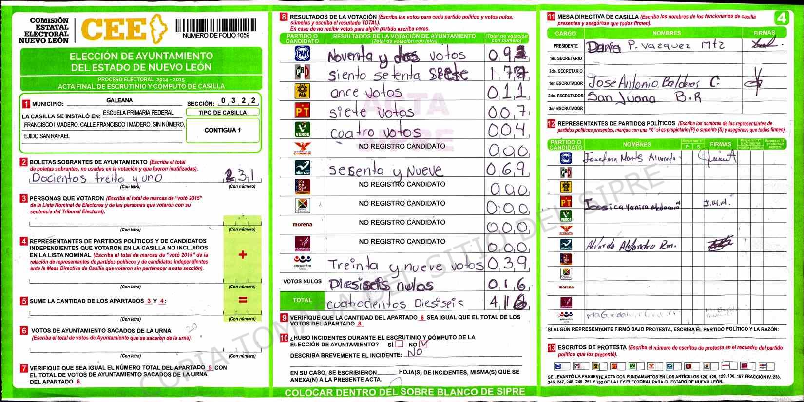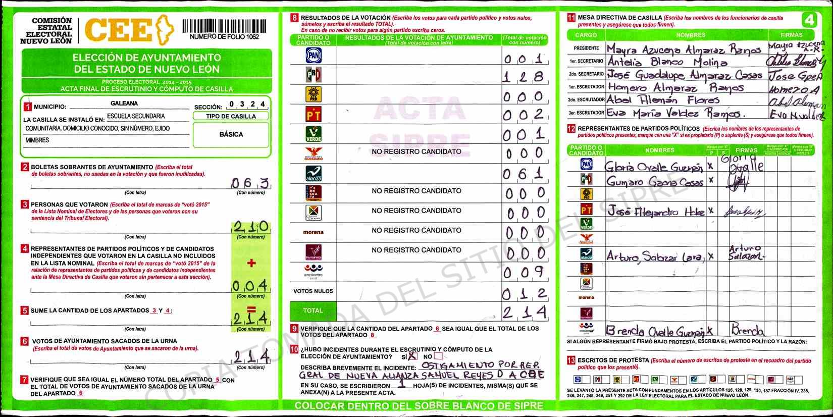 | Claves de Incidencia: | (1) Ilegible, (2) Mutilada, (3) Presenta Correcciones, (4) Presenta Borrones, (5) En Blanco, (6) Cifras Remarcadas, (7) Cifras de Mas, (8) Copiado Movido, (9) Con Signos Inválidos, (10) Excede Lista Nominal, (11) Otra |