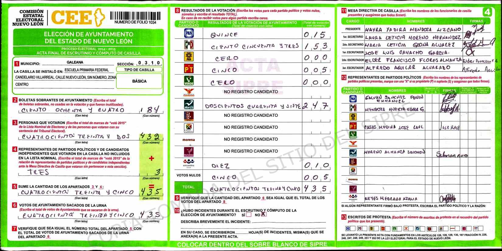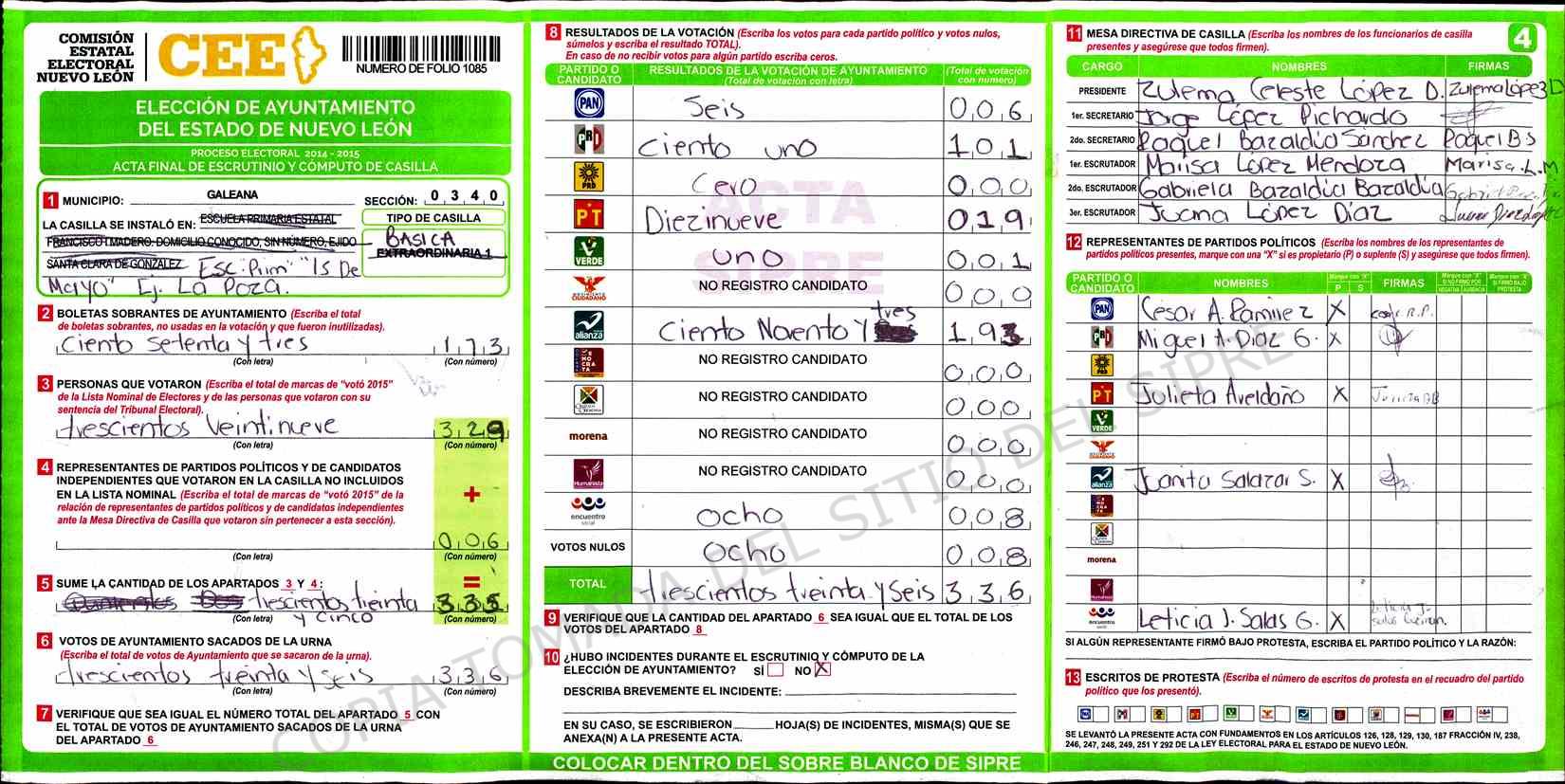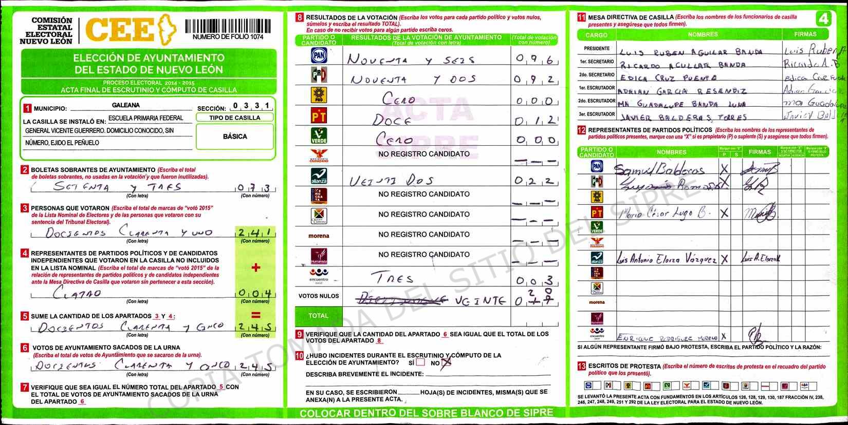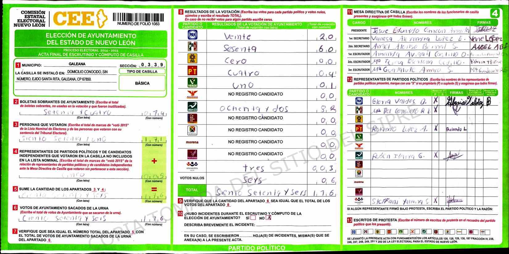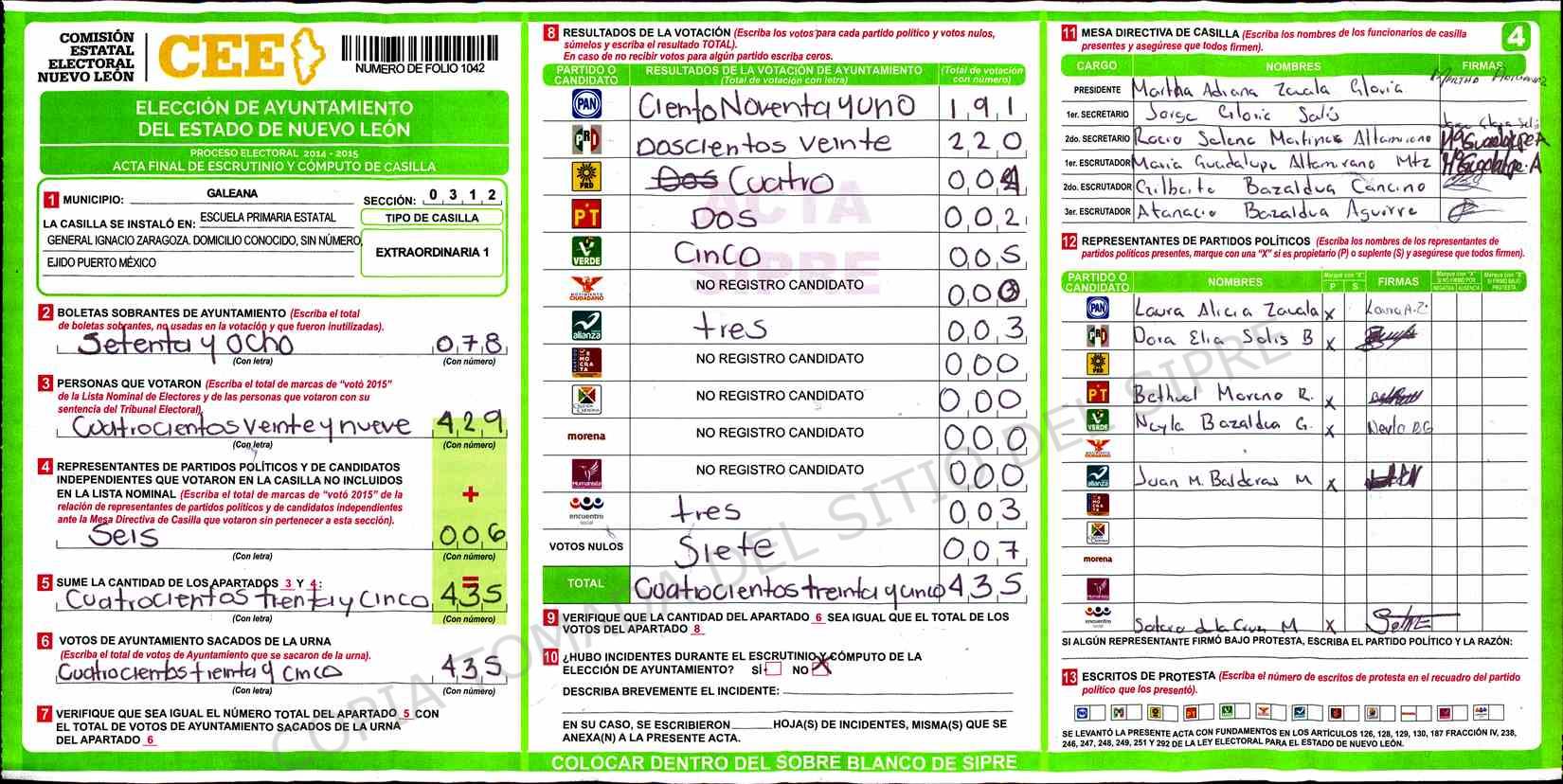| Claves de Incidencia: | (1) Ilegible, (2) Mutilada, (3) Presenta Correcciones, (4) Presenta Borrones, (5) En Blanco, (6) Cifras Remarcadas, (7) Cifras de Mas, (8) Copiado Movido, (9) Con Signos Inválidos, (10) Excede Lista Nominal, (11) Otra |