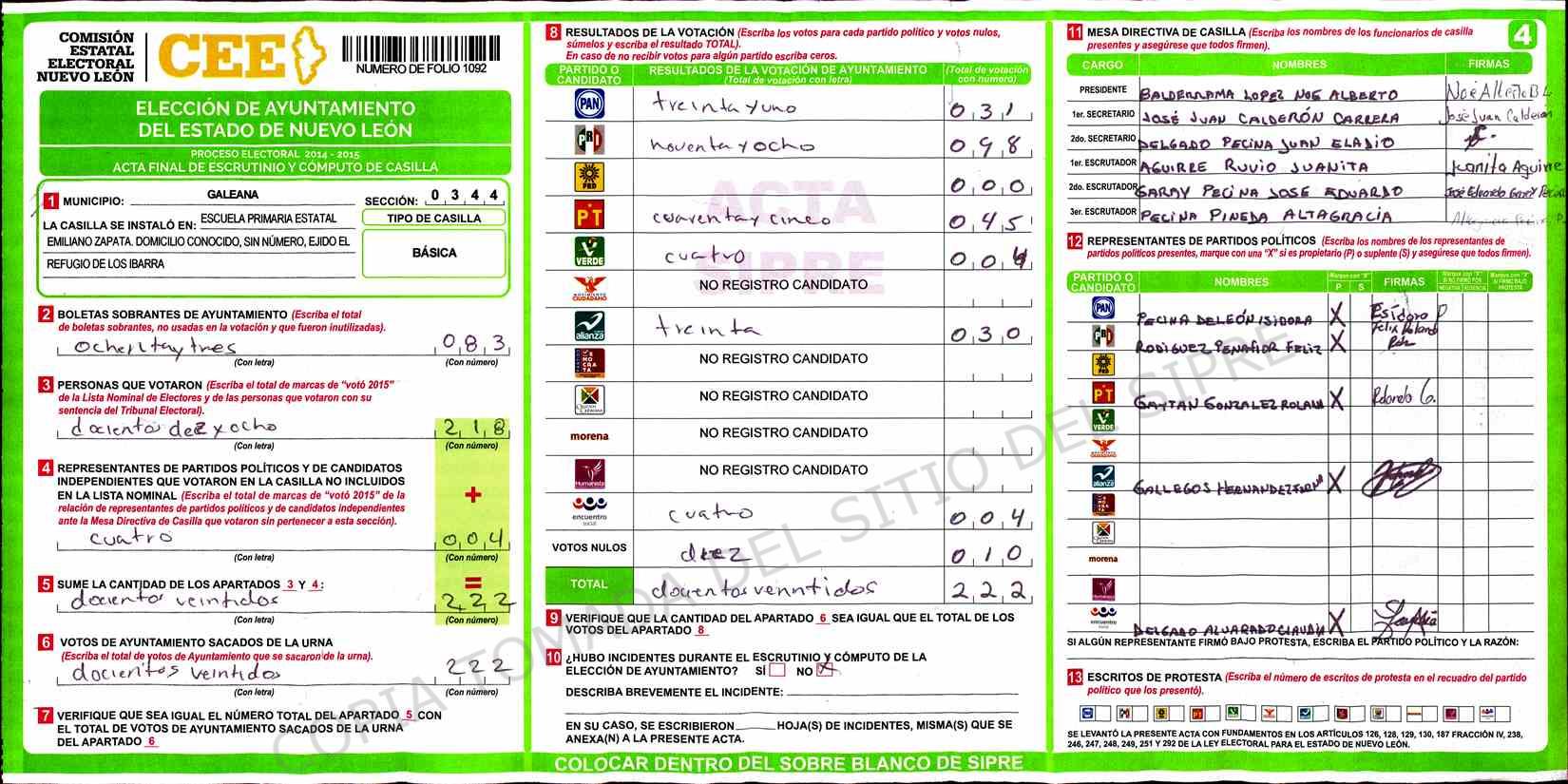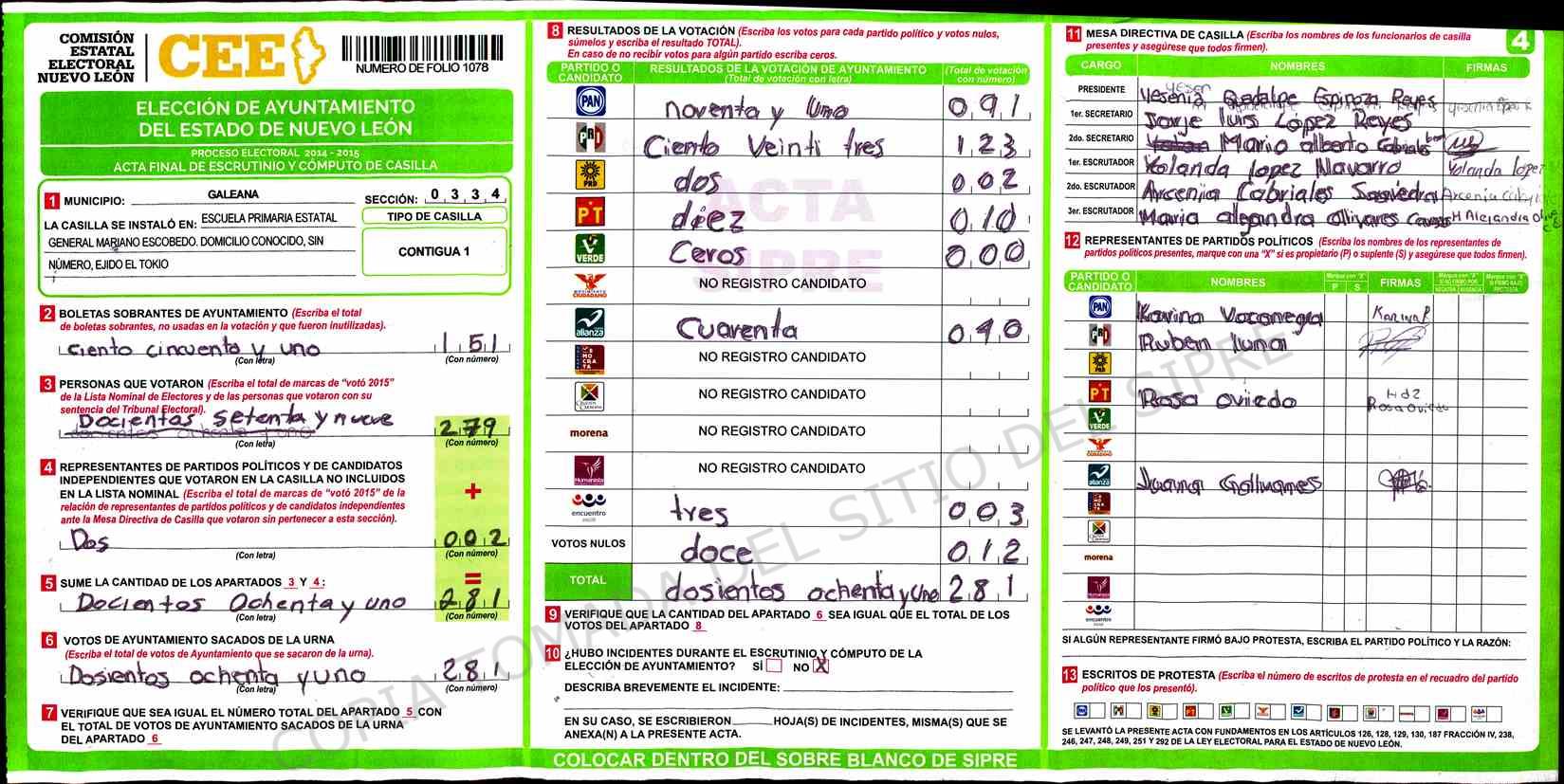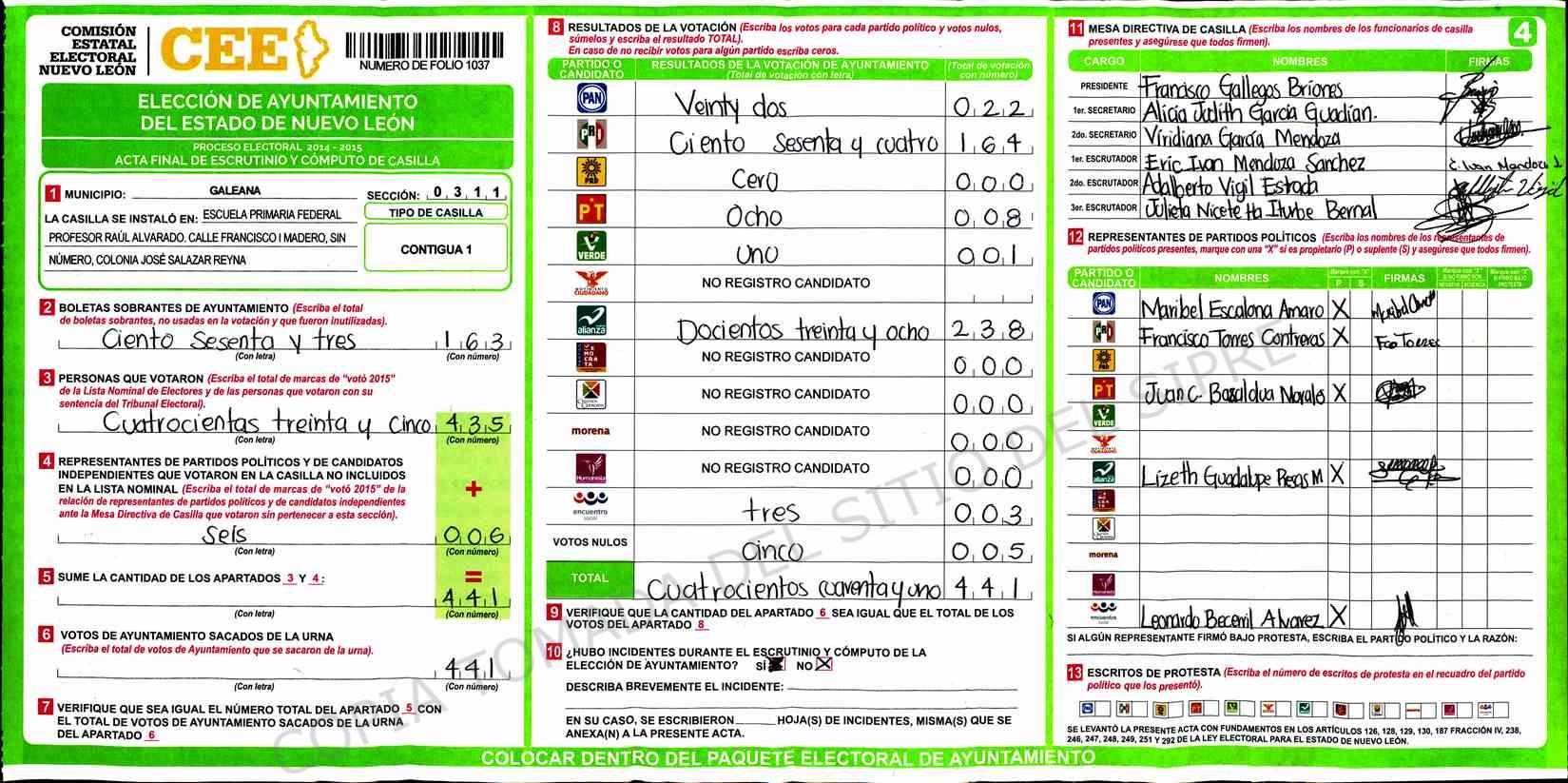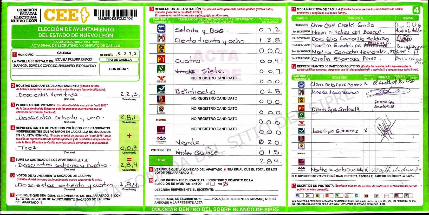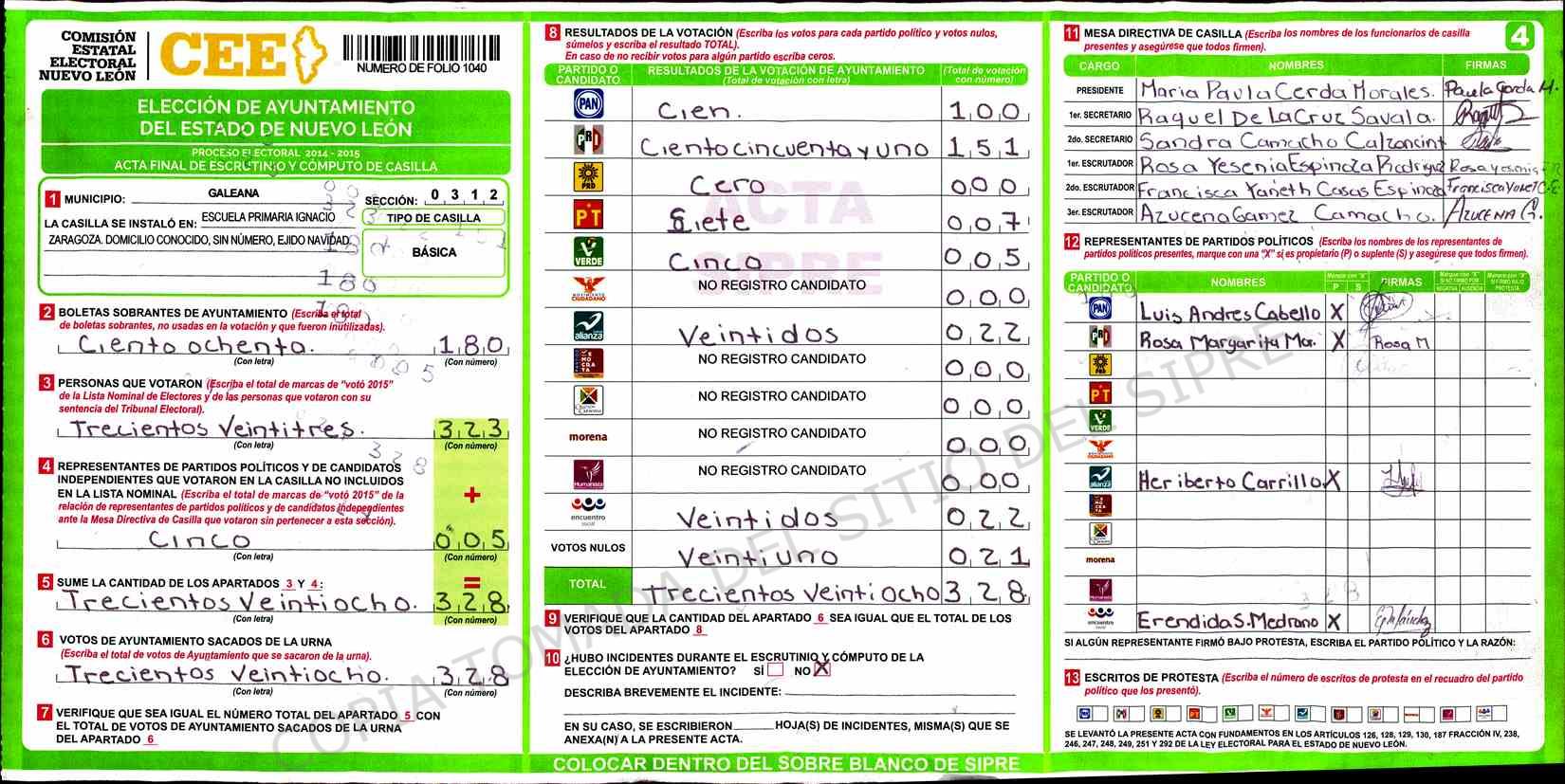 | Claves de Incidencia: | (1) Ilegible, (2) Mutilada, (3) Presenta Correcciones, (4) Presenta Borrones, (5) En Blanco, (6) Cifras Remarcadas, (7) Cifras de Mas, (8) Copiado Movido, (9) Con Signos Inválidos, (10) Excede Lista Nominal, (11) Otra |