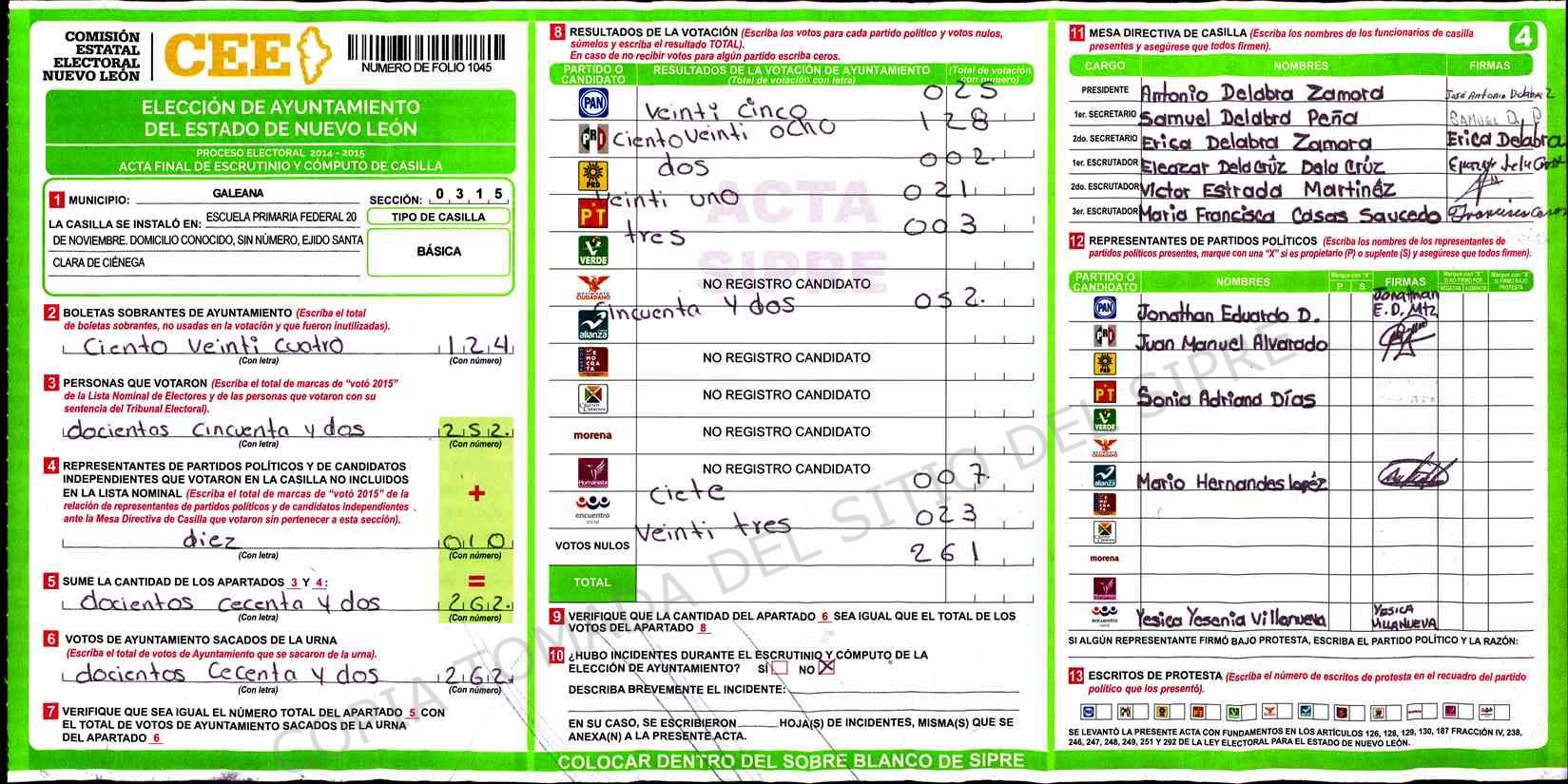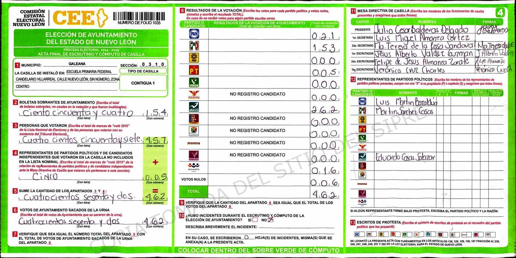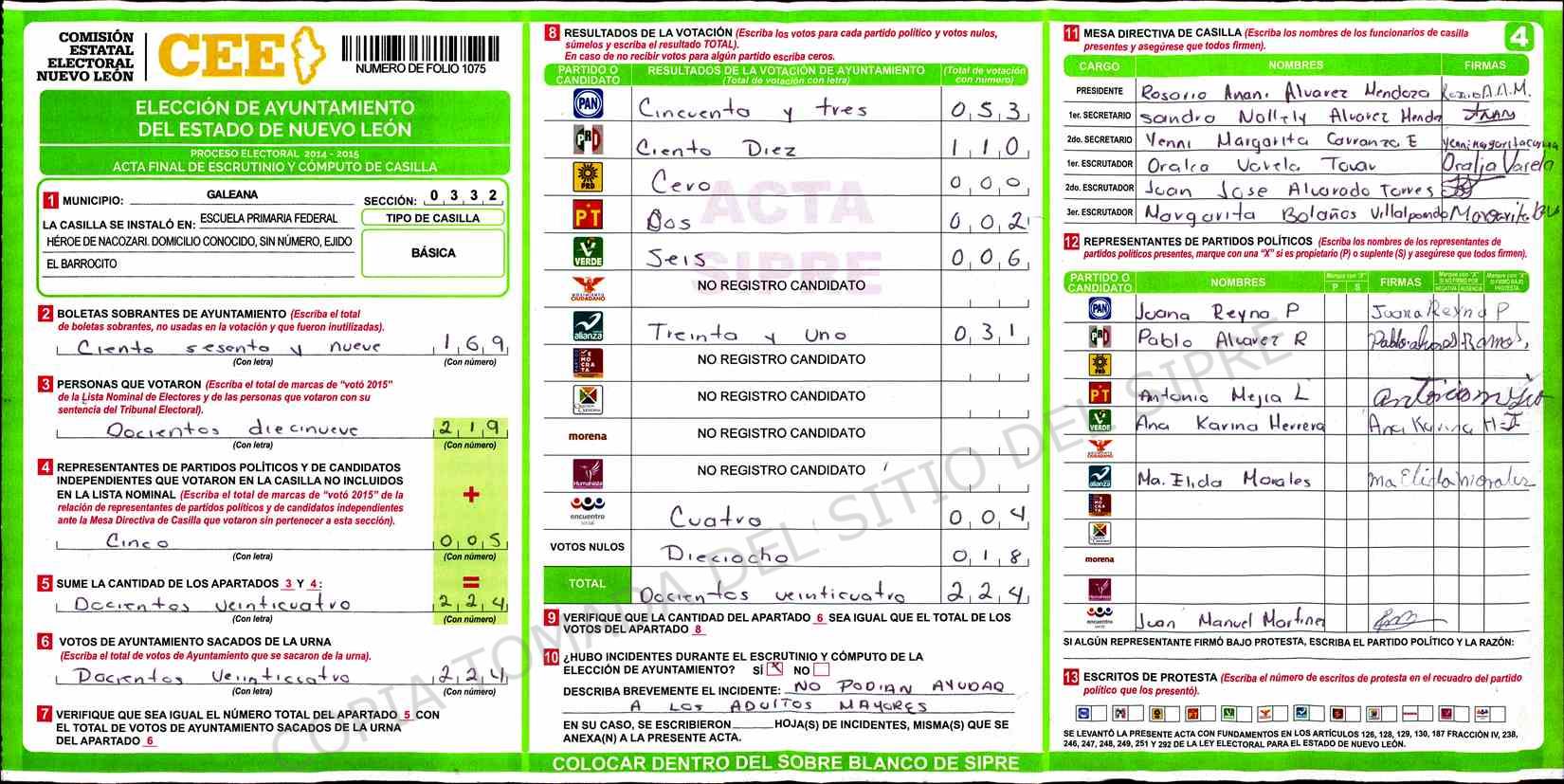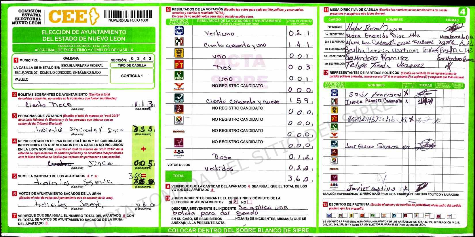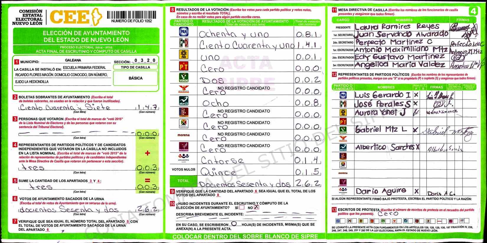 | Claves de Incidencia: | (1) Ilegible, (2) Mutilada, (3) Presenta Correcciones, (4) Presenta Borrones, (5) En Blanco, (6) Cifras Remarcadas, (7) Cifras de Mas, (8) Copiado Movido, (9) Con Signos Inválidos, (10) Excede Lista Nominal, (11) Otra |