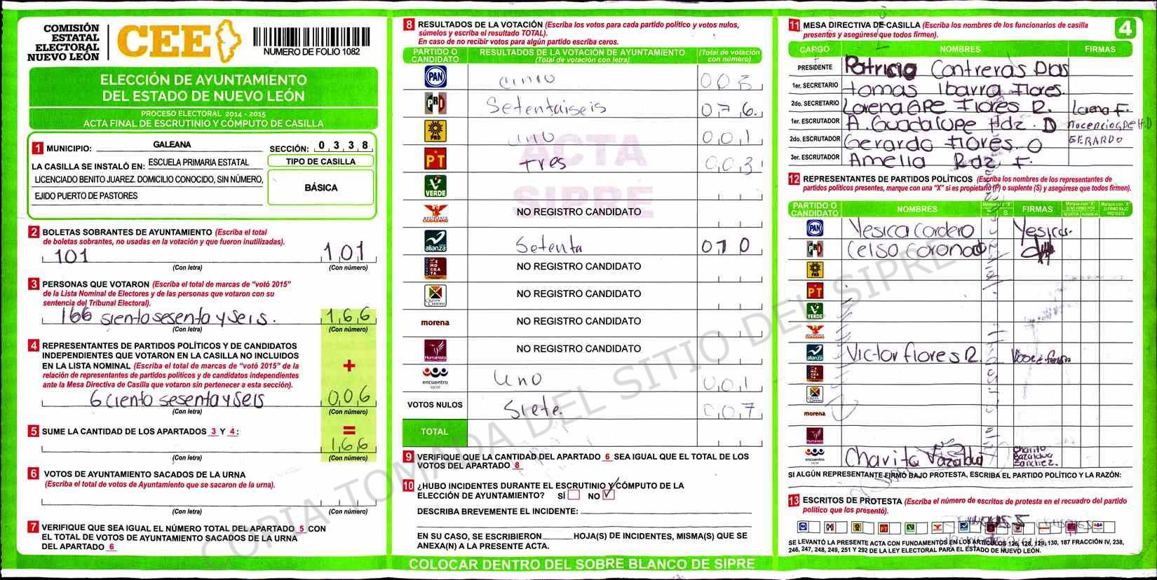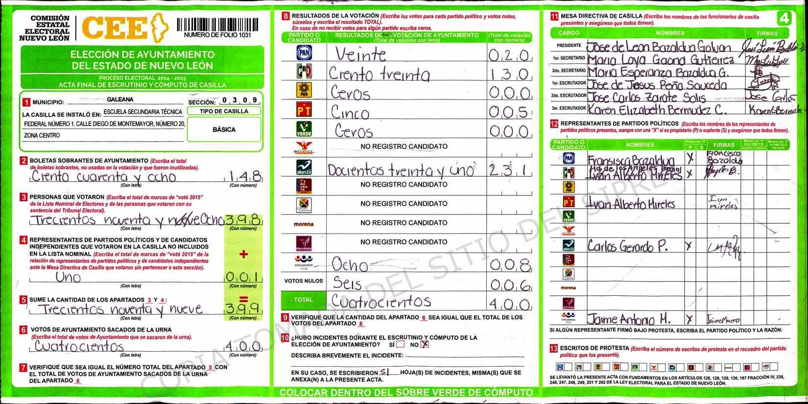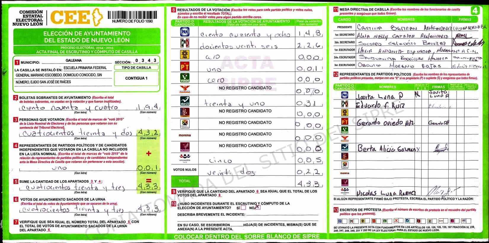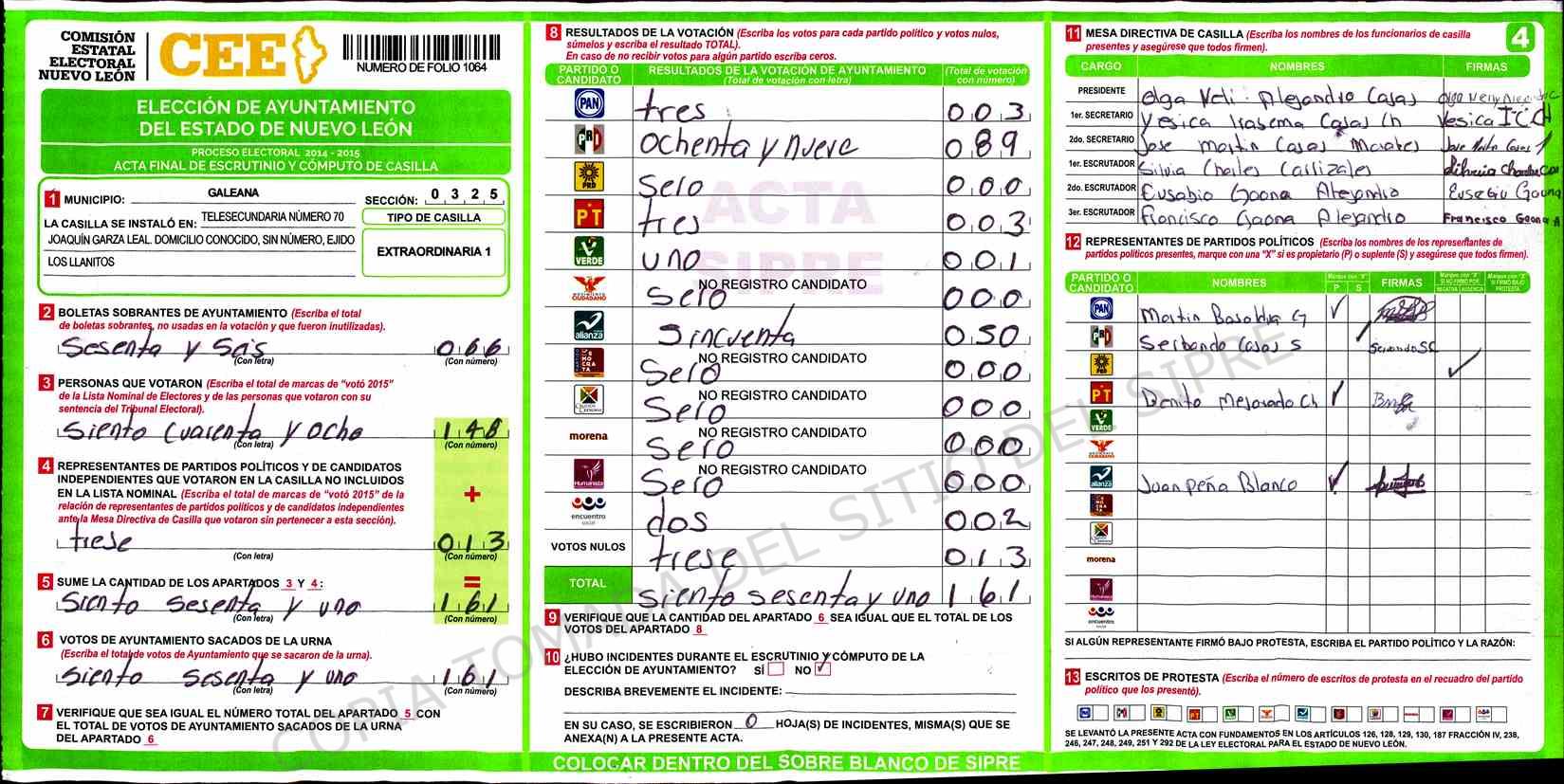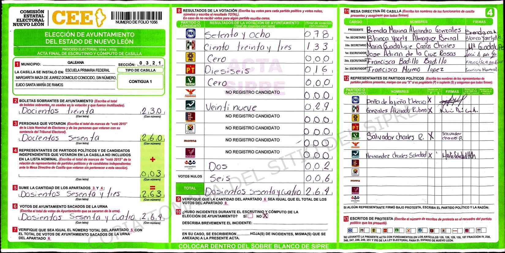 | Claves de Incidencia: | (1) Ilegible, (2) Mutilada, (3) Presenta Correcciones, (4) Presenta Borrones, (5) En Blanco, (6) Cifras Remarcadas, (7) Cifras de Mas, (8) Copiado Movido, (9) Con Signos Inválidos, (10) Excede Lista Nominal, (11) Otra |