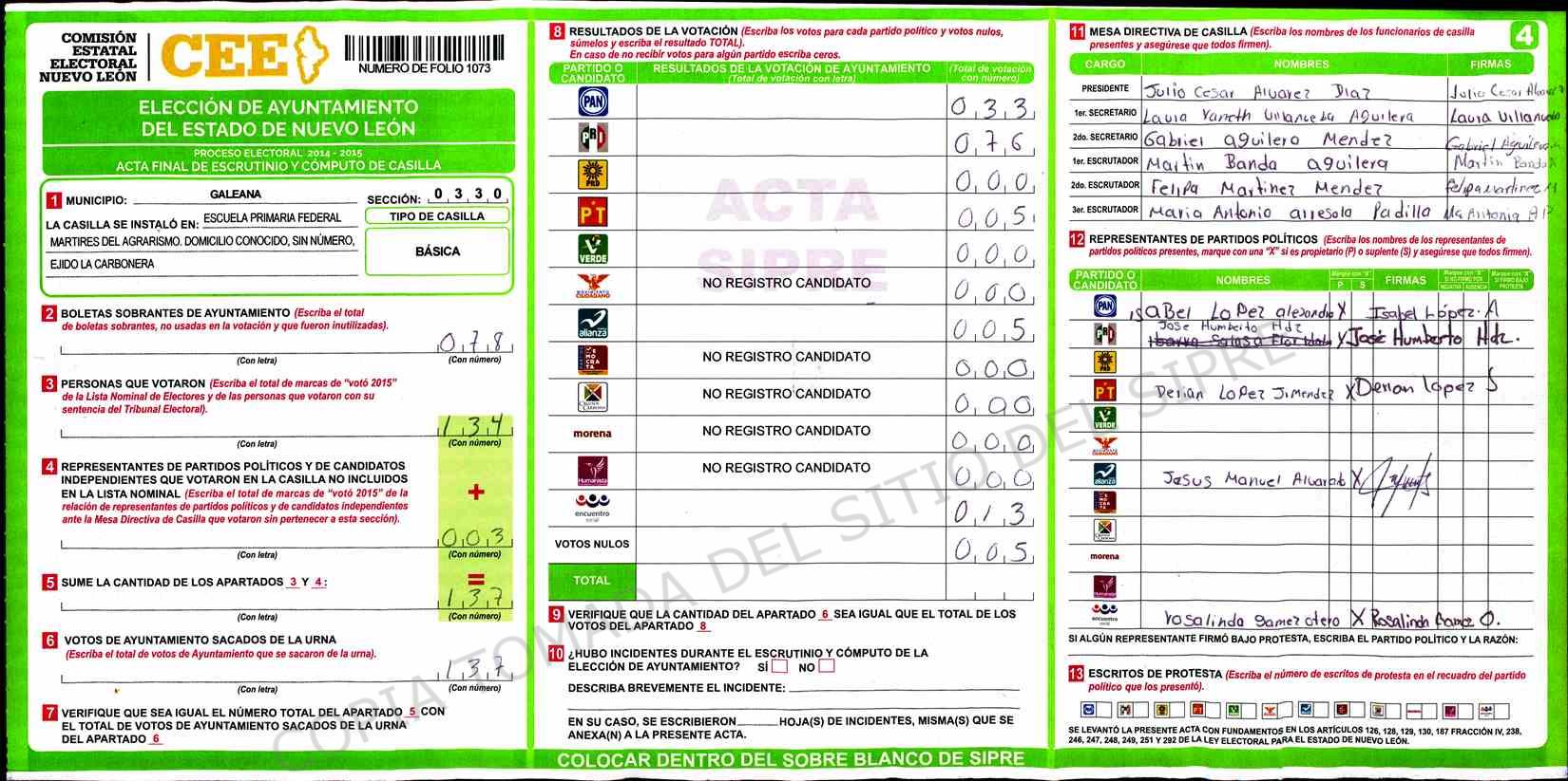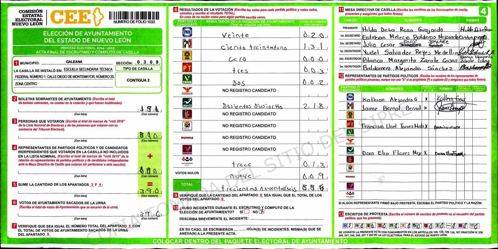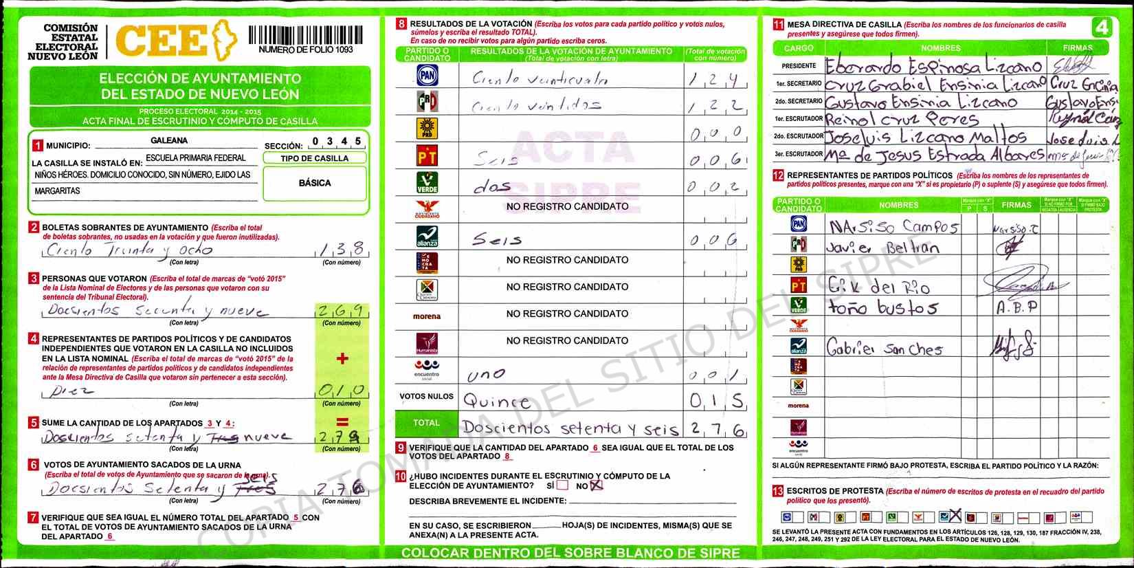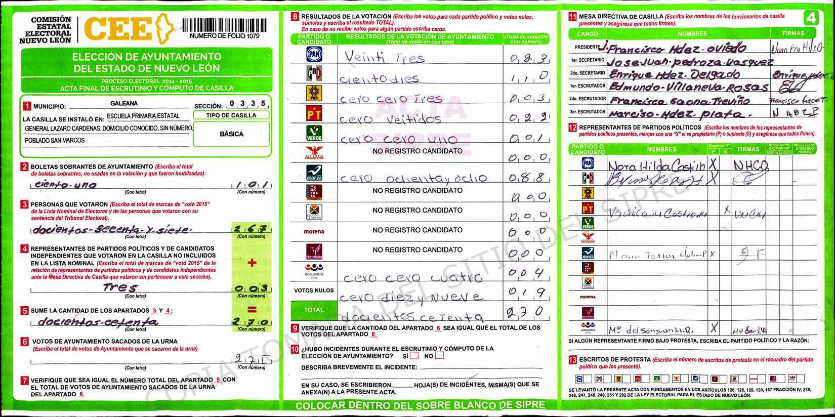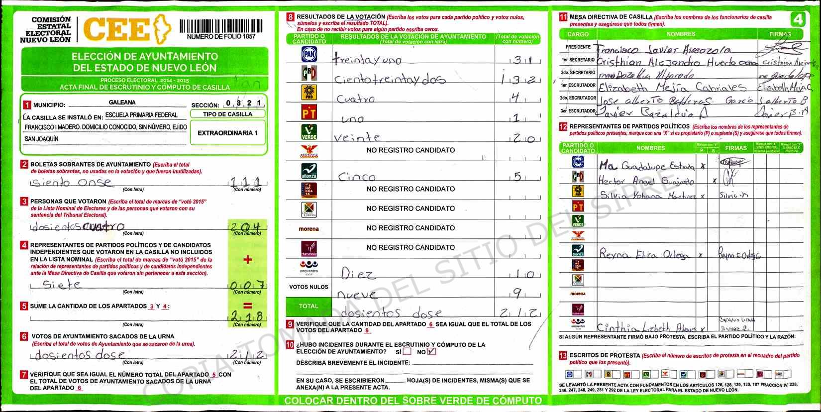 | Claves de Incidencia: | (1) Ilegible, (2) Mutilada, (3) Presenta Correcciones, (4) Presenta Borrones, (5) En Blanco, (6) Cifras Remarcadas, (7) Cifras de Mas, (8) Copiado Movido, (9) Con Signos Inválidos, (10) Excede Lista Nominal, (11) Otra |