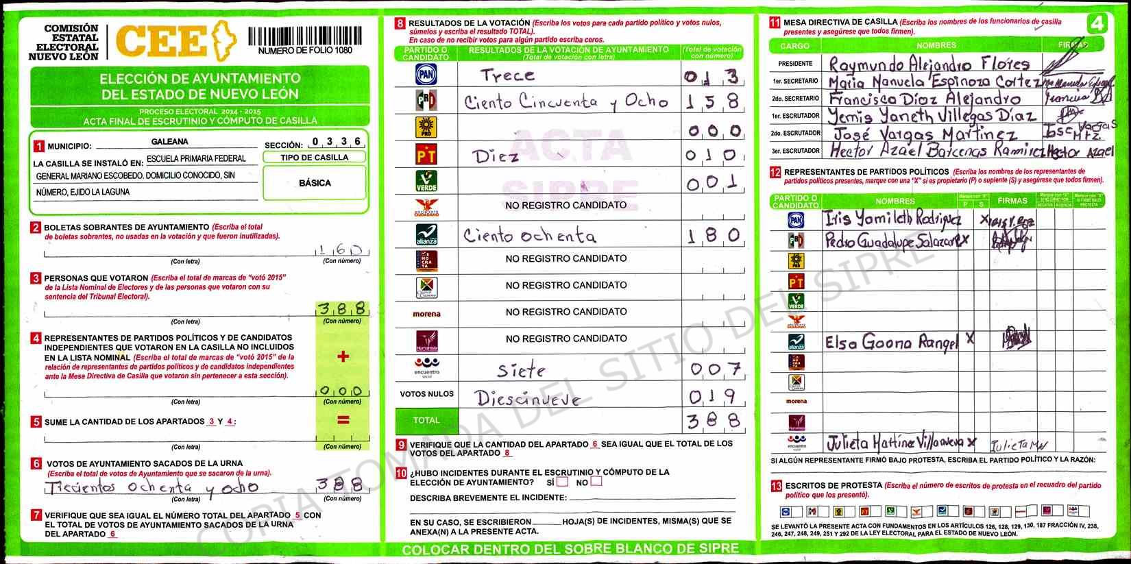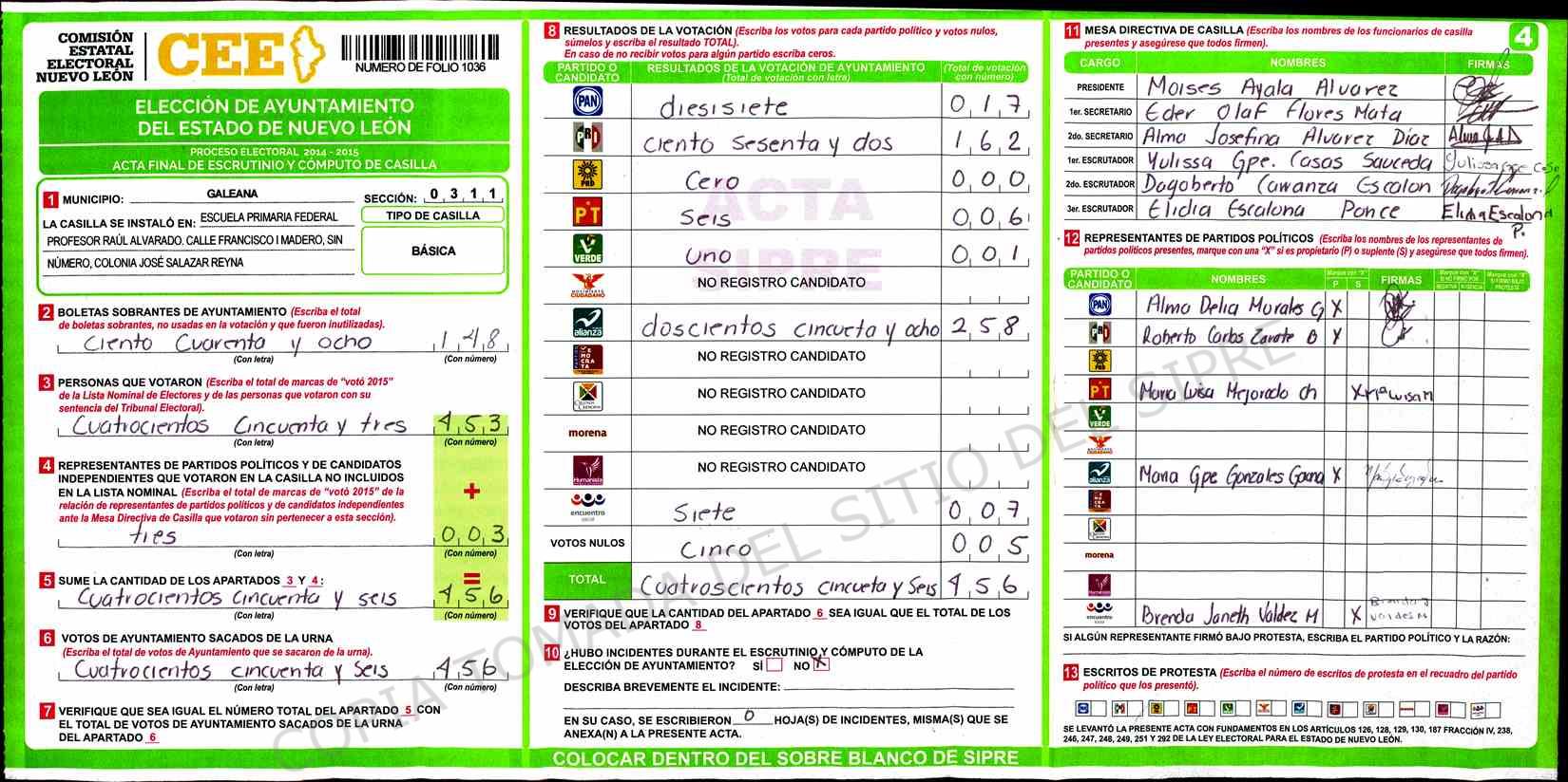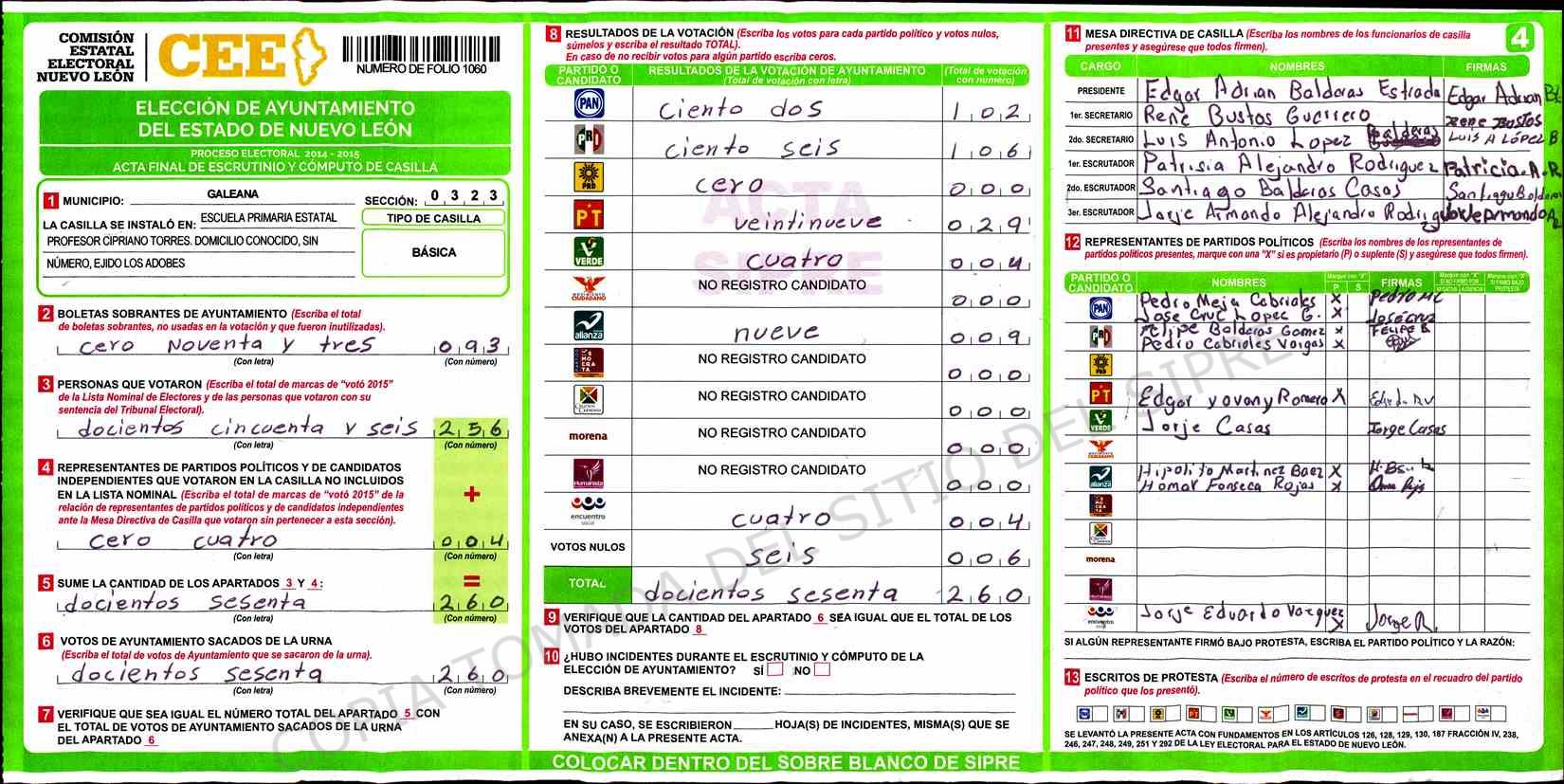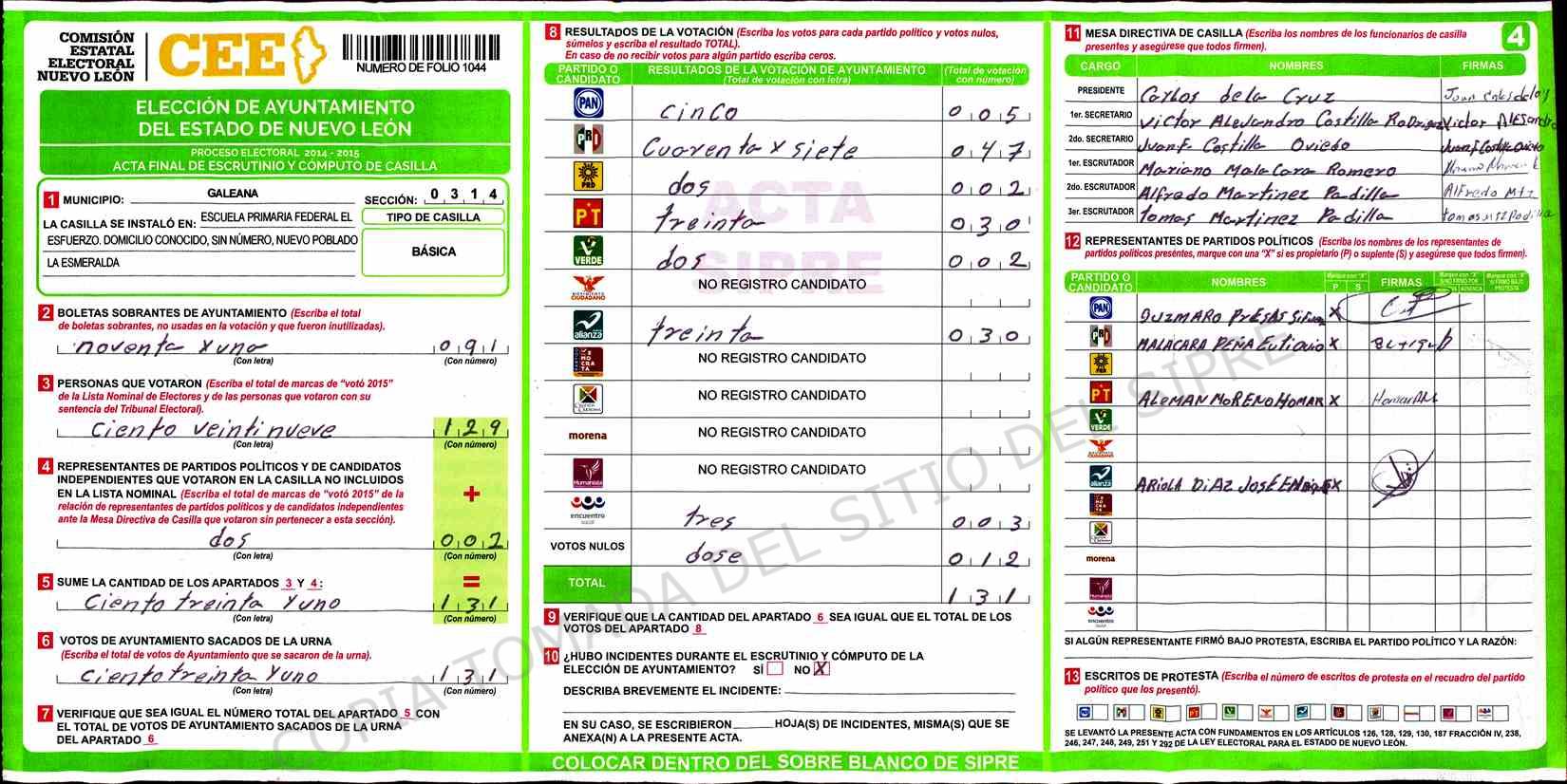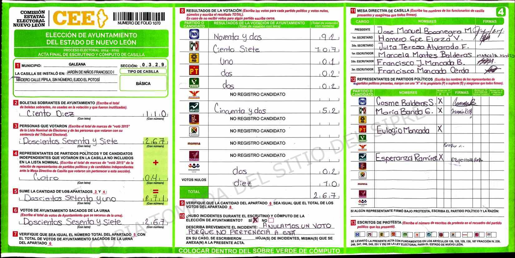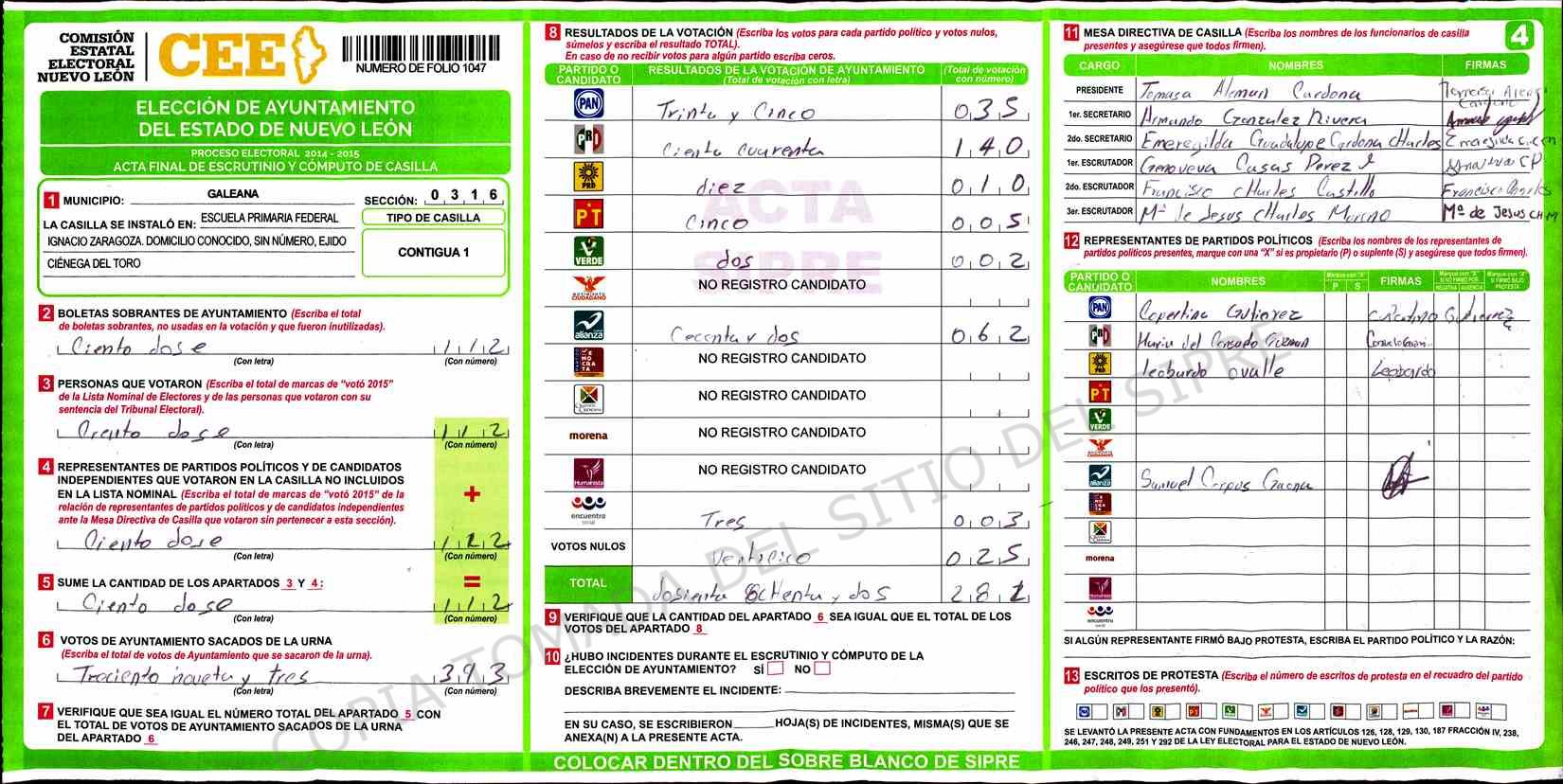 | Claves de Incidencia: | (1) Ilegible, (2) Mutilada, (3) Presenta Correcciones, (4) Presenta Borrones, (5) En Blanco, (6) Cifras Remarcadas, (7) Cifras de Mas, (8) Copiado Movido, (9) Con Signos Inválidos, (10) Excede Lista Nominal, (11) Otra |