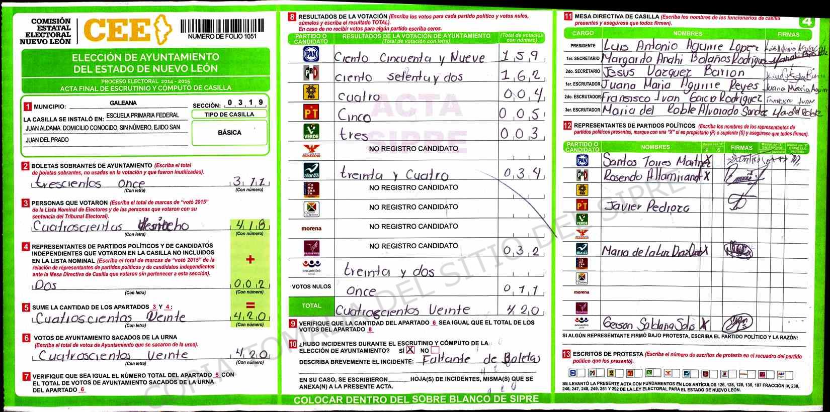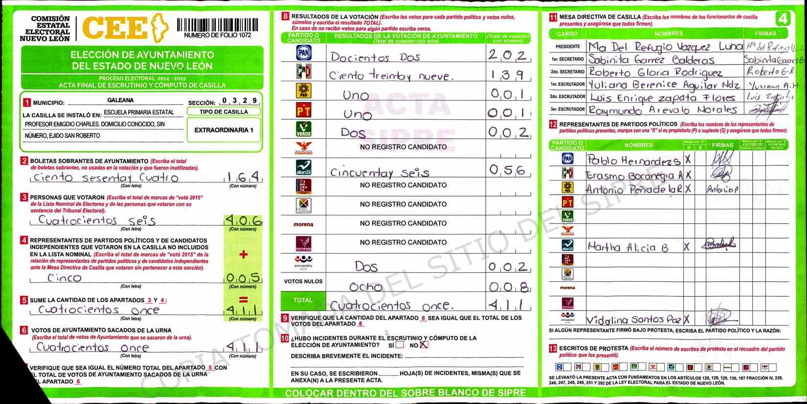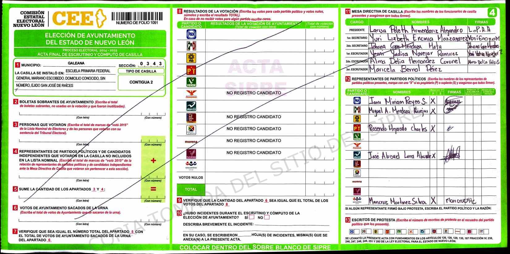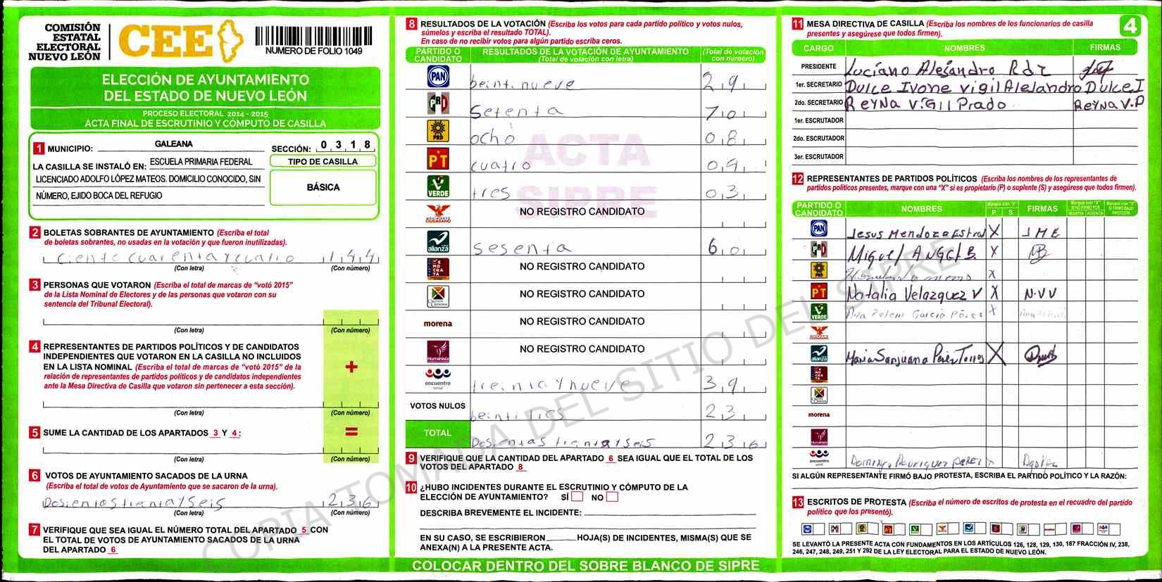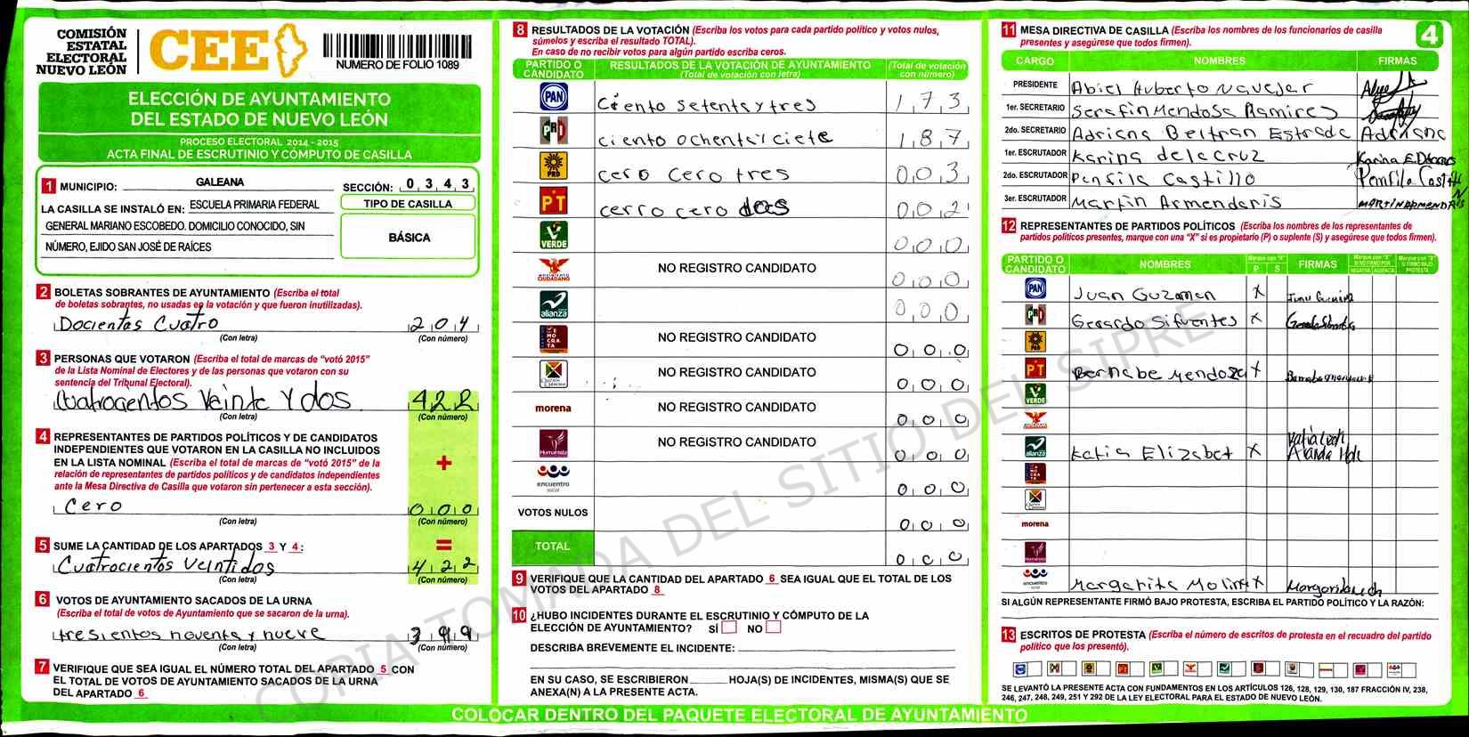 | Claves de Incidencia: | (1) Ilegible, (2) Mutilada, (3) Presenta Correcciones, (4) Presenta Borrones, (5) En Blanco, (6) Cifras Remarcadas, (7) Cifras de Mas, (8) Copiado Movido, (9) Con Signos Inválidos, (10) Excede Lista Nominal, (11) Otra |