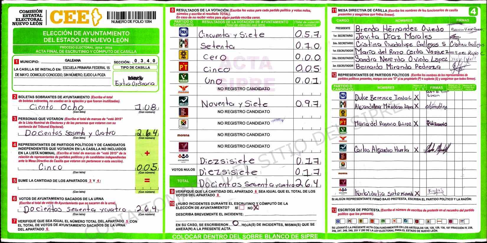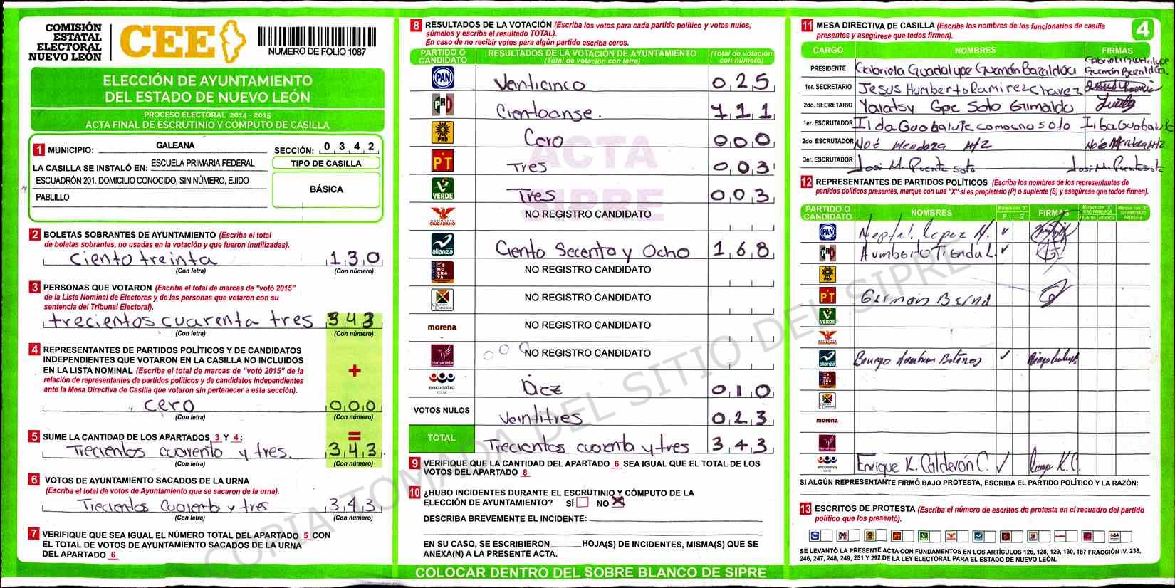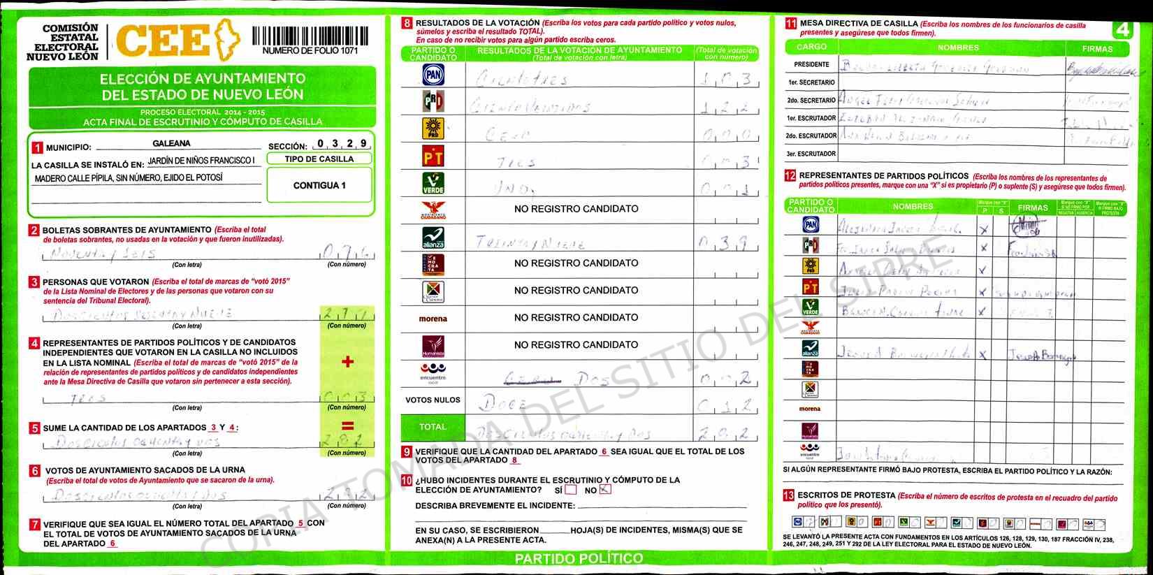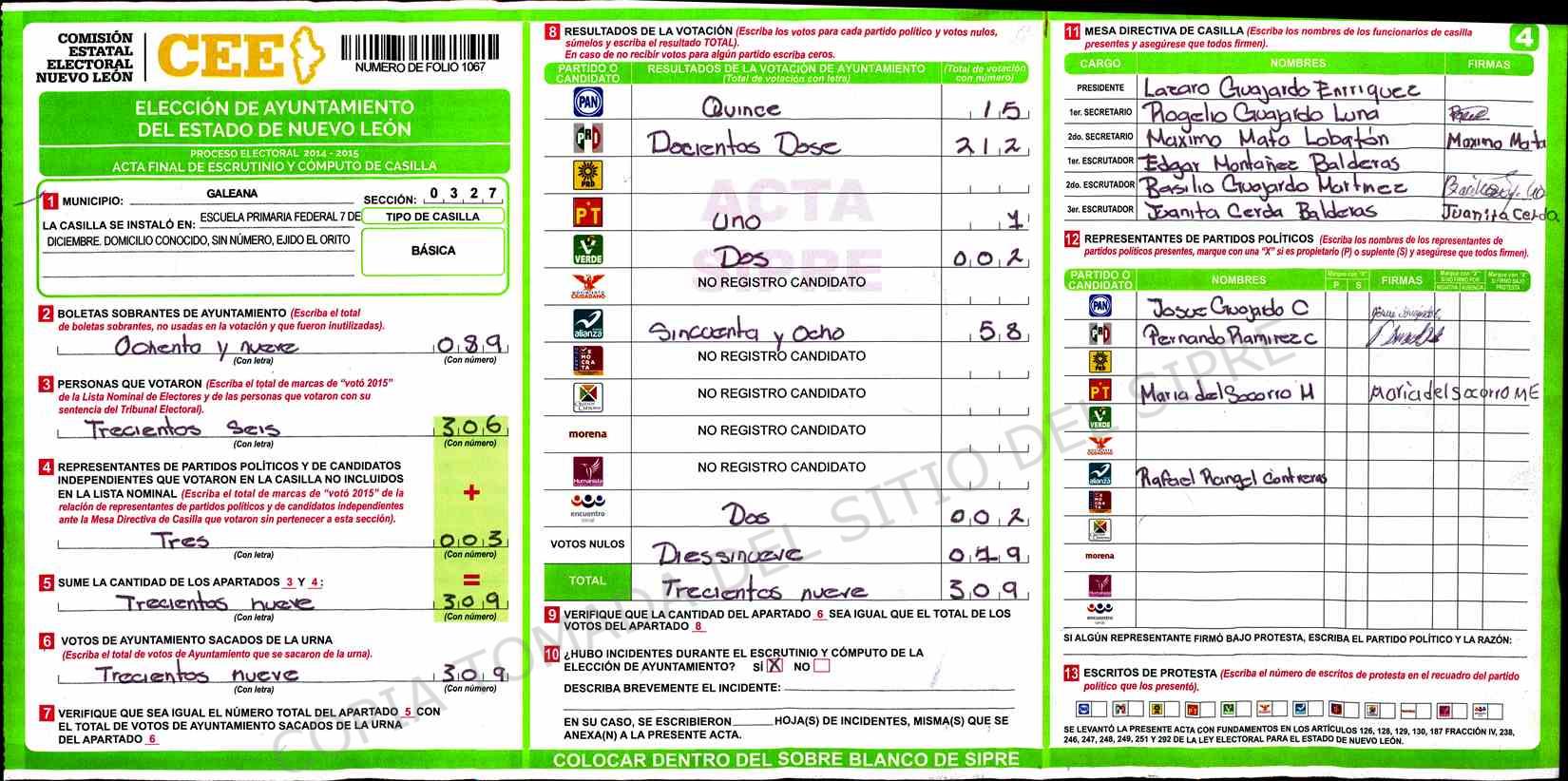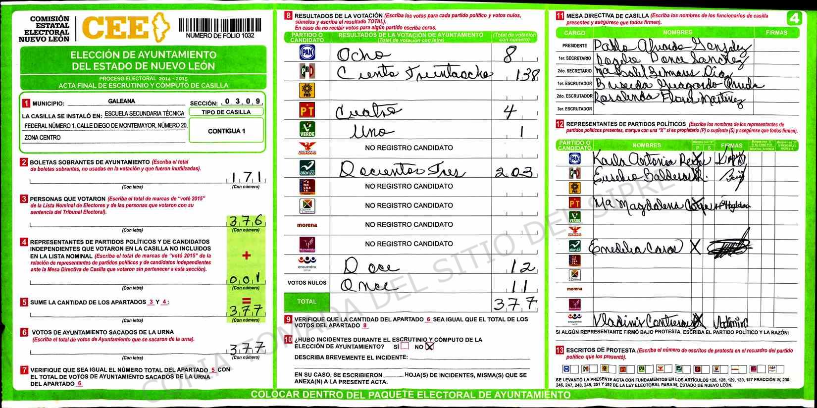 | Claves de Incidencia: | (1) Ilegible, (2) Mutilada, (3) Presenta Correcciones, (4) Presenta Borrones, (5) En Blanco, (6) Cifras Remarcadas, (7) Cifras de Mas, (8) Copiado Movido, (9) Con Signos Inválidos, (10) Excede Lista Nominal, (11) Otra |