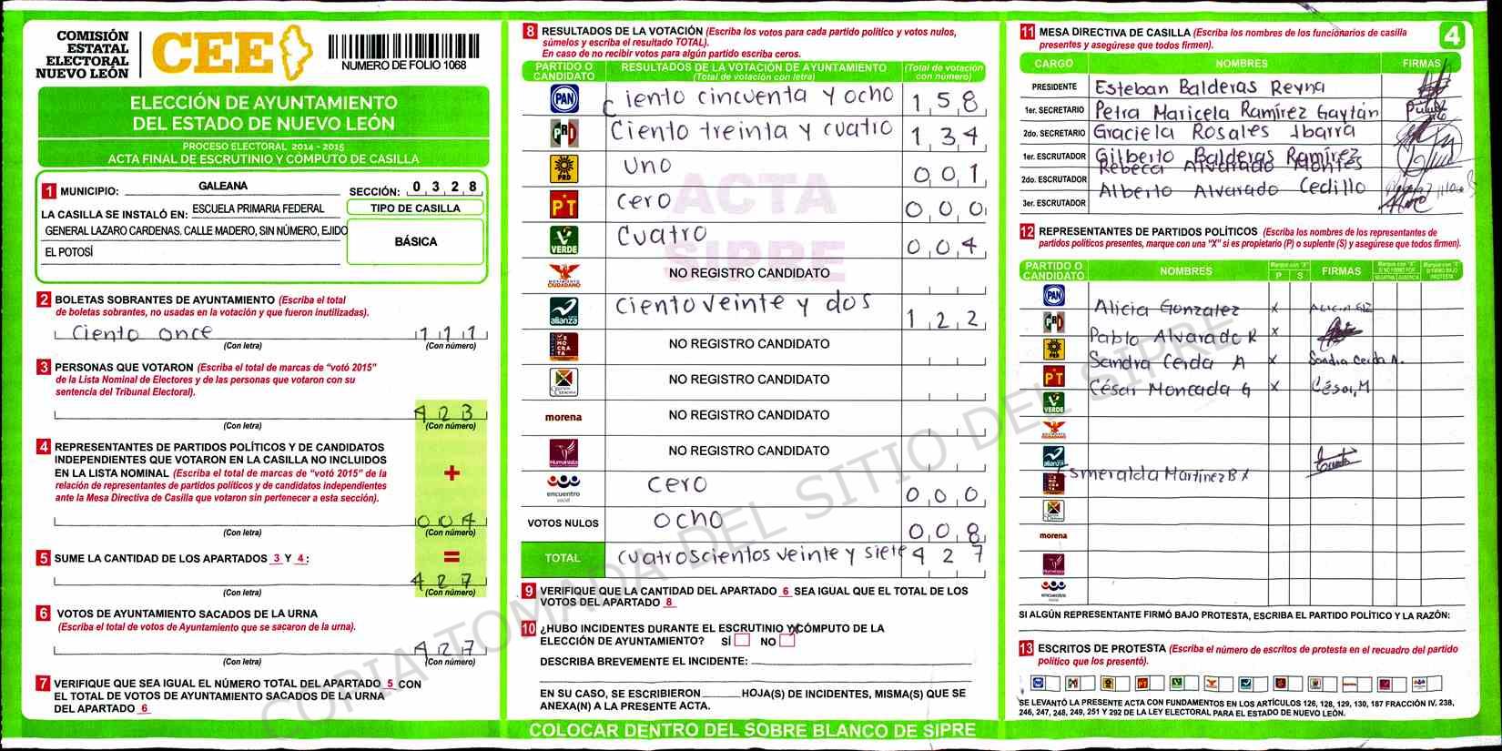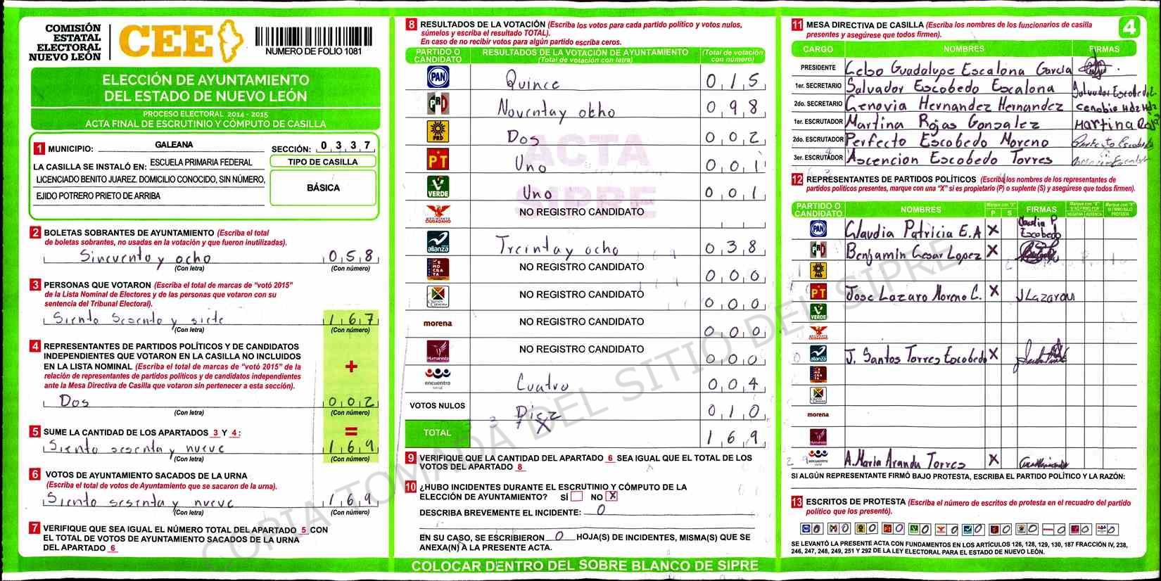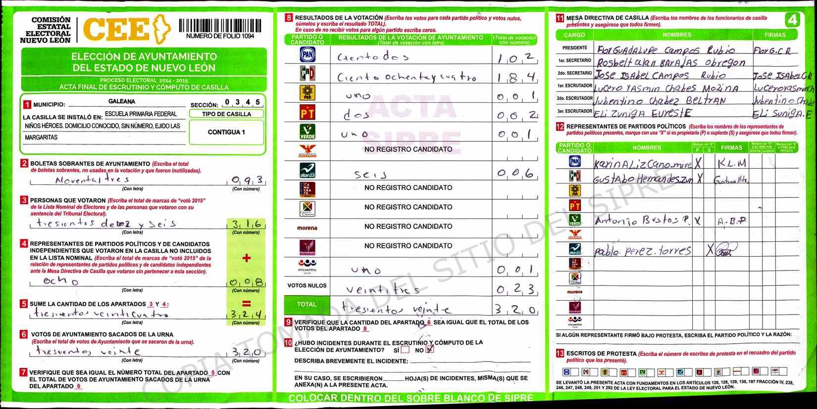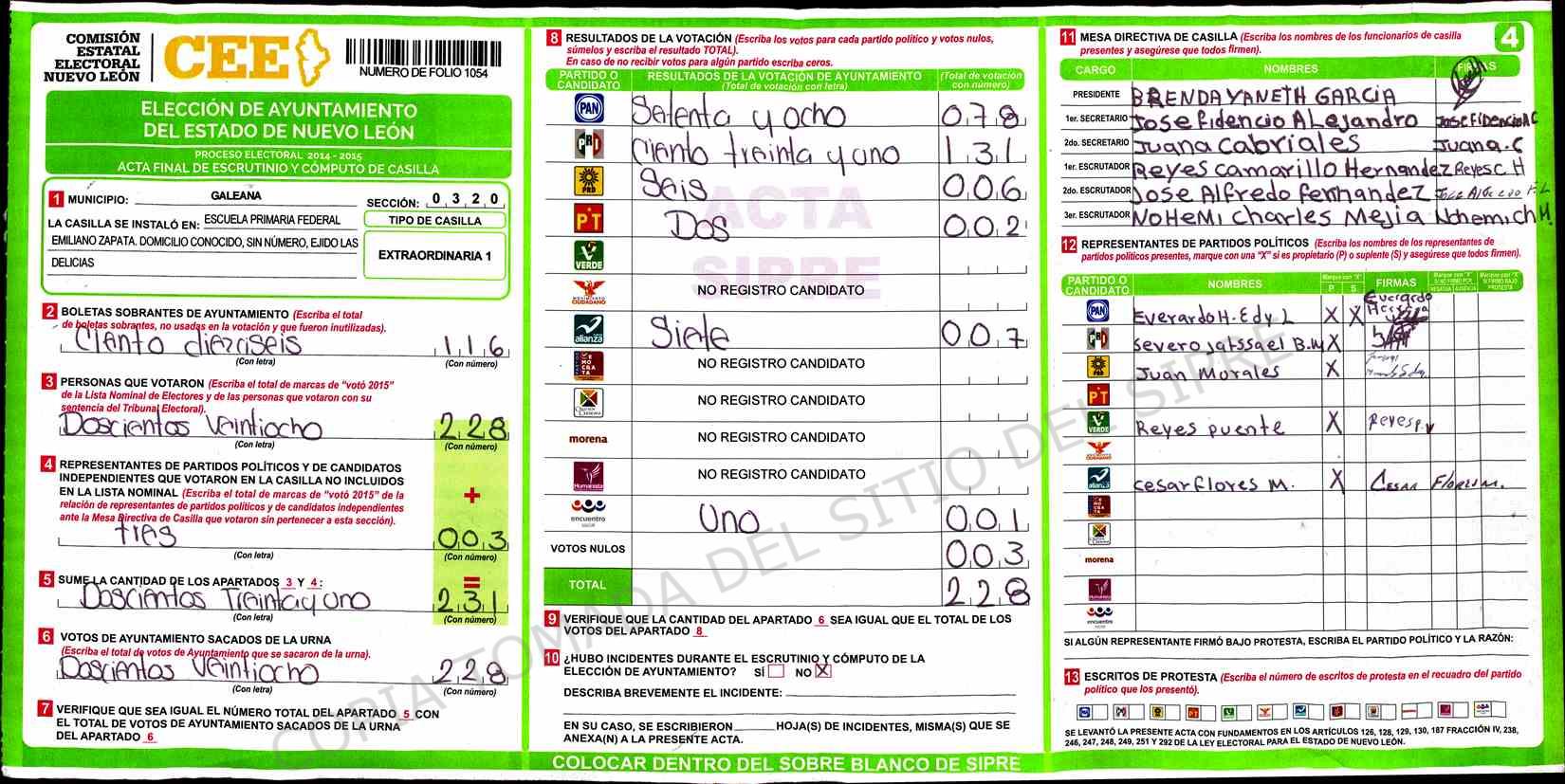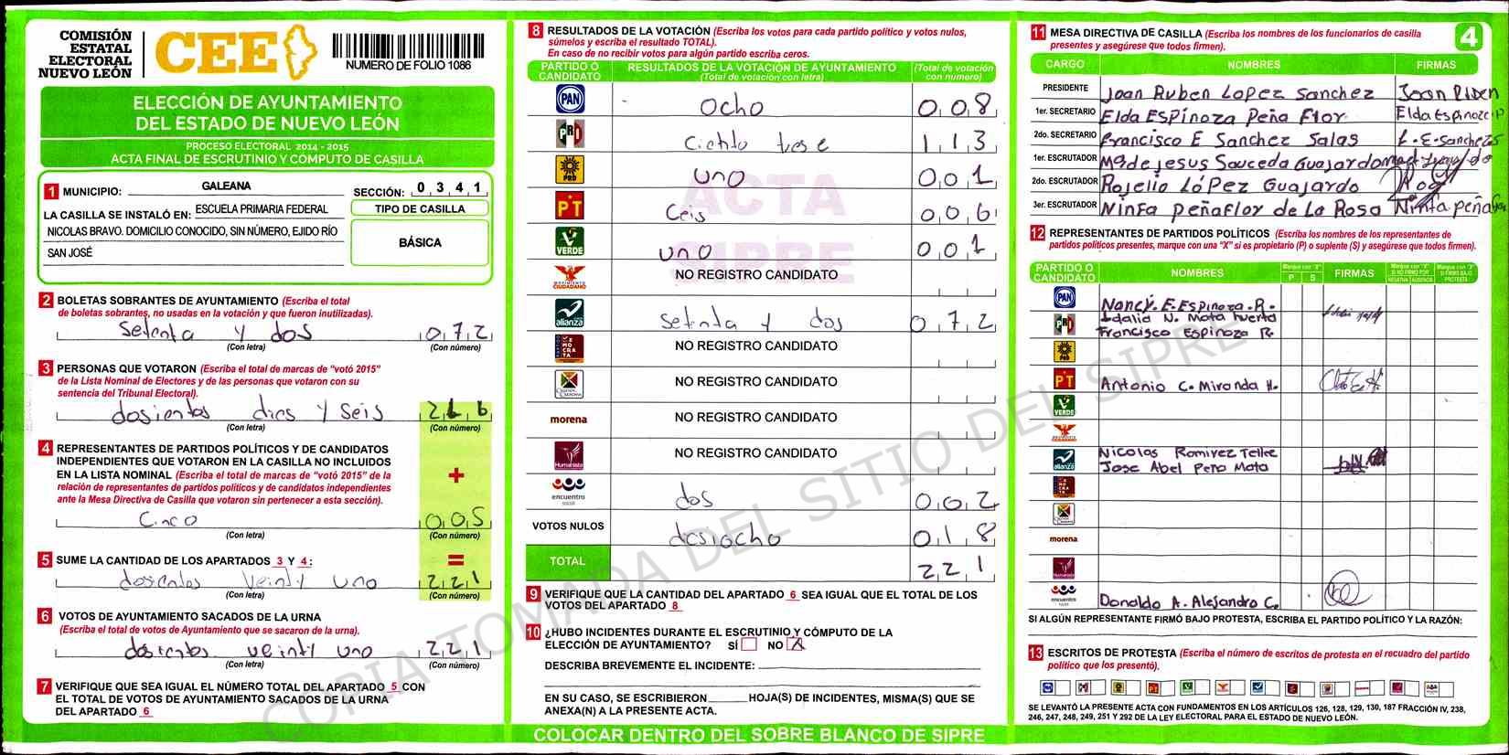 | Claves de Incidencia: | (1) Ilegible, (2) Mutilada, (3) Presenta Correcciones, (4) Presenta Borrones, (5) En Blanco, (6) Cifras Remarcadas, (7) Cifras de Mas, (8) Copiado Movido, (9) Con Signos Inválidos, (10) Excede Lista Nominal, (11) Otra |
