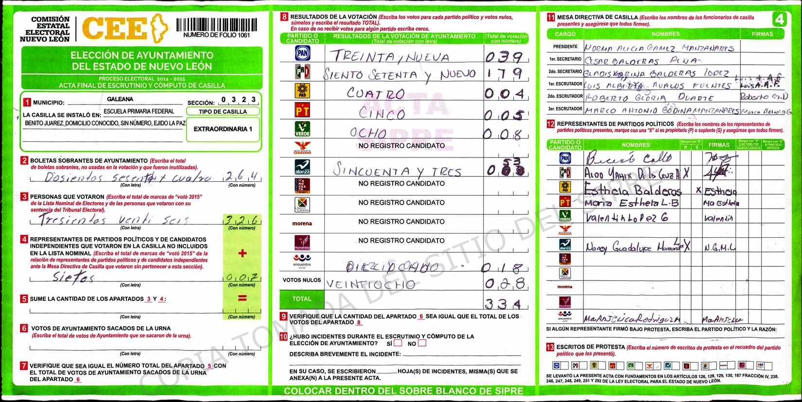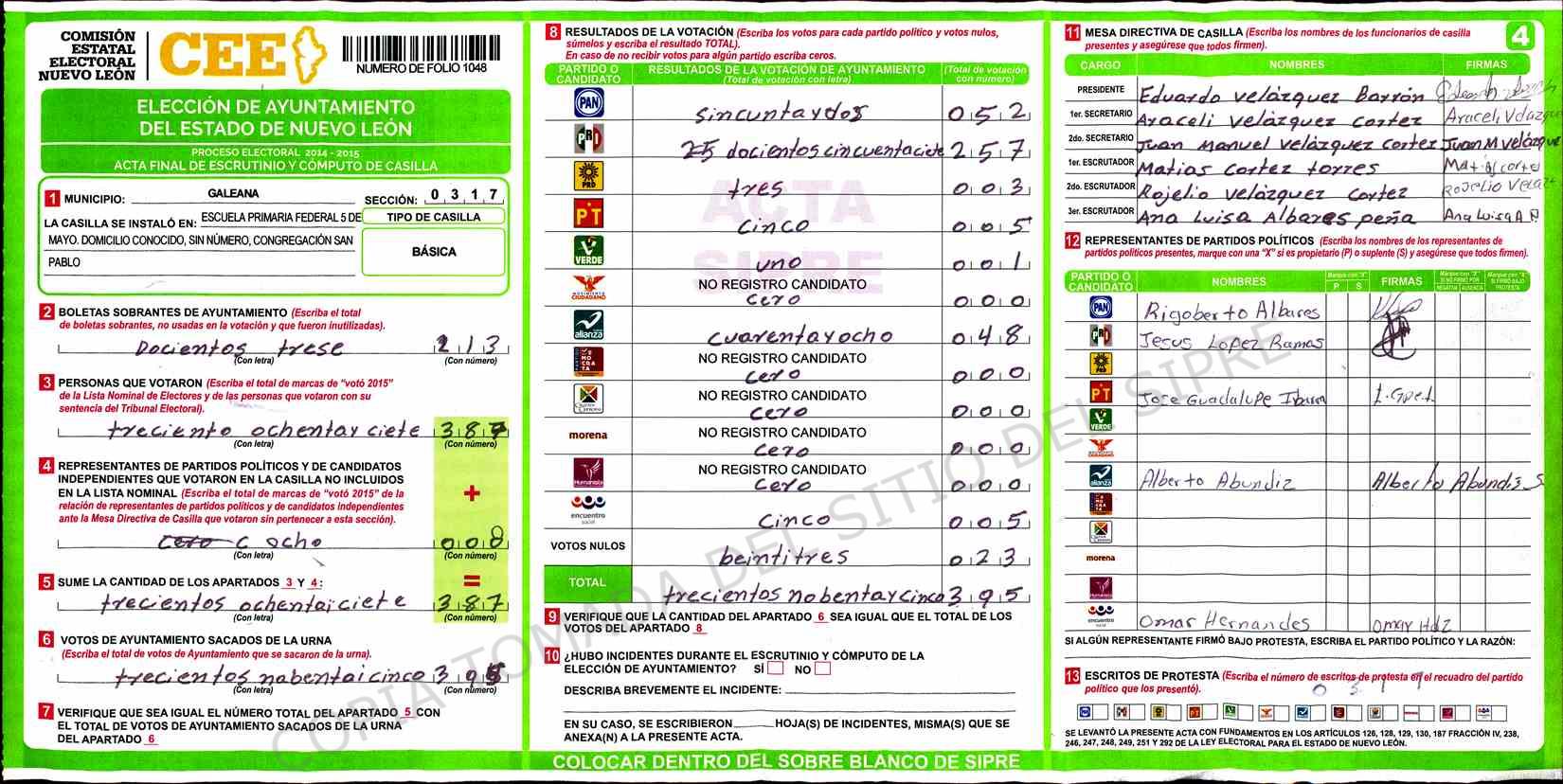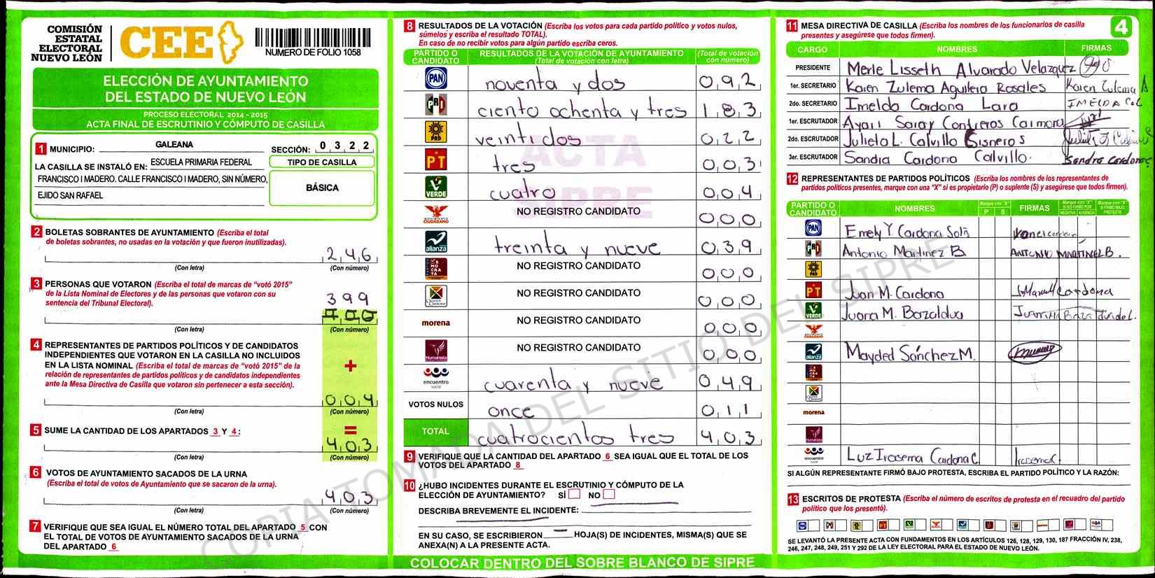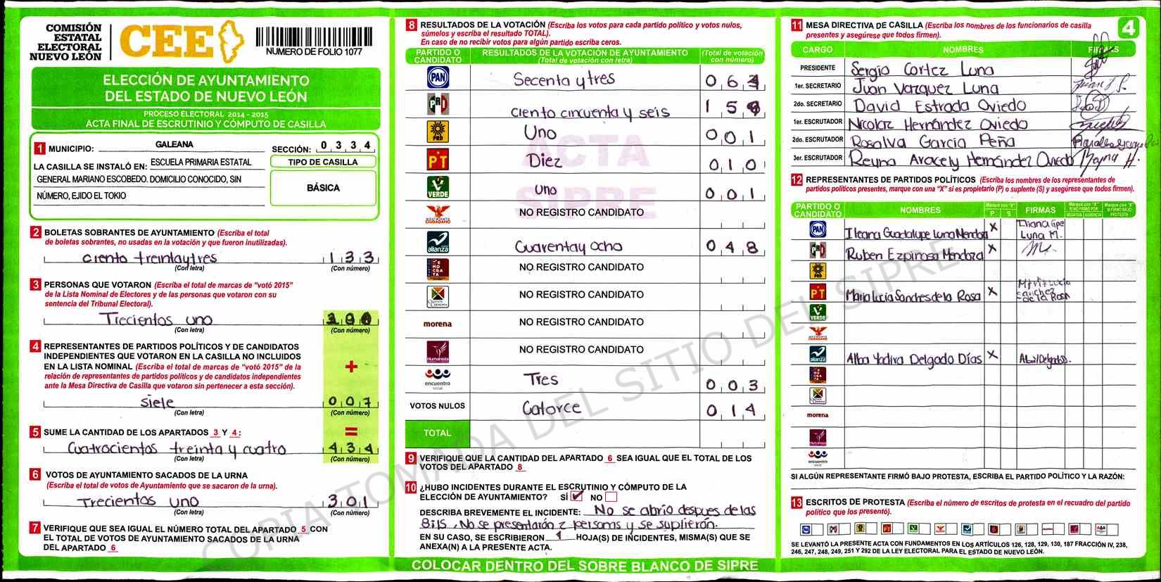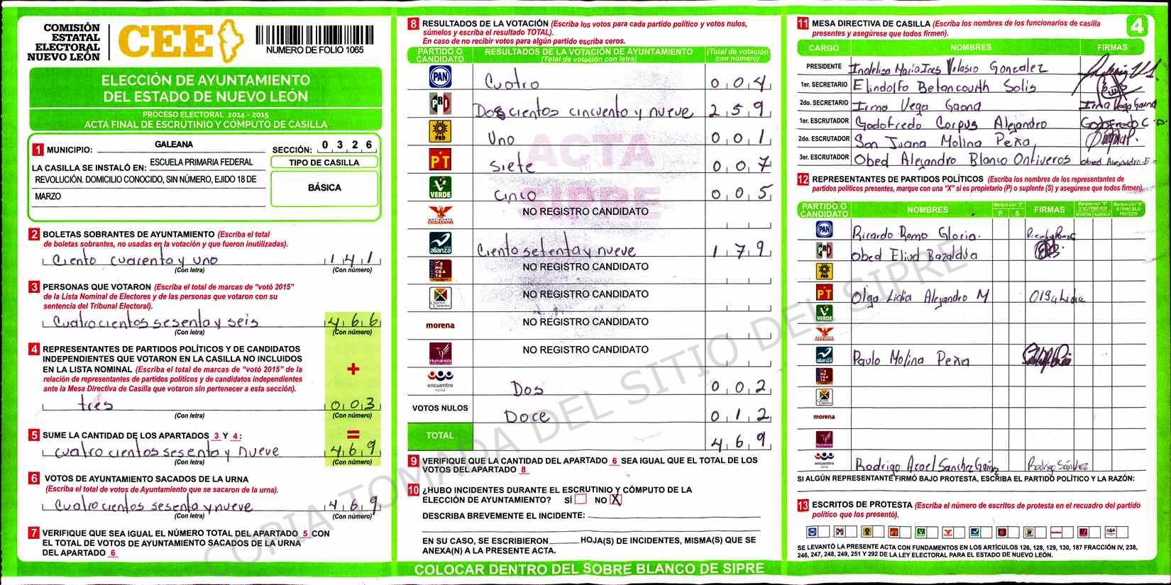| Claves de Incidencia: | (1) Ilegible, (2) Mutilada, (3) Presenta Correcciones, (4) Presenta Borrones, (5) En Blanco, (6) Cifras Remarcadas, (7) Cifras de Mas, (8) Copiado Movido, (9) Con Signos Inválidos, (10) Excede Lista Nominal, (11) Otra |
