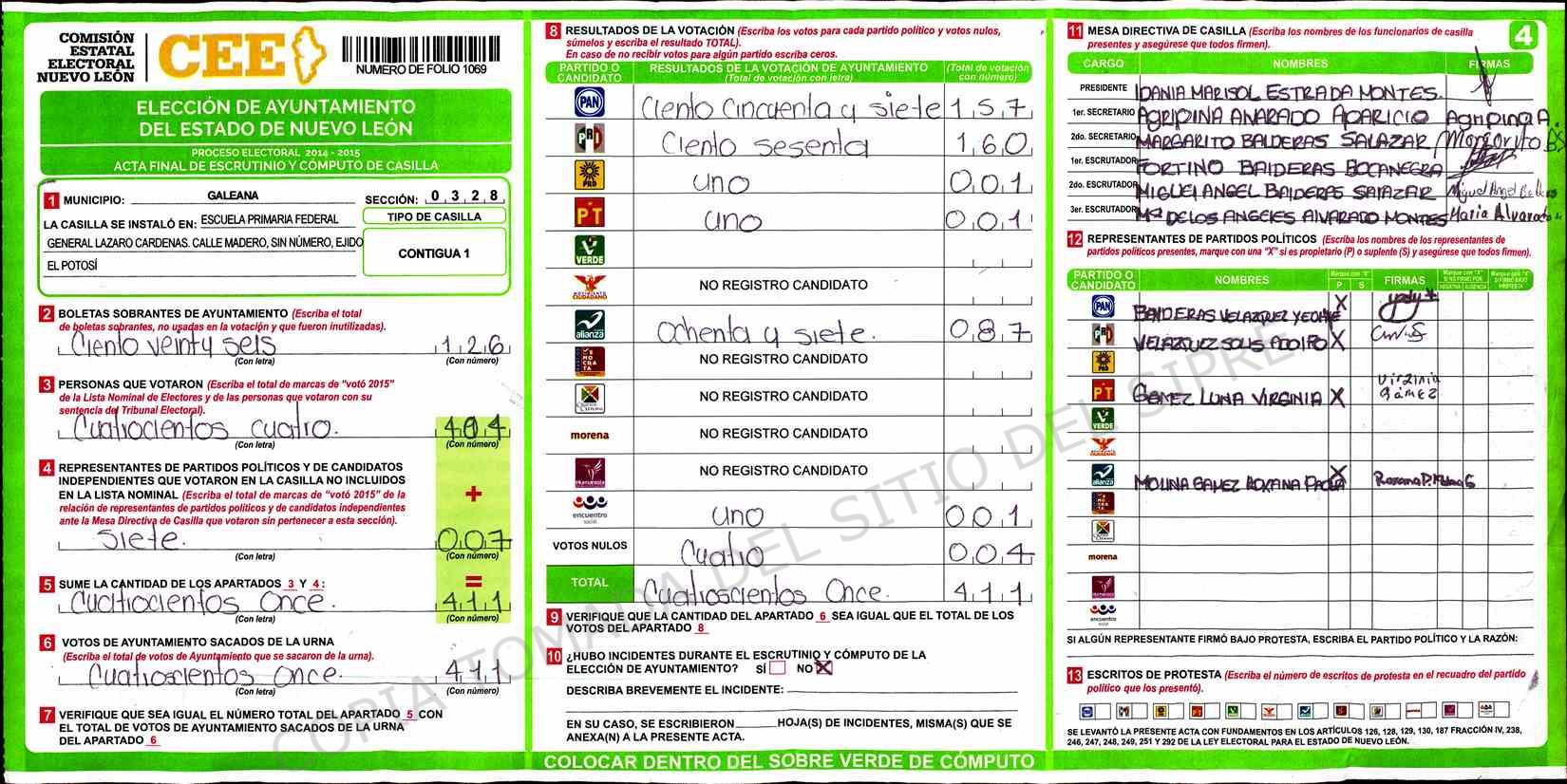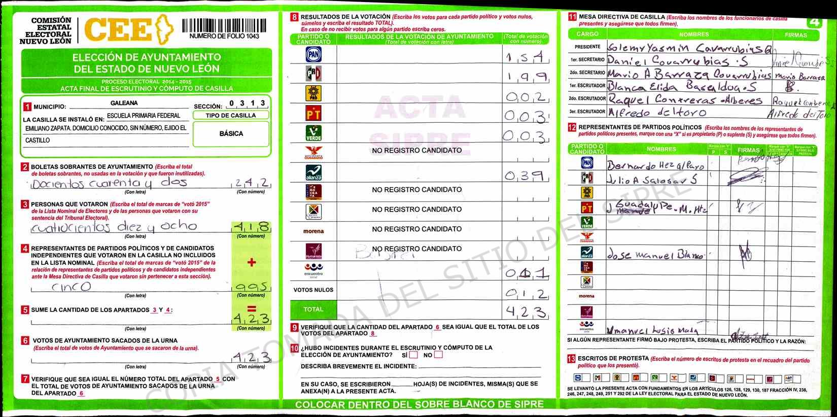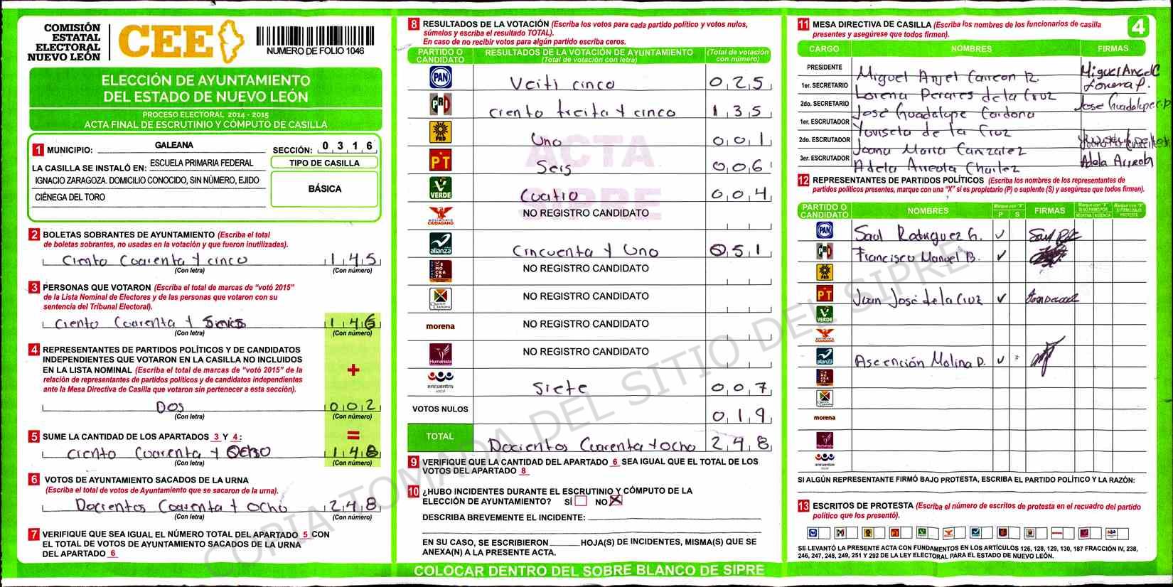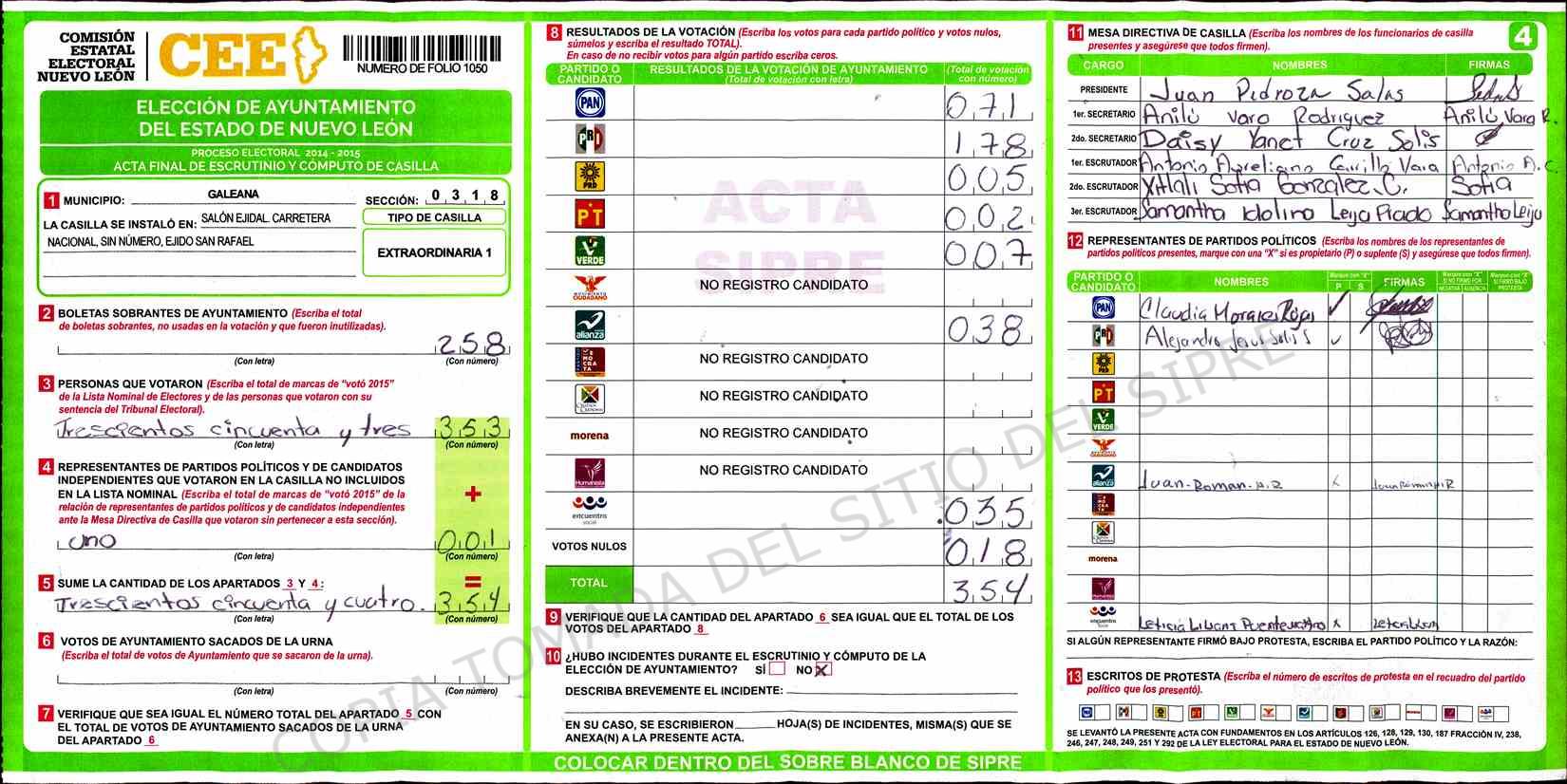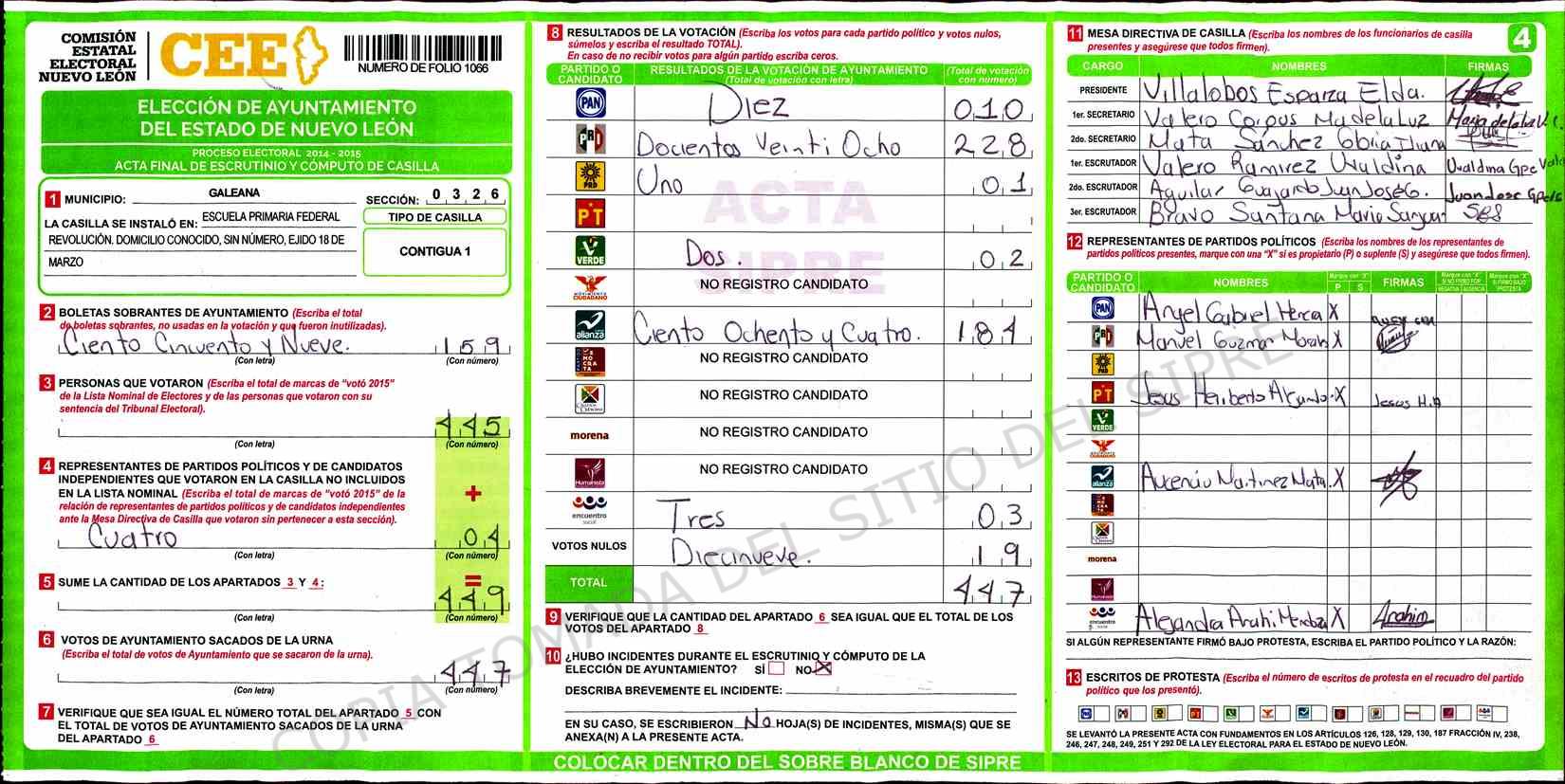 | Claves de Incidencia: | (1) Ilegible, (2) Mutilada, (3) Presenta Correcciones, (4) Presenta Borrones, (5) En Blanco, (6) Cifras Remarcadas, (7) Cifras de Mas, (8) Copiado Movido, (9) Con Signos Inválidos, (10) Excede Lista Nominal, (11) Otra |