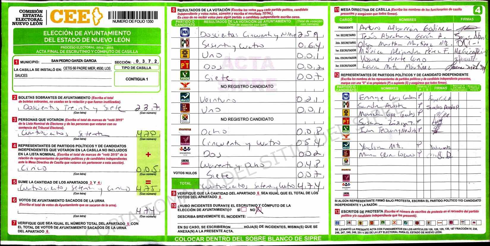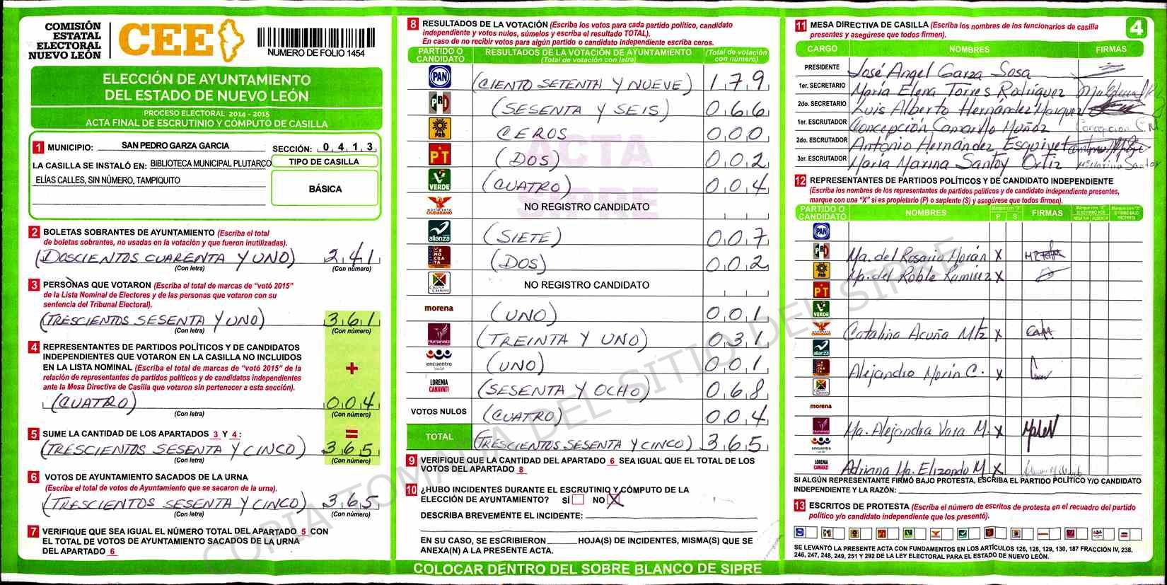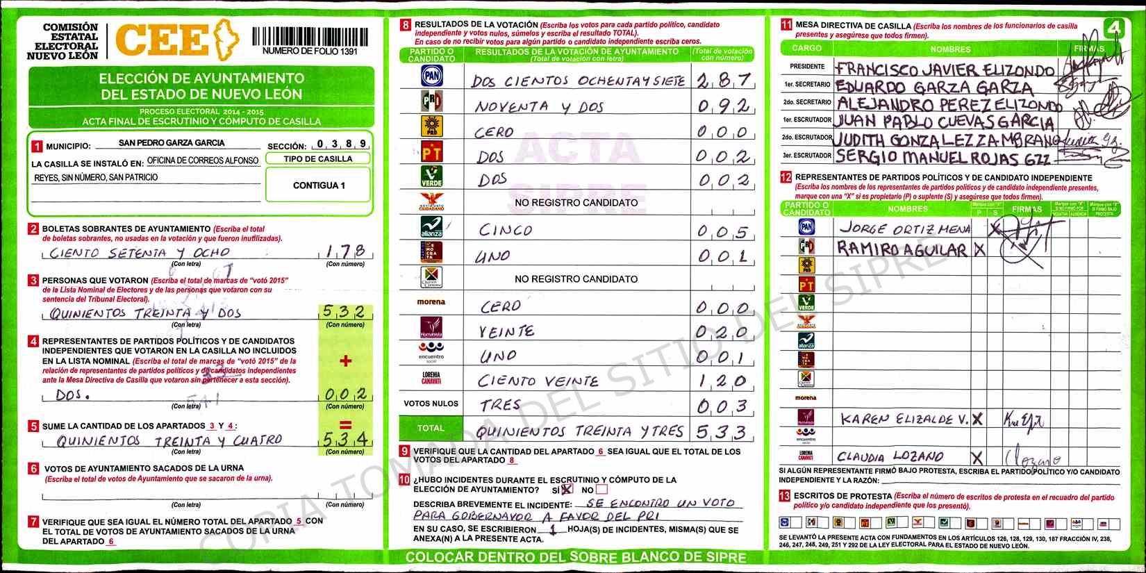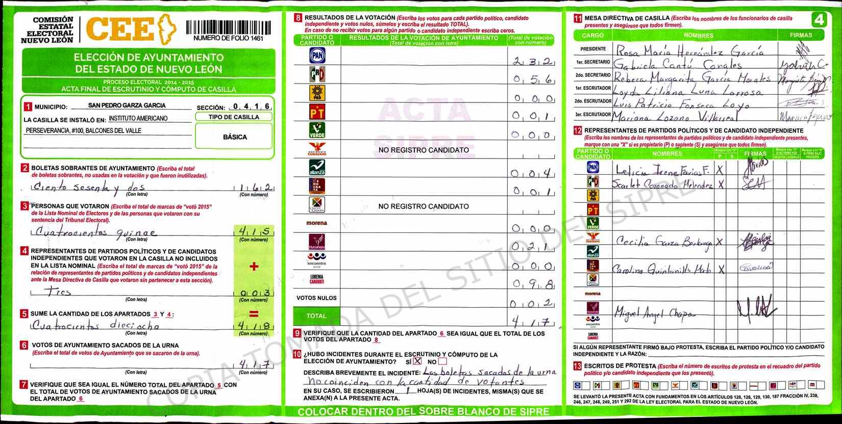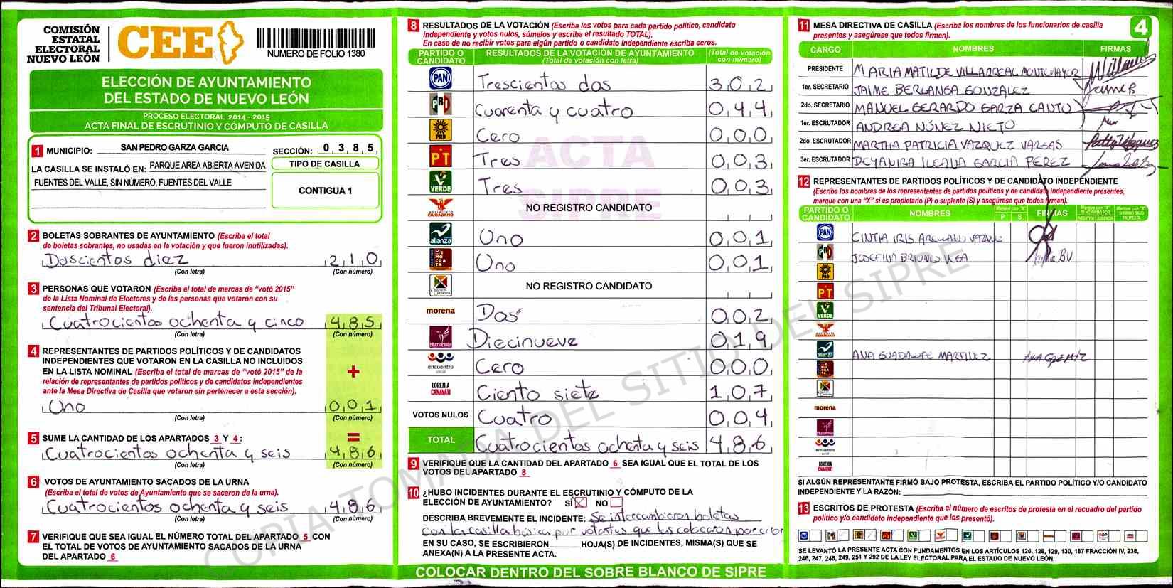 | Claves de Incidencia: | (1) Ilegible, (2) Mutilada, (3) Presenta Correcciones, (4) Presenta Borrones, (5) En Blanco, (6) Cifras Remarcadas, (7) Cifras de Mas, (8) Copiado Movido, (9) Con Signos Inválidos, (10) Excede Lista Nominal, (11) Otra |