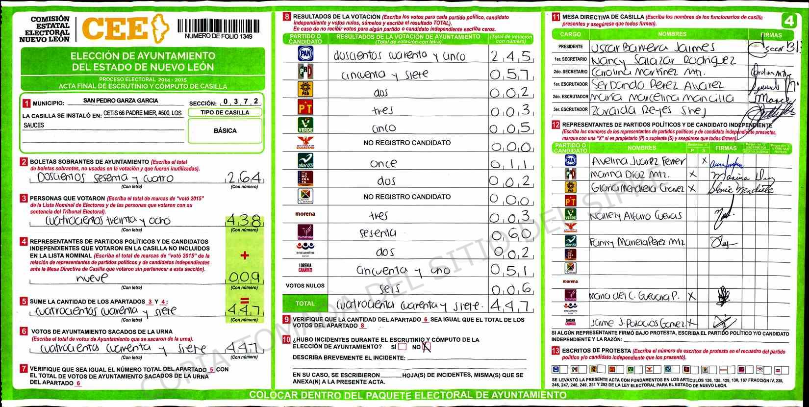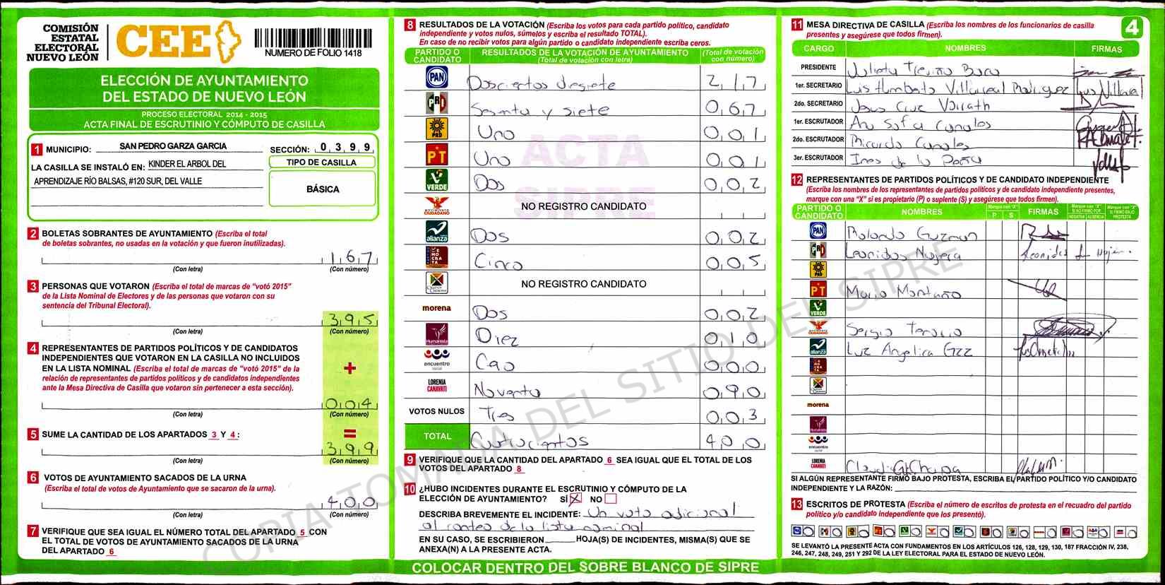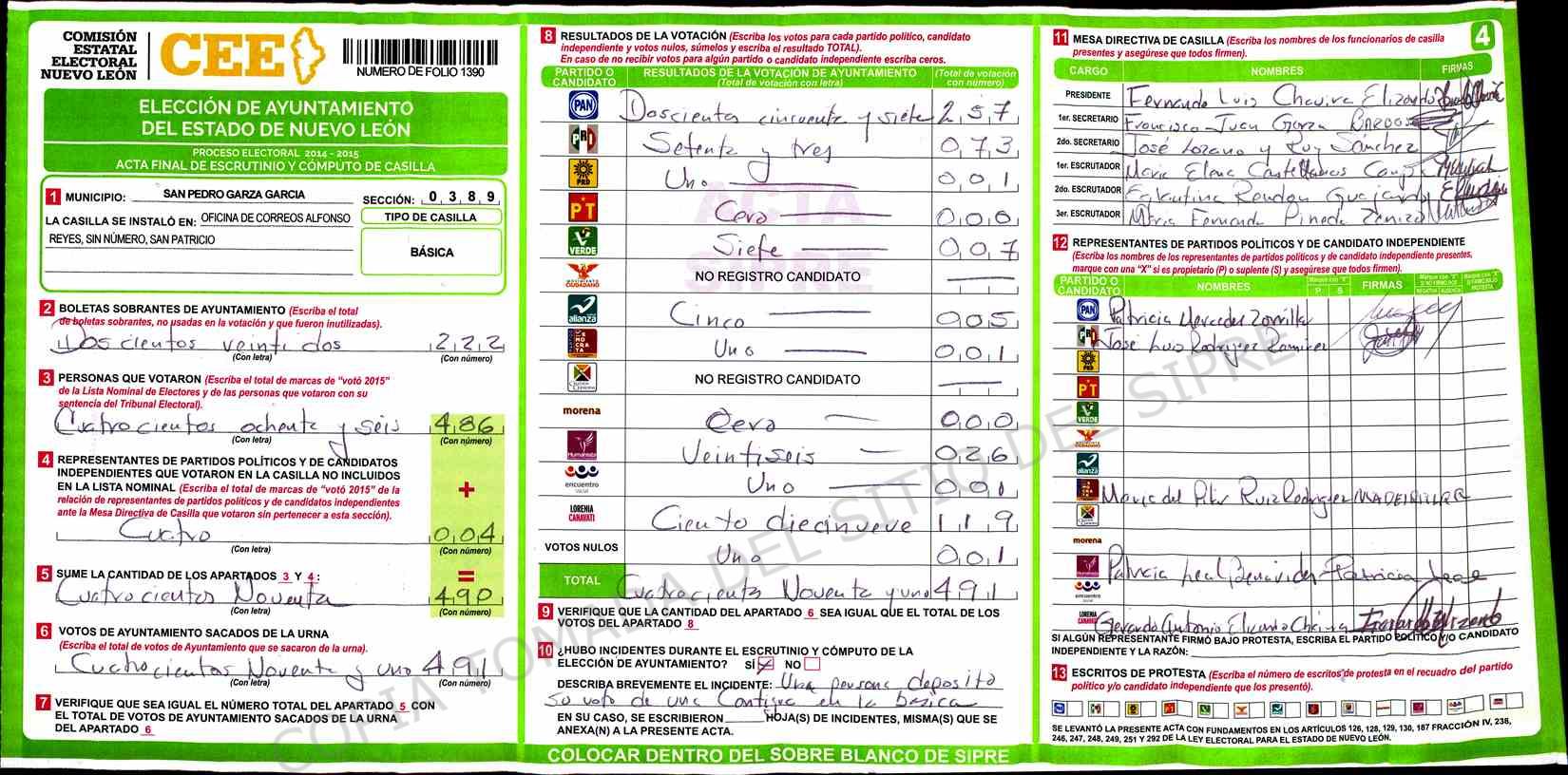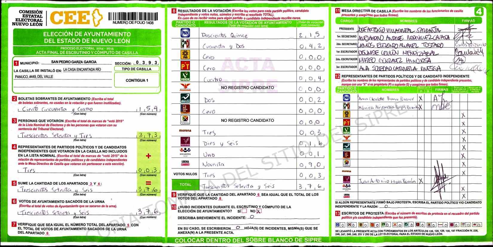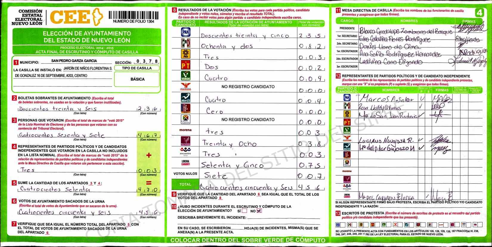| Claves de Incidencia: | (1) Ilegible, (2) Mutilada, (3) Presenta Correcciones, (4) Presenta Borrones, (5) En Blanco, (6) Cifras Remarcadas, (7) Cifras de Mas, (8) Copiado Movido, (9) Con Signos Inválidos, (10) Excede Lista Nominal, (11) Otra |