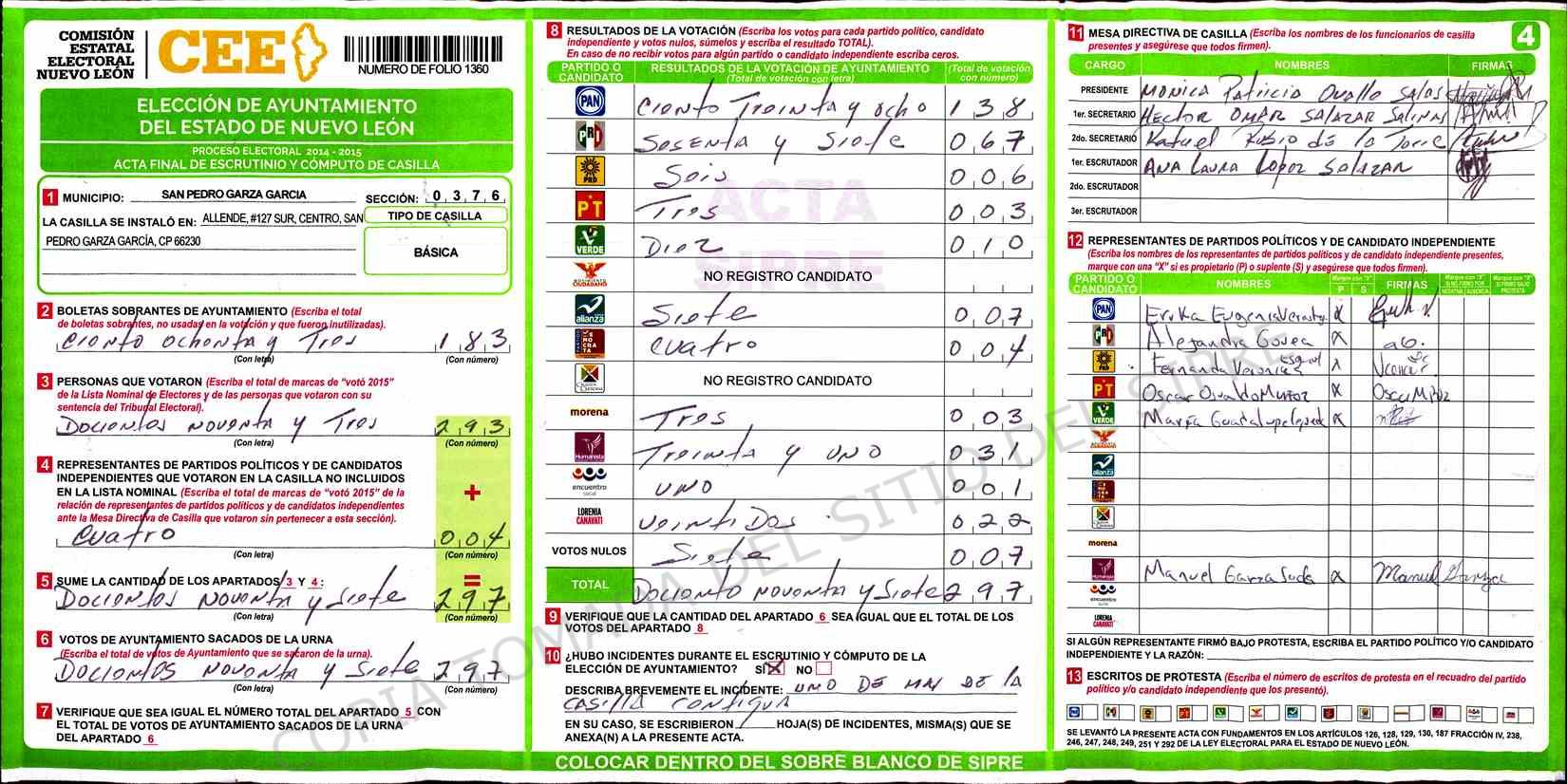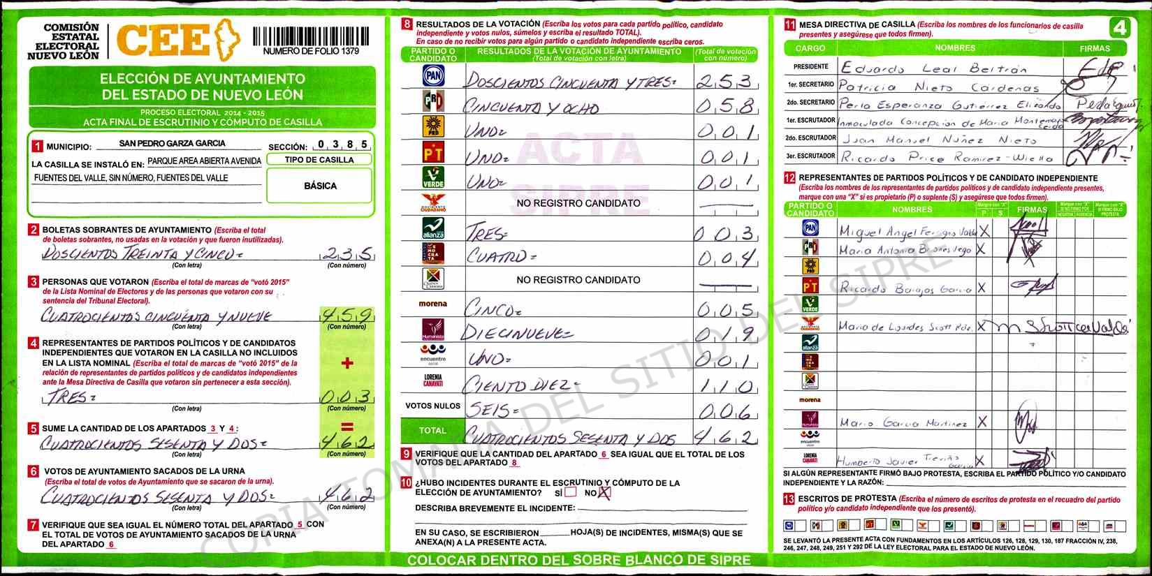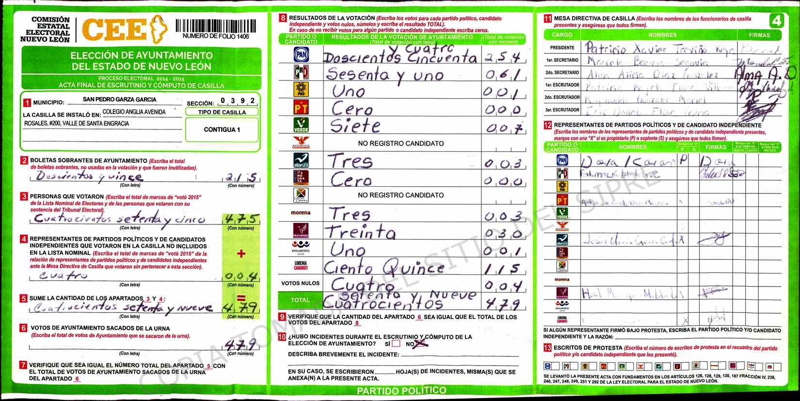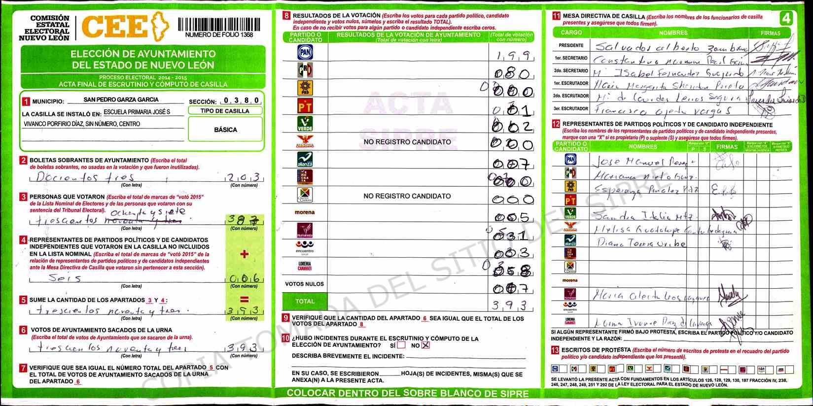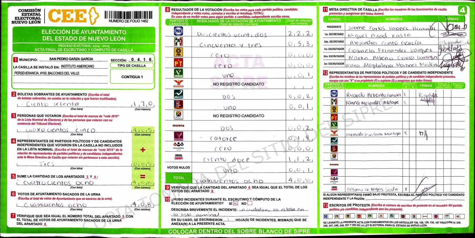 | Claves de Incidencia: | (1) Ilegible, (2) Mutilada, (3) Presenta Correcciones, (4) Presenta Borrones, (5) En Blanco, (6) Cifras Remarcadas, (7) Cifras de Mas, (8) Copiado Movido, (9) Con Signos Inválidos, (10) Excede Lista Nominal, (11) Otra |