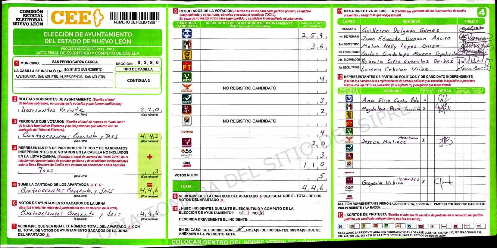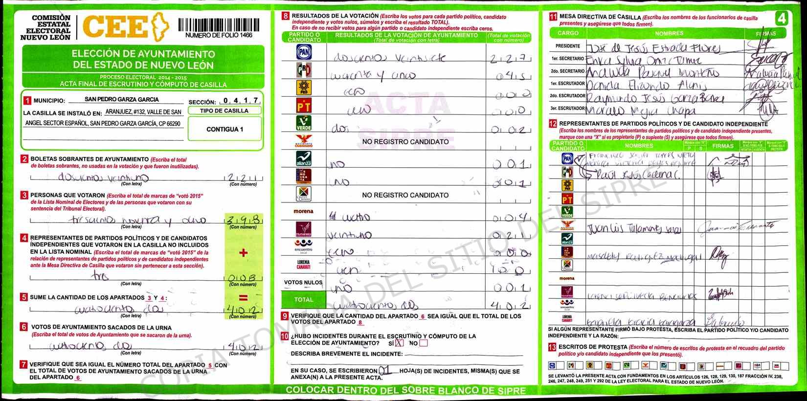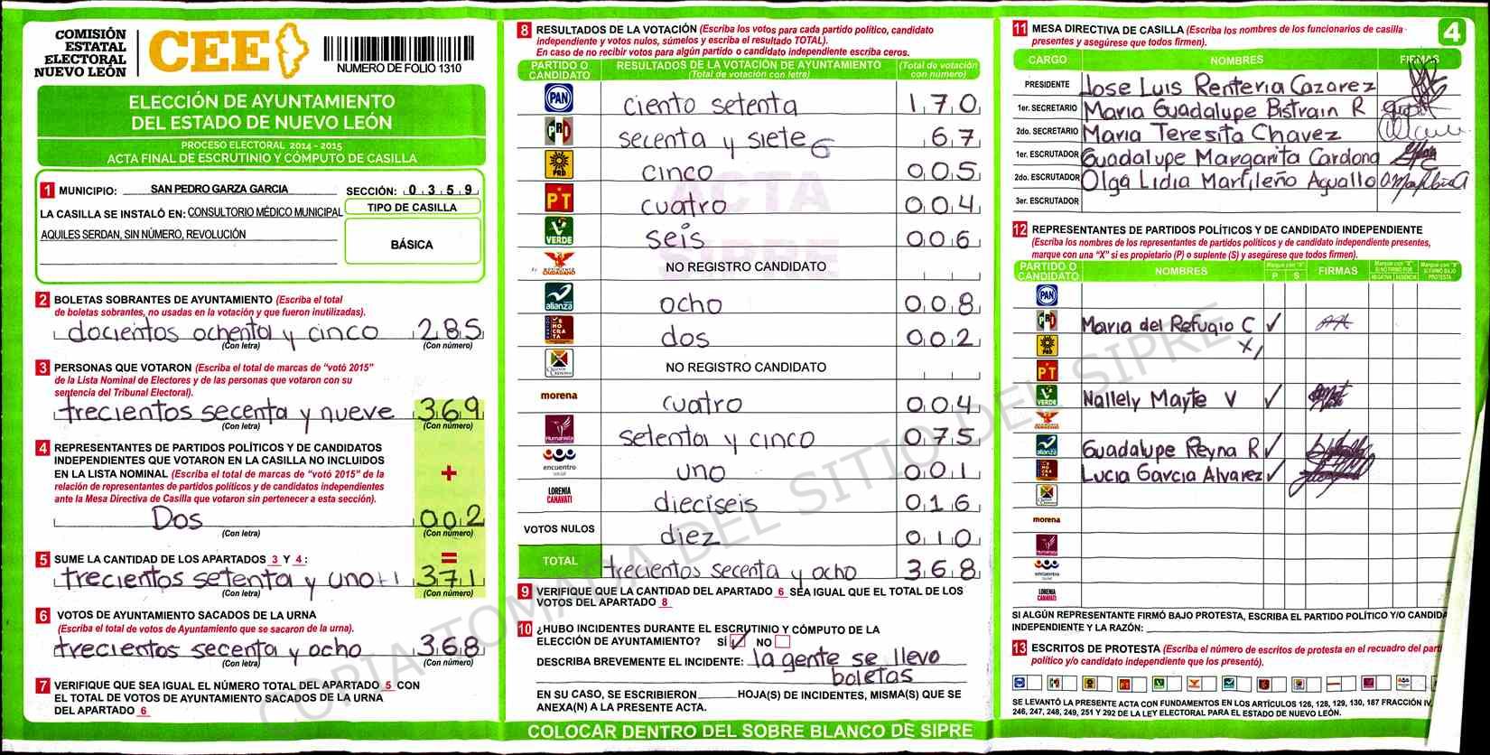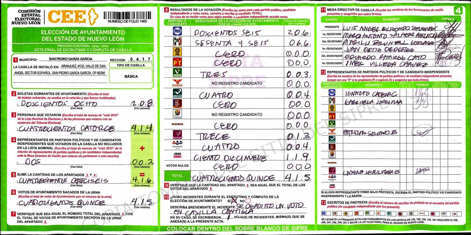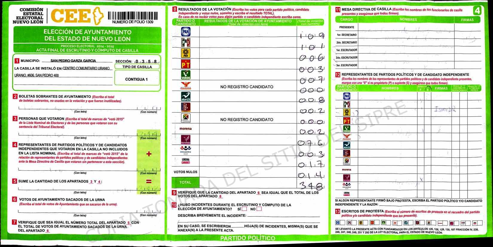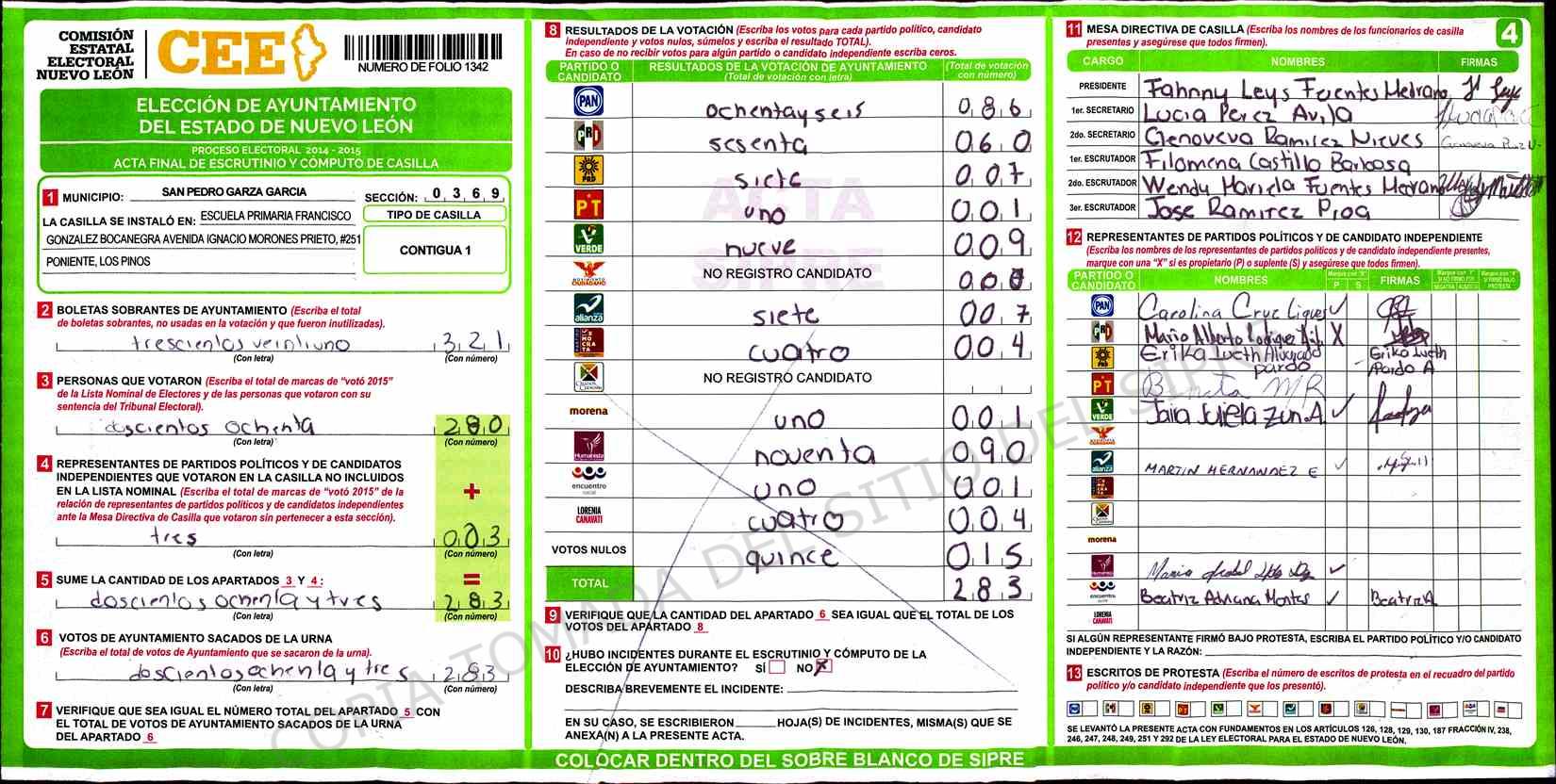 | Claves de Incidencia: | (1) Ilegible, (2) Mutilada, (3) Presenta Correcciones, (4) Presenta Borrones, (5) En Blanco, (6) Cifras Remarcadas, (7) Cifras de Mas, (8) Copiado Movido, (9) Con Signos Inválidos, (10) Excede Lista Nominal, (11) Otra |