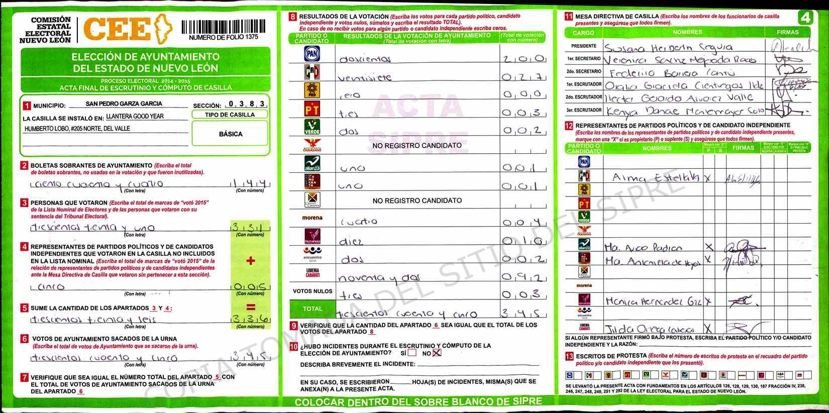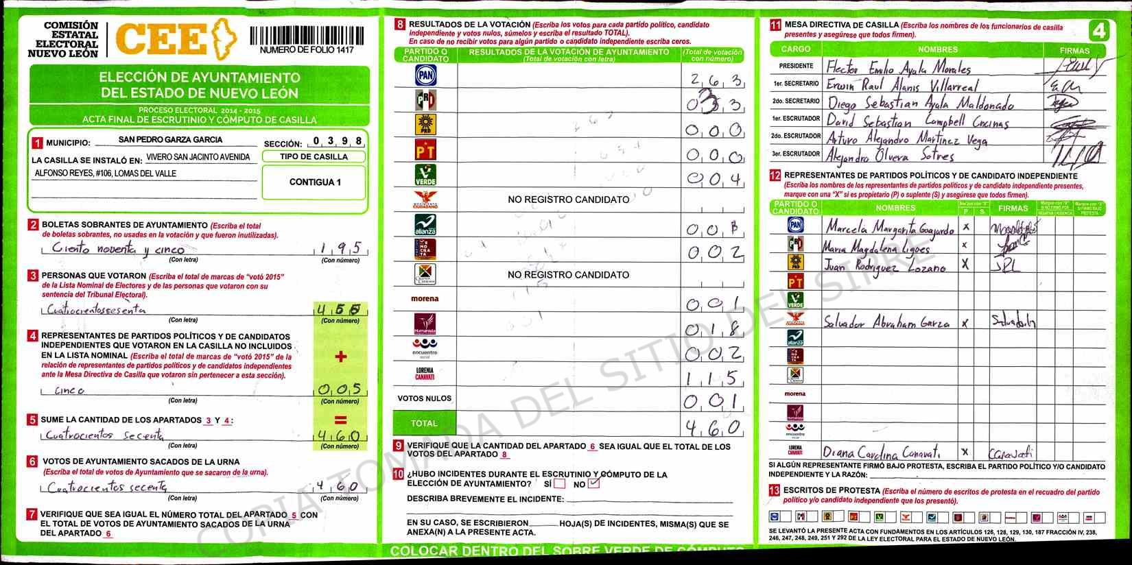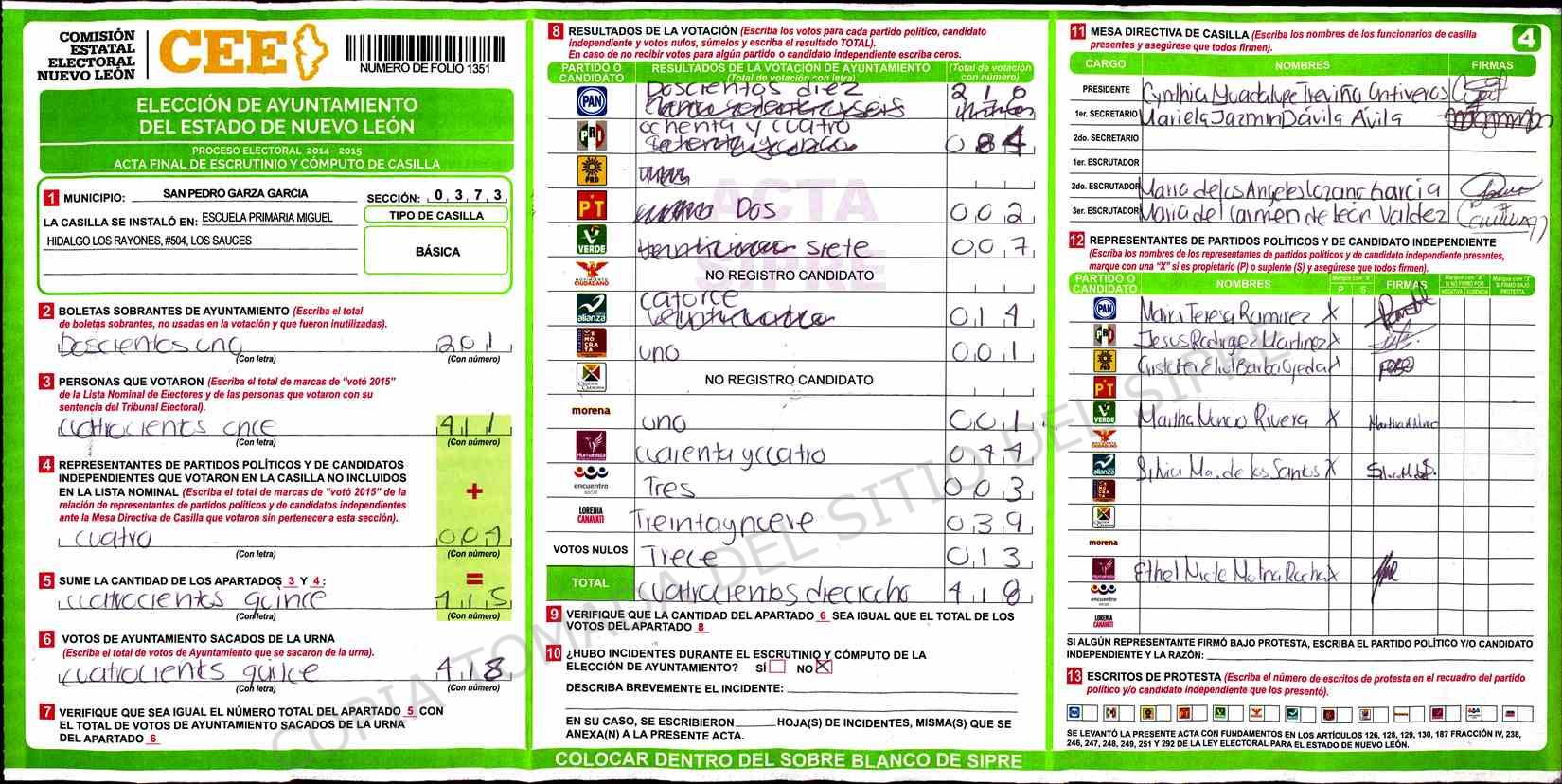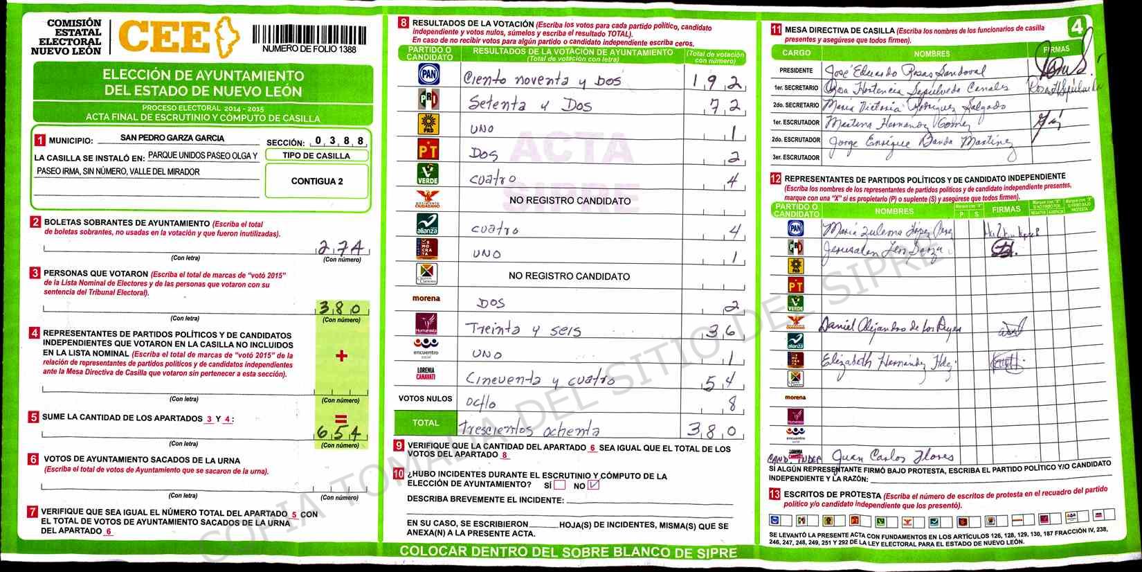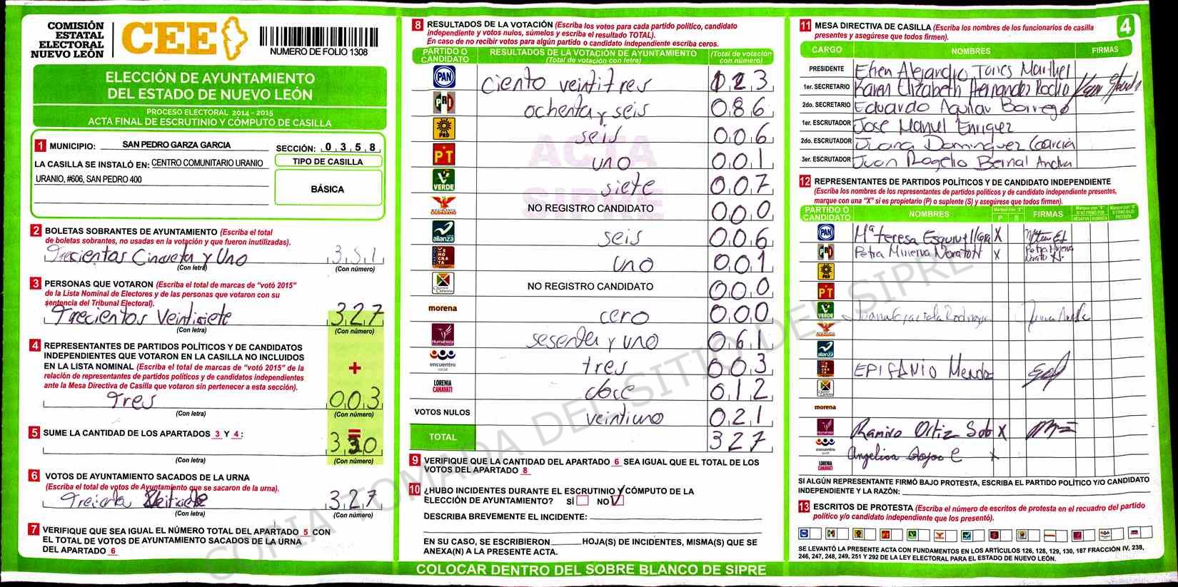 | Claves de Incidencia: | (1) Ilegible, (2) Mutilada, (3) Presenta Correcciones, (4) Presenta Borrones, (5) En Blanco, (6) Cifras Remarcadas, (7) Cifras de Mas, (8) Copiado Movido, (9) Con Signos Inválidos, (10) Excede Lista Nominal, (11) Otra |