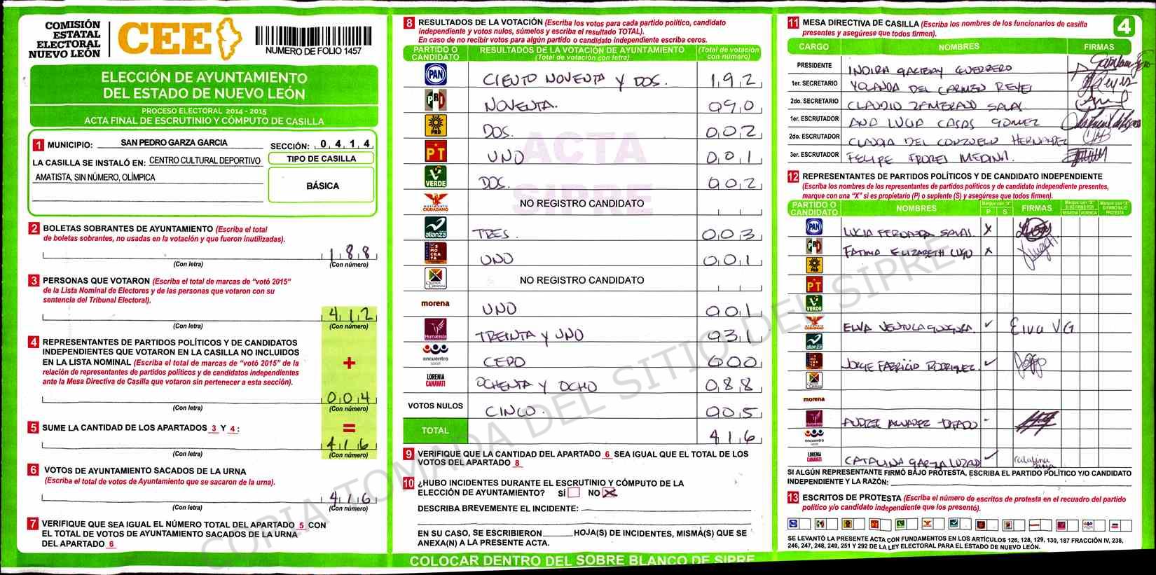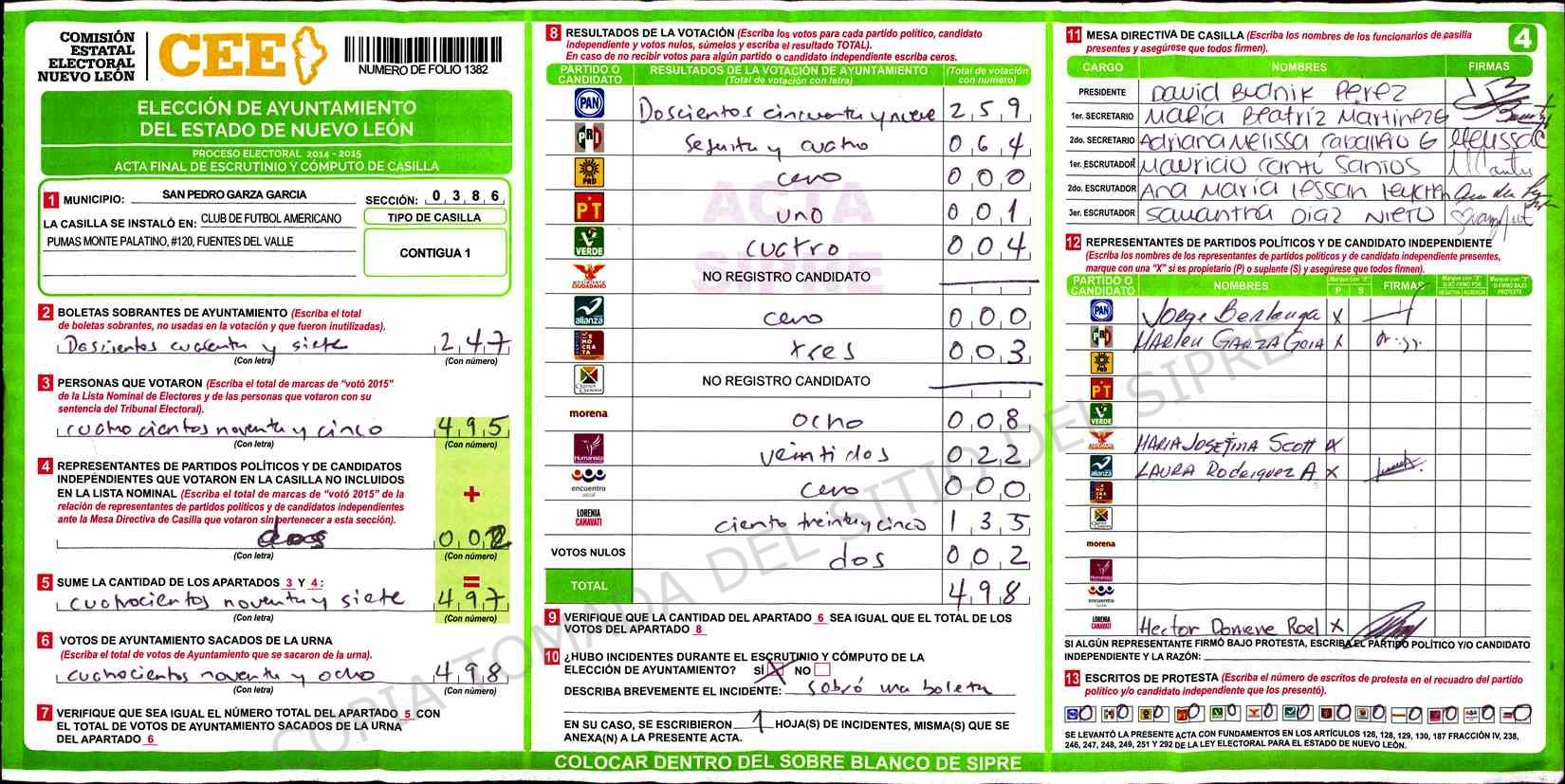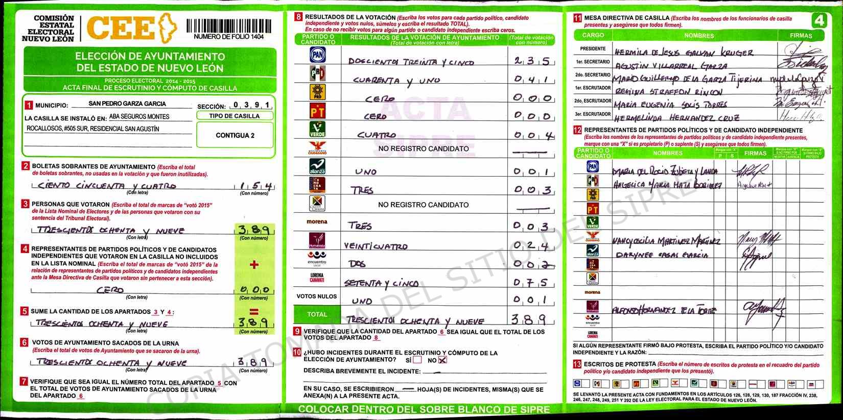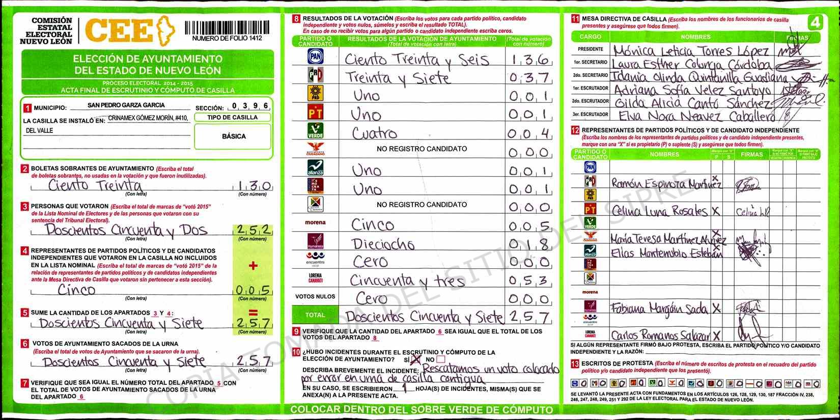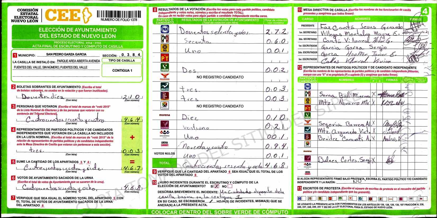 | Claves de Incidencia: | (1) Ilegible, (2) Mutilada, (3) Presenta Correcciones, (4) Presenta Borrones, (5) En Blanco, (6) Cifras Remarcadas, (7) Cifras de Mas, (8) Copiado Movido, (9) Con Signos Inválidos, (10) Excede Lista Nominal, (11) Otra |