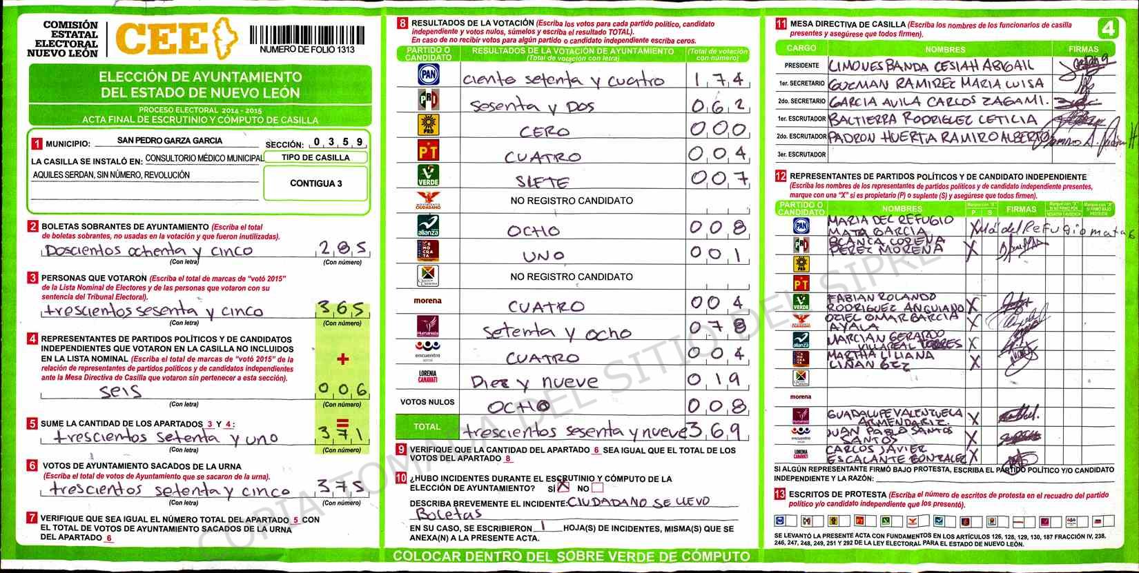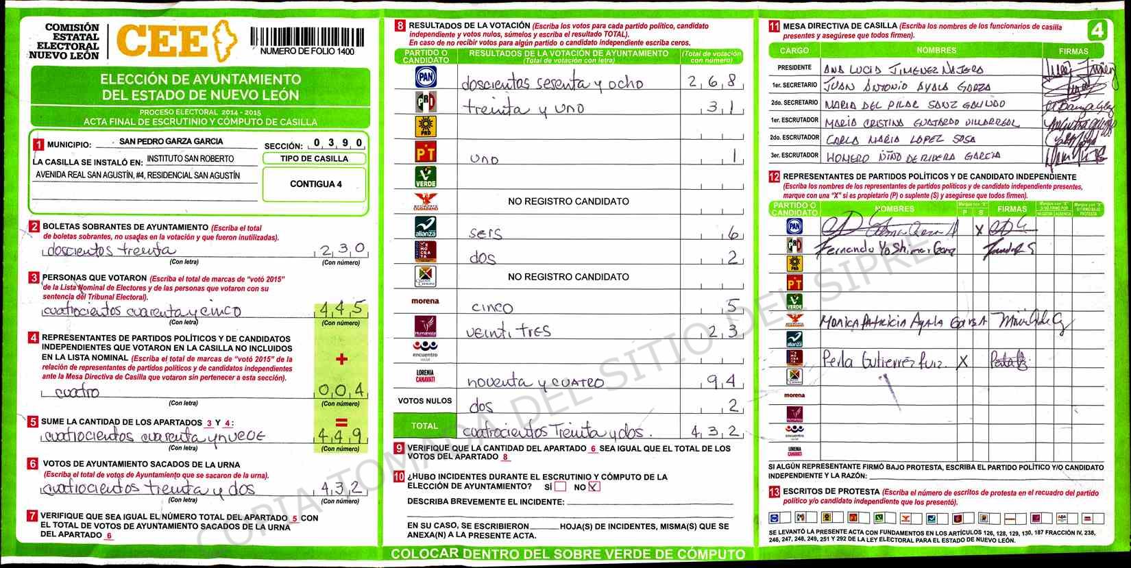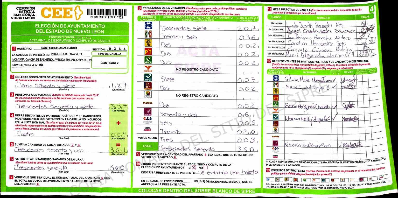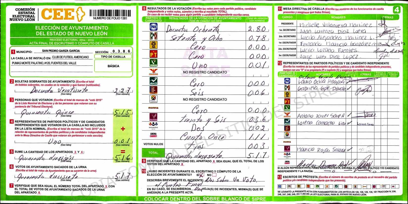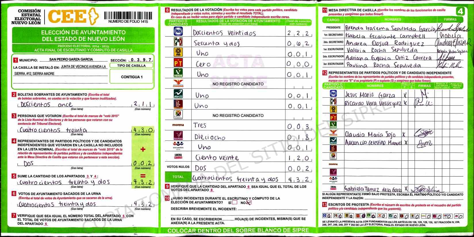 | Claves de Incidencia: | (1) Ilegible, (2) Mutilada, (3) Presenta Correcciones, (4) Presenta Borrones, (5) En Blanco, (6) Cifras Remarcadas, (7) Cifras de Mas, (8) Copiado Movido, (9) Con Signos Inválidos, (10) Excede Lista Nominal, (11) Otra |