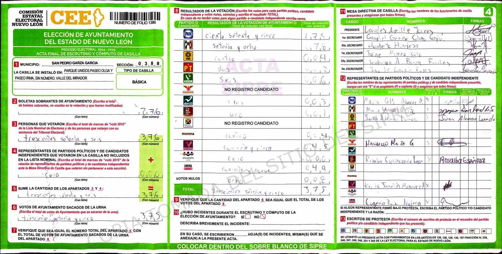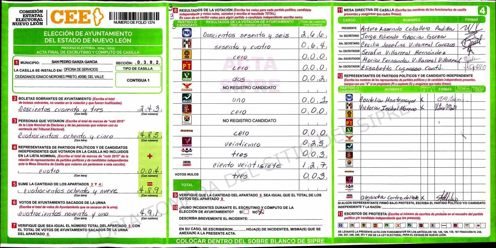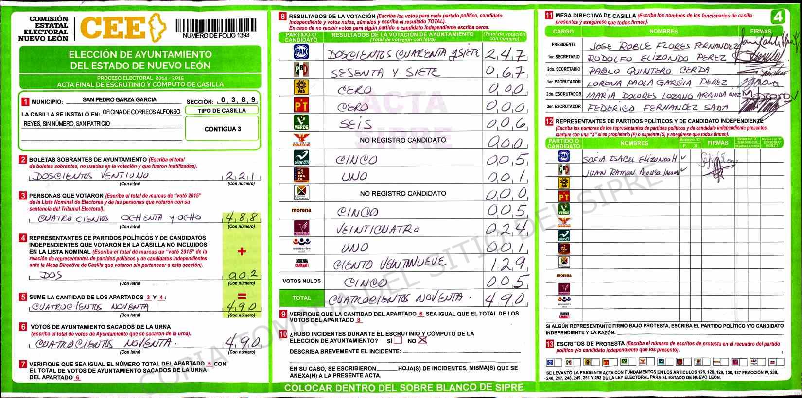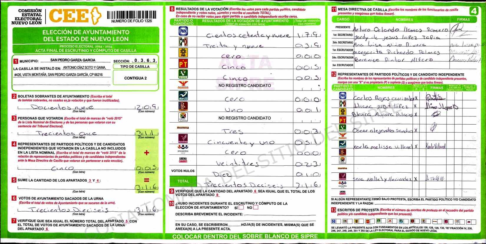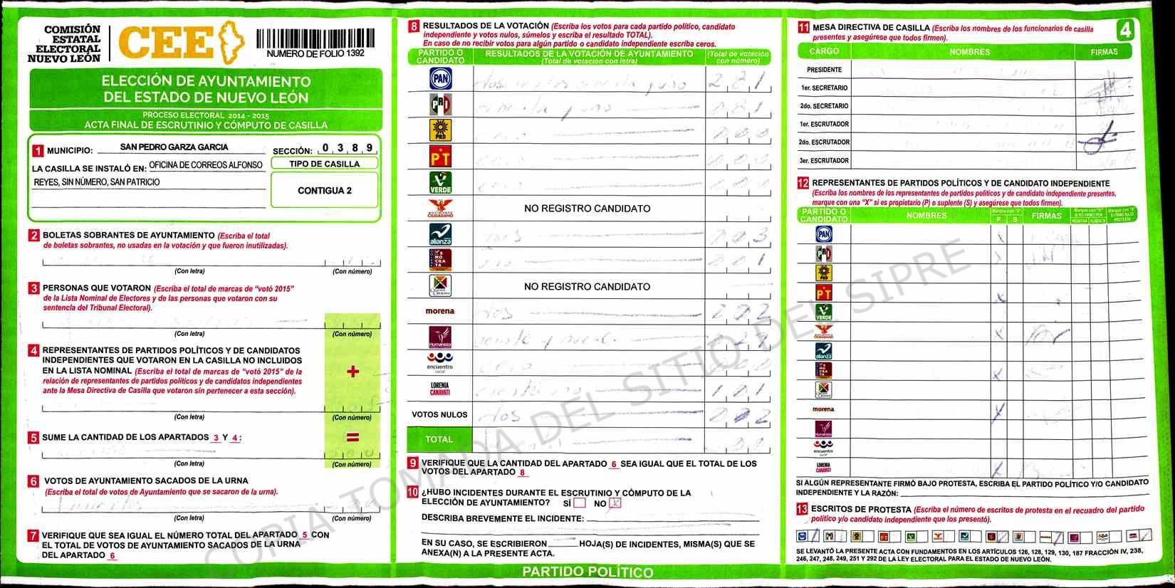 | Claves de Incidencia: | (1) Ilegible, (2) Mutilada, (3) Presenta Correcciones, (4) Presenta Borrones, (5) En Blanco, (6) Cifras Remarcadas, (7) Cifras de Mas, (8) Copiado Movido, (9) Con Signos Inválidos, (10) Excede Lista Nominal, (11) Otra |