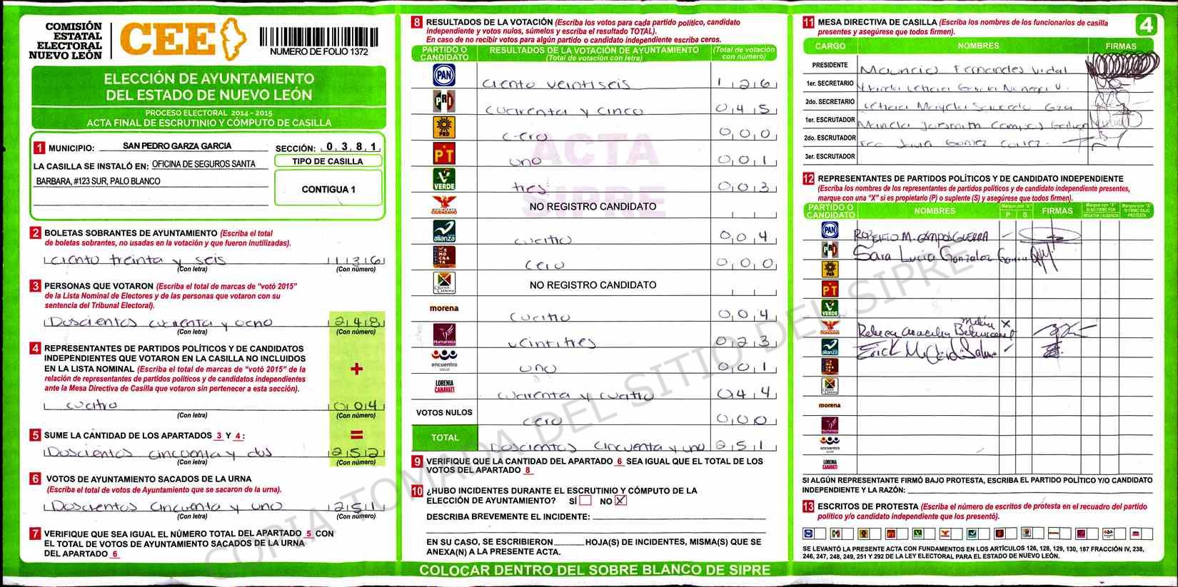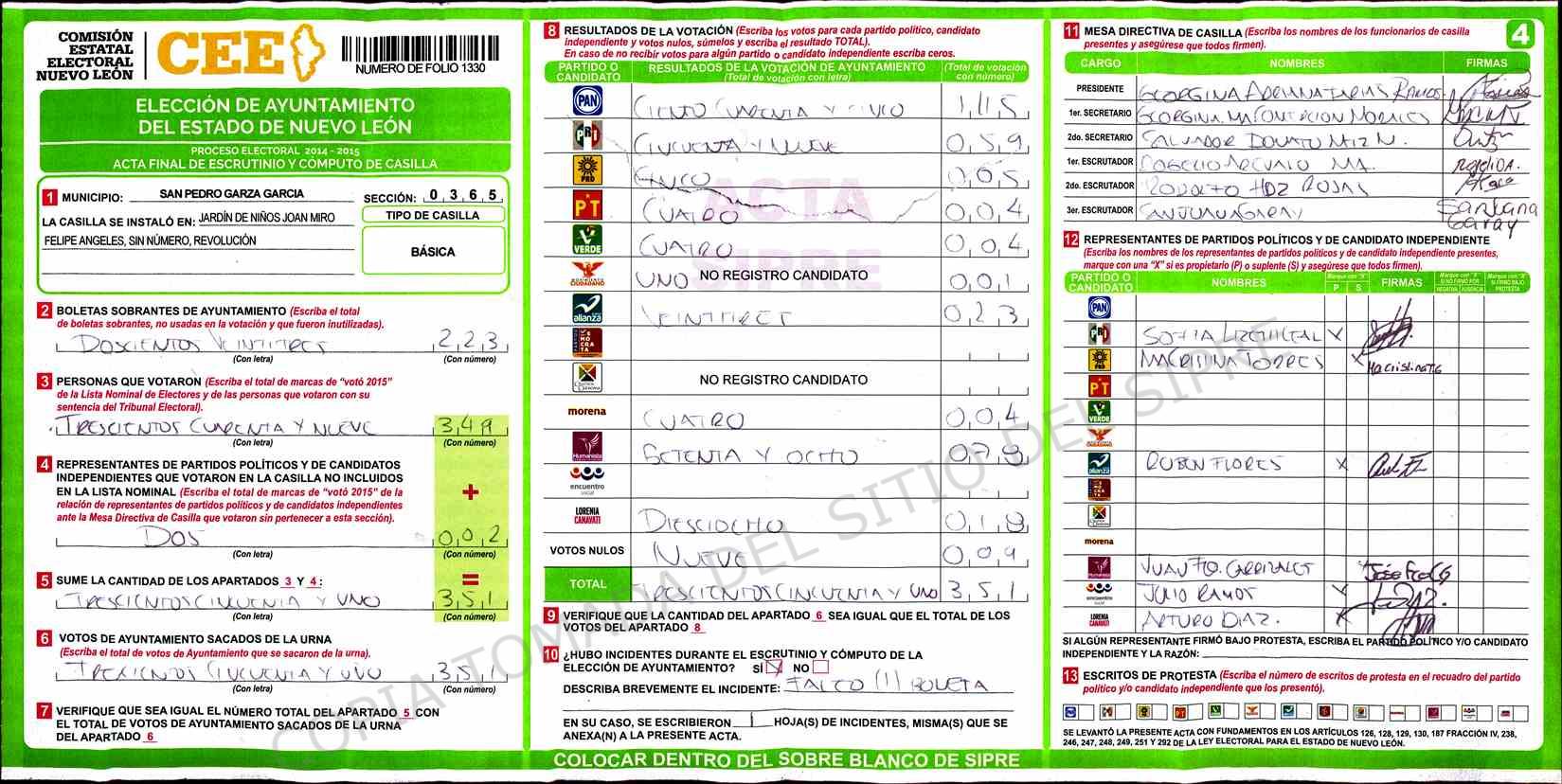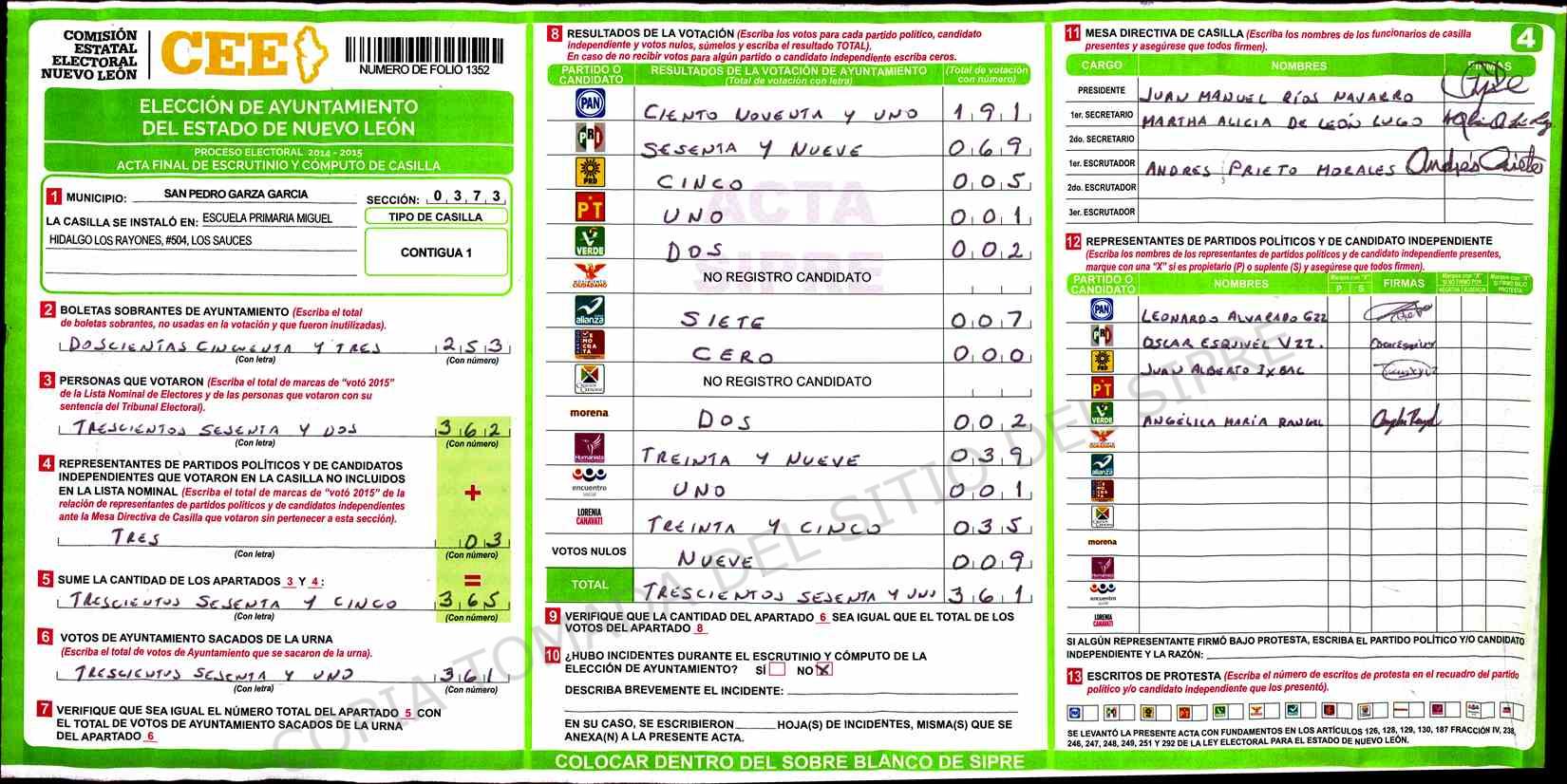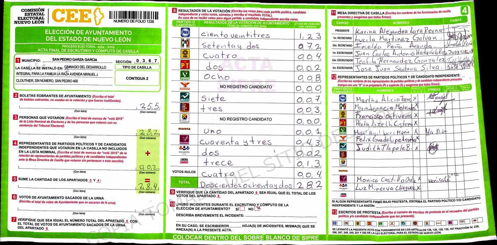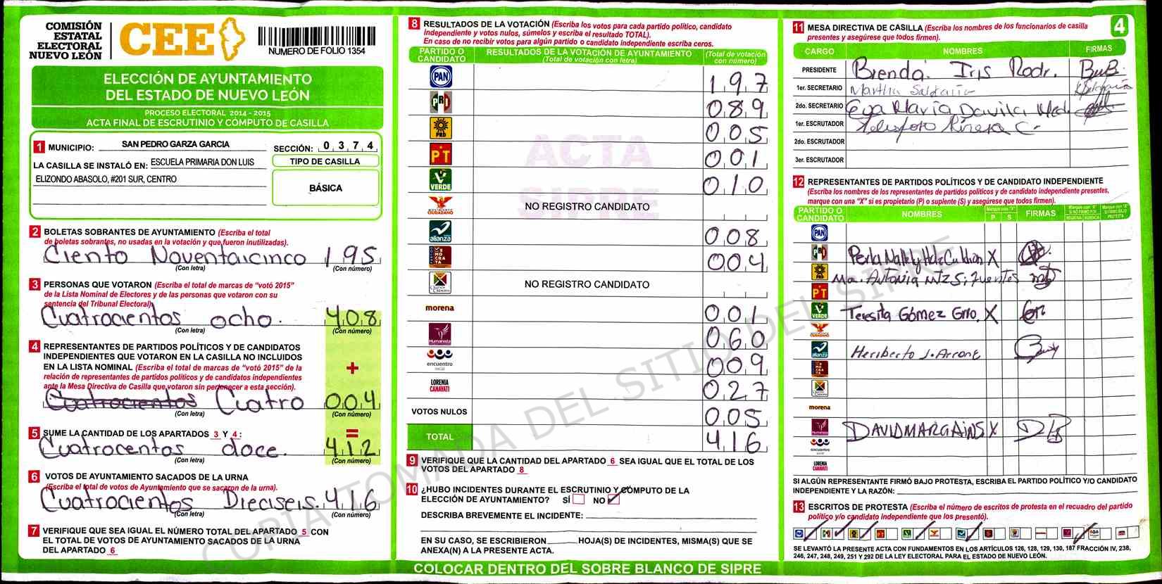 | Claves de Incidencia: | (1) Ilegible, (2) Mutilada, (3) Presenta Correcciones, (4) Presenta Borrones, (5) En Blanco, (6) Cifras Remarcadas, (7) Cifras de Mas, (8) Copiado Movido, (9) Con Signos Inválidos, (10) Excede Lista Nominal, (11) Otra |