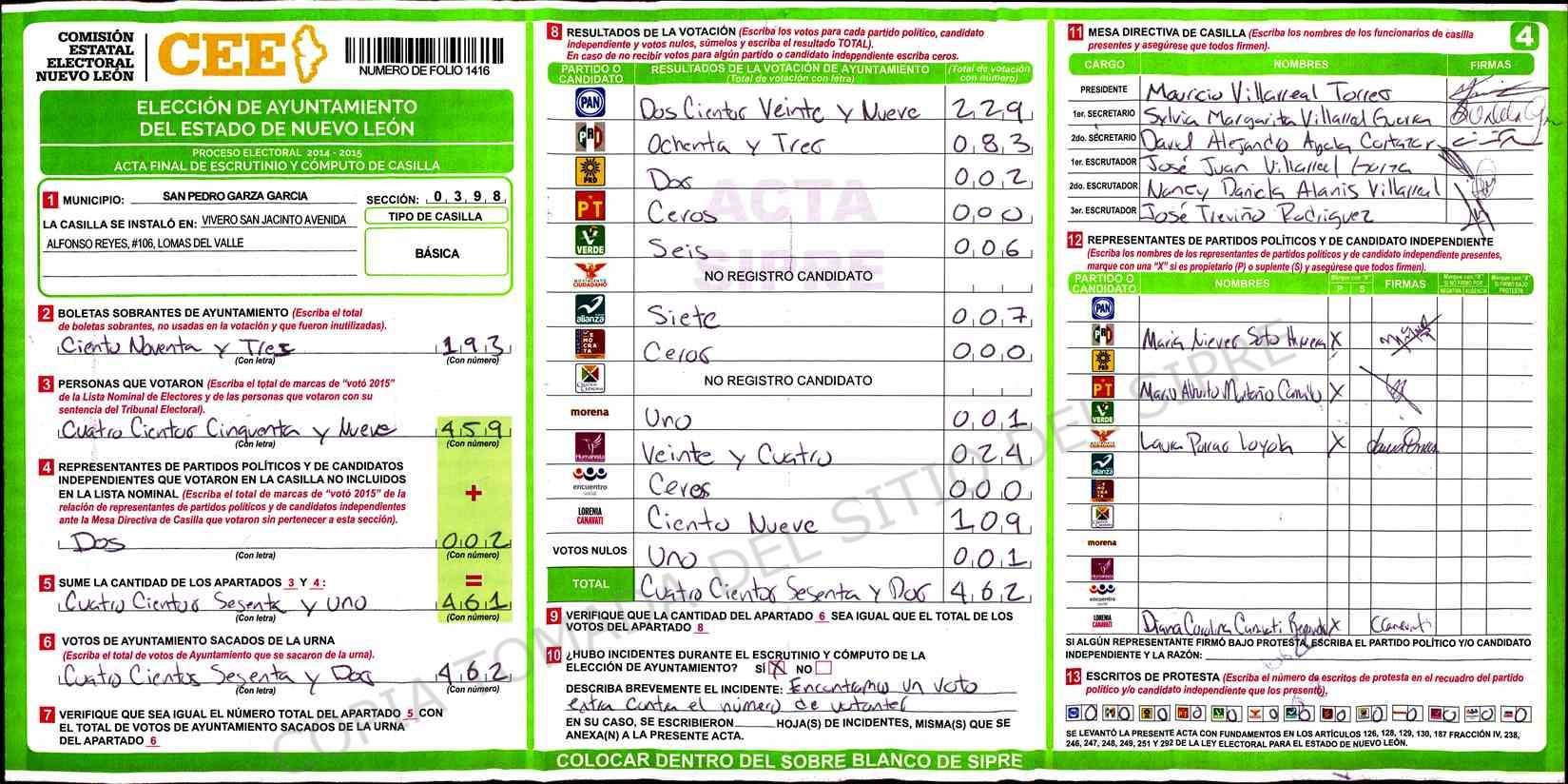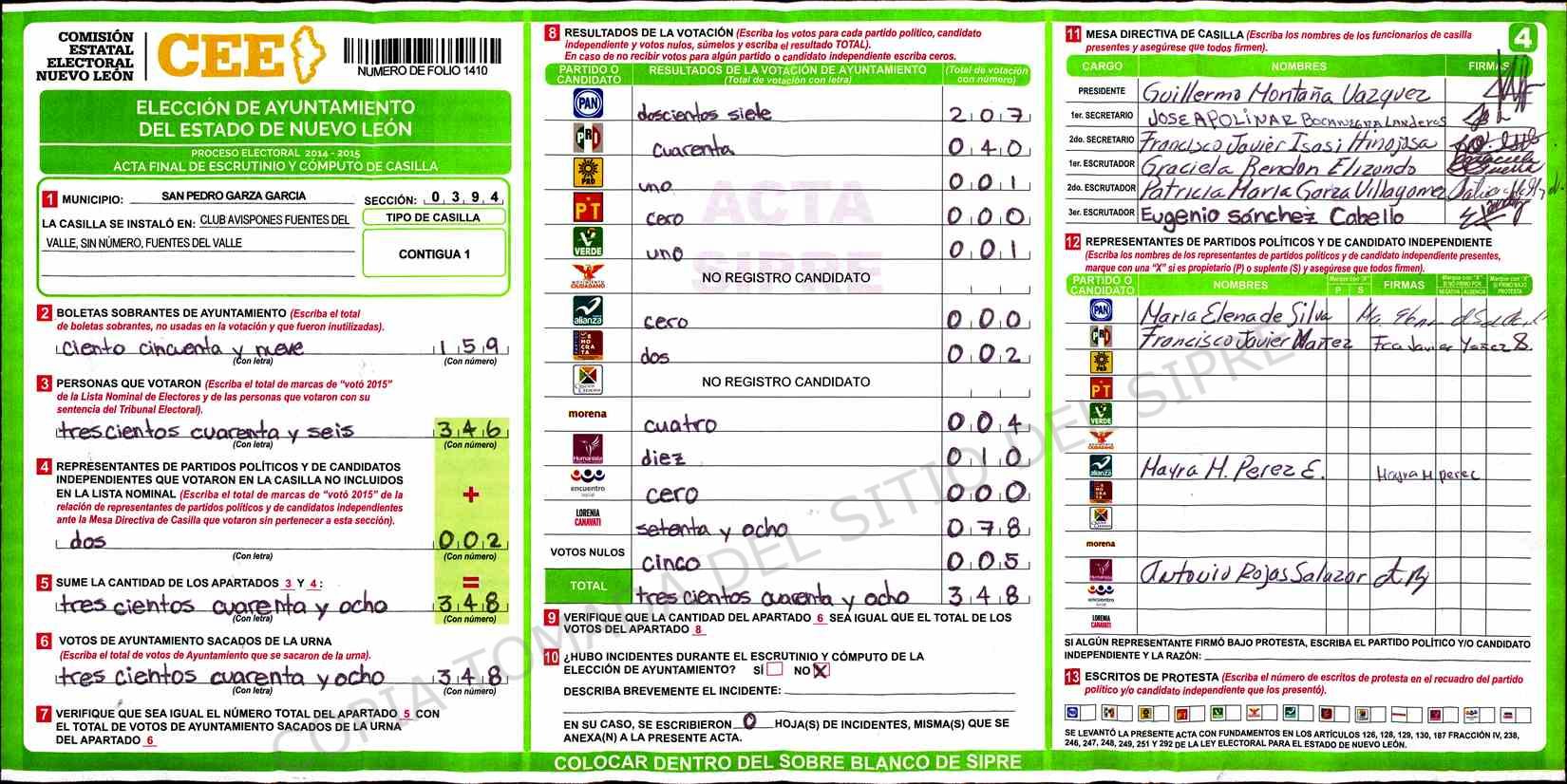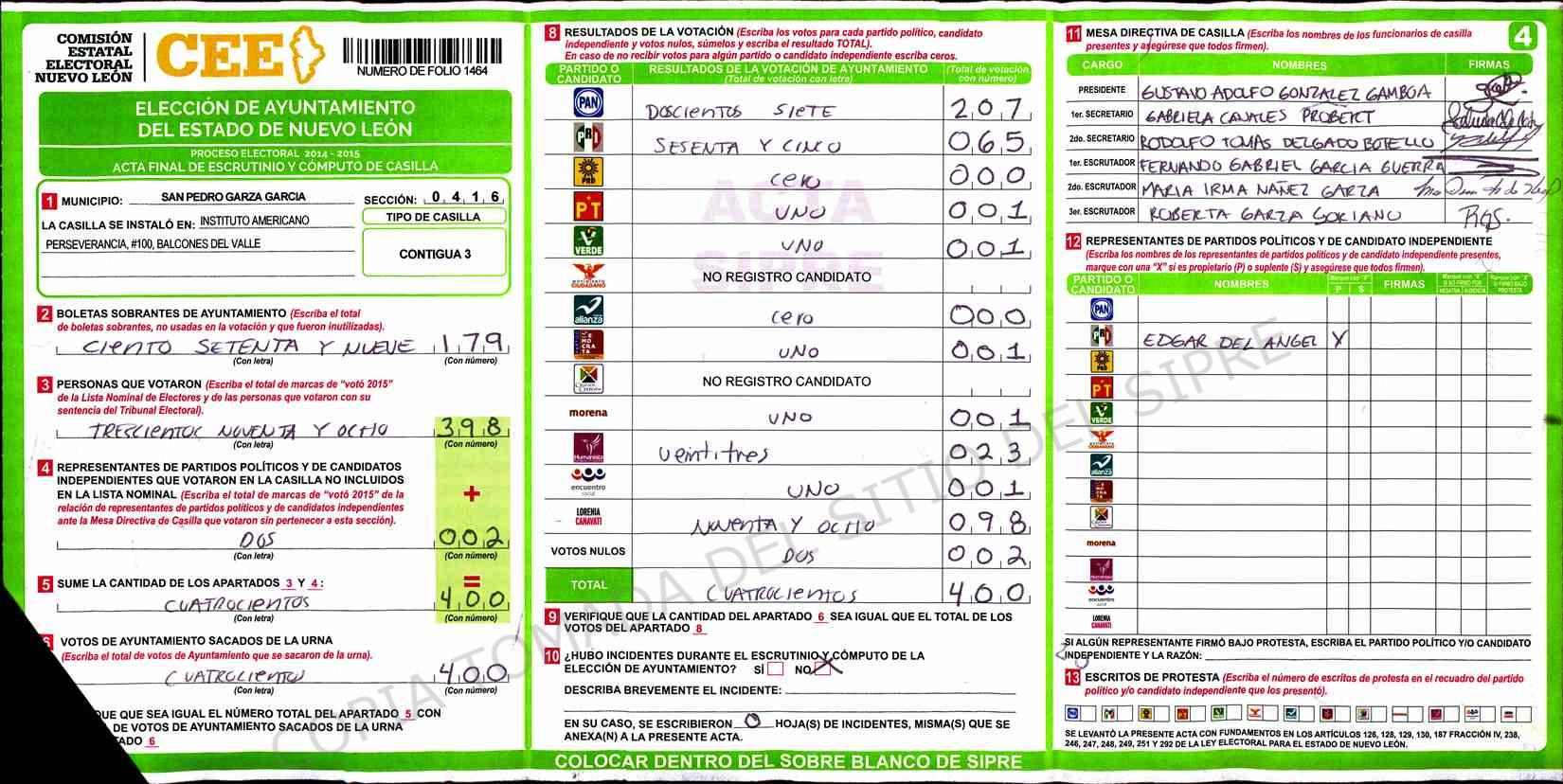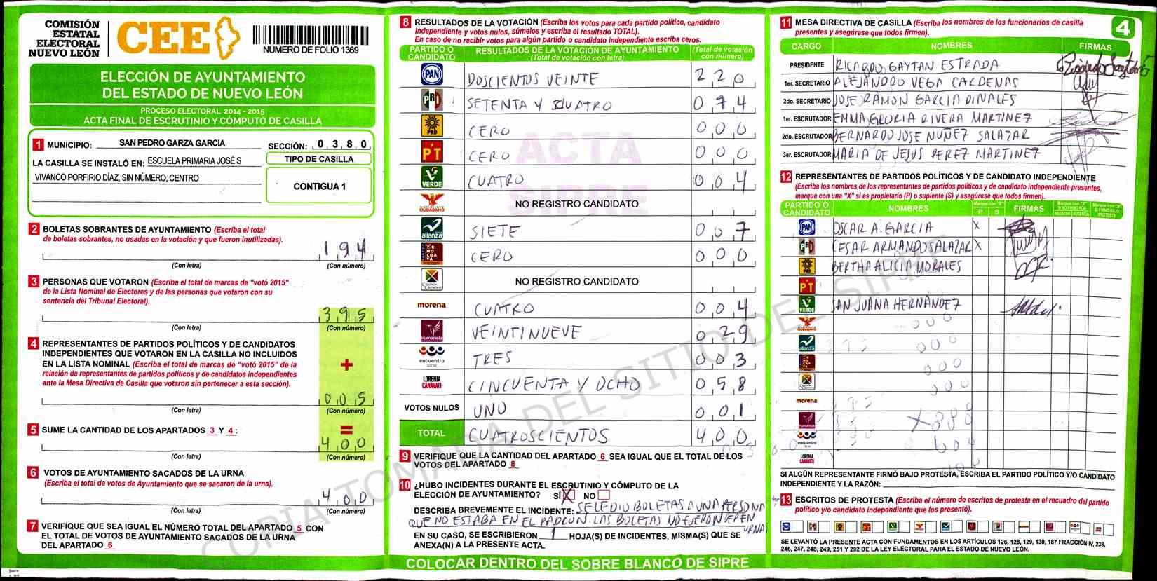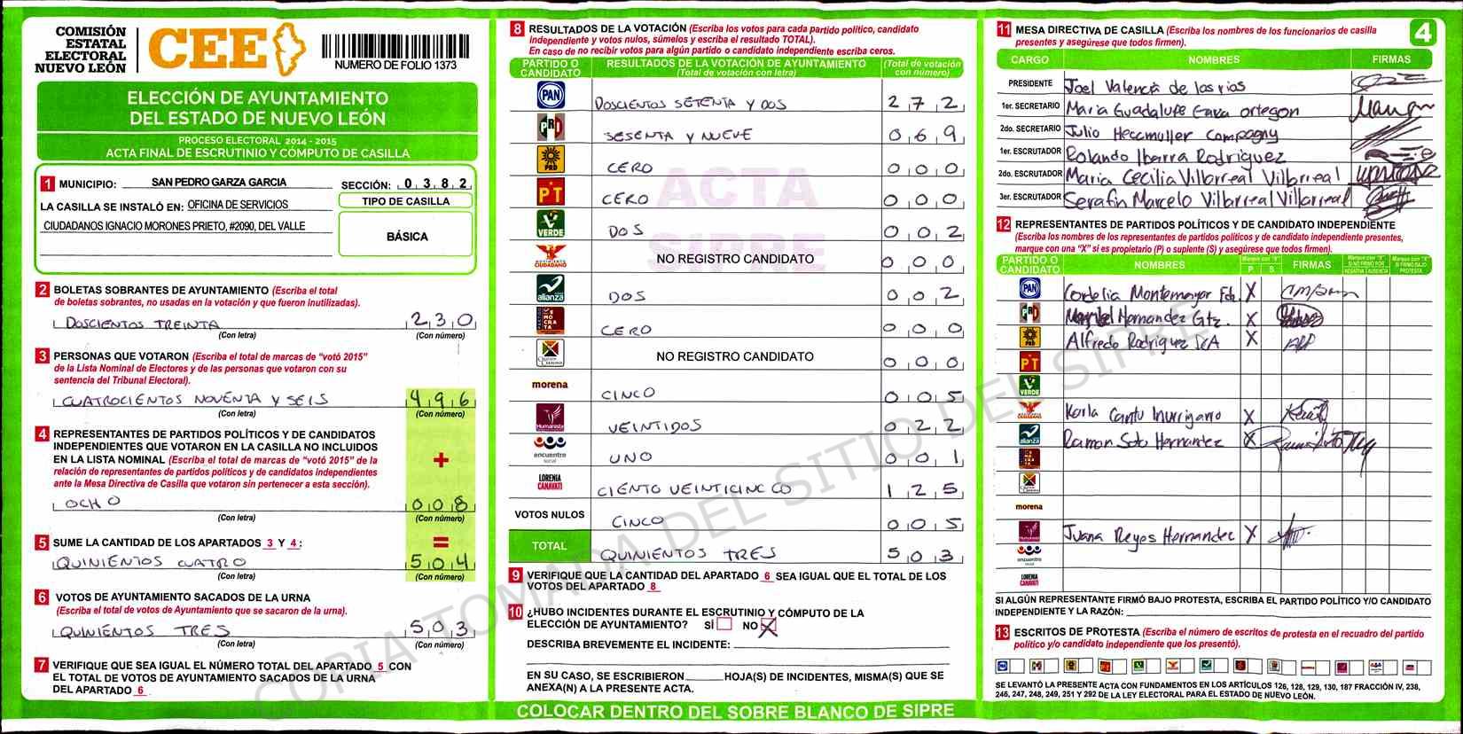 | Claves de Incidencia: | (1) Ilegible, (2) Mutilada, (3) Presenta Correcciones, (4) Presenta Borrones, (5) En Blanco, (6) Cifras Remarcadas, (7) Cifras de Mas, (8) Copiado Movido, (9) Con Signos Inválidos, (10) Excede Lista Nominal, (11) Otra |