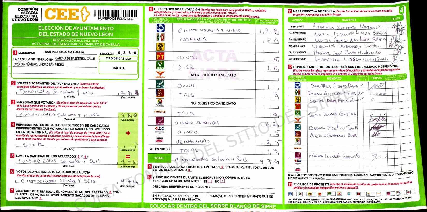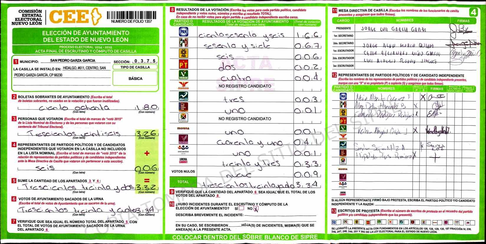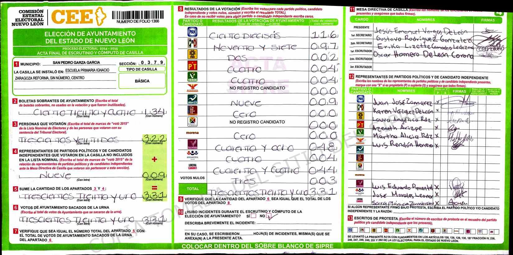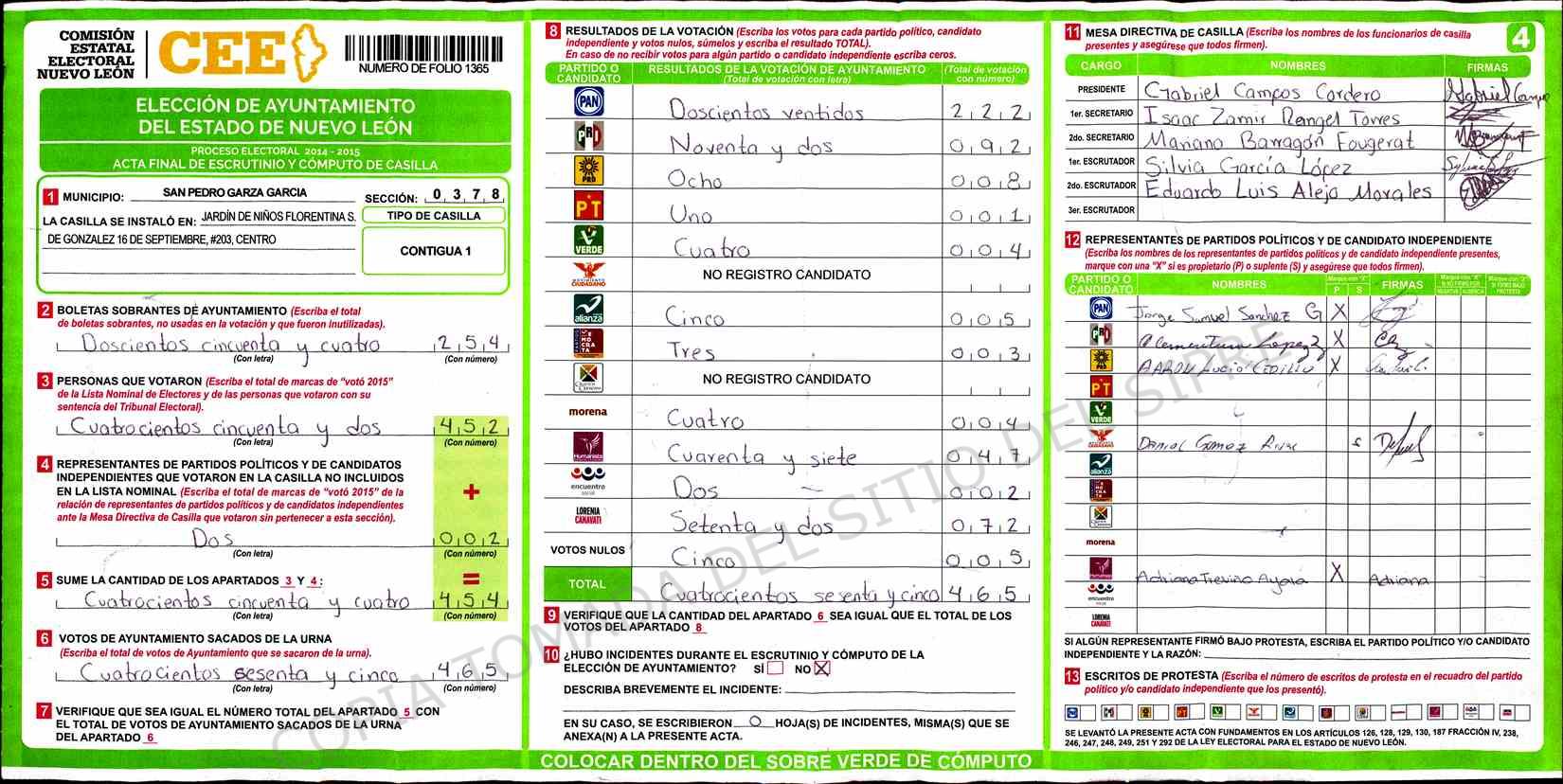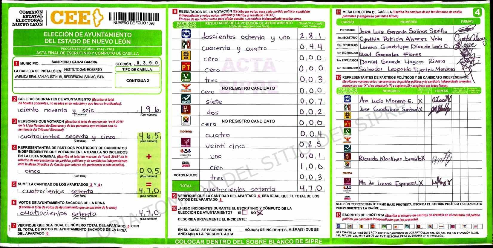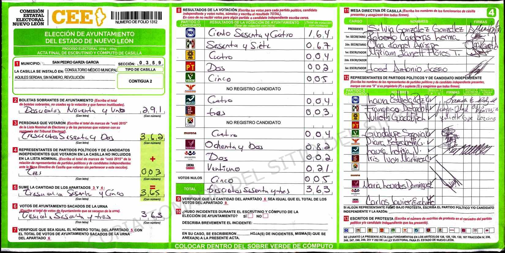 | Claves de Incidencia: | (1) Ilegible, (2) Mutilada, (3) Presenta Correcciones, (4) Presenta Borrones, (5) En Blanco, (6) Cifras Remarcadas, (7) Cifras de Mas, (8) Copiado Movido, (9) Con Signos Inválidos, (10) Excede Lista Nominal, (11) Otra |