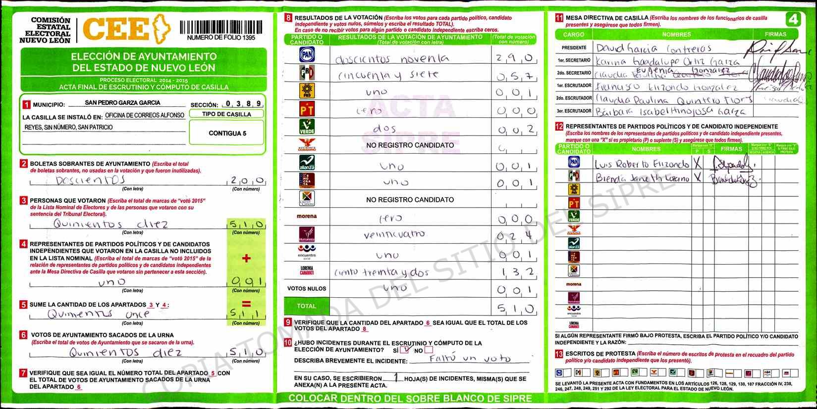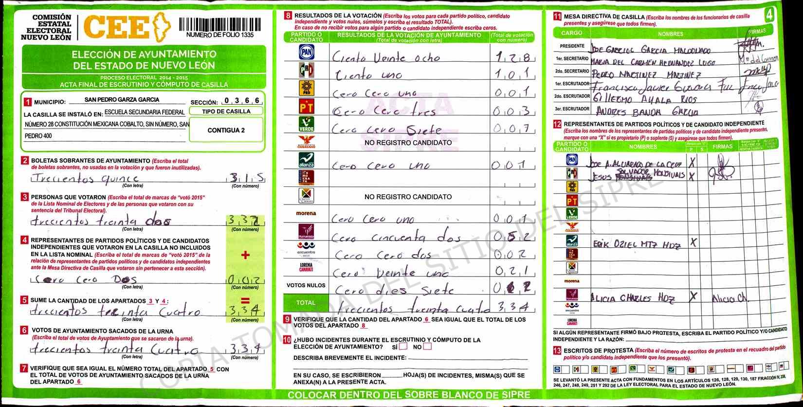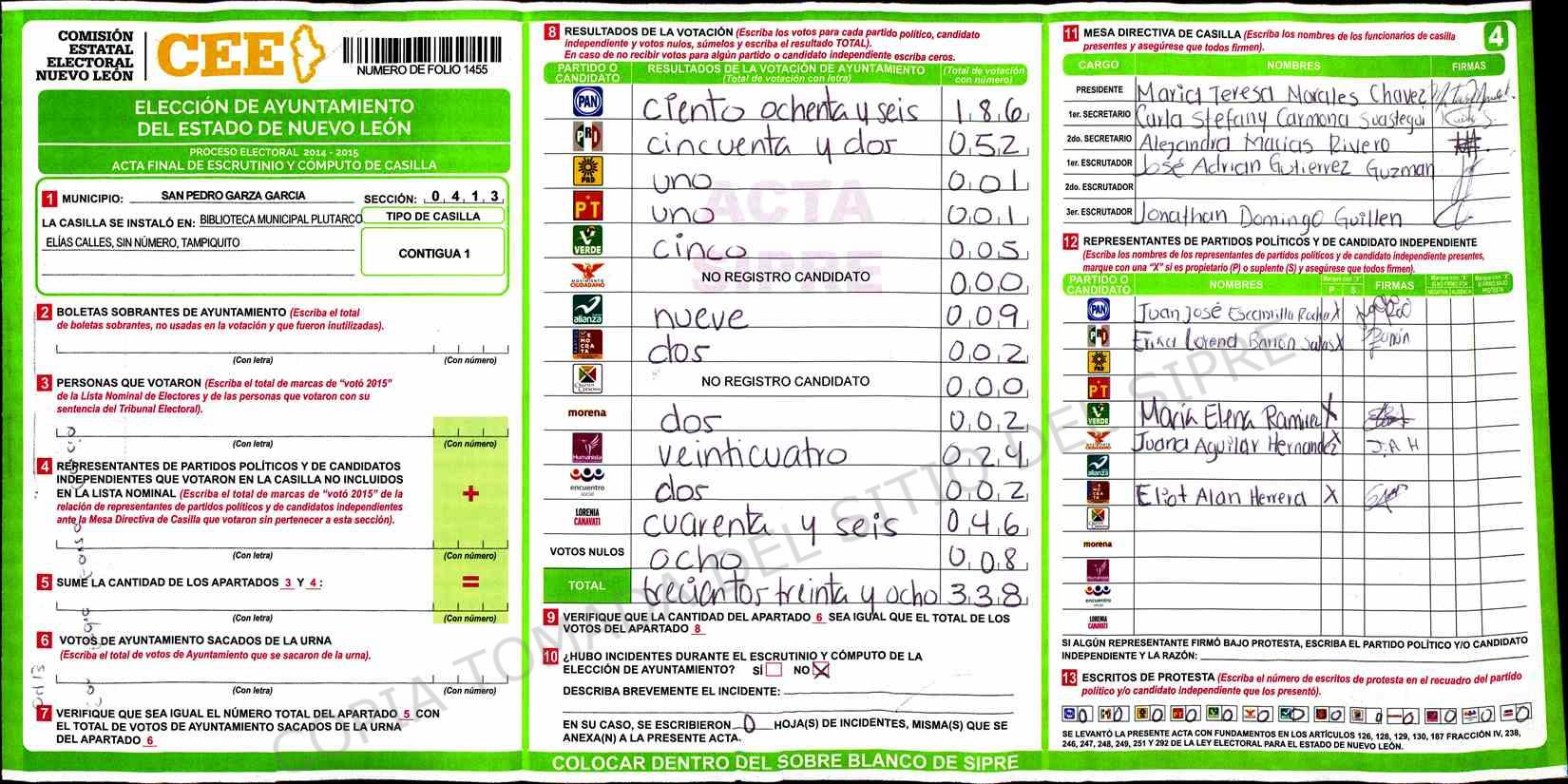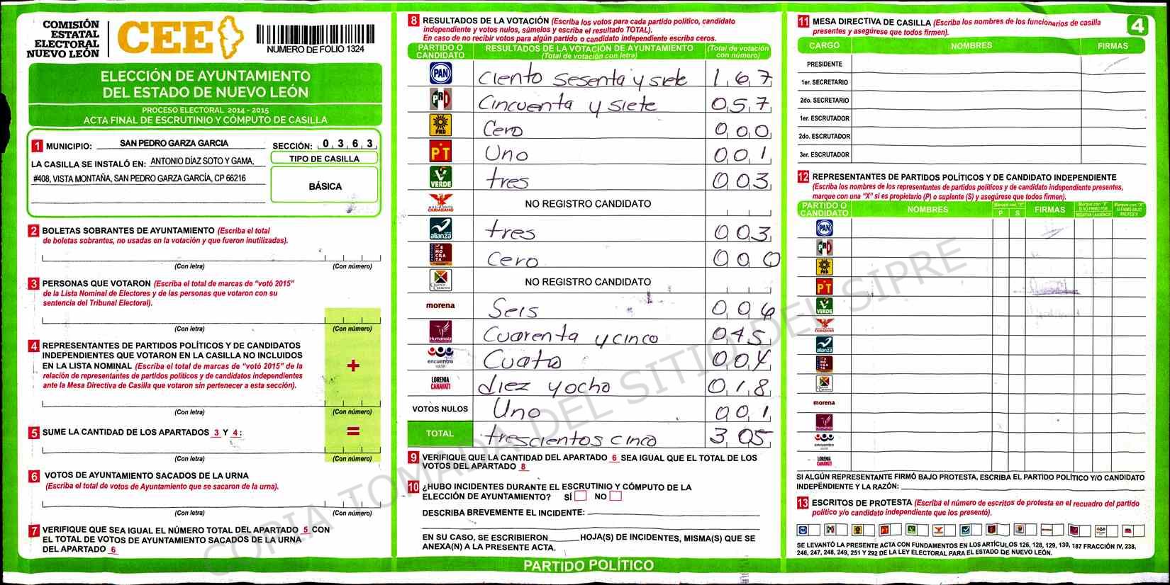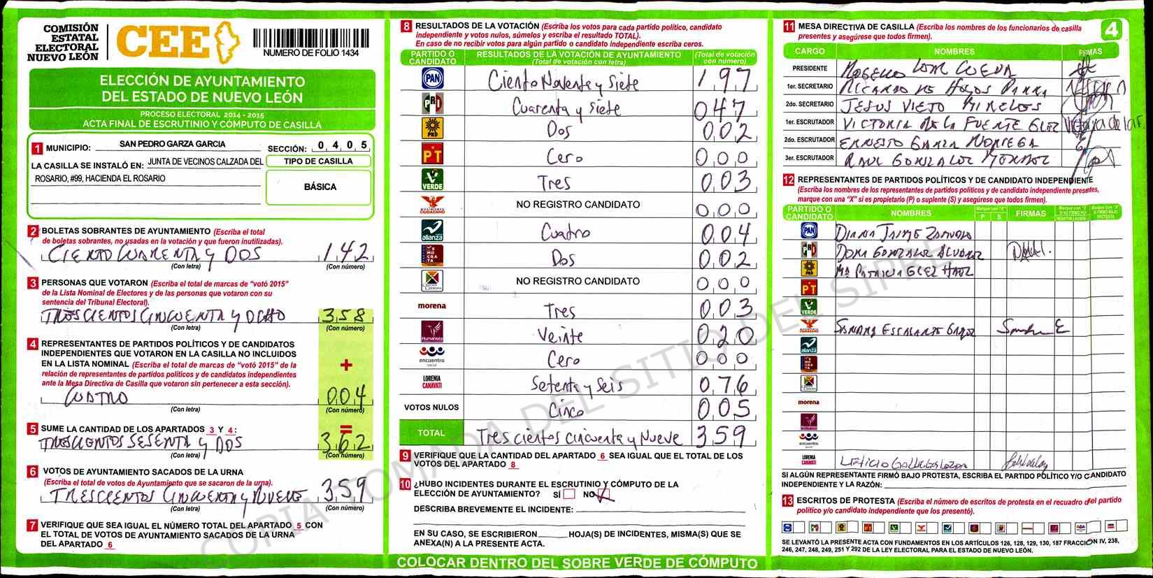 | Claves de Incidencia: | (1) Ilegible, (2) Mutilada, (3) Presenta Correcciones, (4) Presenta Borrones, (5) En Blanco, (6) Cifras Remarcadas, (7) Cifras de Mas, (8) Copiado Movido, (9) Con Signos Inválidos, (10) Excede Lista Nominal, (11) Otra |