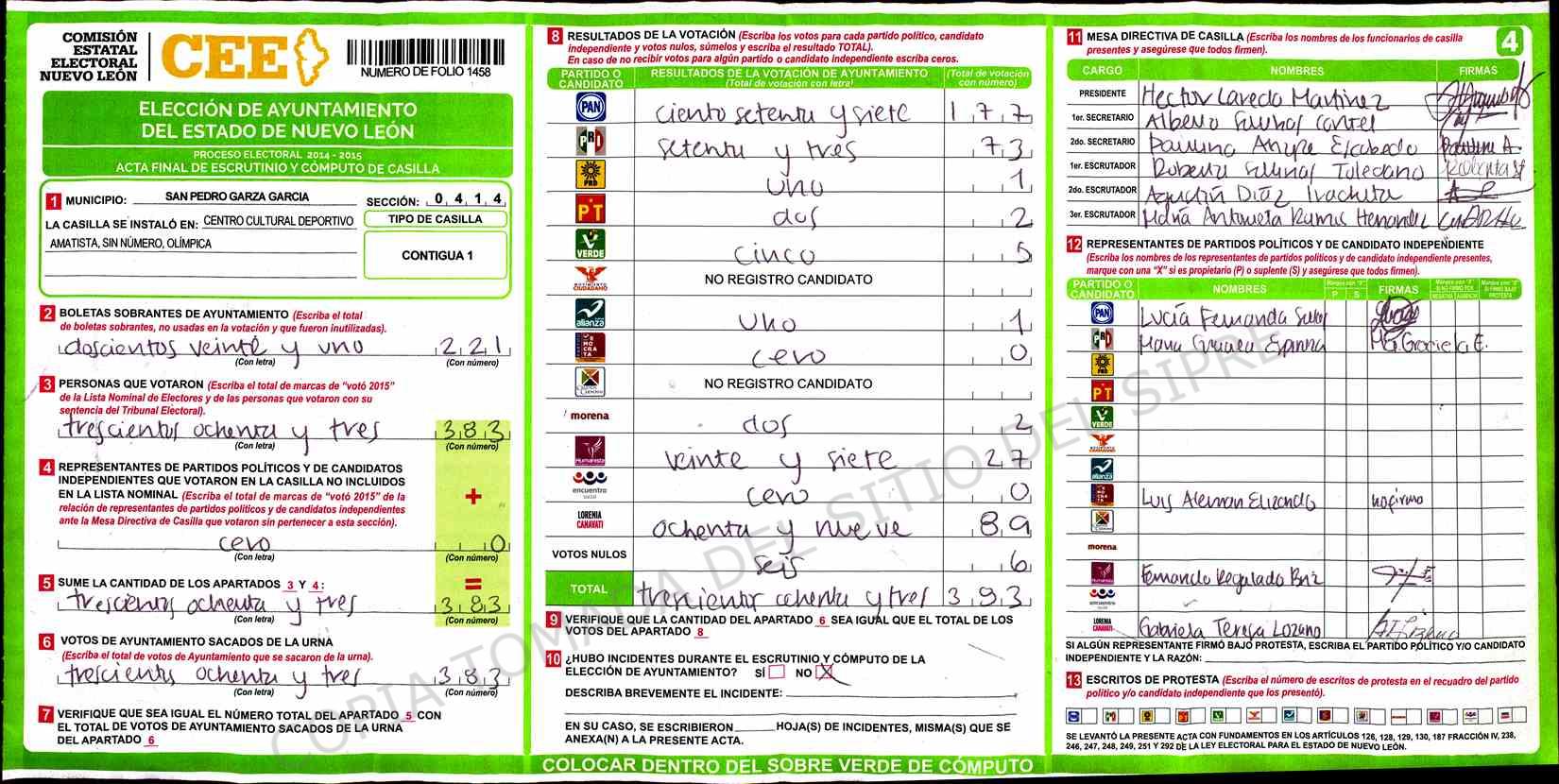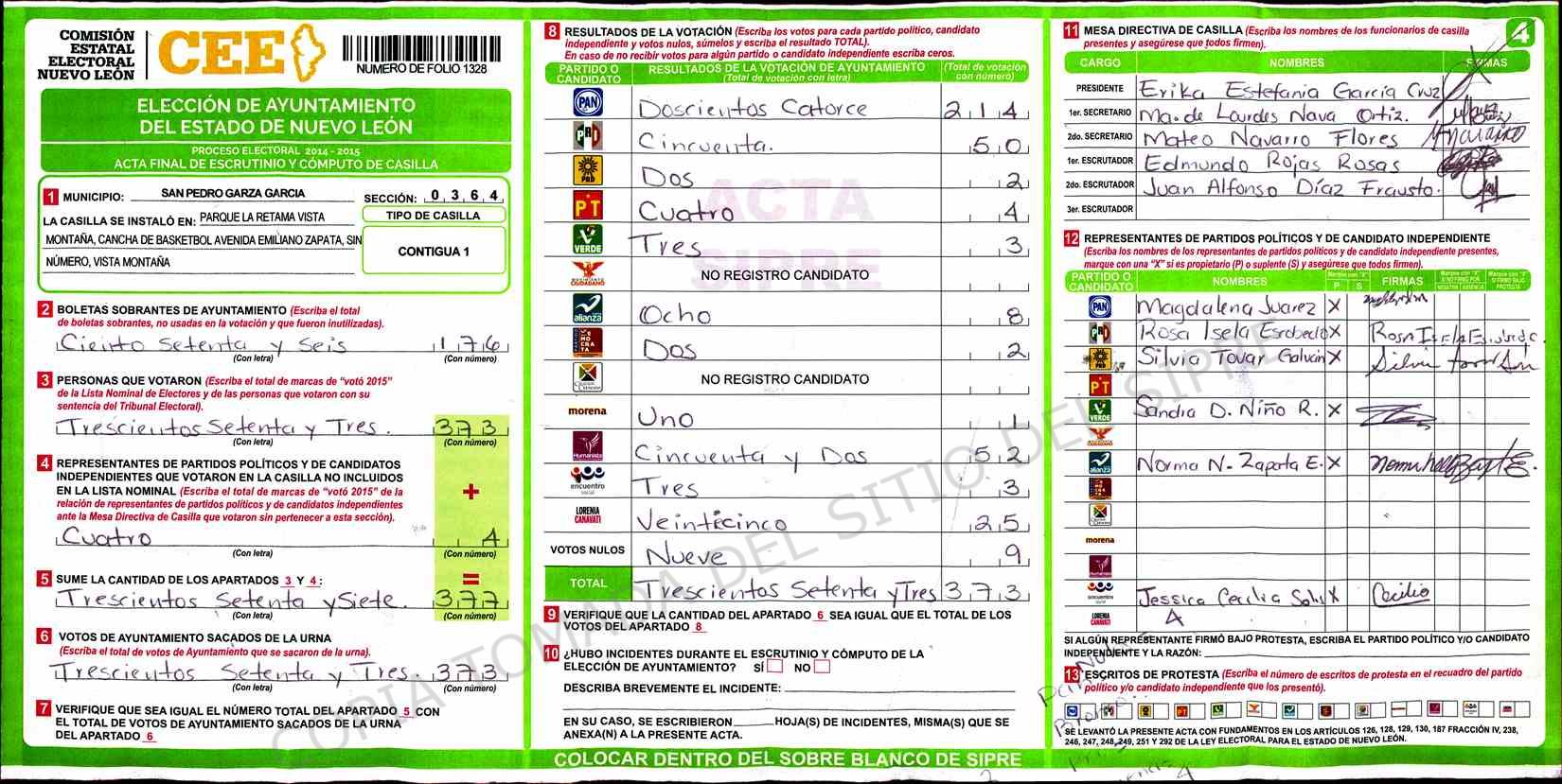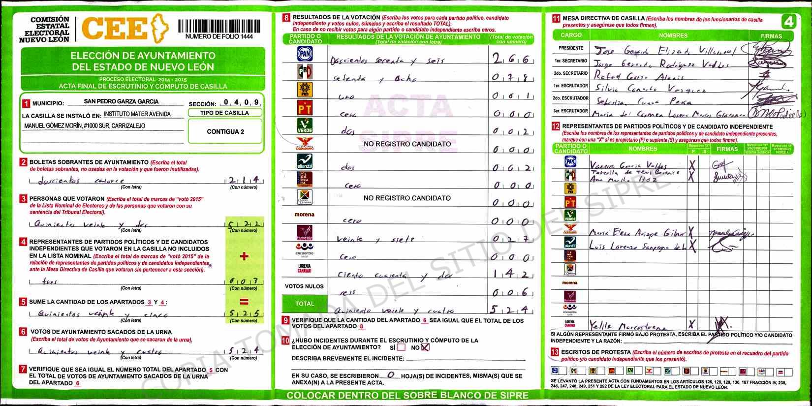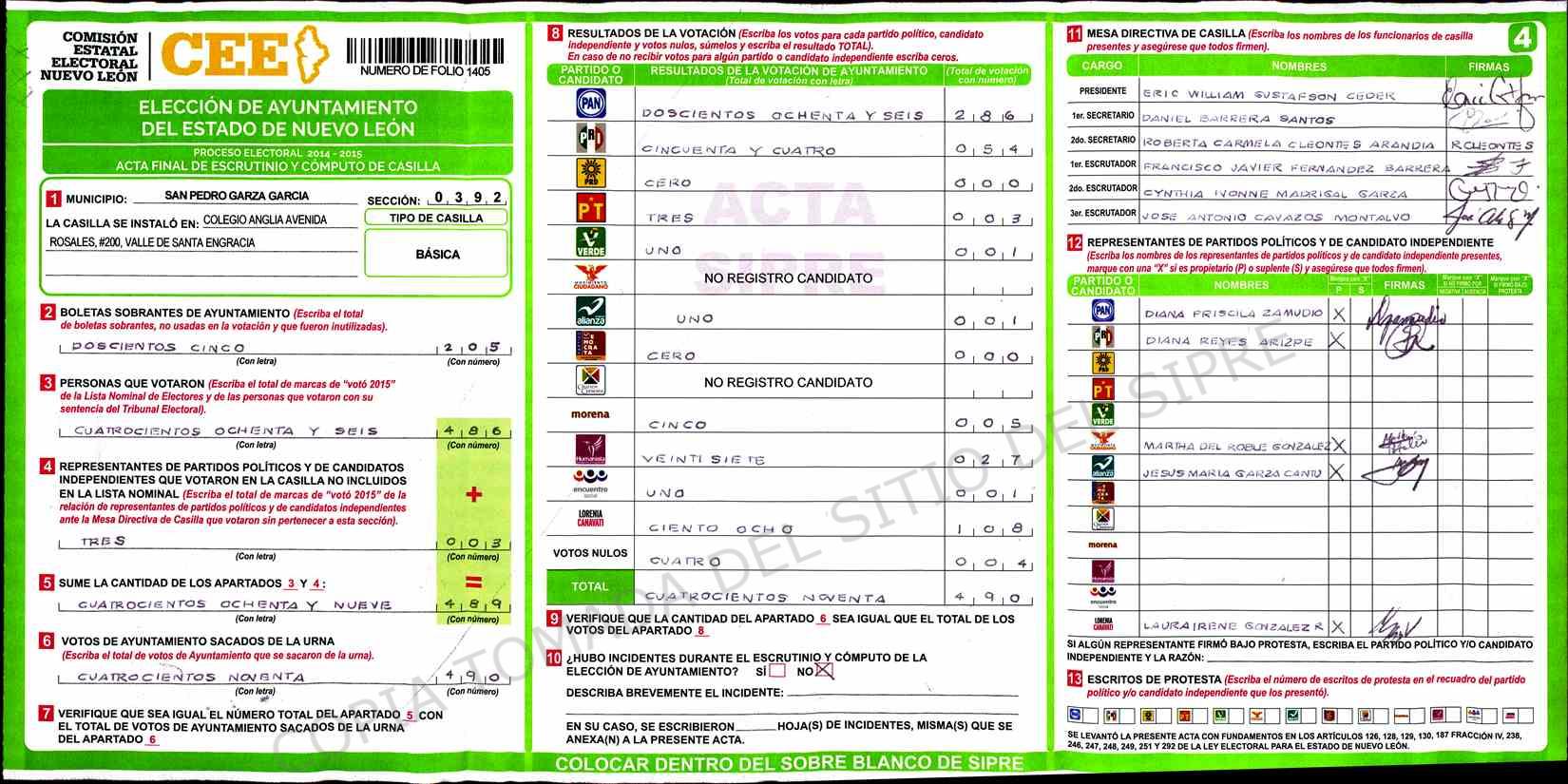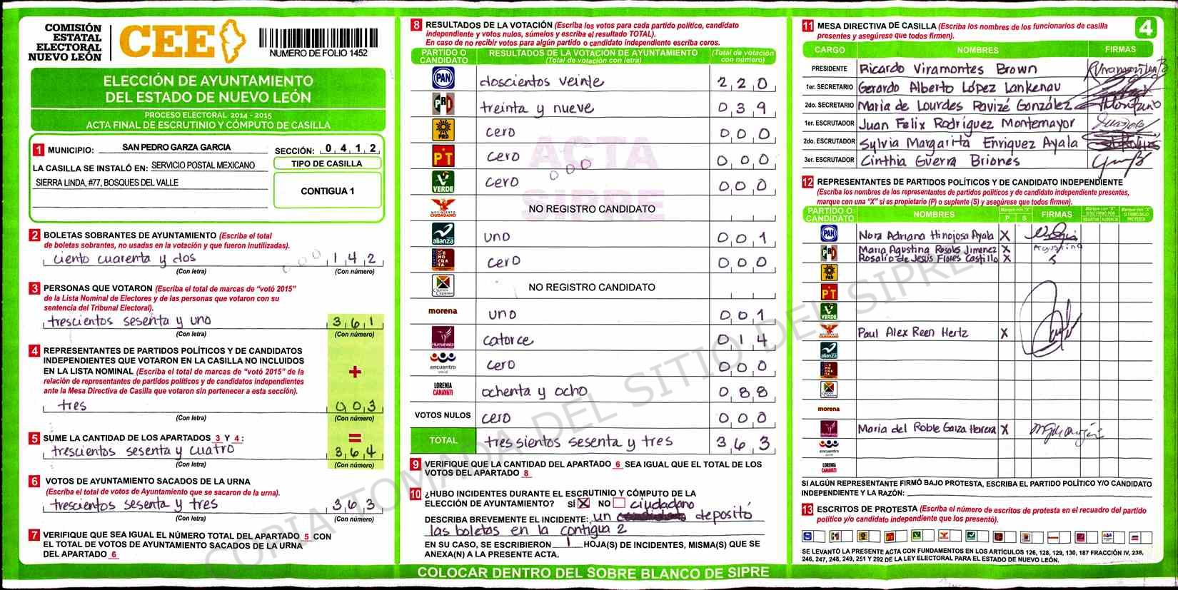 | Claves de Incidencia: | (1) Ilegible, (2) Mutilada, (3) Presenta Correcciones, (4) Presenta Borrones, (5) En Blanco, (6) Cifras Remarcadas, (7) Cifras de Mas, (8) Copiado Movido, (9) Con Signos Inválidos, (10) Excede Lista Nominal, (11) Otra |