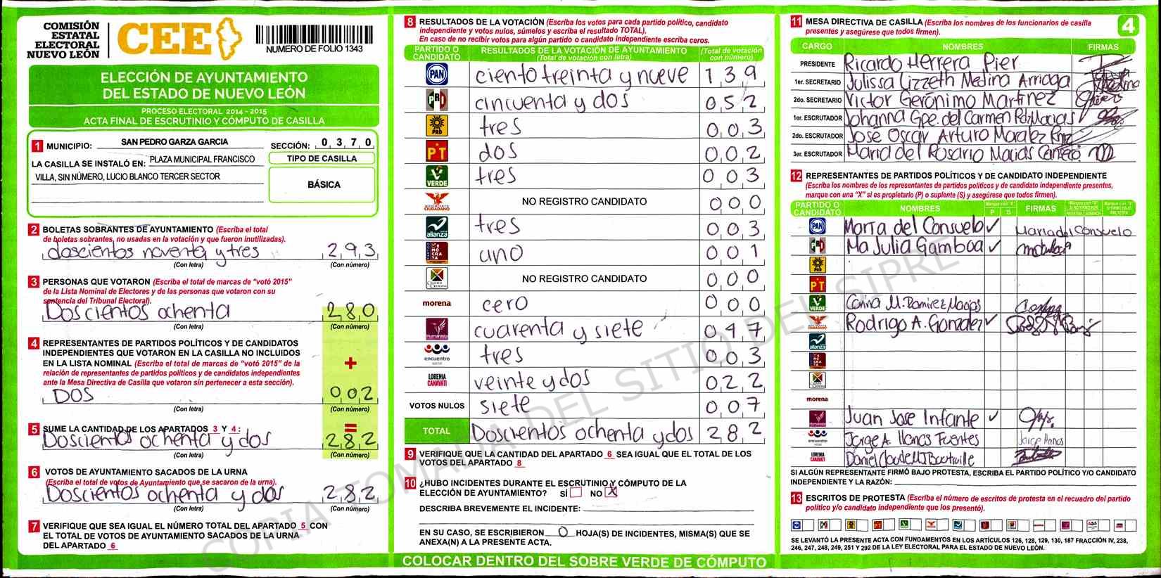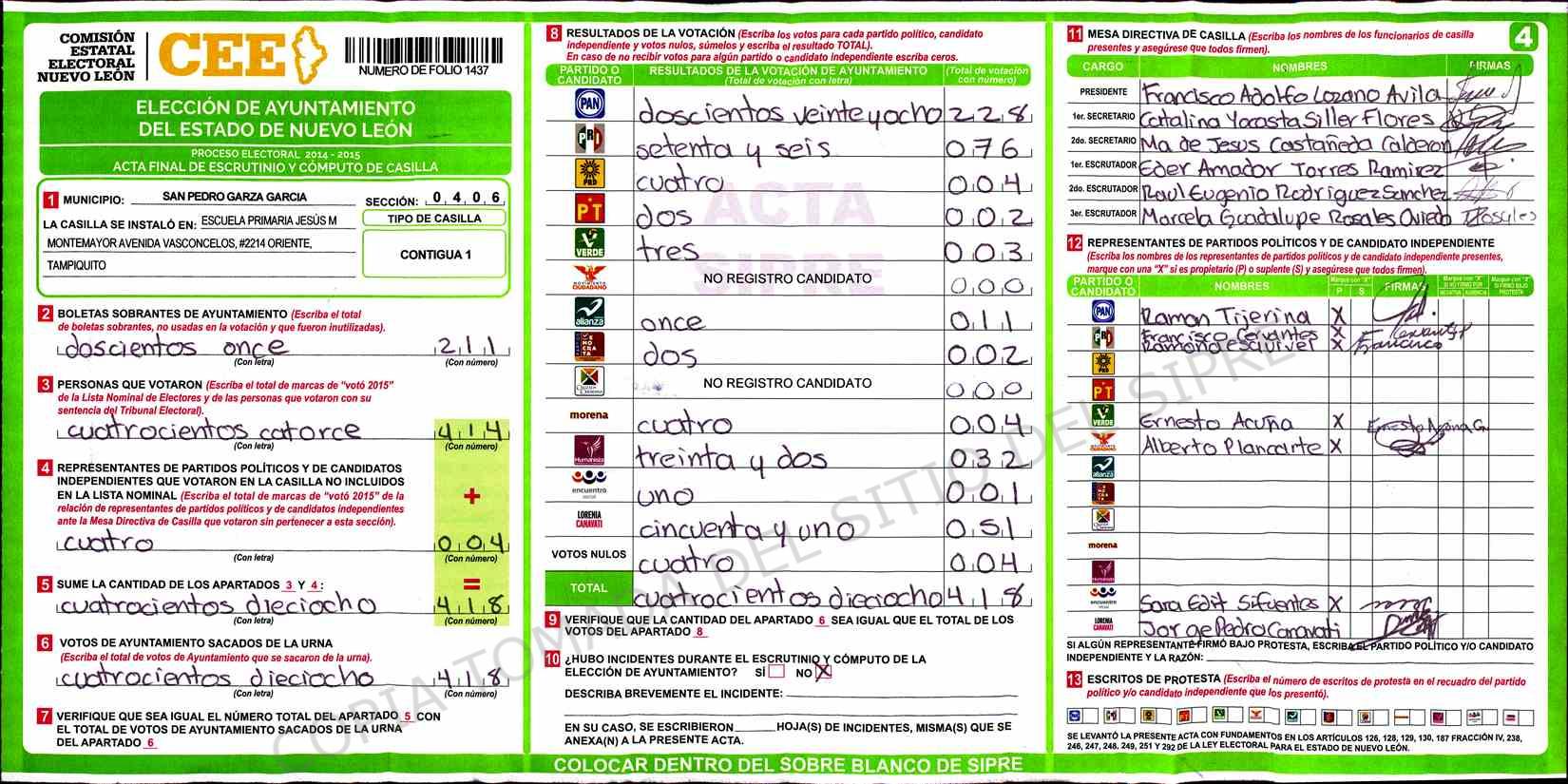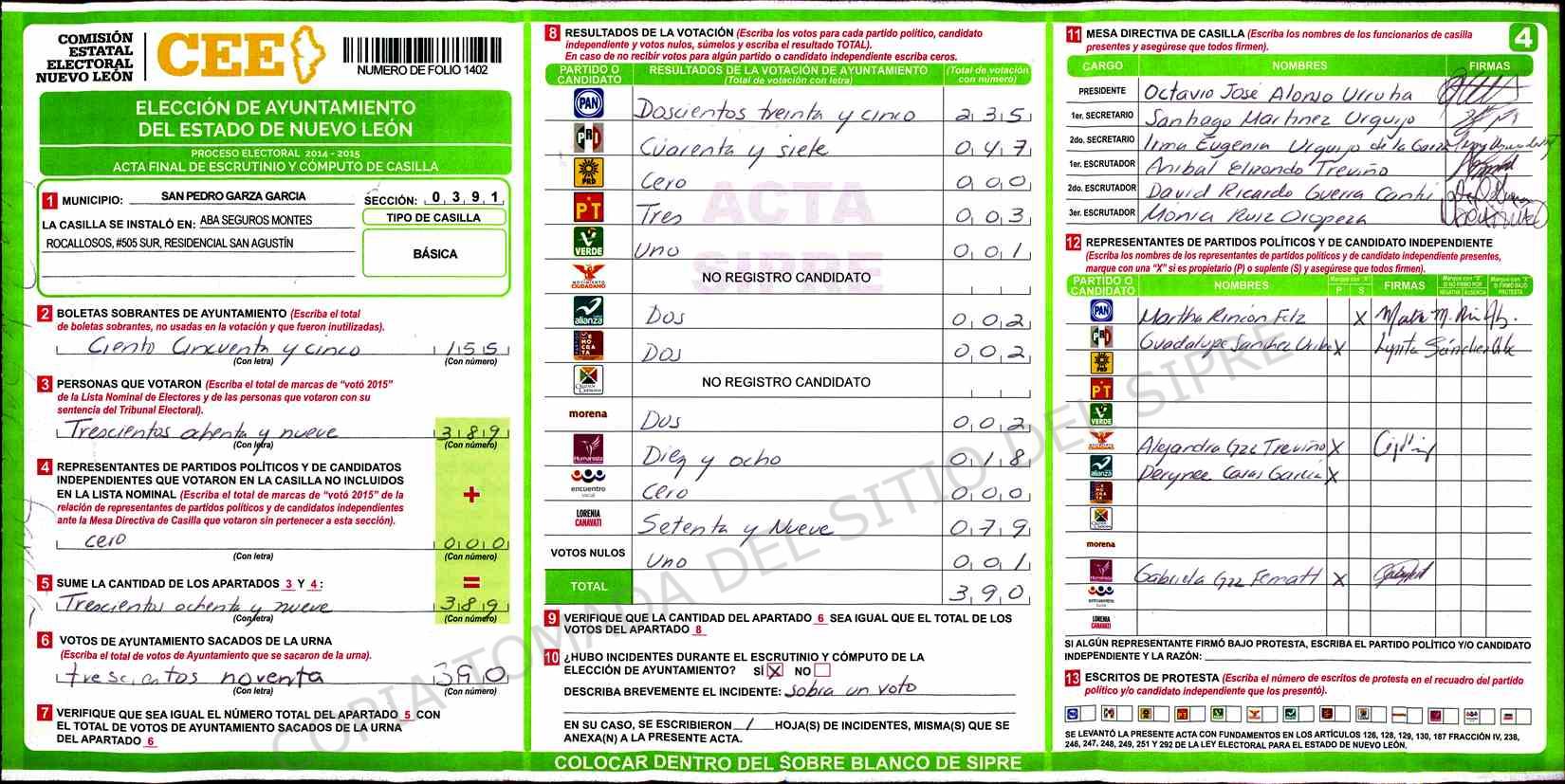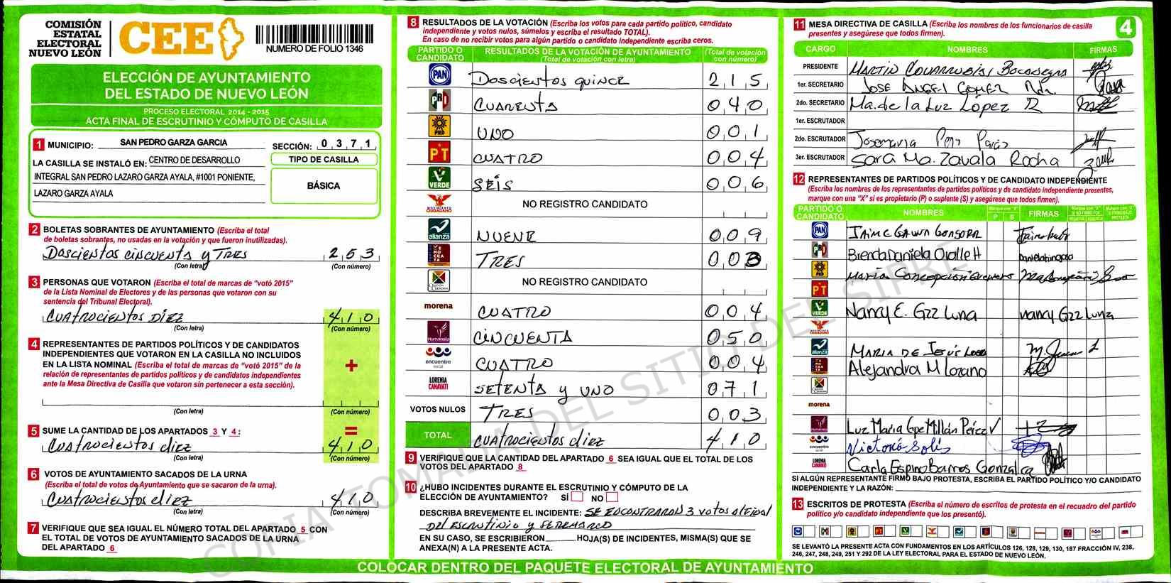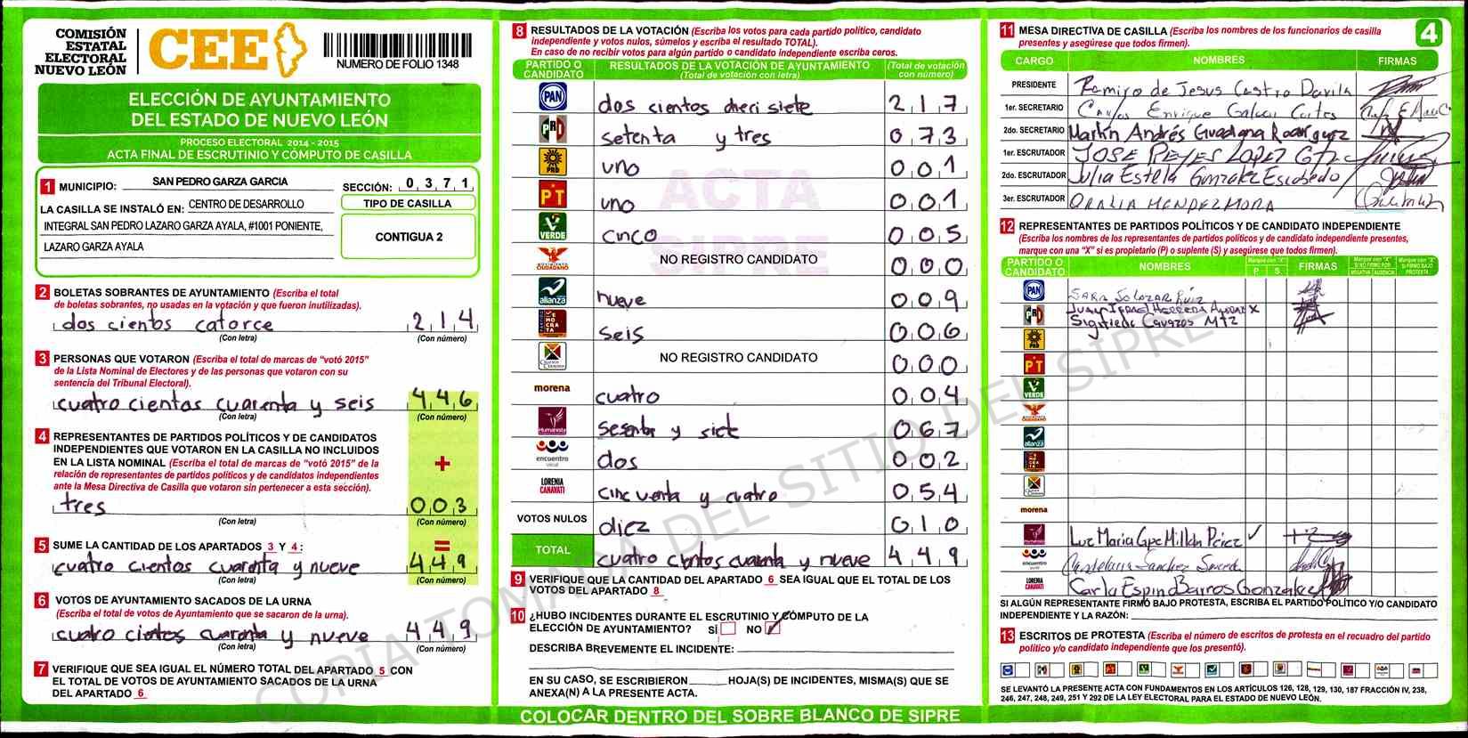 | Claves de Incidencia: | (1) Ilegible, (2) Mutilada, (3) Presenta Correcciones, (4) Presenta Borrones, (5) En Blanco, (6) Cifras Remarcadas, (7) Cifras de Mas, (8) Copiado Movido, (9) Con Signos Inválidos, (10) Excede Lista Nominal, (11) Otra |