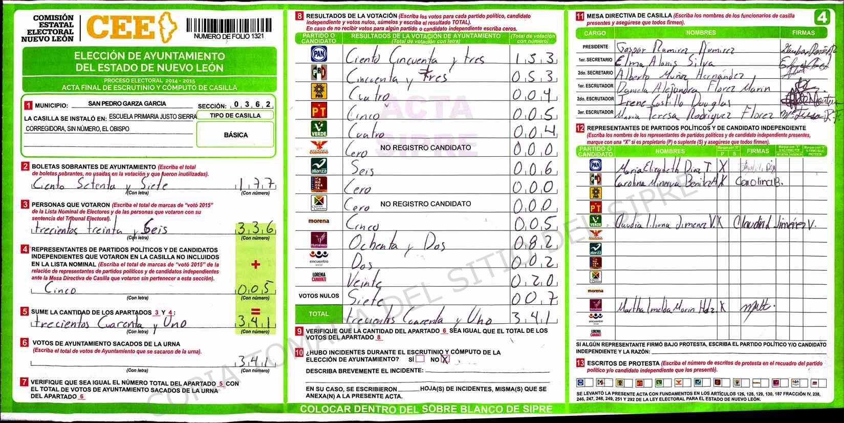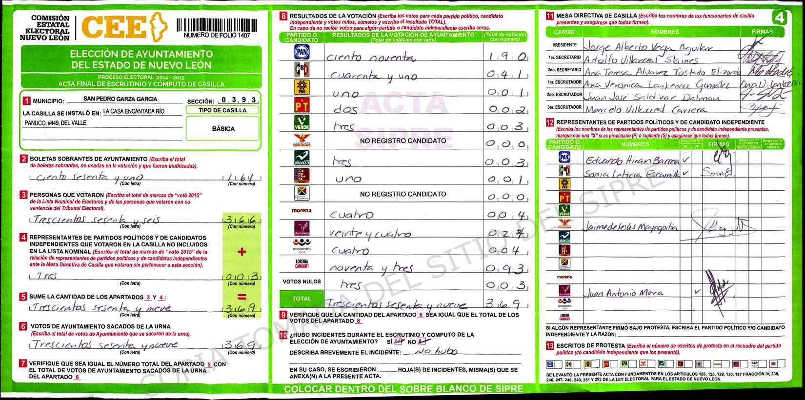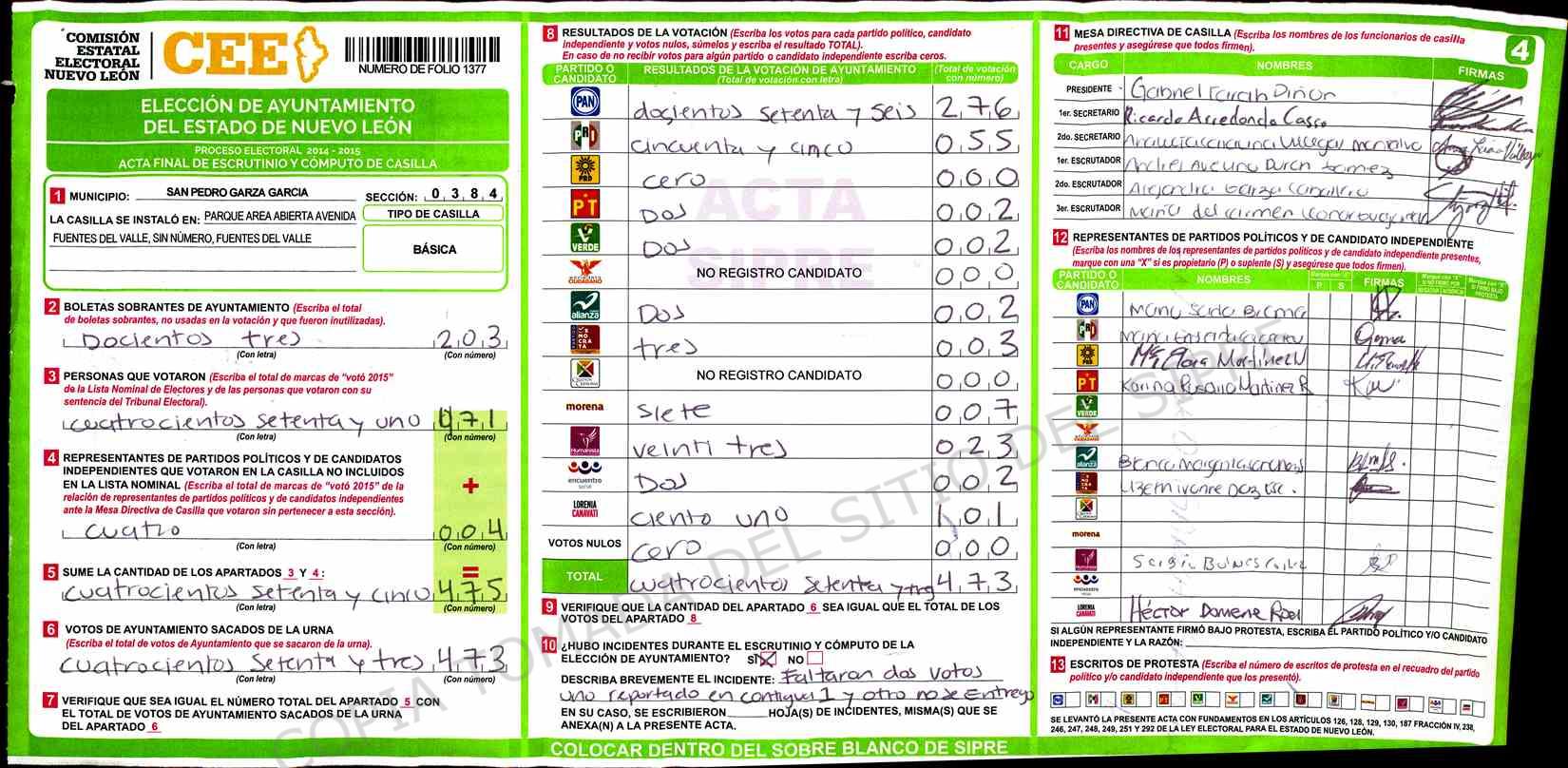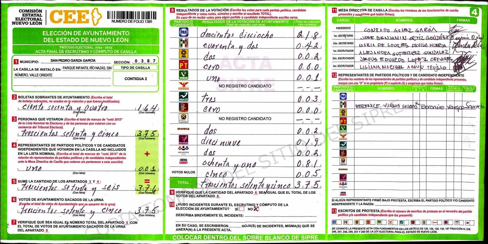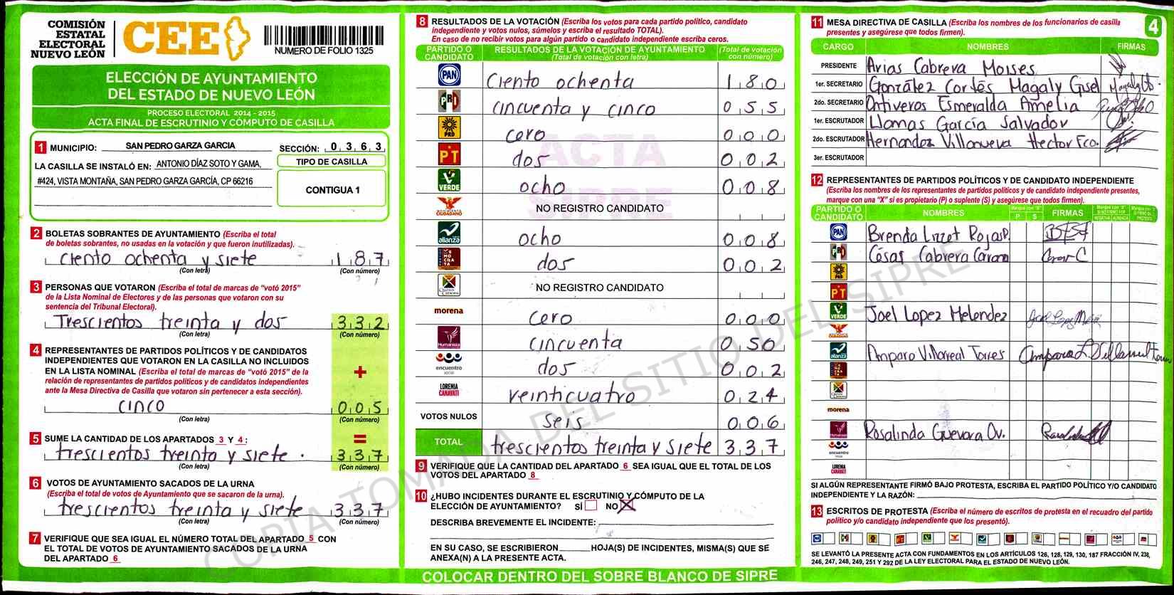 | Claves de Incidencia: | (1) Ilegible, (2) Mutilada, (3) Presenta Correcciones, (4) Presenta Borrones, (5) En Blanco, (6) Cifras Remarcadas, (7) Cifras de Mas, (8) Copiado Movido, (9) Con Signos Inválidos, (10) Excede Lista Nominal, (11) Otra |