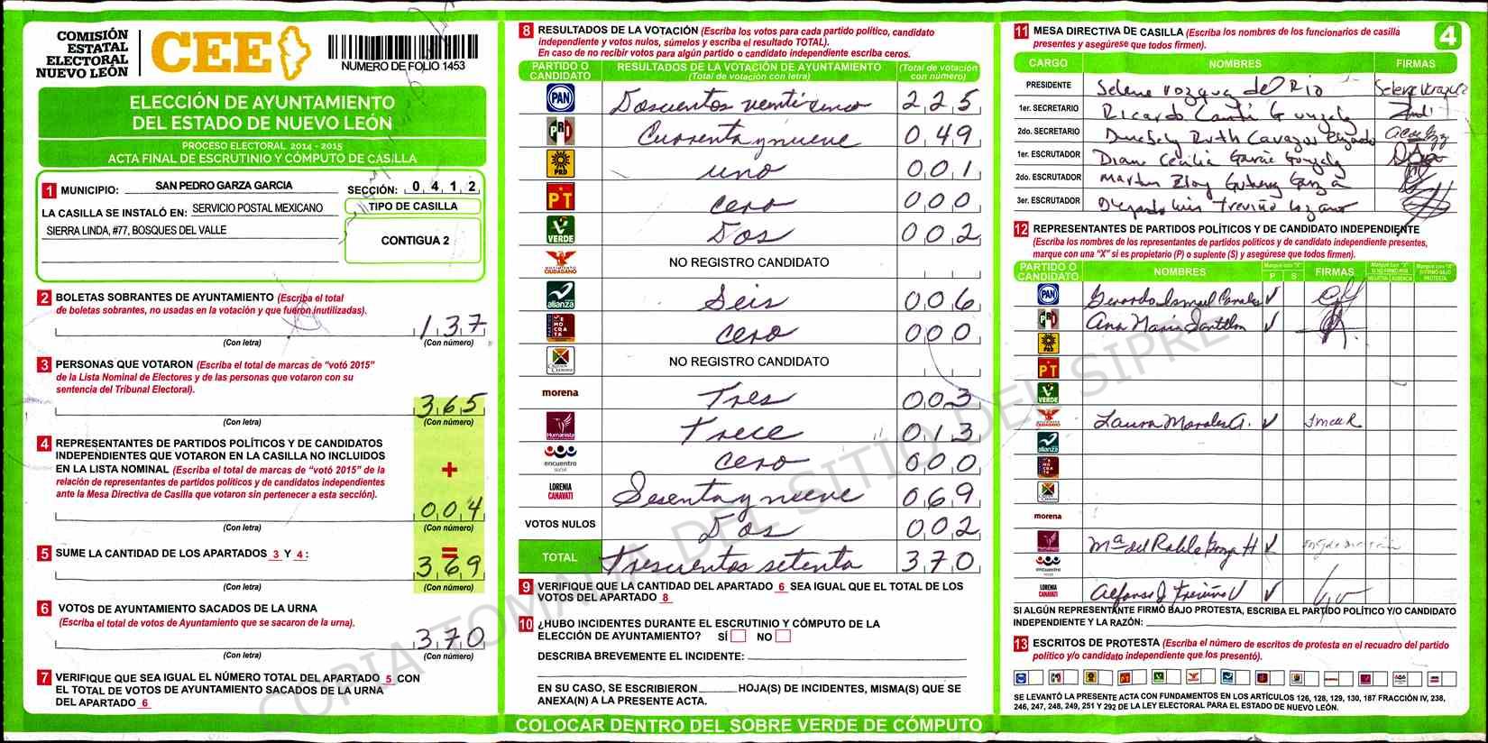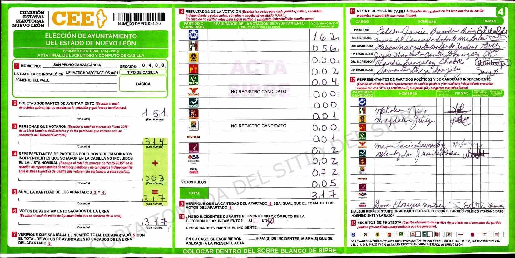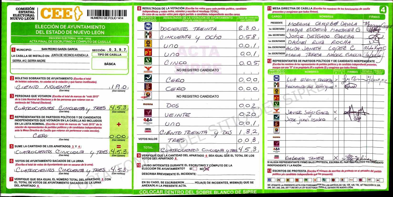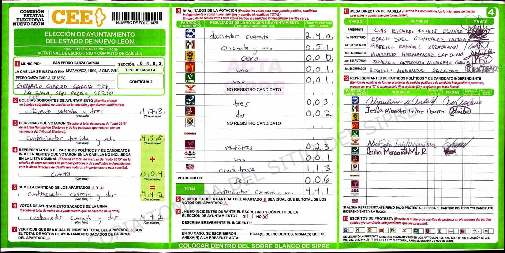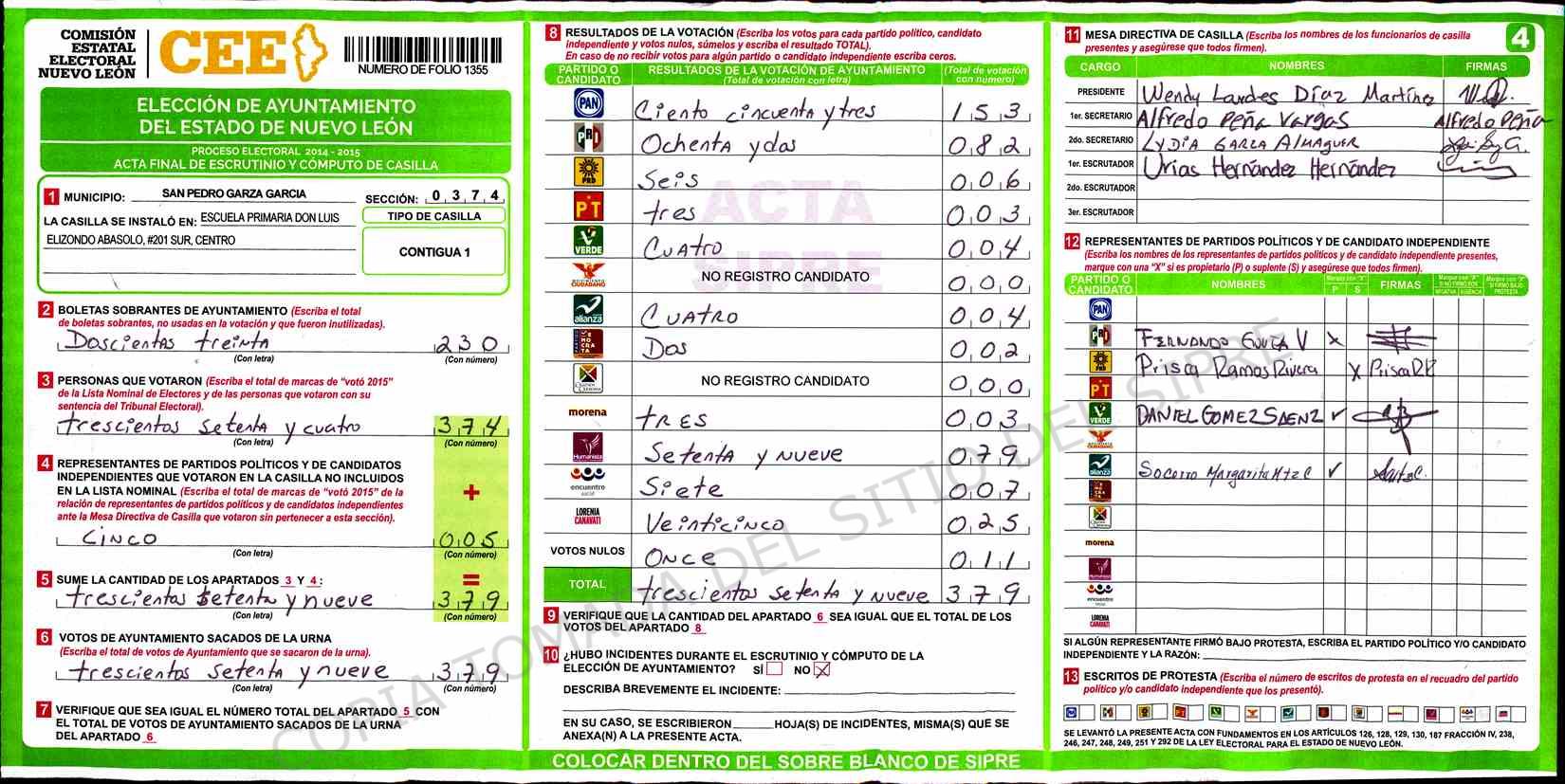 | Claves de Incidencia: | (1) Ilegible, (2) Mutilada, (3) Presenta Correcciones, (4) Presenta Borrones, (5) En Blanco, (6) Cifras Remarcadas, (7) Cifras de Mas, (8) Copiado Movido, (9) Con Signos Inválidos, (10) Excede Lista Nominal, (11) Otra |