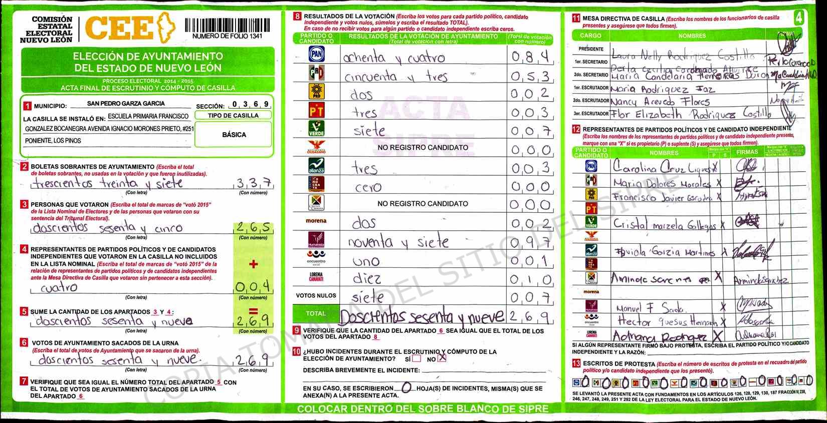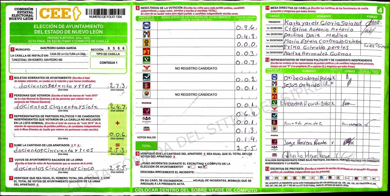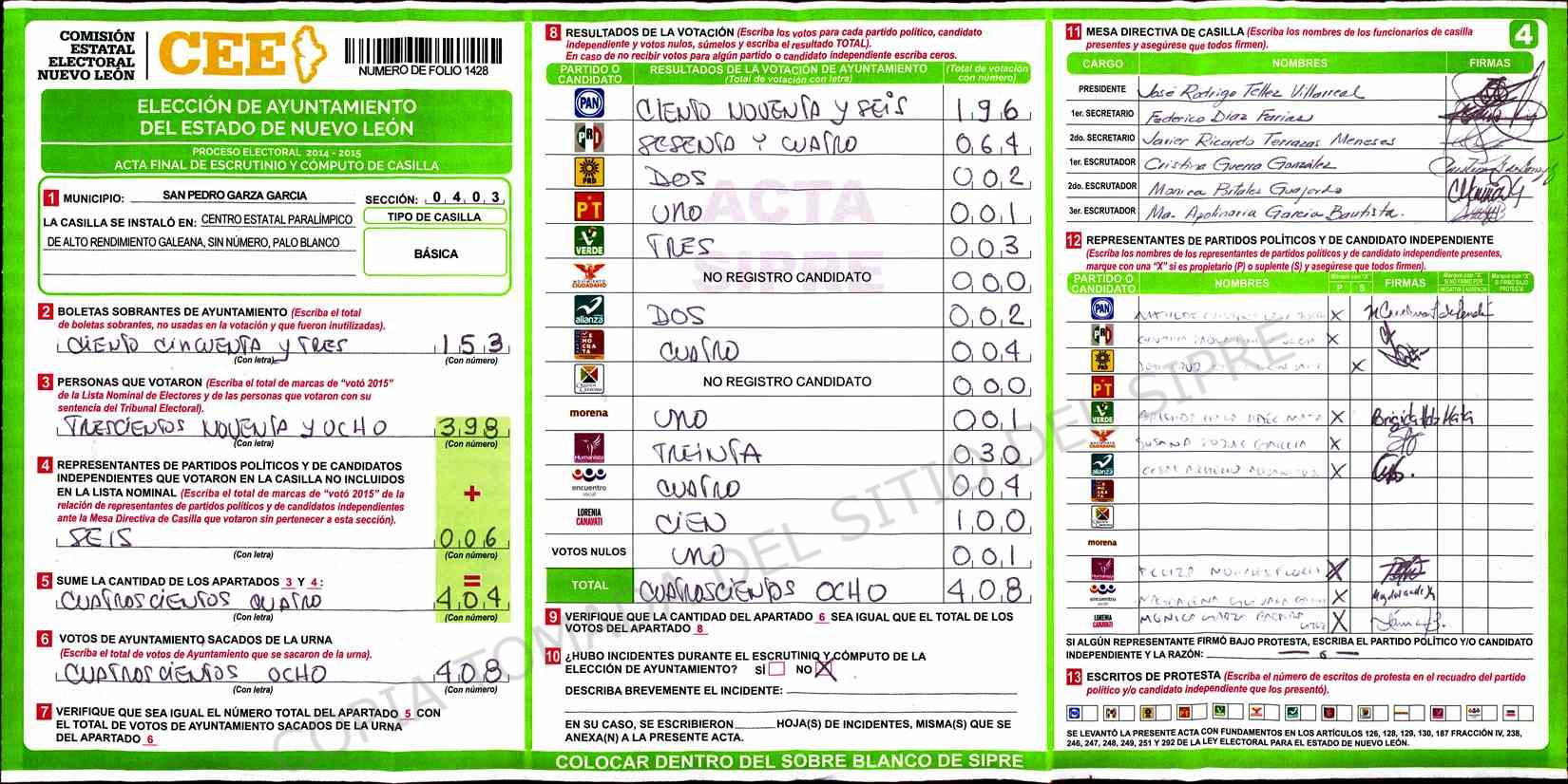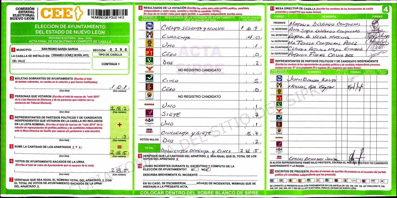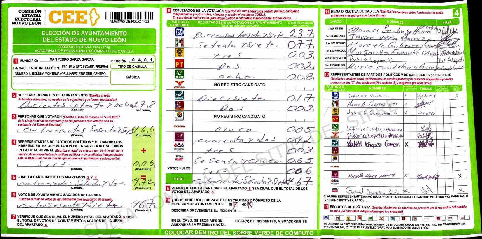 | Claves de Incidencia: | (1) Ilegible, (2) Mutilada, (3) Presenta Correcciones, (4) Presenta Borrones, (5) En Blanco, (6) Cifras Remarcadas, (7) Cifras de Mas, (8) Copiado Movido, (9) Con Signos Inválidos, (10) Excede Lista Nominal, (11) Otra |