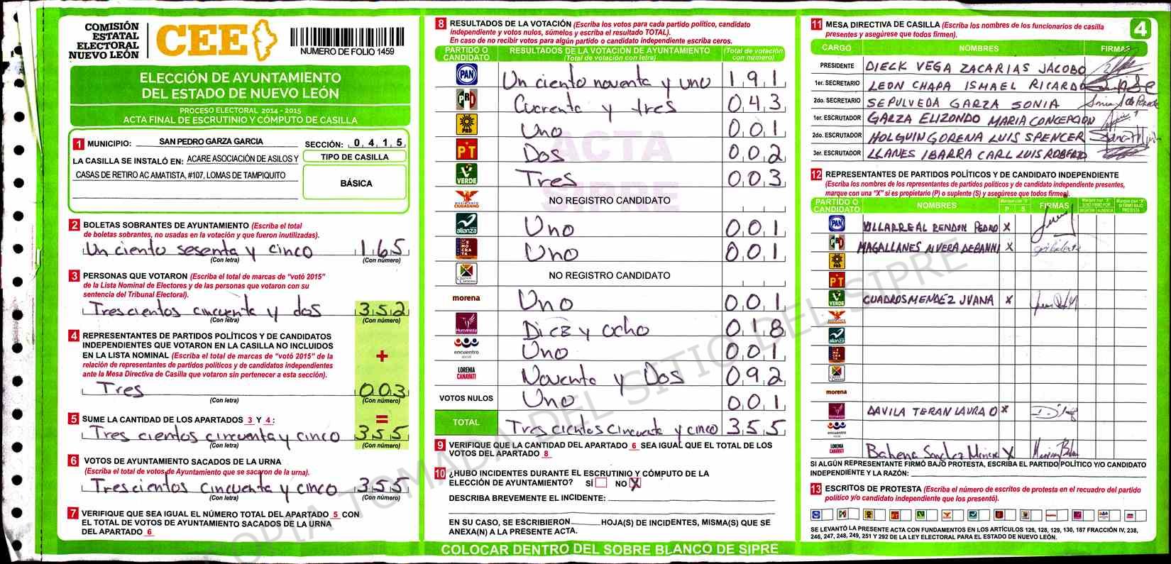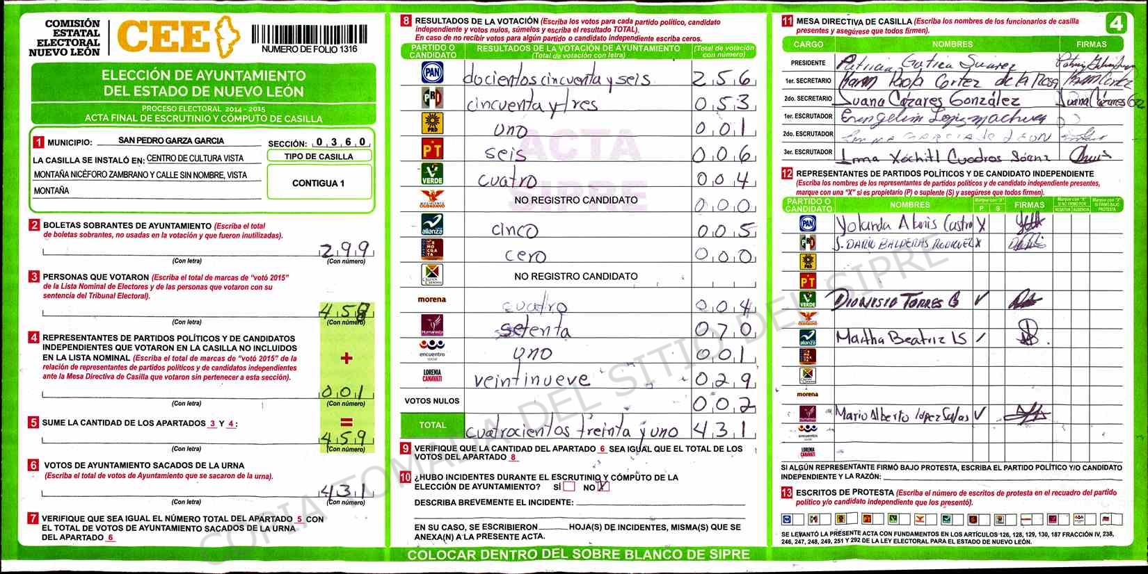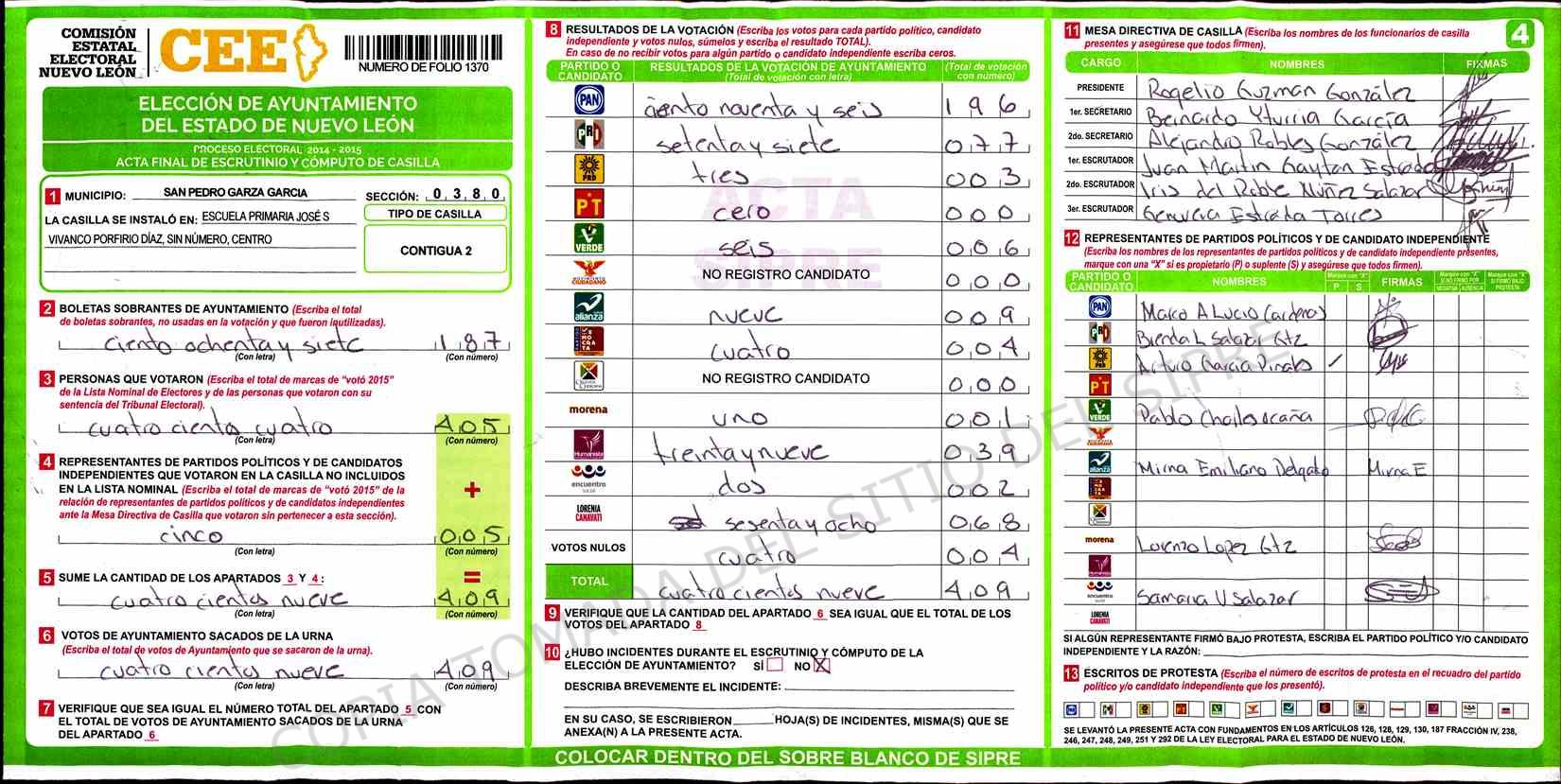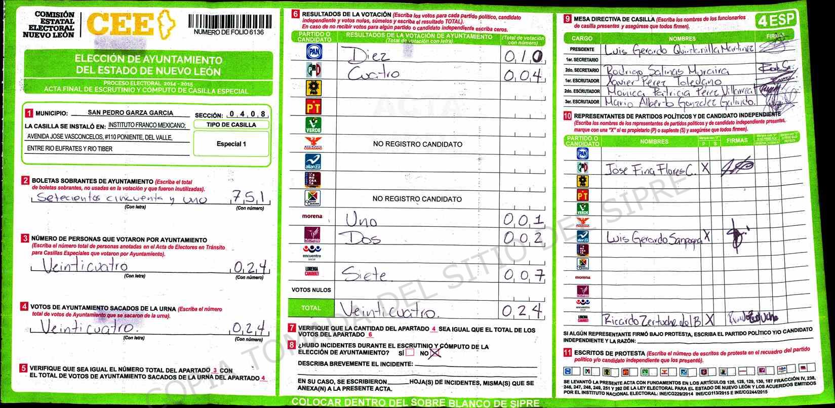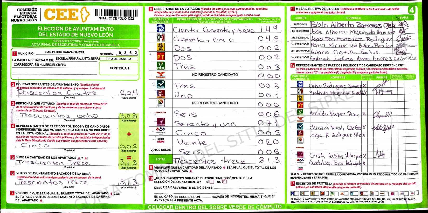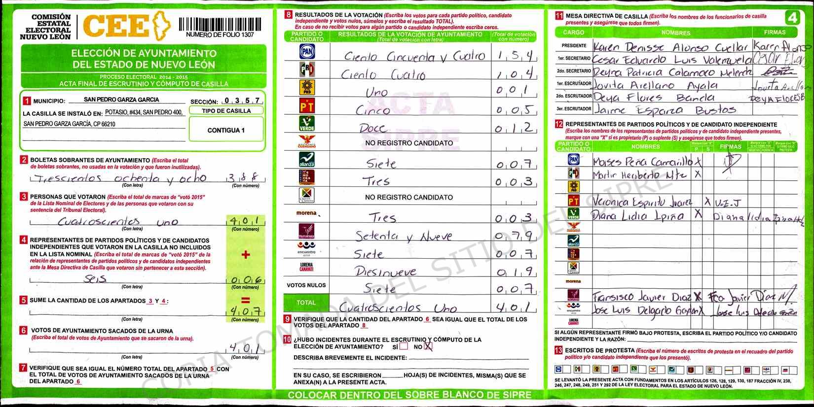 | Claves de Incidencia: | (1) Ilegible, (2) Mutilada, (3) Presenta Correcciones, (4) Presenta Borrones, (5) En Blanco, (6) Cifras Remarcadas, (7) Cifras de Mas, (8) Copiado Movido, (9) Con Signos Inválidos, (10) Excede Lista Nominal, (11) Otra |