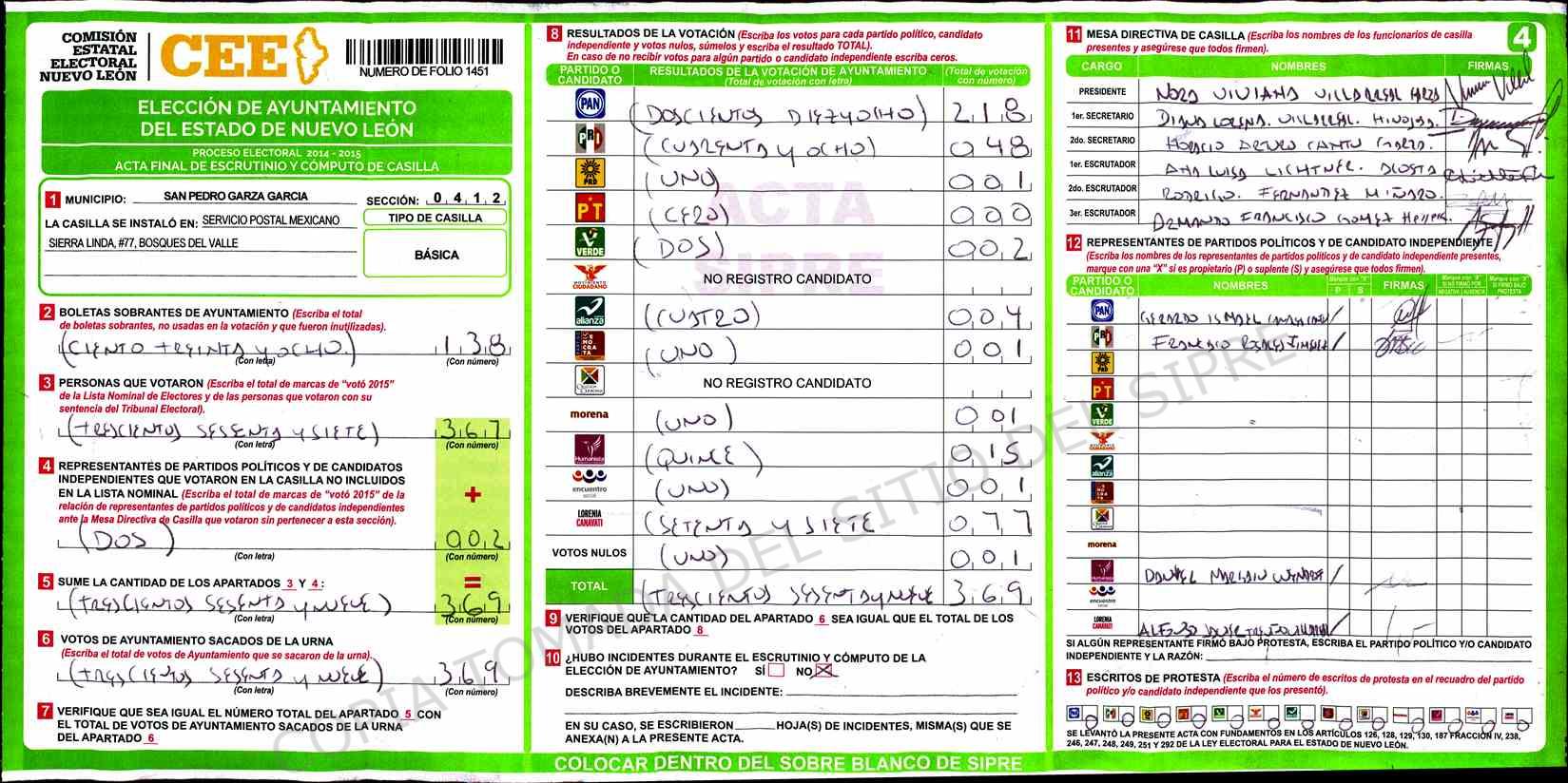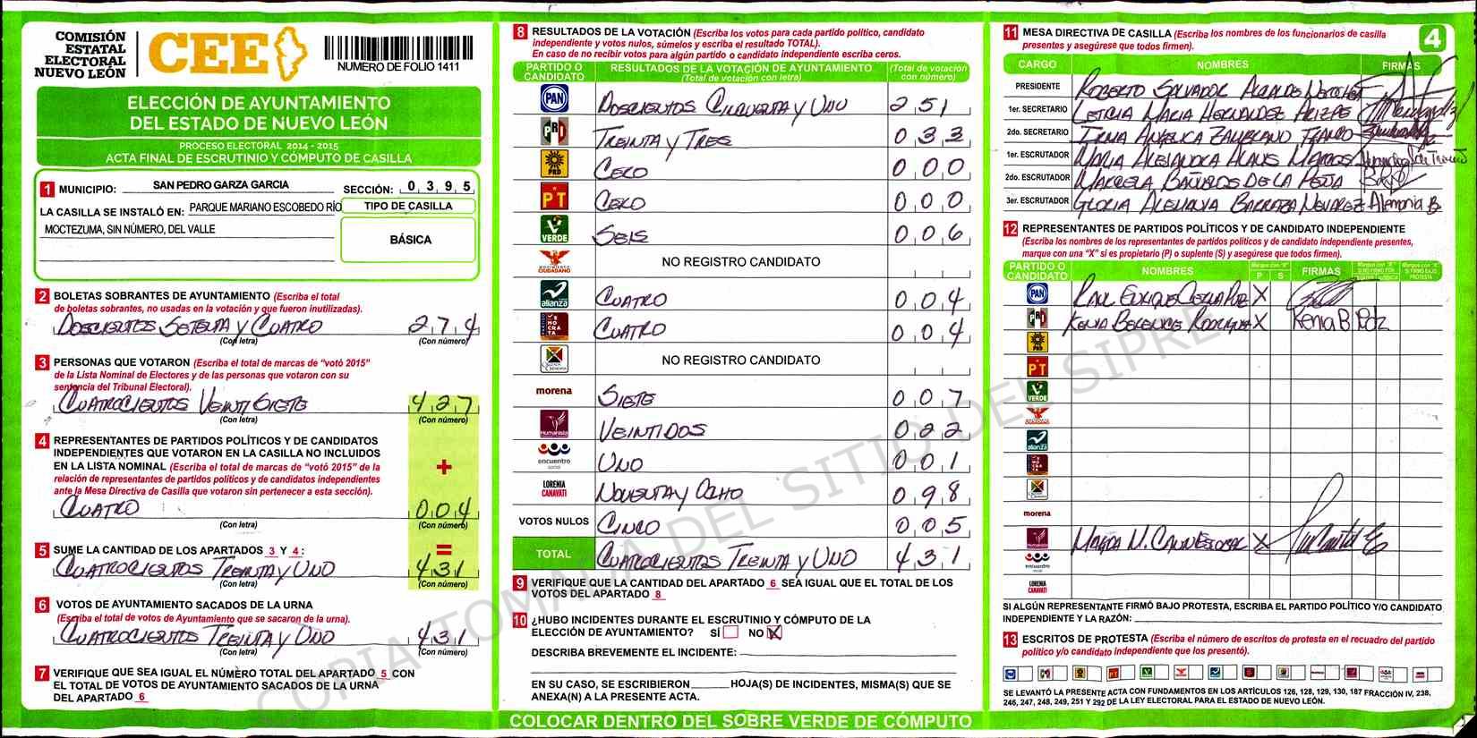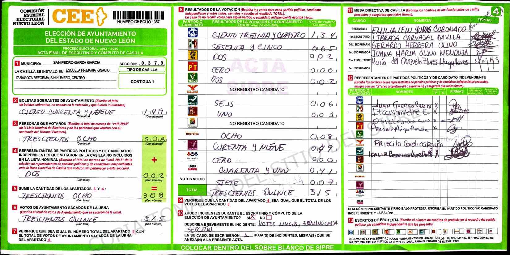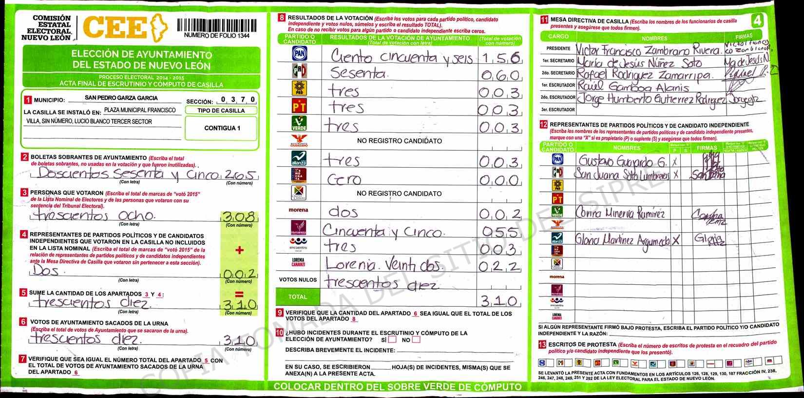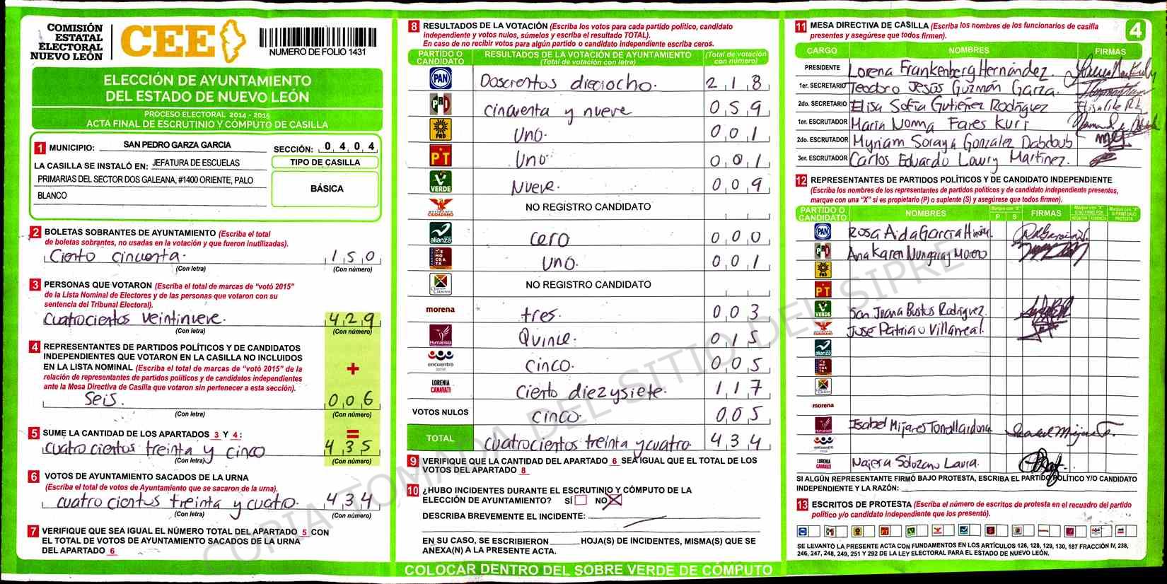 | Claves de Incidencia: | (1) Ilegible, (2) Mutilada, (3) Presenta Correcciones, (4) Presenta Borrones, (5) En Blanco, (6) Cifras Remarcadas, (7) Cifras de Mas, (8) Copiado Movido, (9) Con Signos Inválidos, (10) Excede Lista Nominal, (11) Otra |