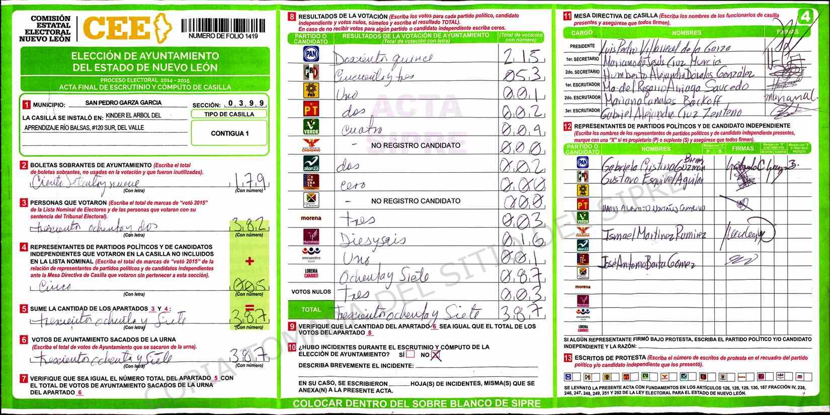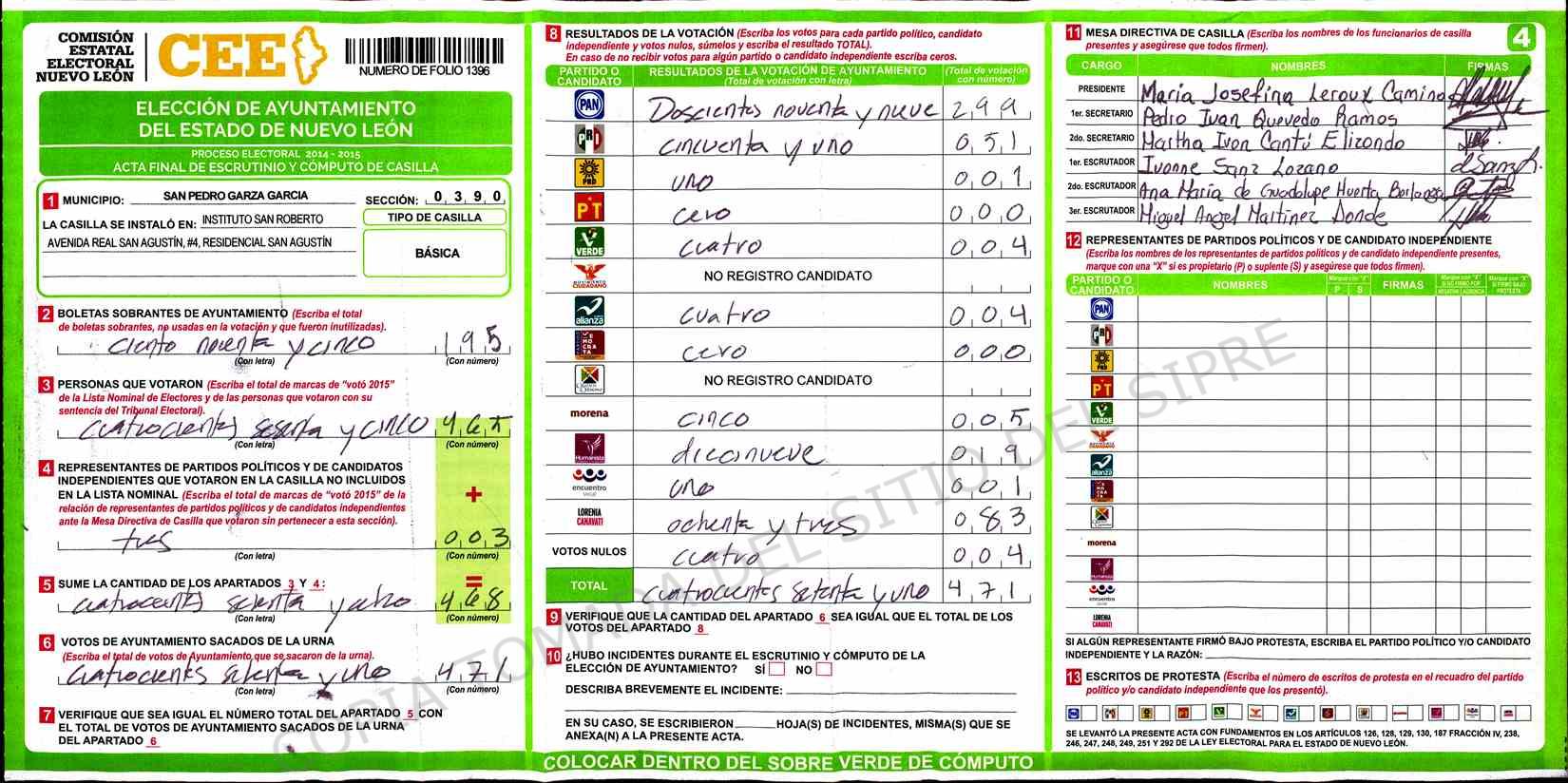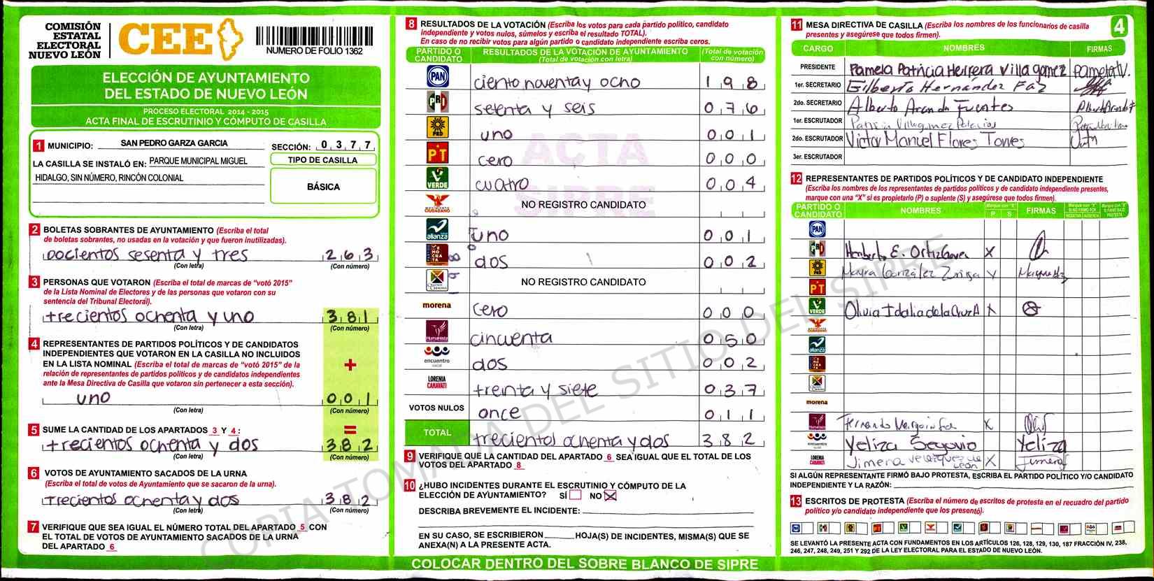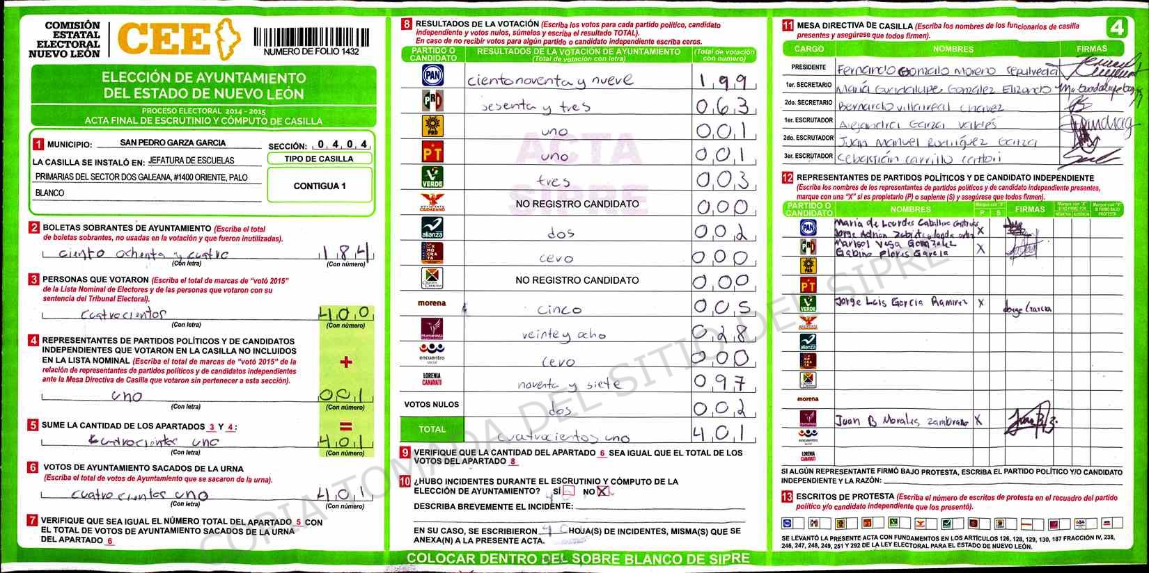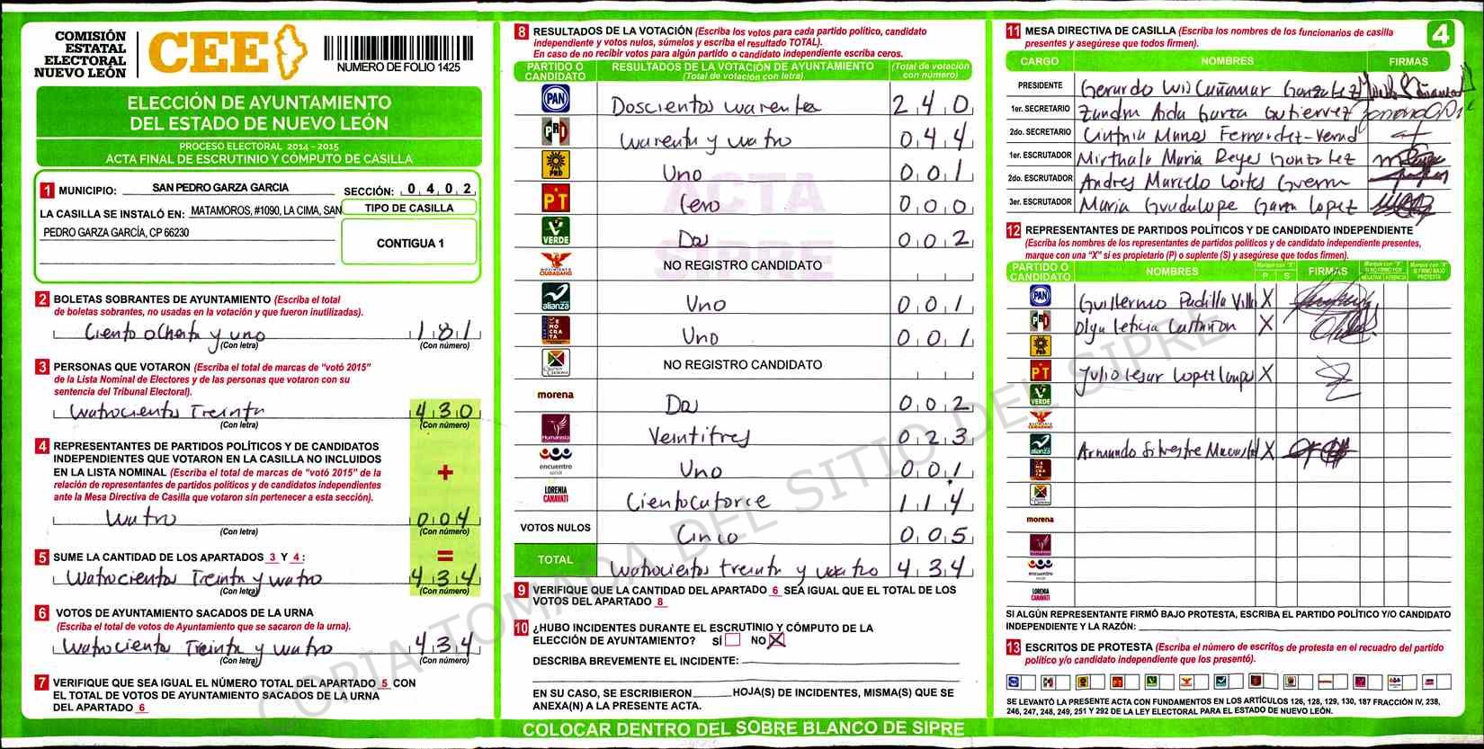 | Claves de Incidencia: | (1) Ilegible, (2) Mutilada, (3) Presenta Correcciones, (4) Presenta Borrones, (5) En Blanco, (6) Cifras Remarcadas, (7) Cifras de Mas, (8) Copiado Movido, (9) Con Signos Inválidos, (10) Excede Lista Nominal, (11) Otra |