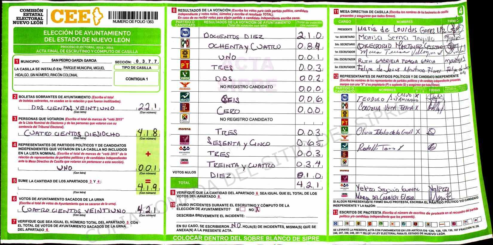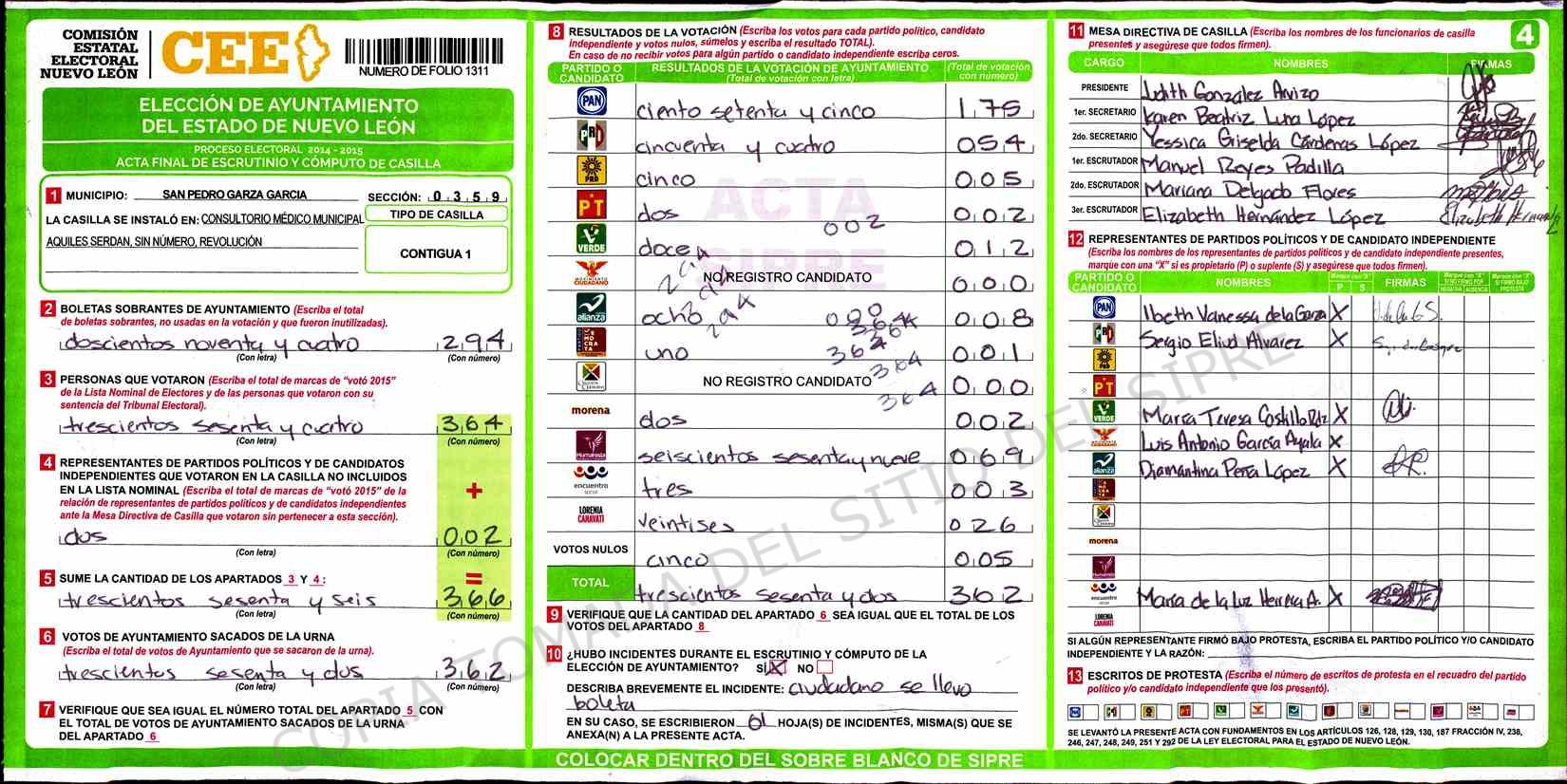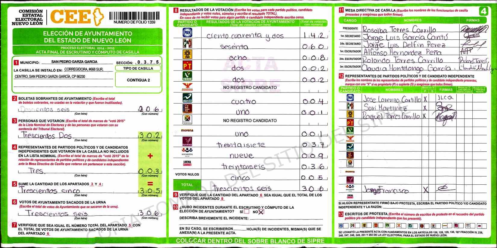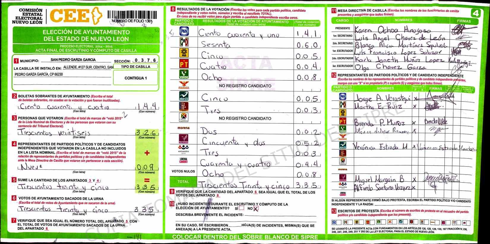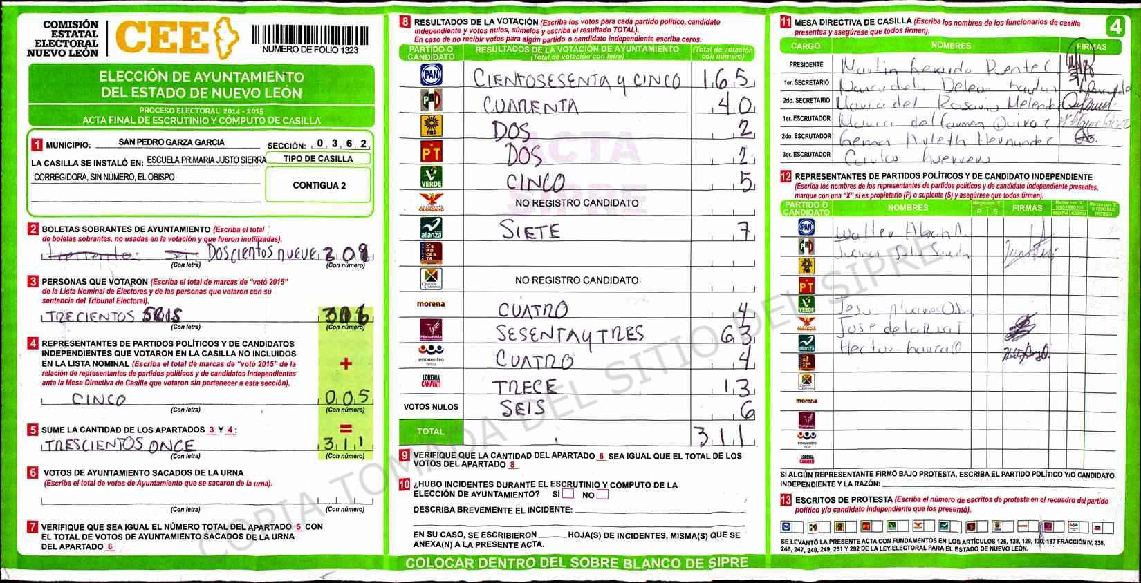 | Claves de Incidencia: | (1) Ilegible, (2) Mutilada, (3) Presenta Correcciones, (4) Presenta Borrones, (5) En Blanco, (6) Cifras Remarcadas, (7) Cifras de Mas, (8) Copiado Movido, (9) Con Signos Inválidos, (10) Excede Lista Nominal, (11) Otra |