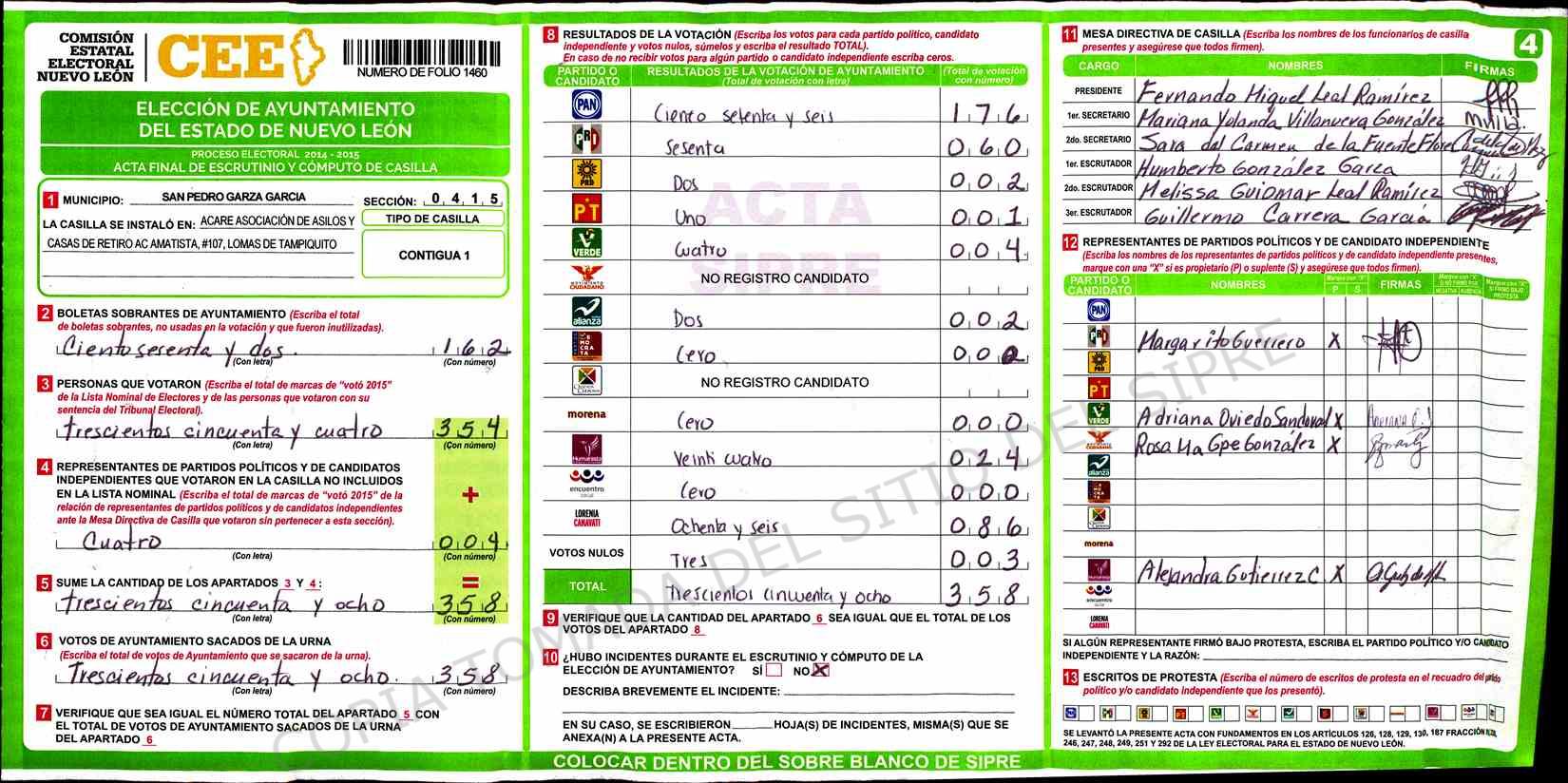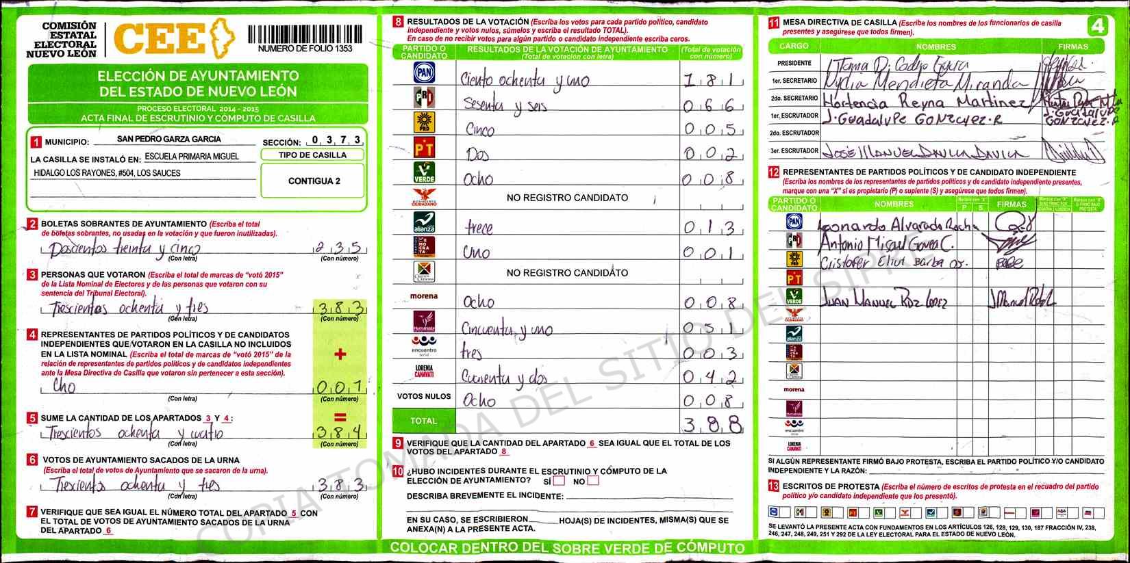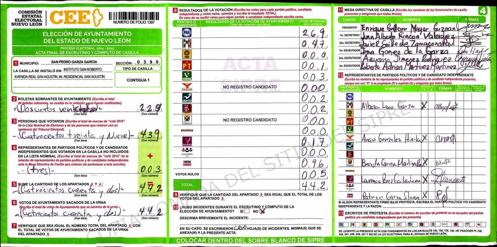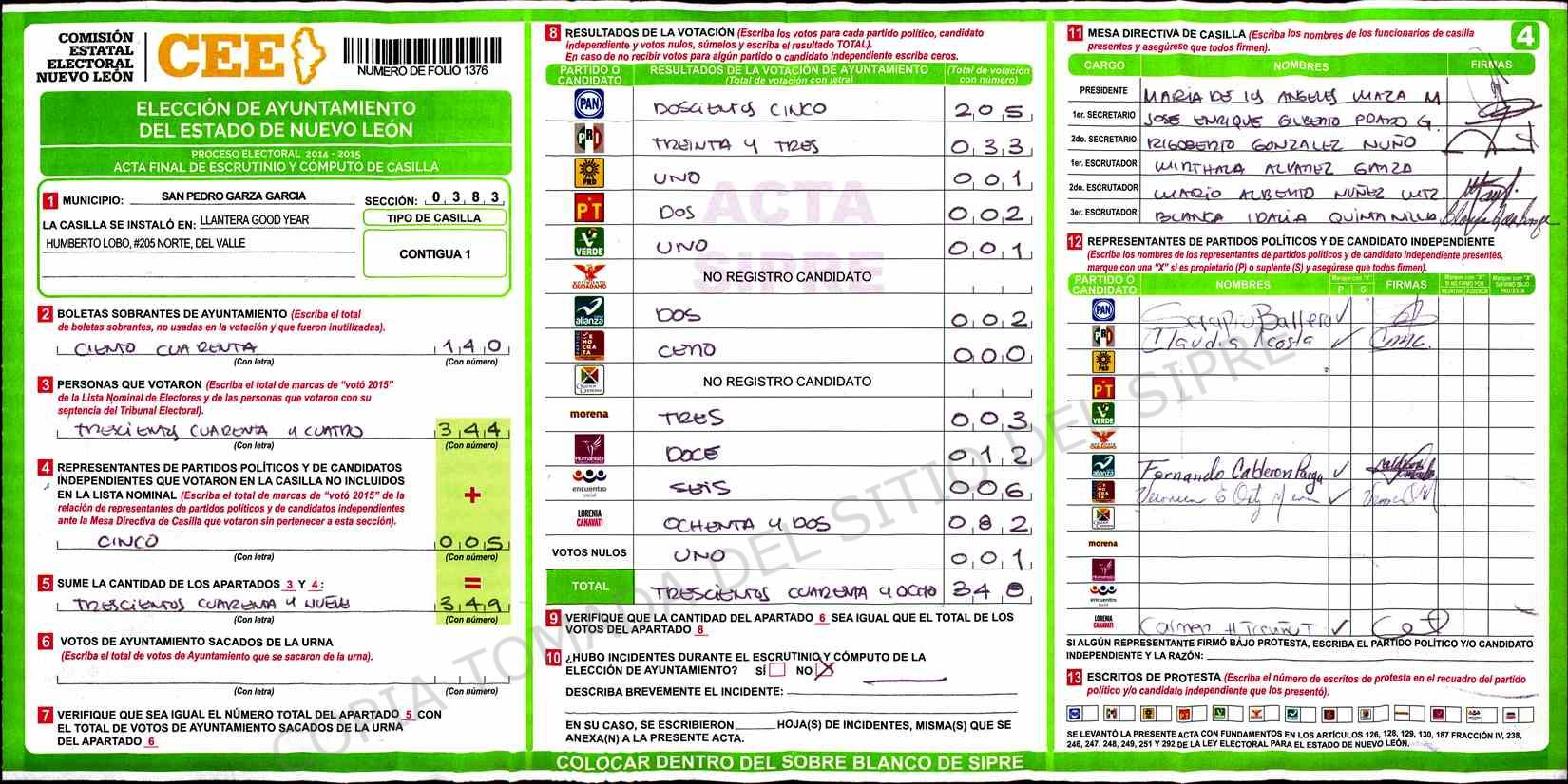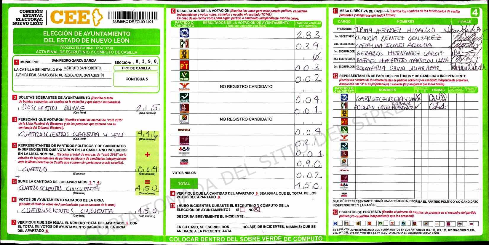 | Claves de Incidencia: | (1) Ilegible, (2) Mutilada, (3) Presenta Correcciones, (4) Presenta Borrones, (5) En Blanco, (6) Cifras Remarcadas, (7) Cifras de Mas, (8) Copiado Movido, (9) Con Signos Inválidos, (10) Excede Lista Nominal, (11) Otra |