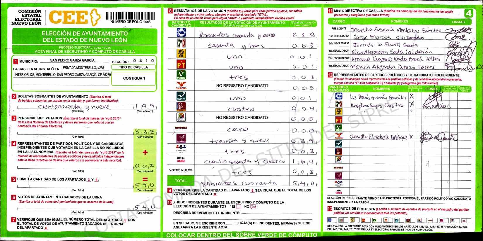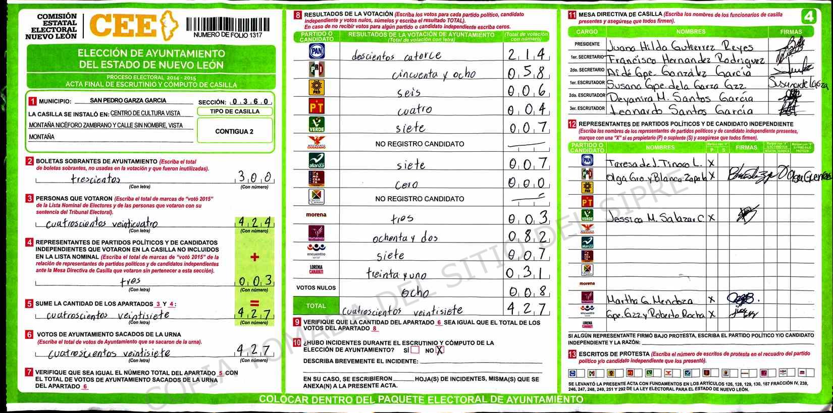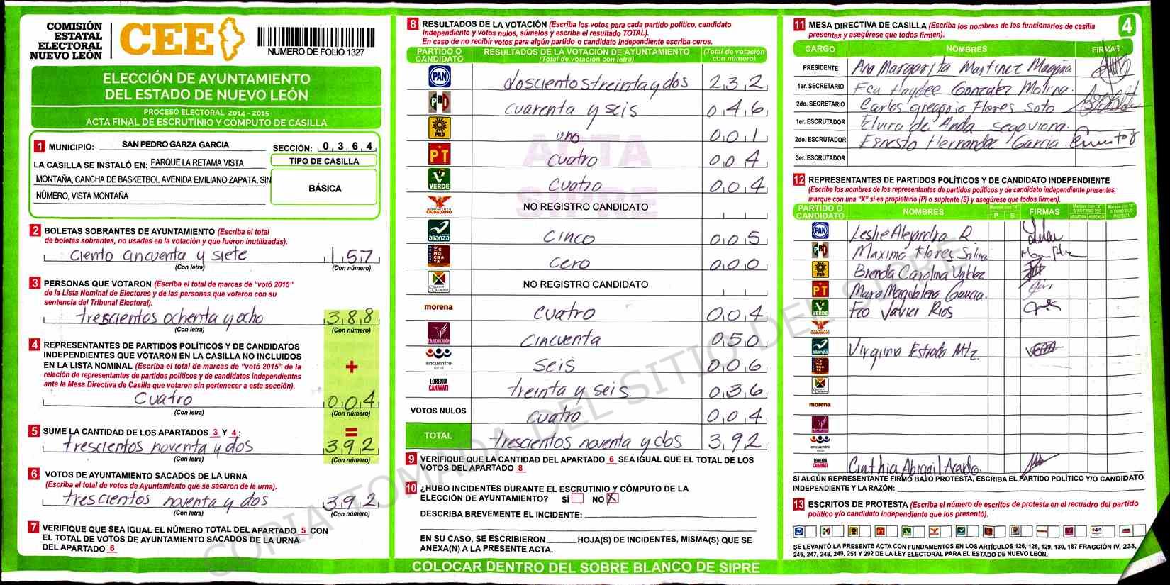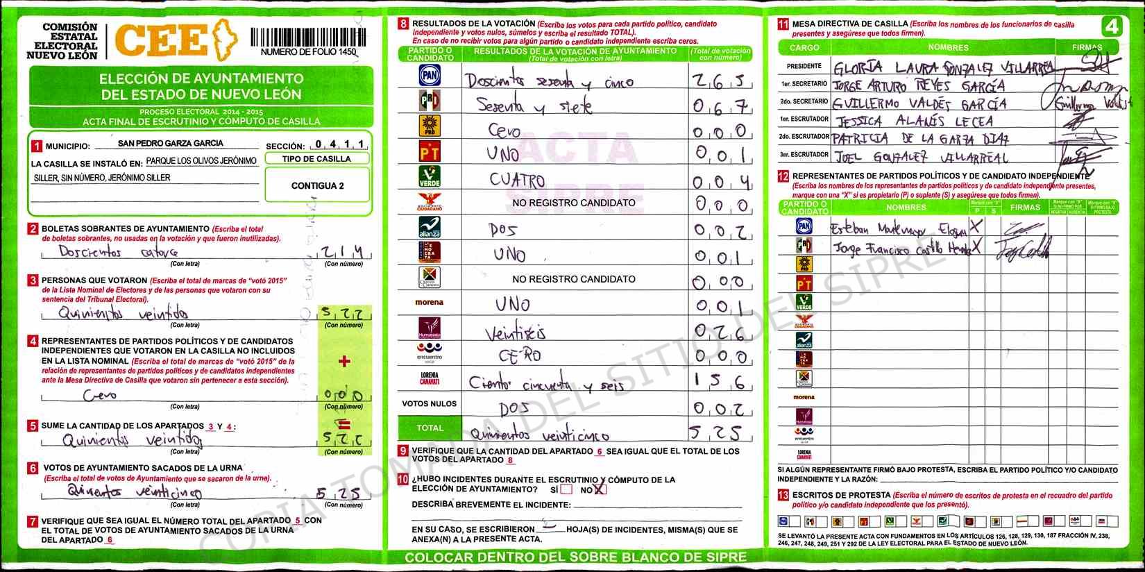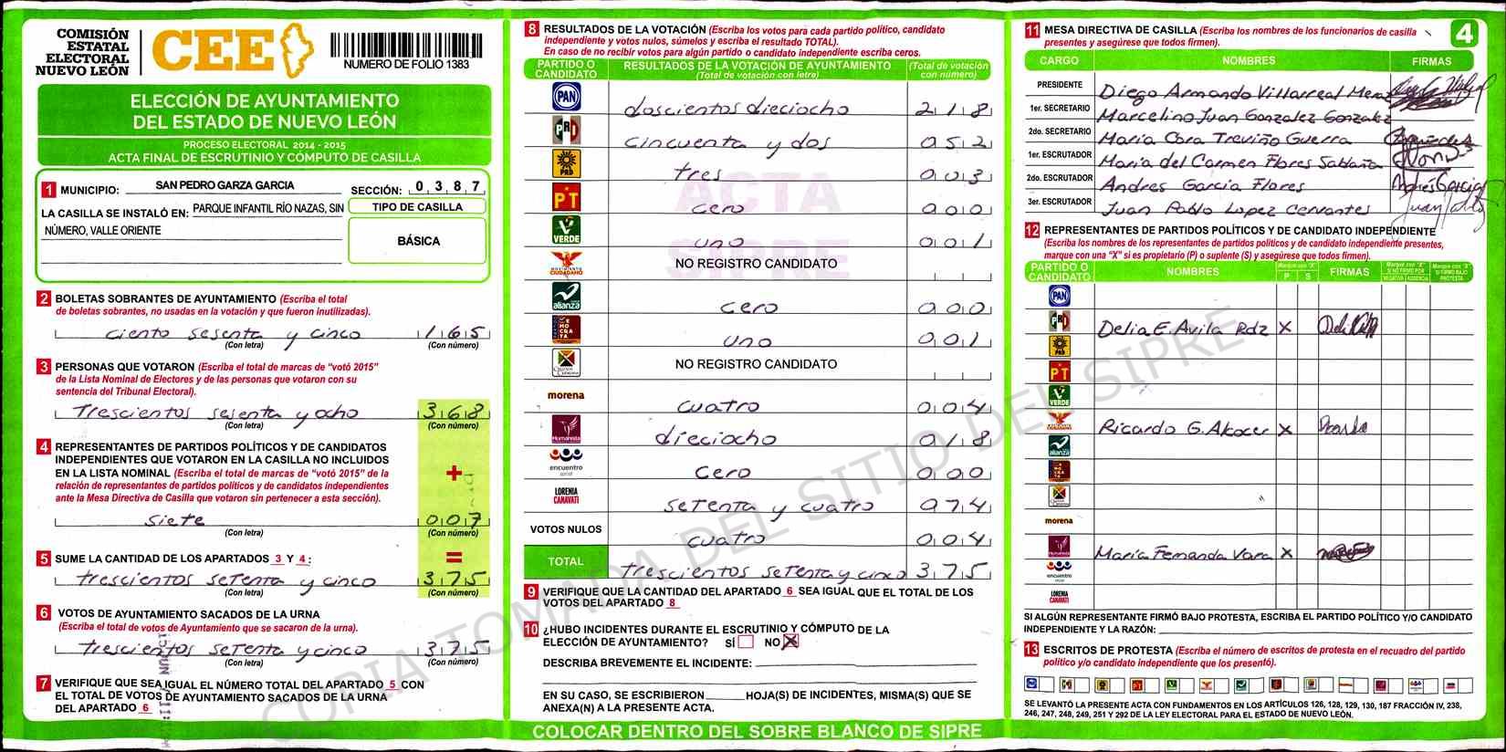 | Claves de Incidencia: | (1) Ilegible, (2) Mutilada, (3) Presenta Correcciones, (4) Presenta Borrones, (5) En Blanco, (6) Cifras Remarcadas, (7) Cifras de Mas, (8) Copiado Movido, (9) Con Signos Inválidos, (10) Excede Lista Nominal, (11) Otra |