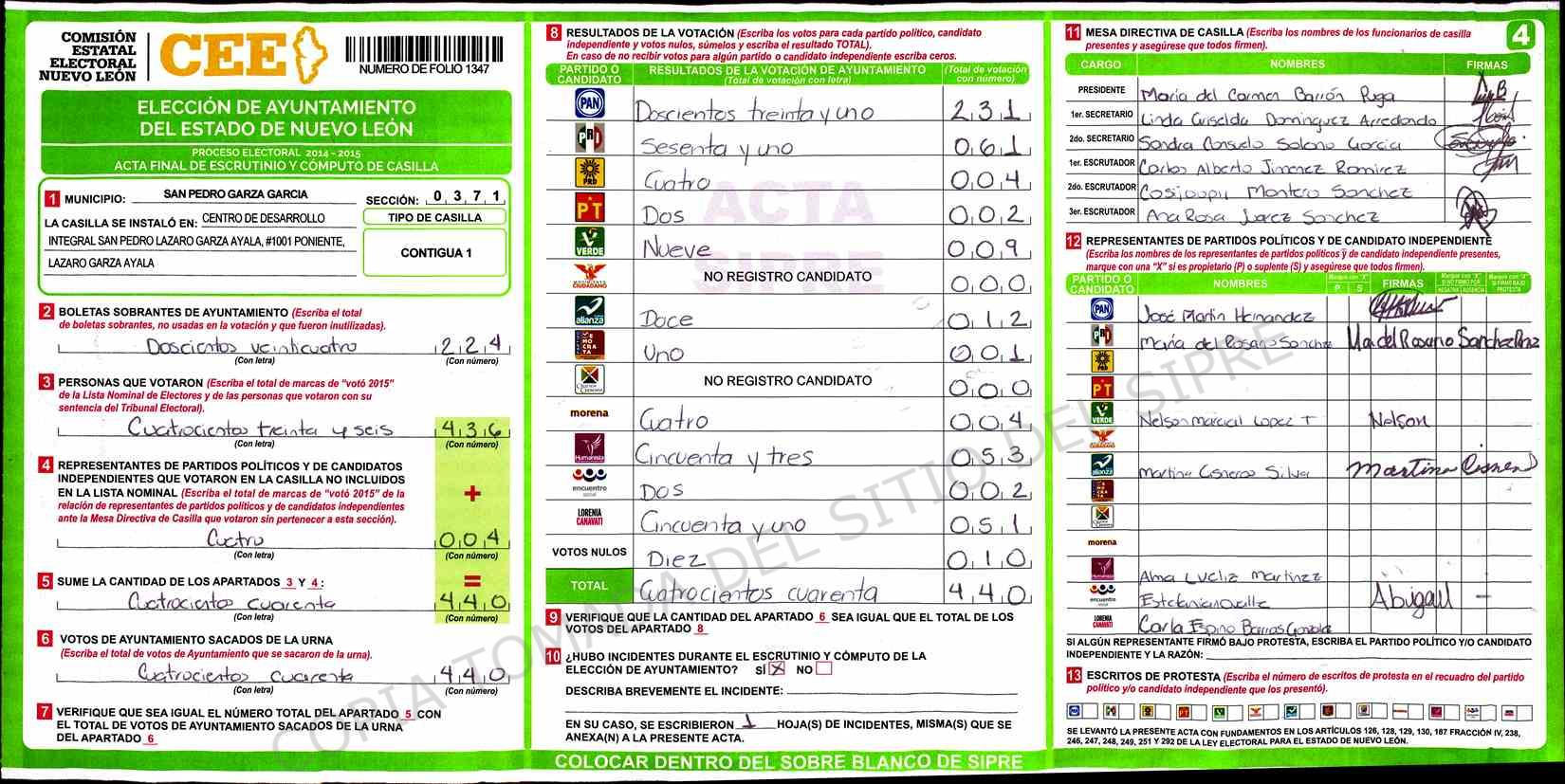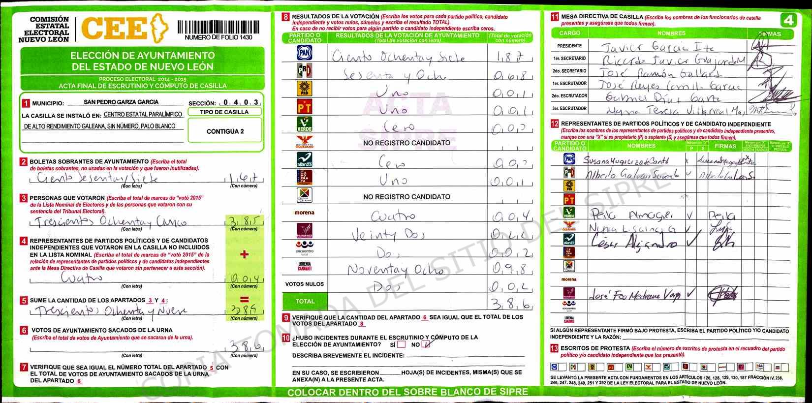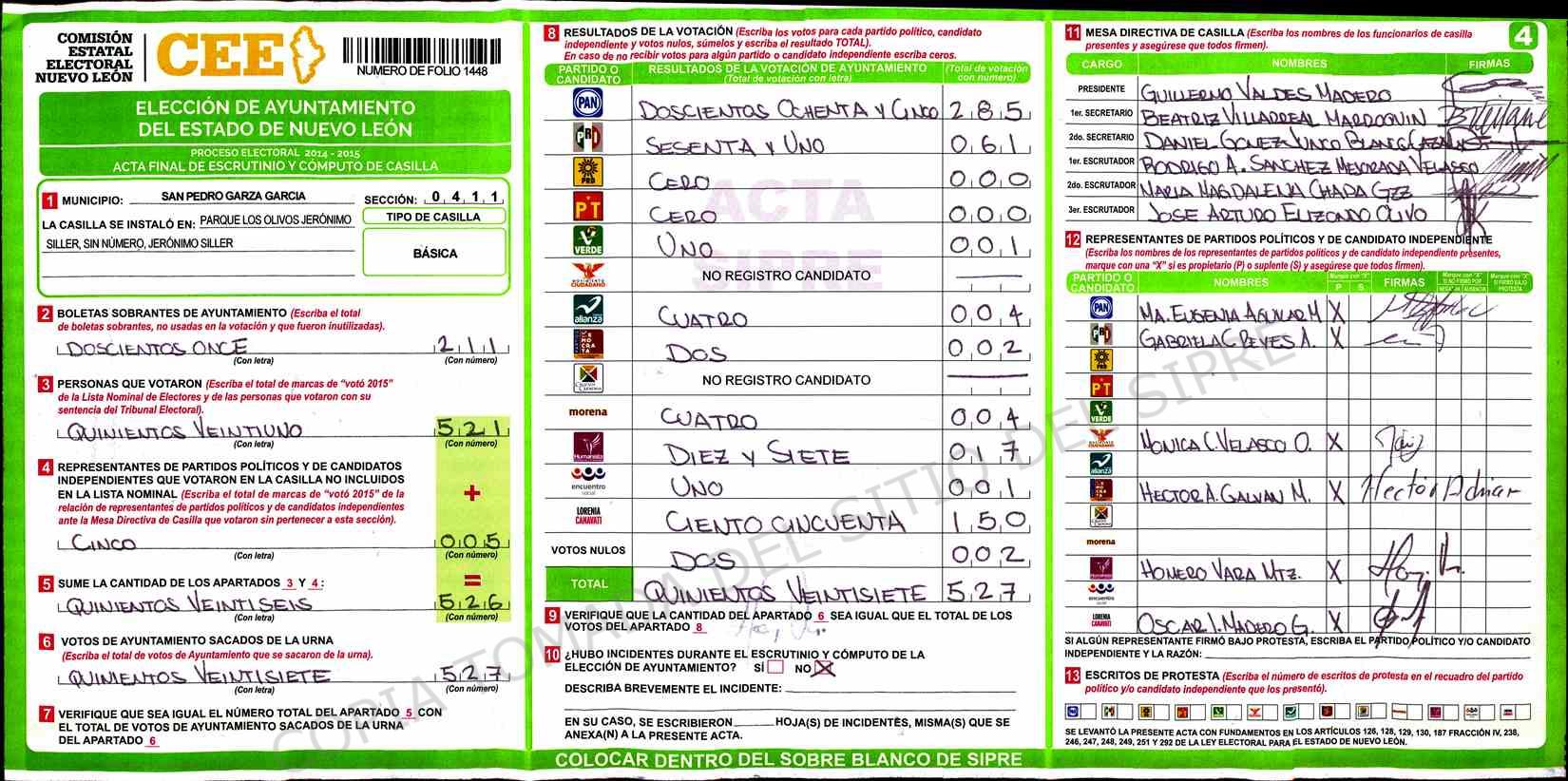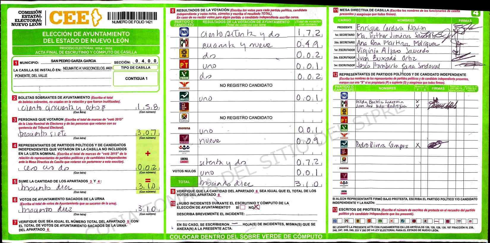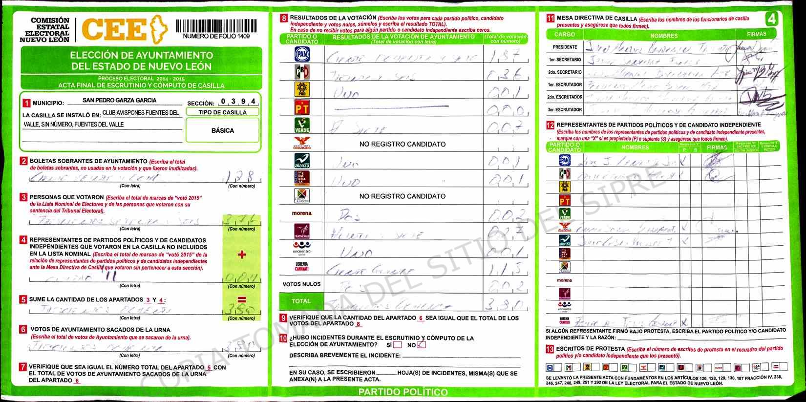 | Claves de Incidencia: | (1) Ilegible, (2) Mutilada, (3) Presenta Correcciones, (4) Presenta Borrones, (5) En Blanco, (6) Cifras Remarcadas, (7) Cifras de Mas, (8) Copiado Movido, (9) Con Signos Inválidos, (10) Excede Lista Nominal, (11) Otra |