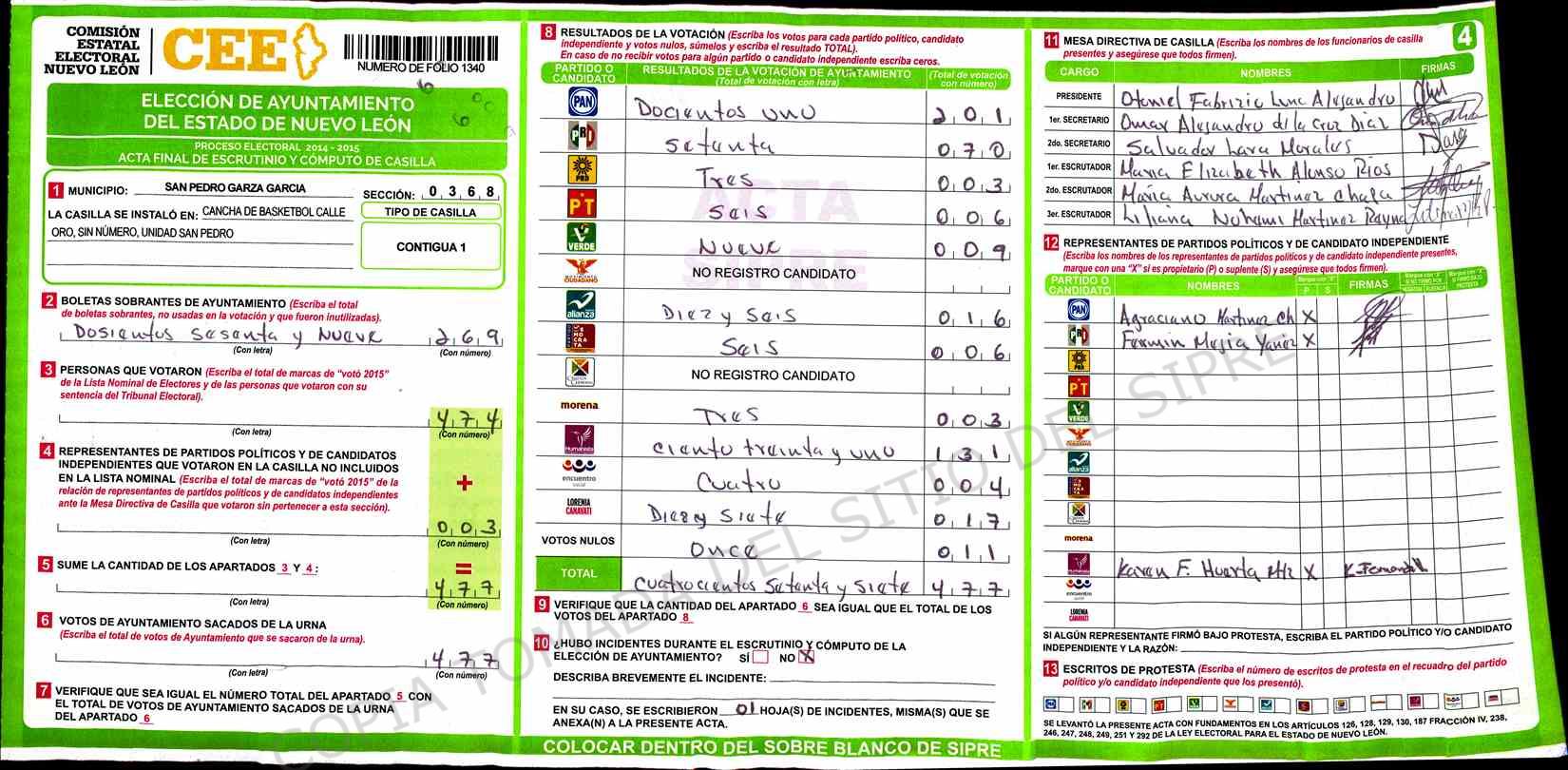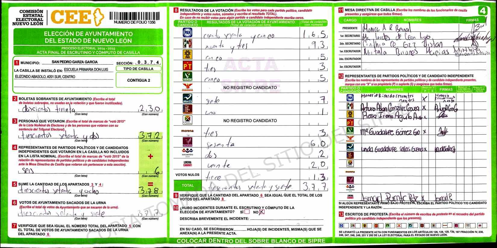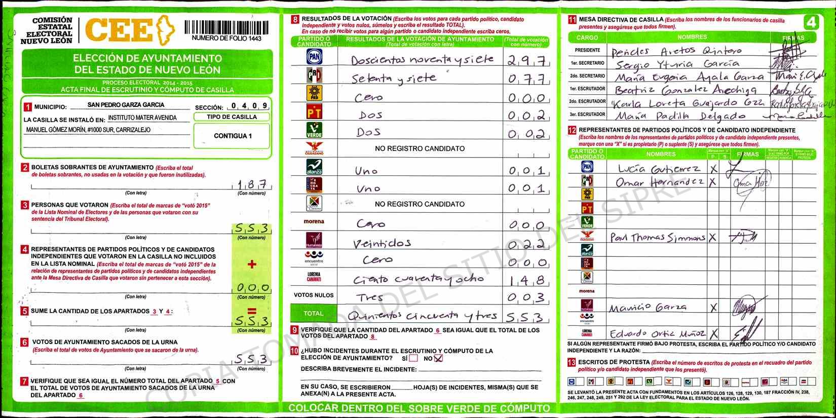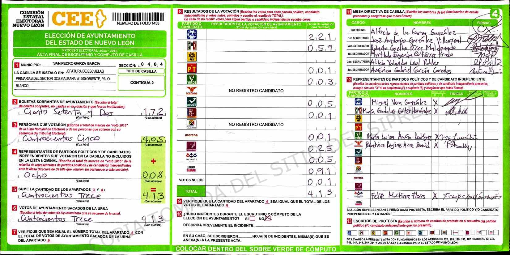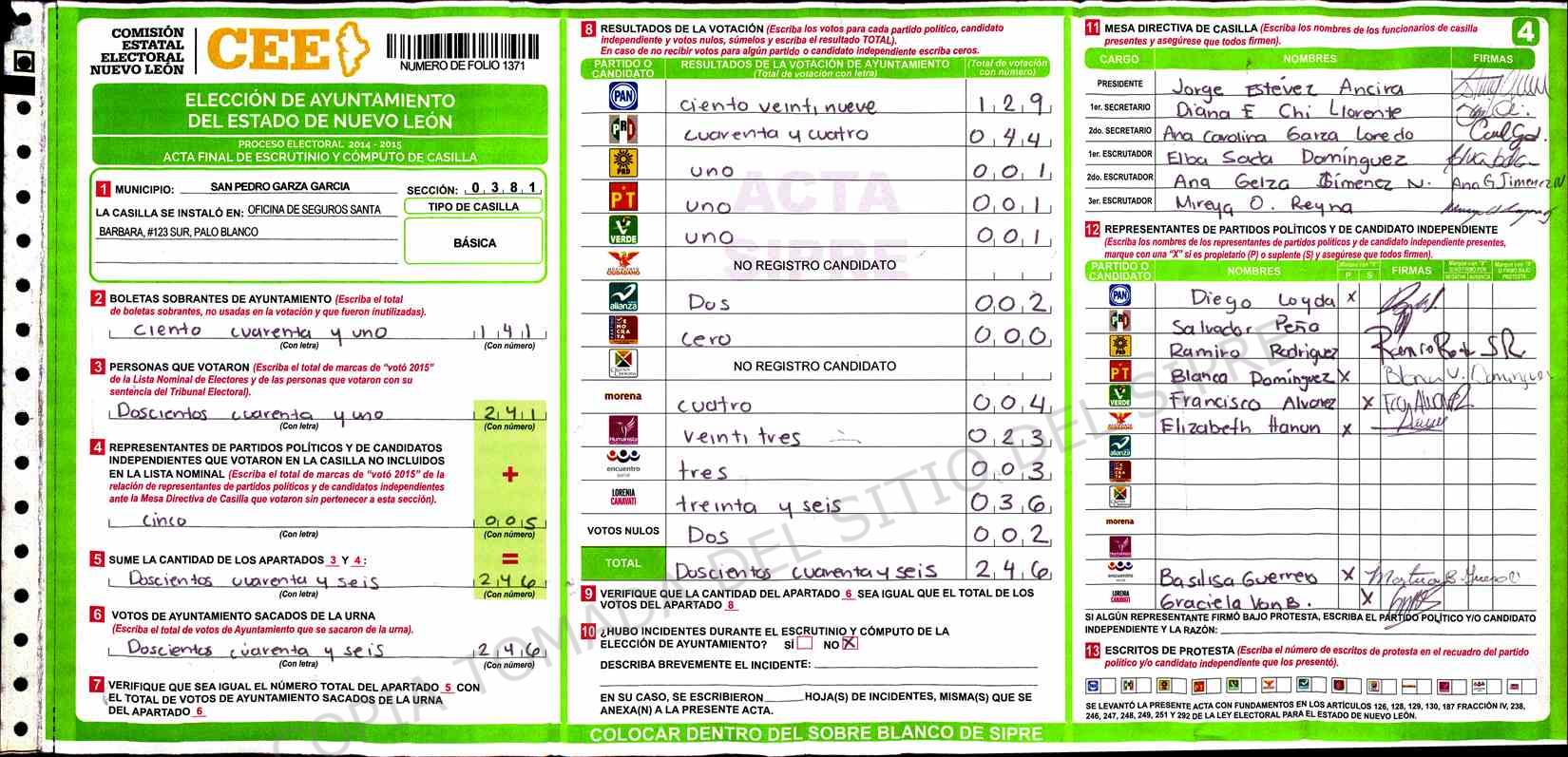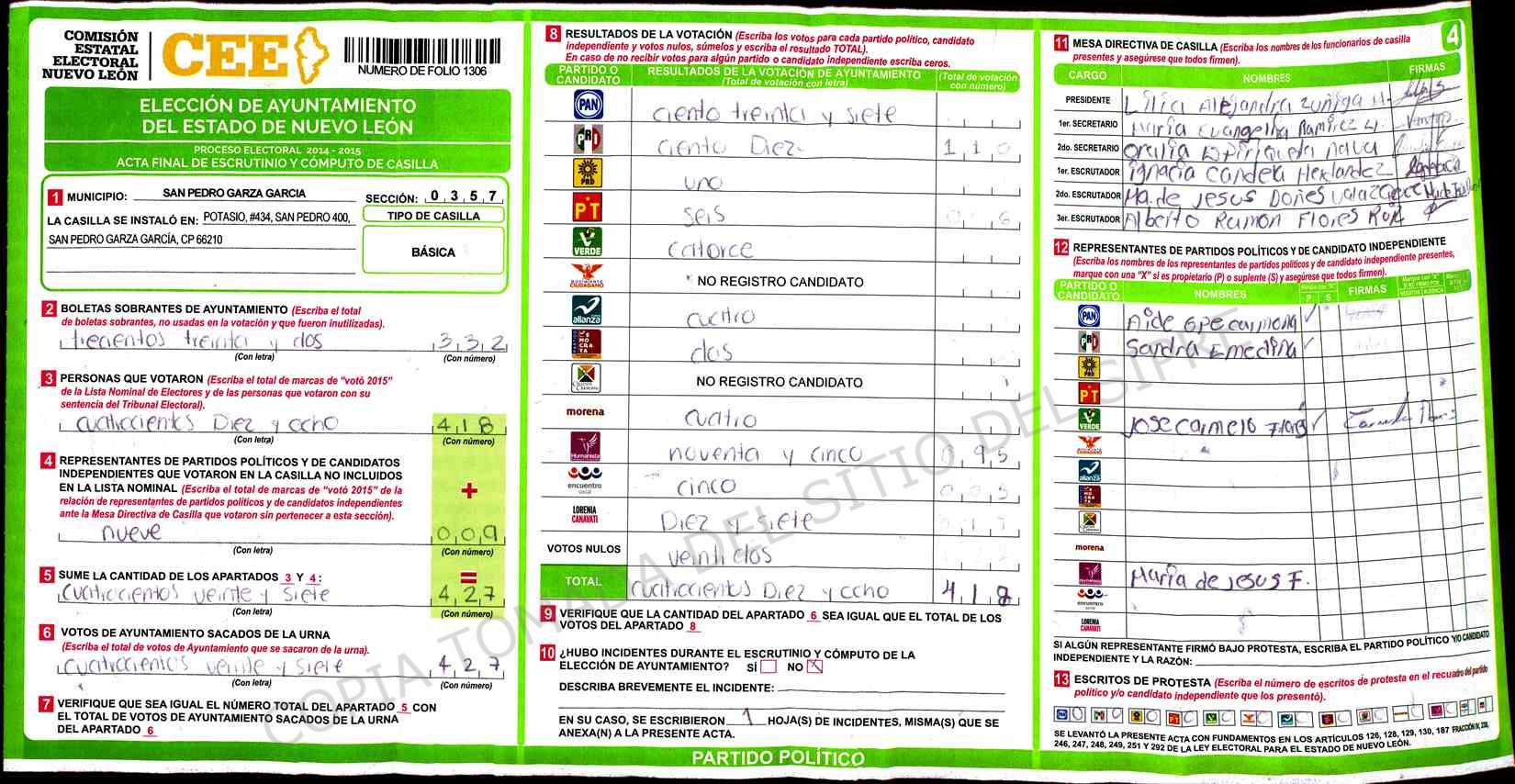 | Claves de Incidencia: | (1) Ilegible, (2) Mutilada, (3) Presenta Correcciones, (4) Presenta Borrones, (5) En Blanco, (6) Cifras Remarcadas, (7) Cifras de Mas, (8) Copiado Movido, (9) Con Signos Inválidos, (10) Excede Lista Nominal, (11) Otra |