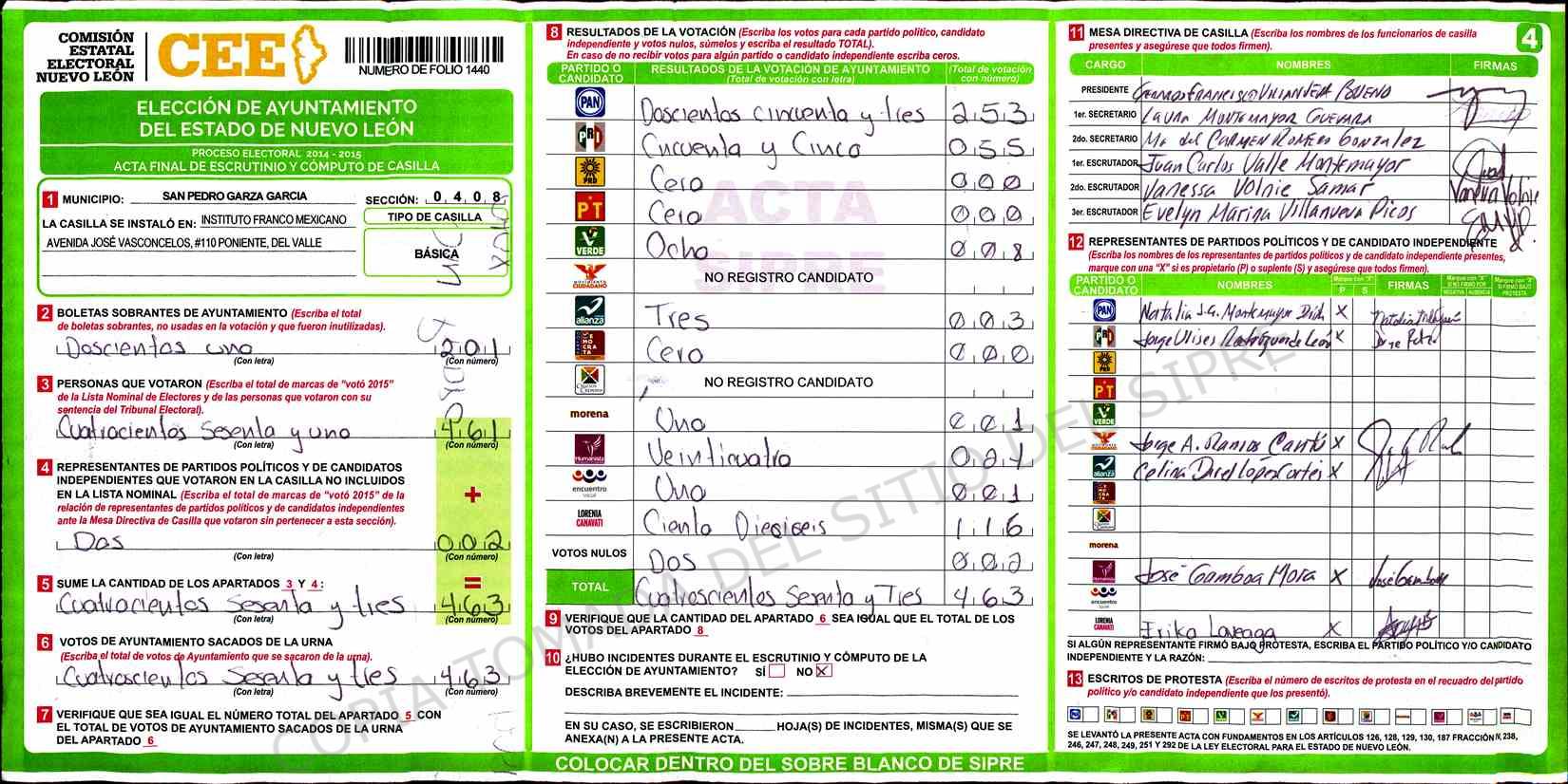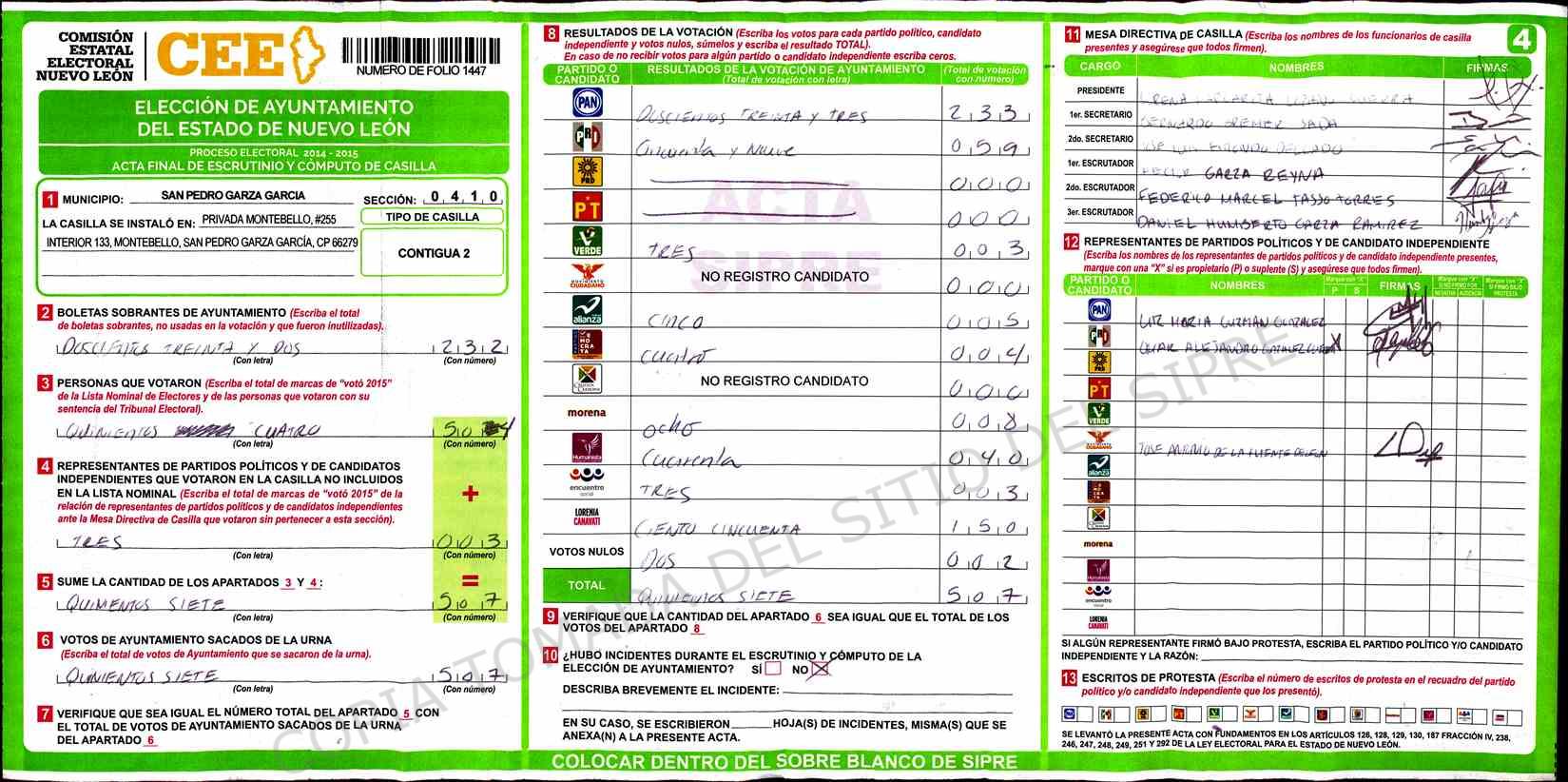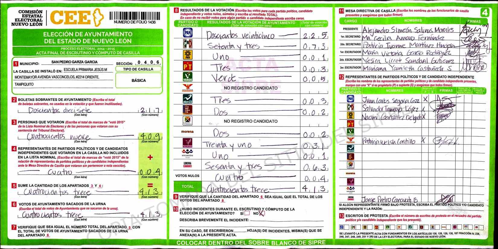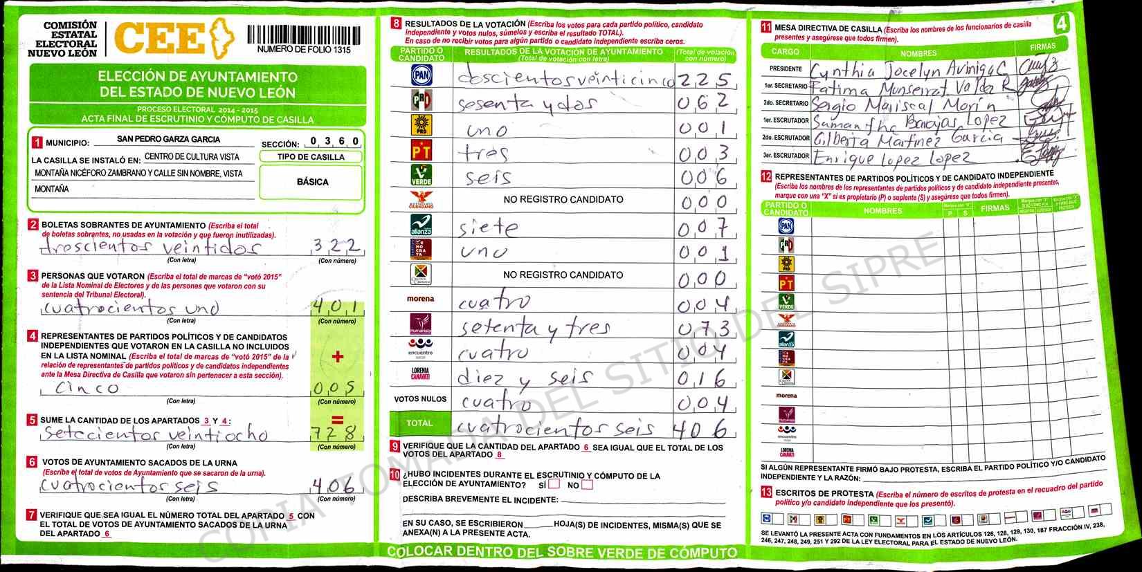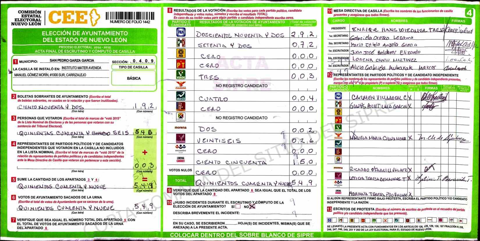 | Claves de Incidencia: | (1) Ilegible, (2) Mutilada, (3) Presenta Correcciones, (4) Presenta Borrones, (5) En Blanco, (6) Cifras Remarcadas, (7) Cifras de Mas, (8) Copiado Movido, (9) Con Signos Inválidos, (10) Excede Lista Nominal, (11) Otra |
