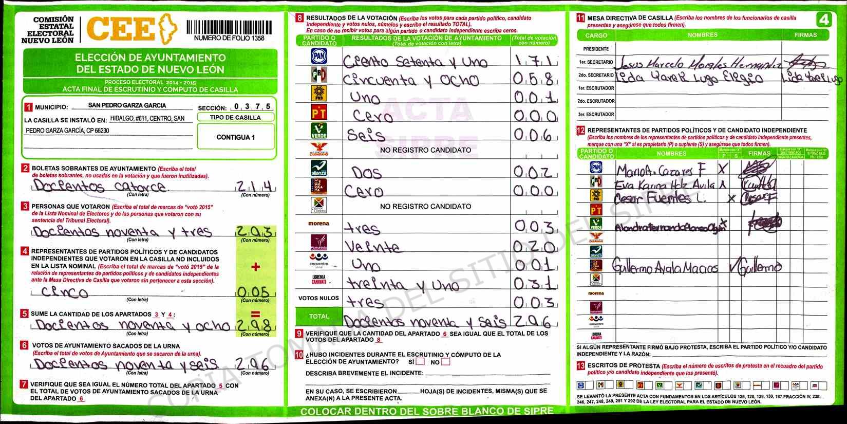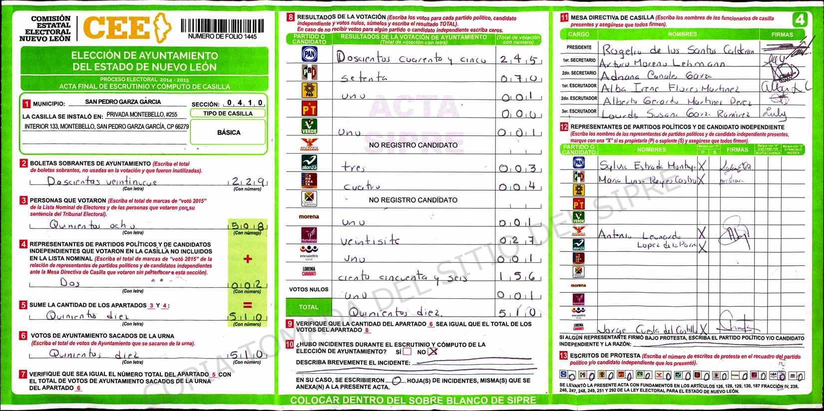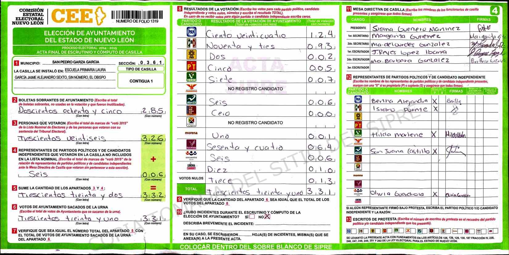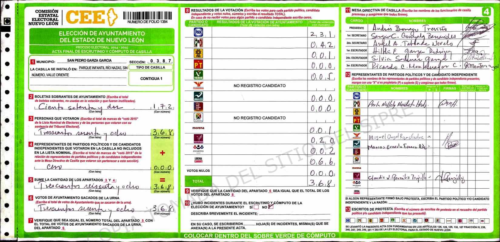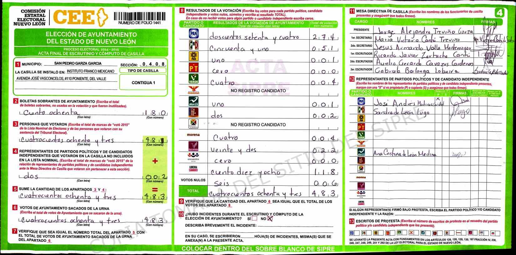 | Claves de Incidencia: | (1) Ilegible, (2) Mutilada, (3) Presenta Correcciones, (4) Presenta Borrones, (5) En Blanco, (6) Cifras Remarcadas, (7) Cifras de Mas, (8) Copiado Movido, (9) Con Signos Inválidos, (10) Excede Lista Nominal, (11) Otra |